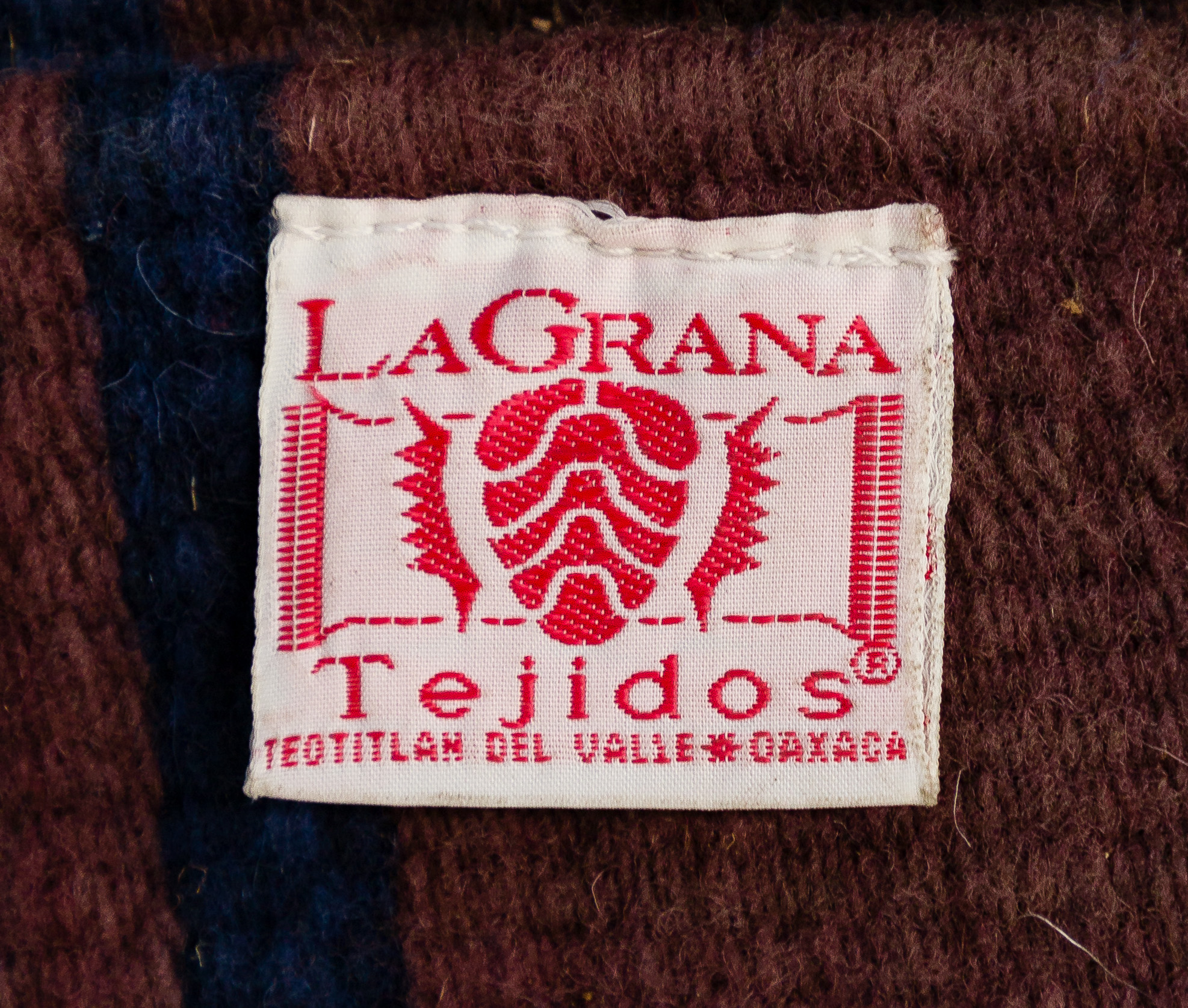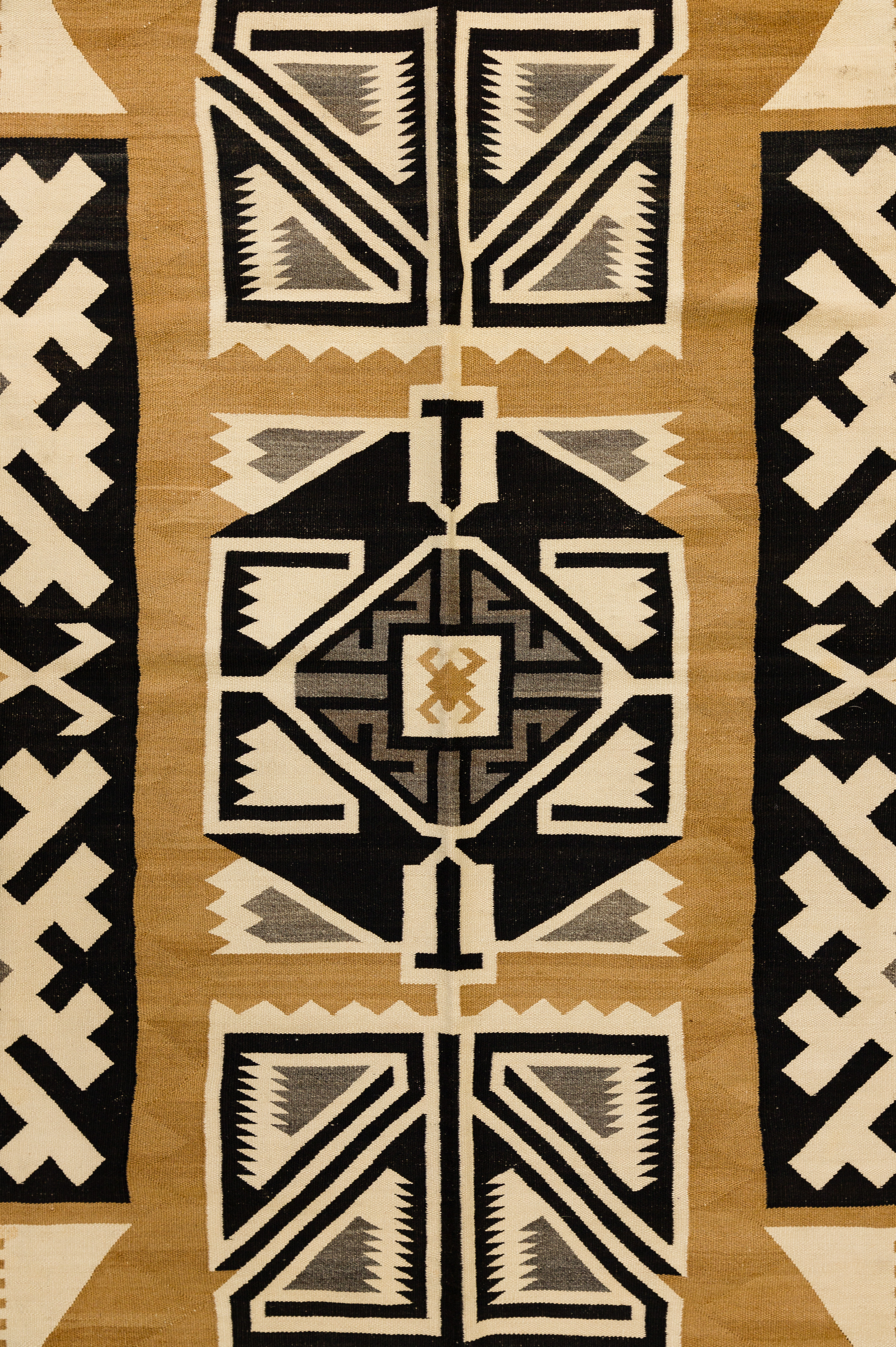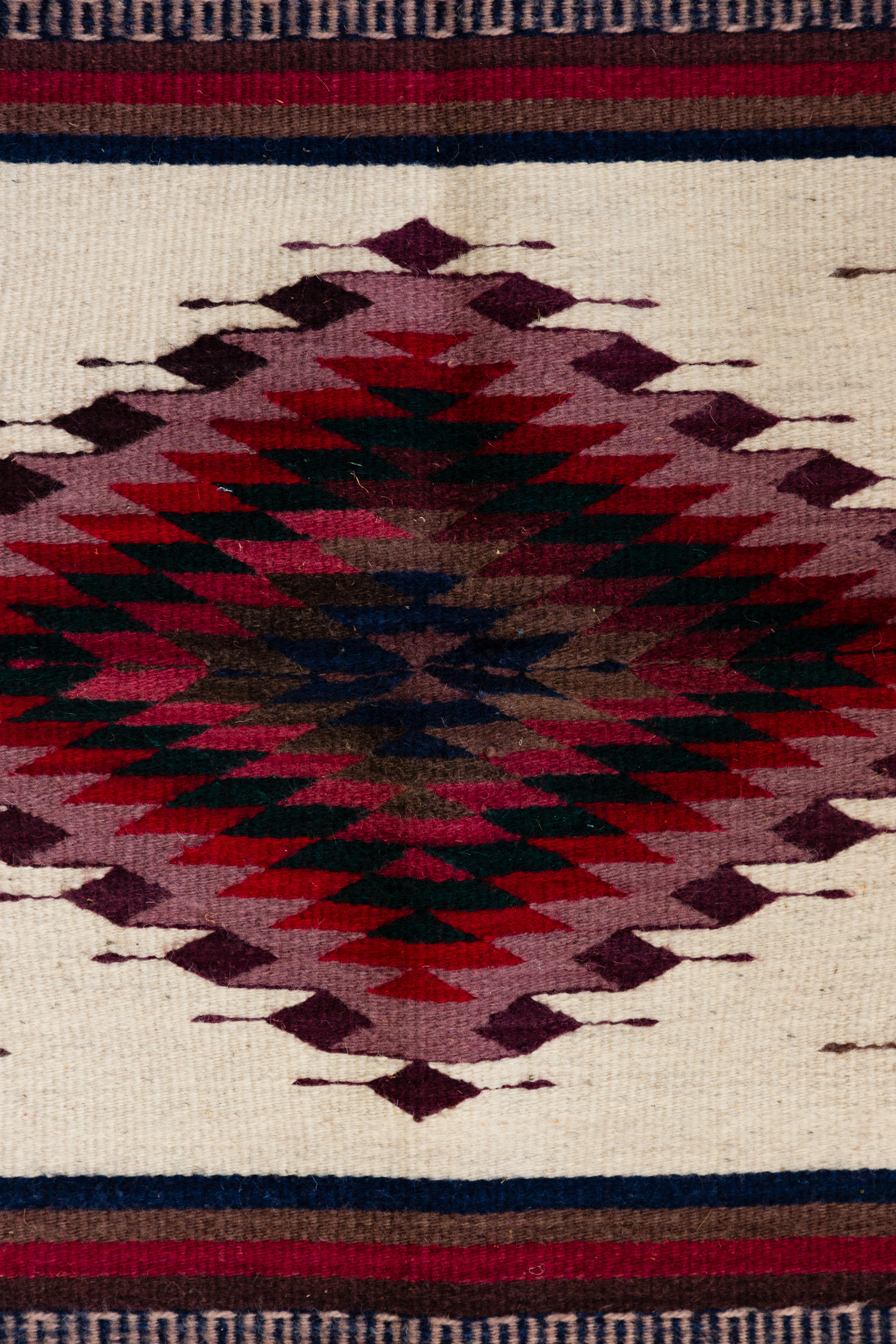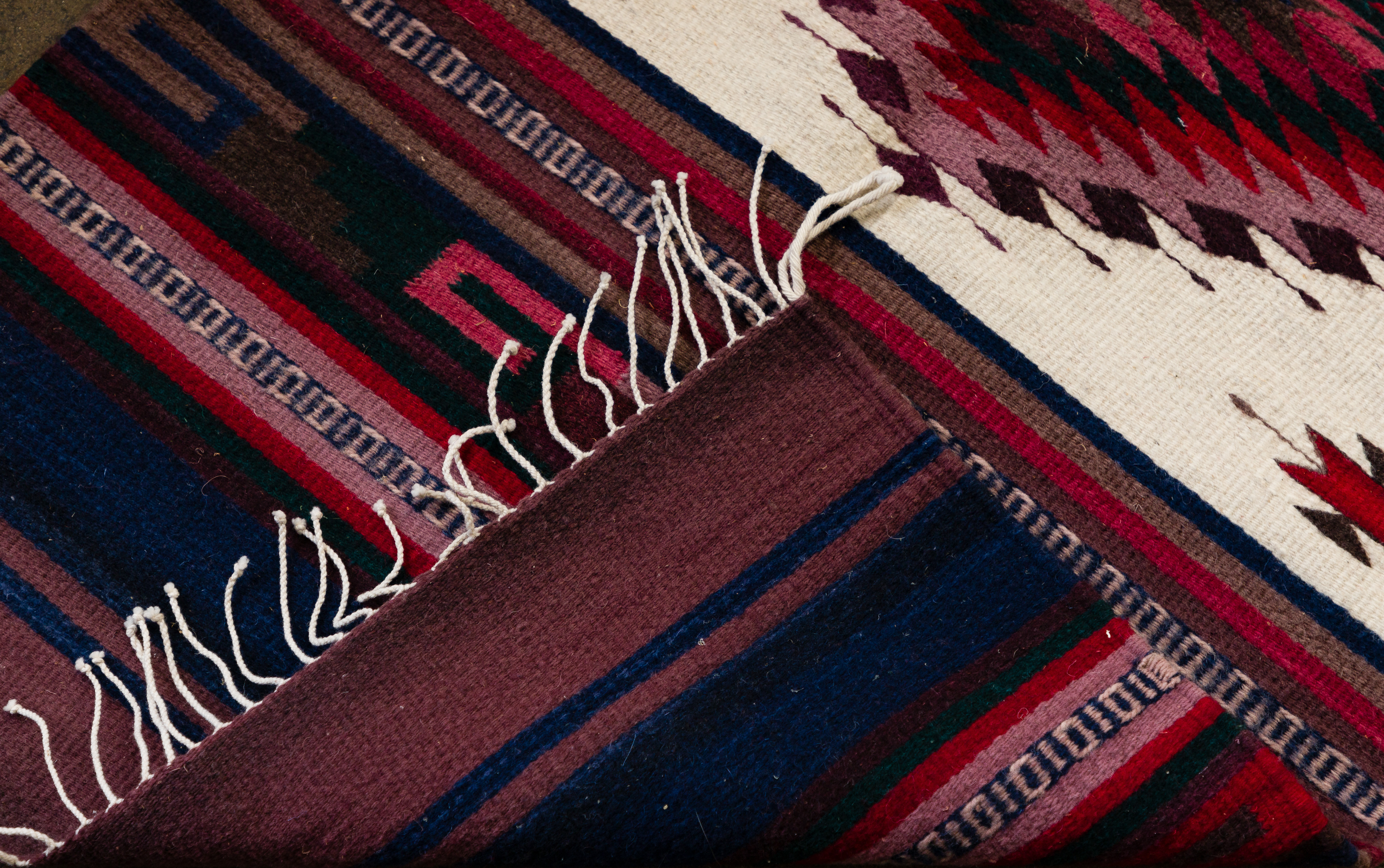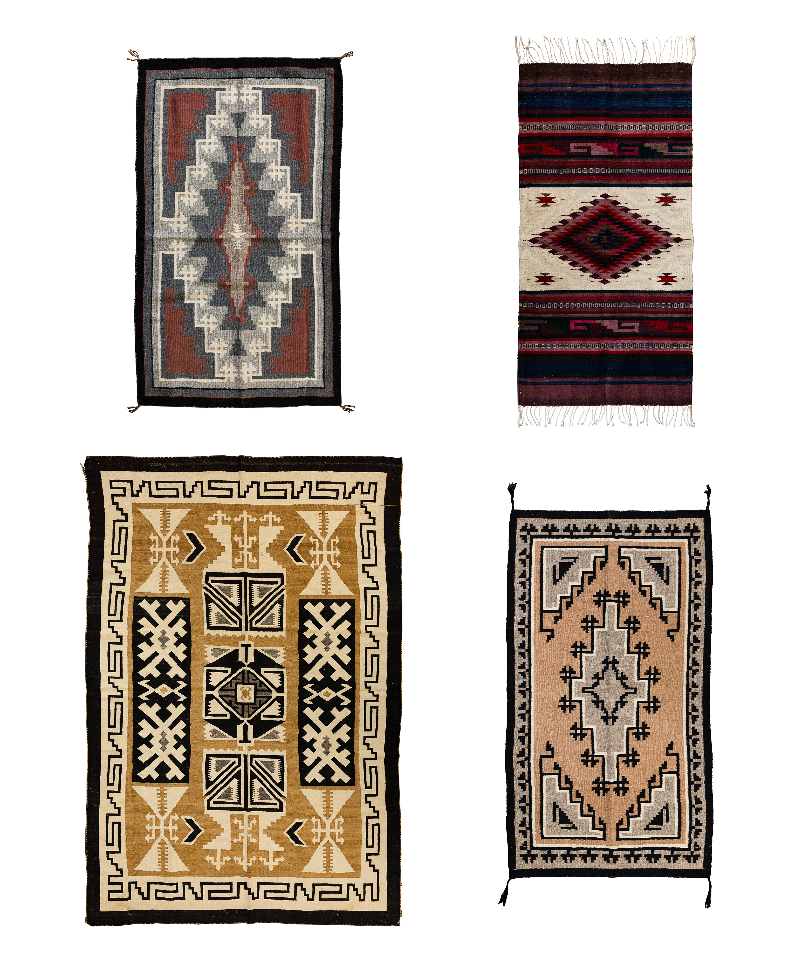 (4) total items including (3) Navajo having geometric patterns in black, gray, brown, tan and ivory, the smallest having areas of brick red; together with a Mexican fringed multi-color Chimayo blanket