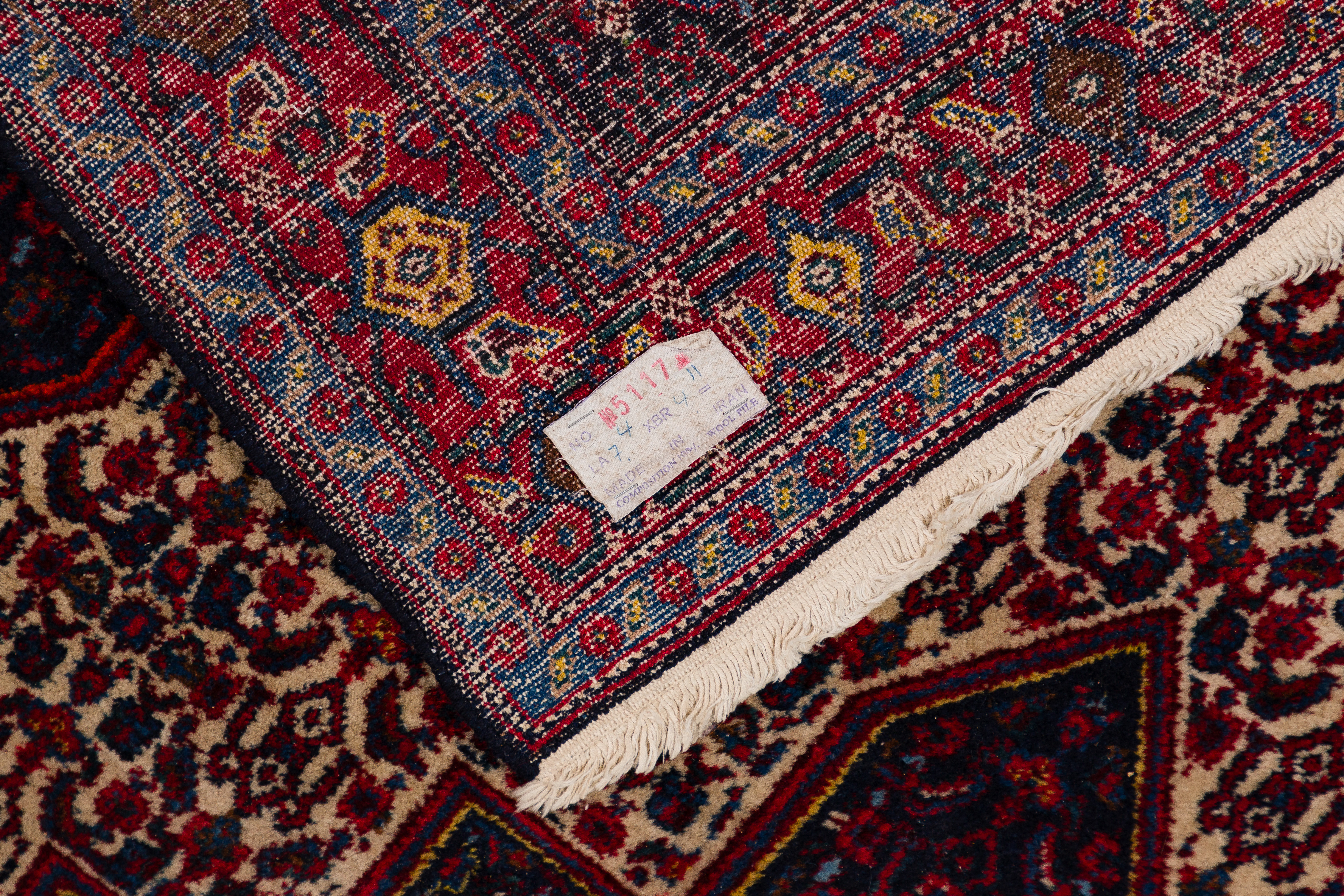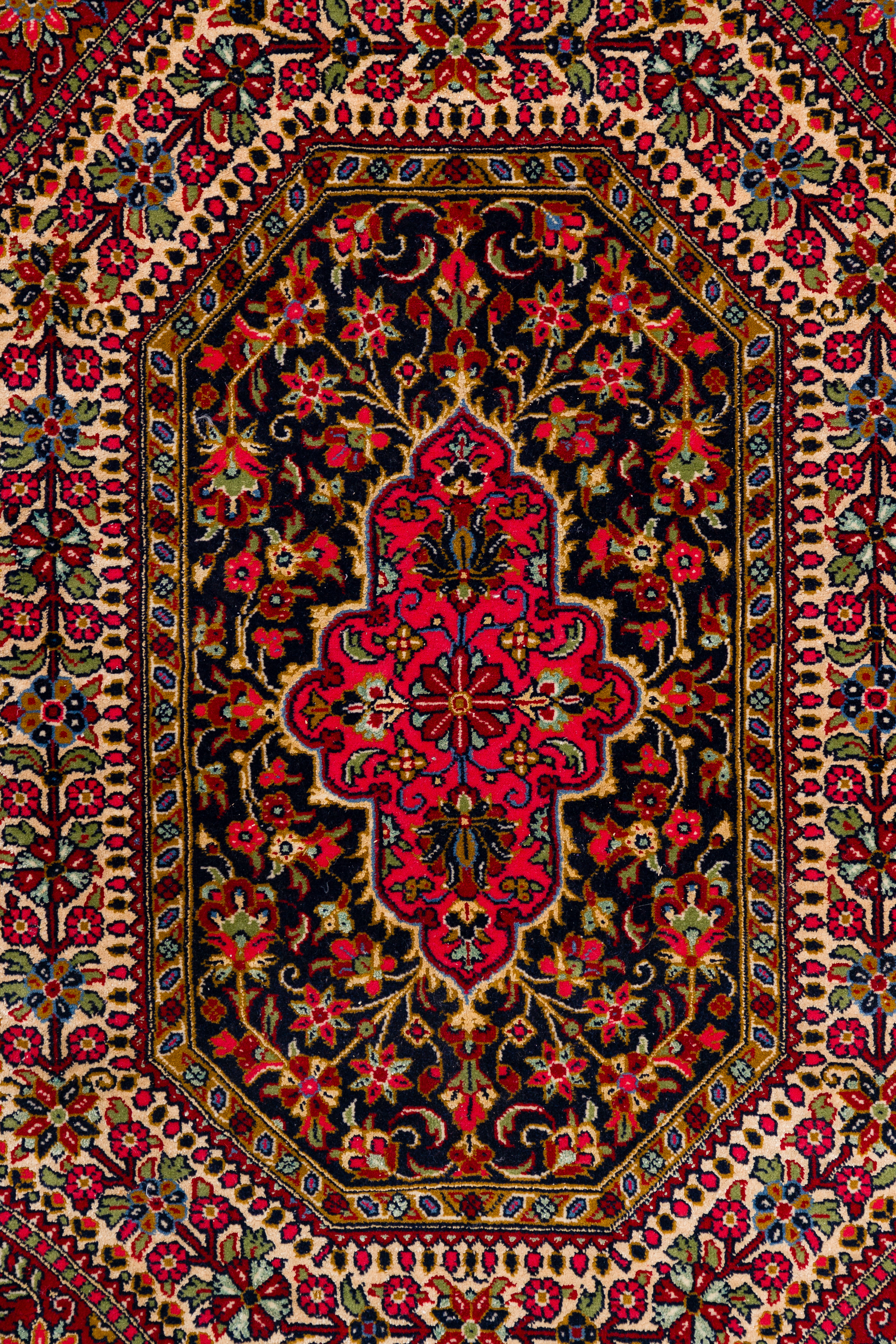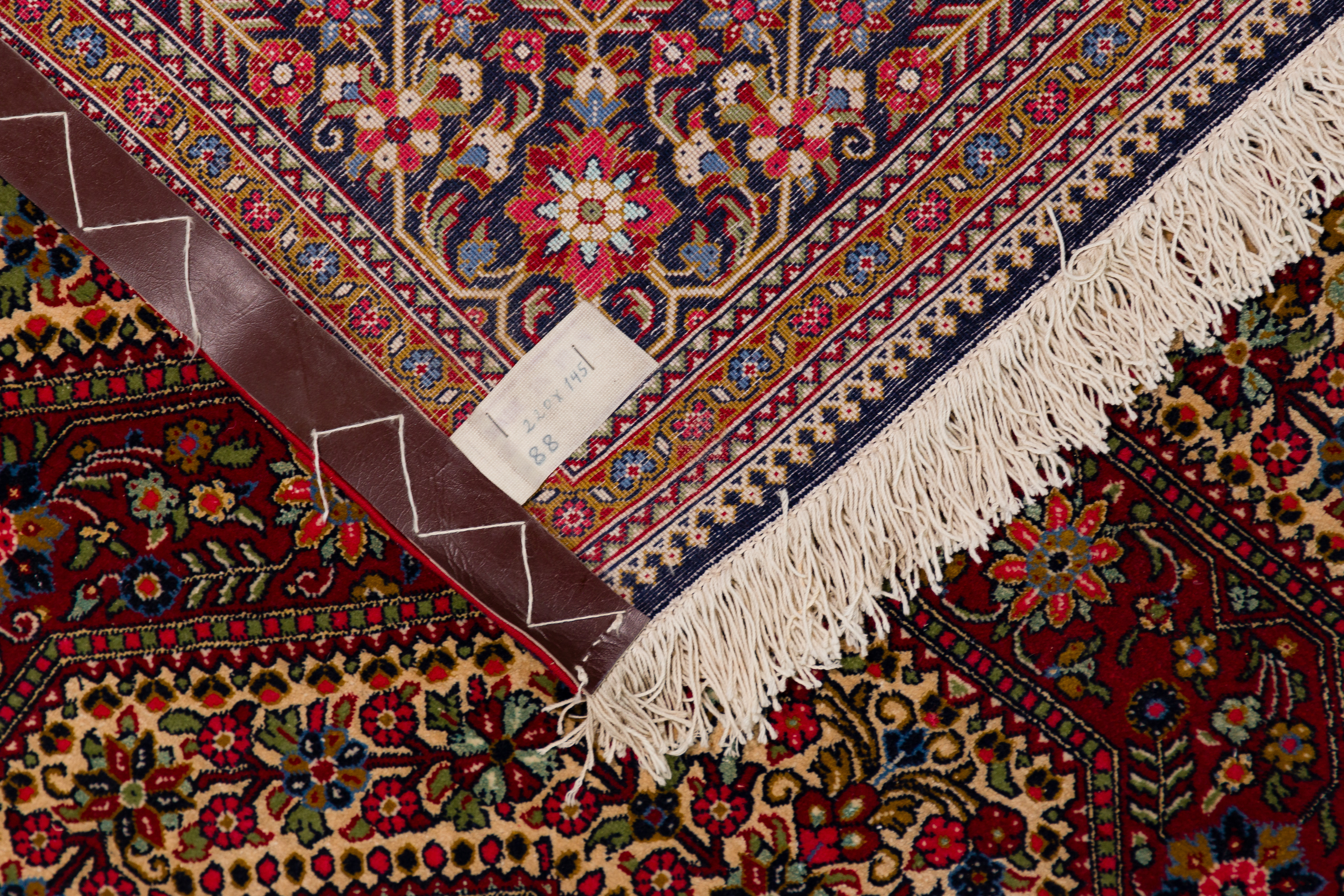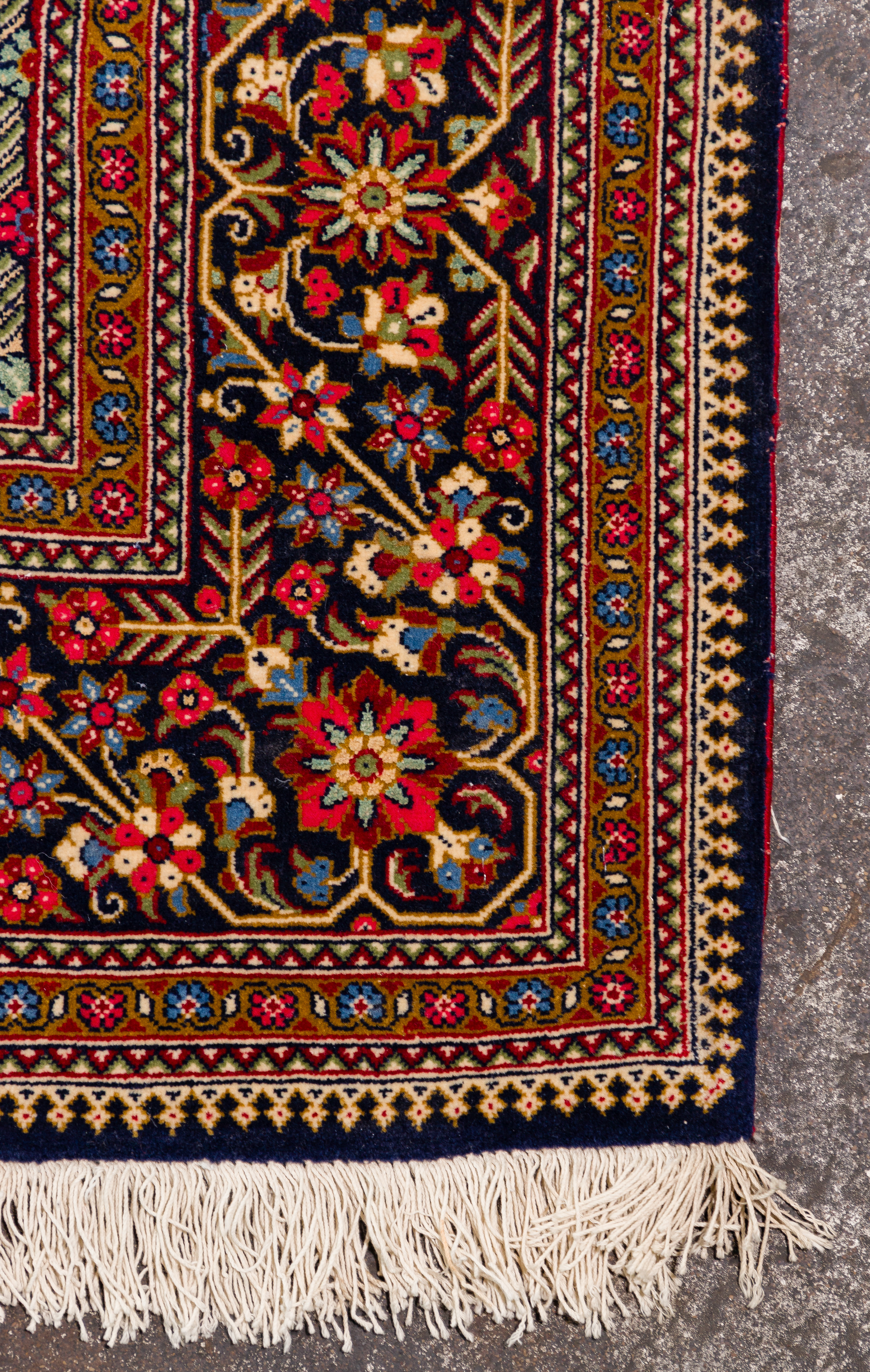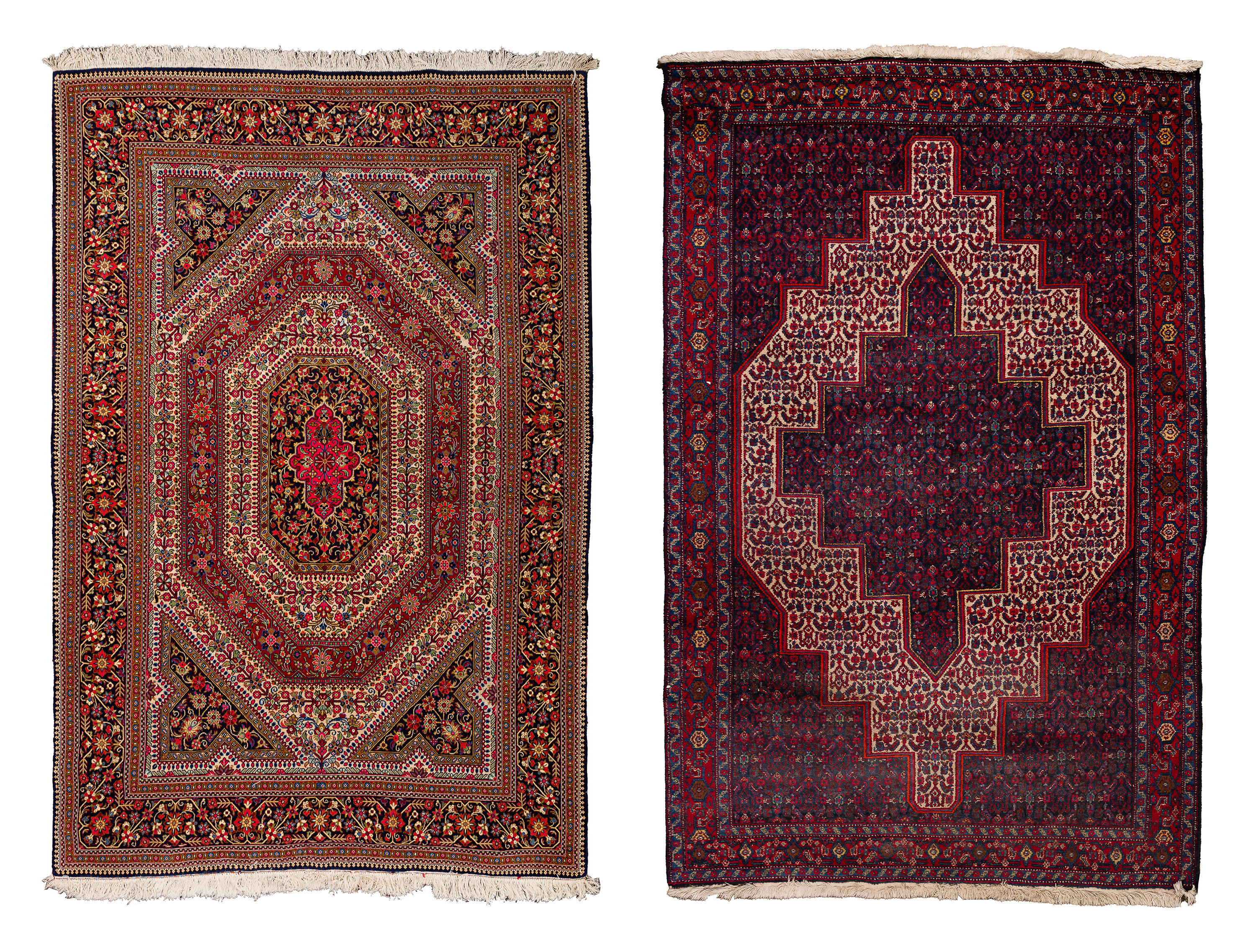 (2) items including a hand knotted having a floral design with medallion in hues of pink, blue, cream and green on a multicolor field (larger) and an abstract geometric design with medallion in hues of green, gold, rust and mauve on a blue field (7 ft. 2 in. by 4.2 in.)