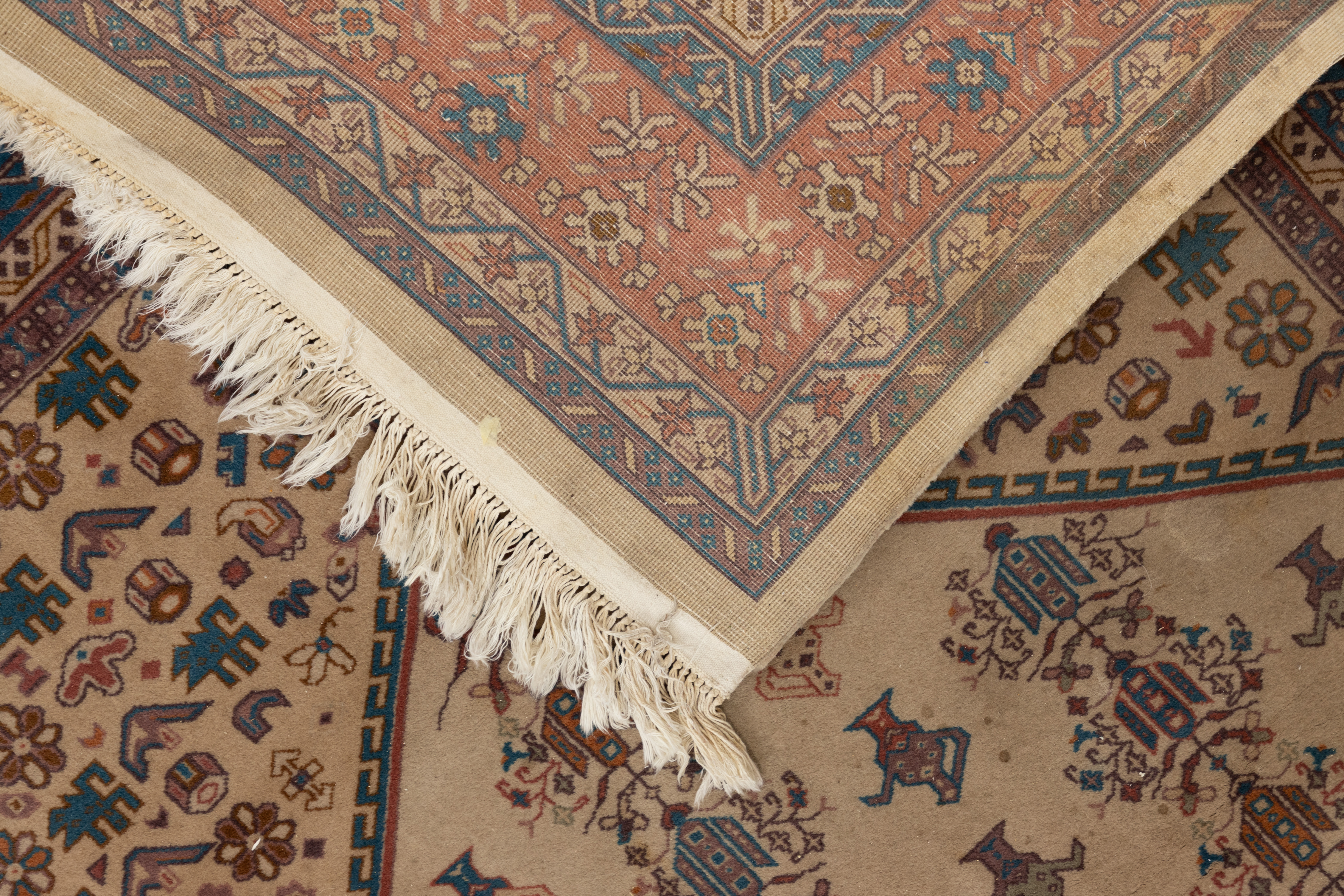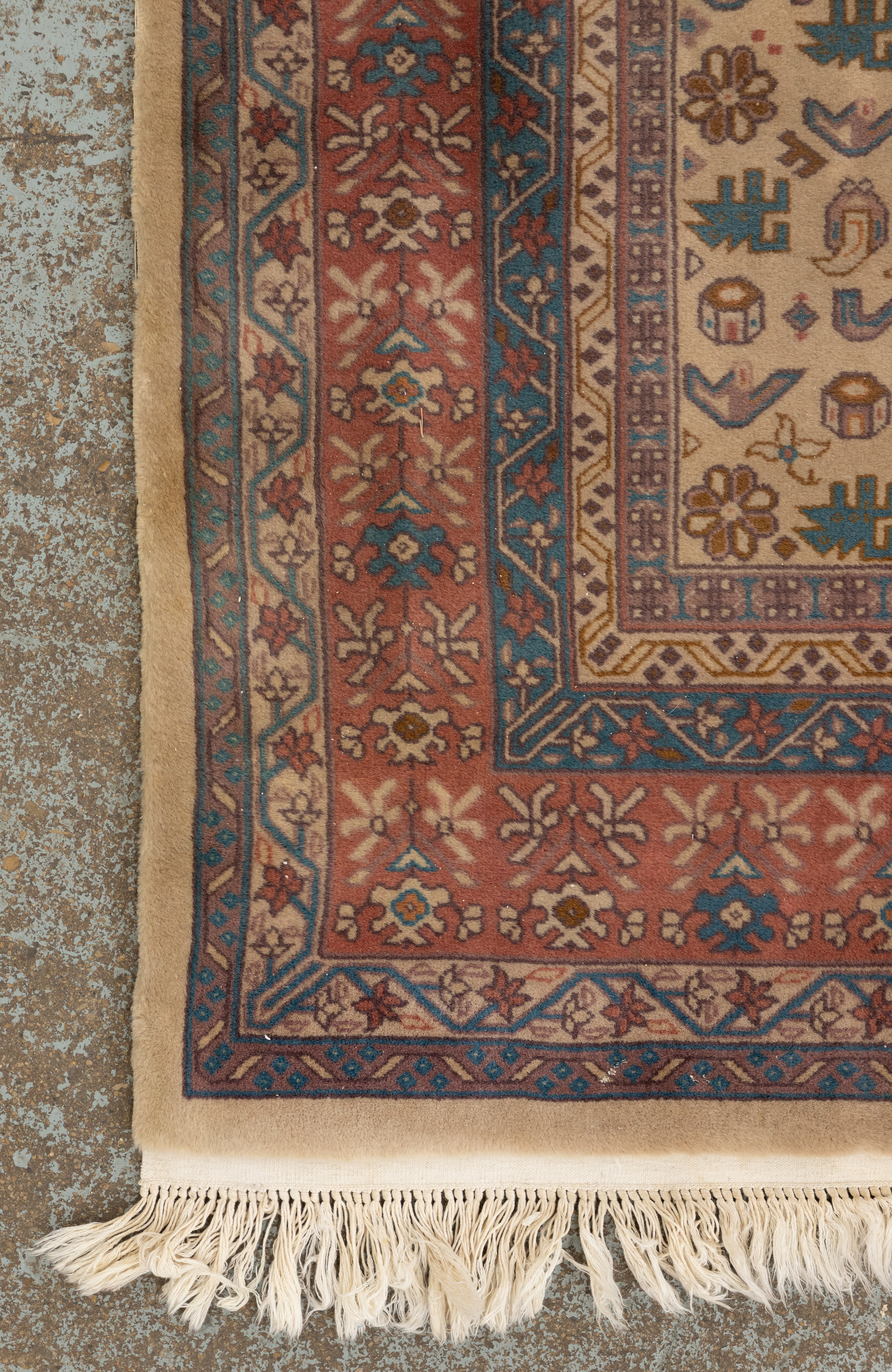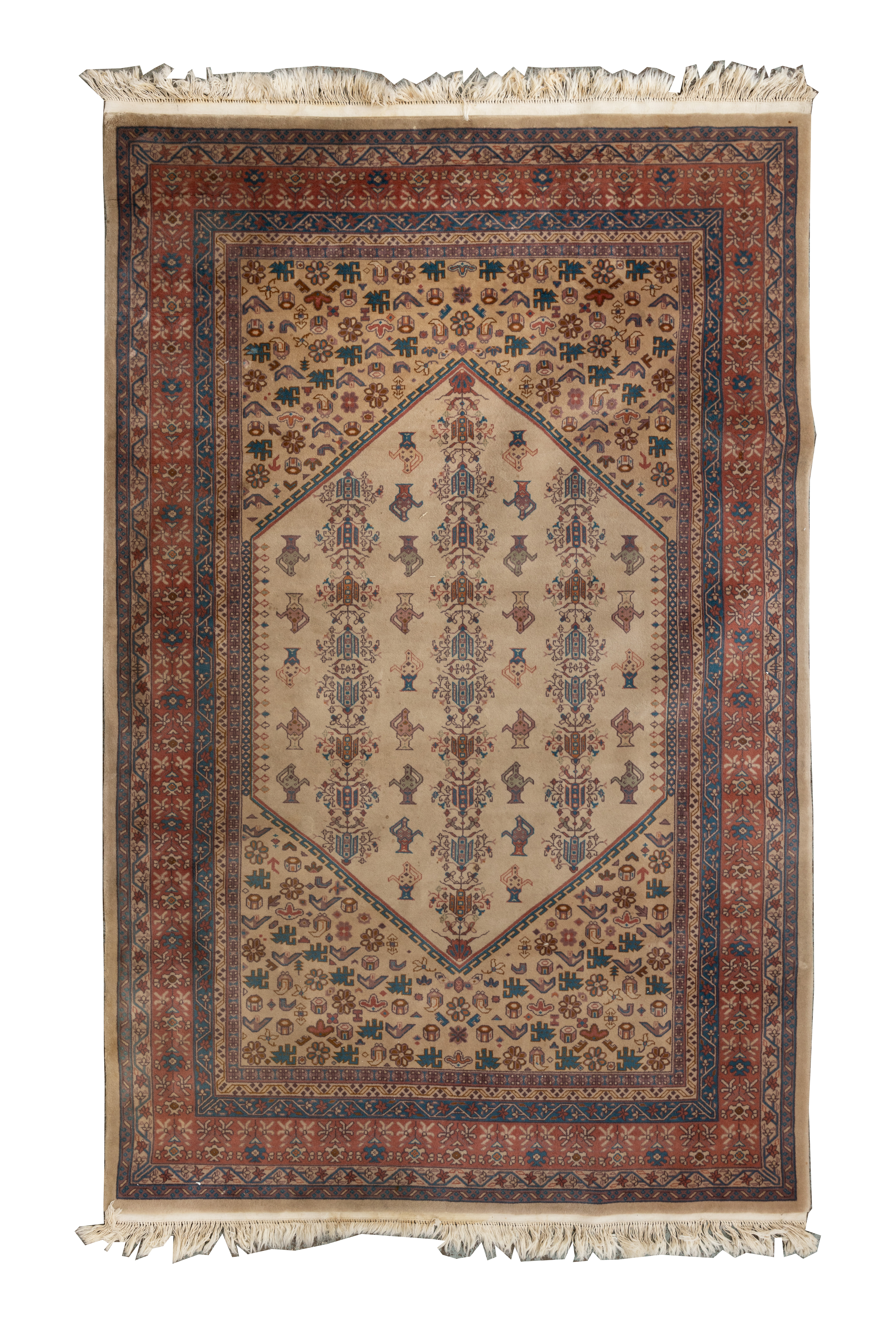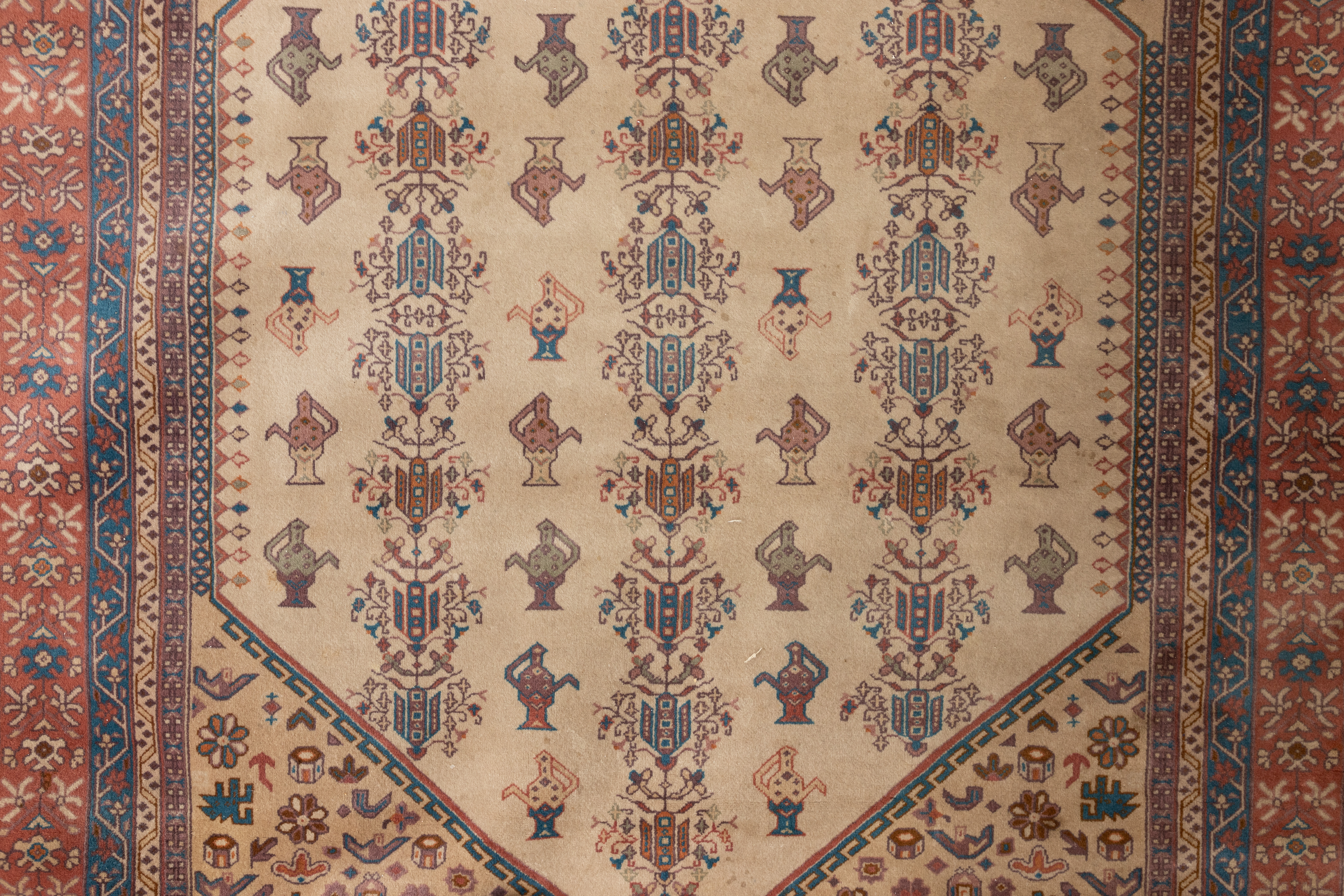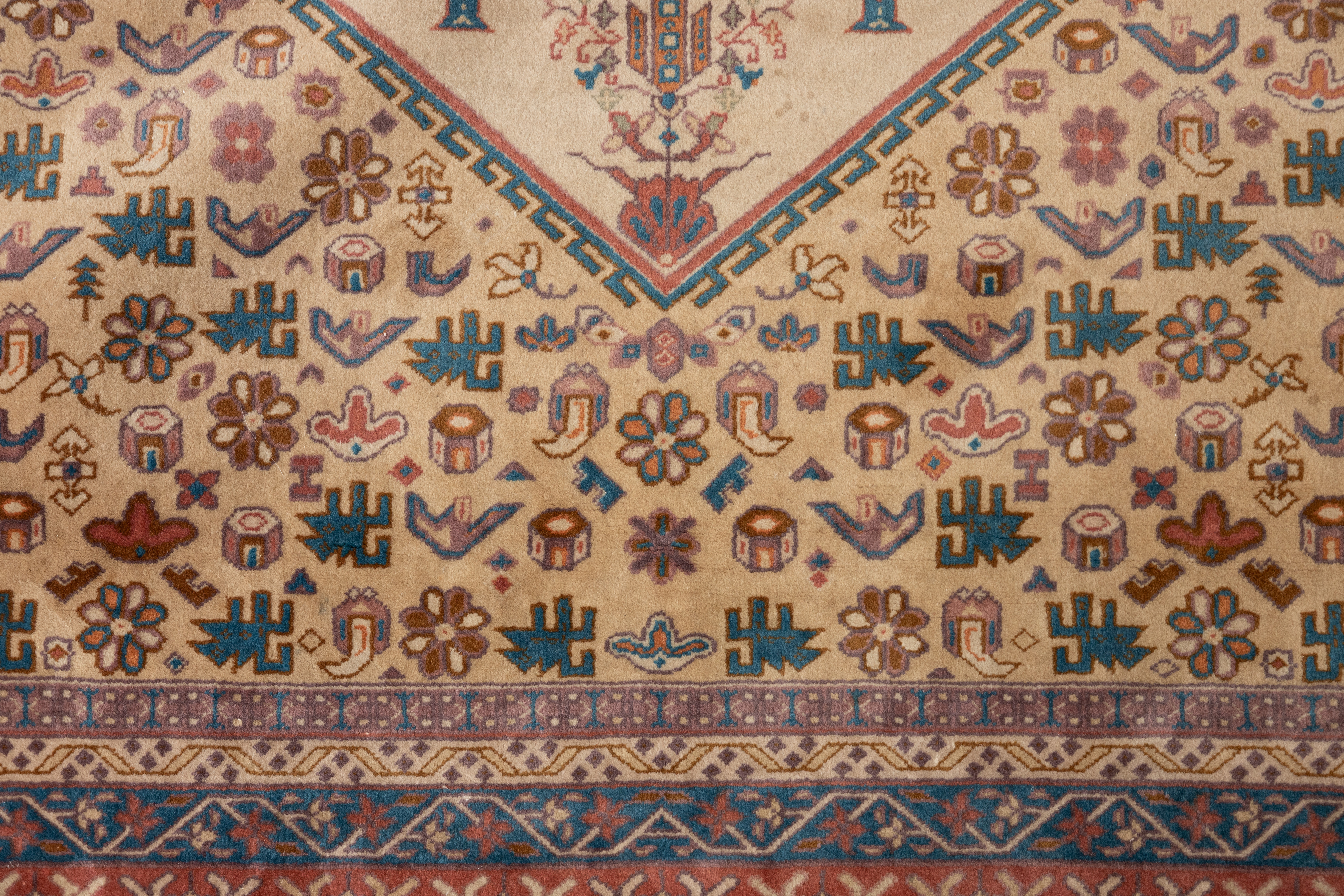 Hand knotted having an abstract floral and figural medallion design in hues of rust, gold, blue and teal on a cream field