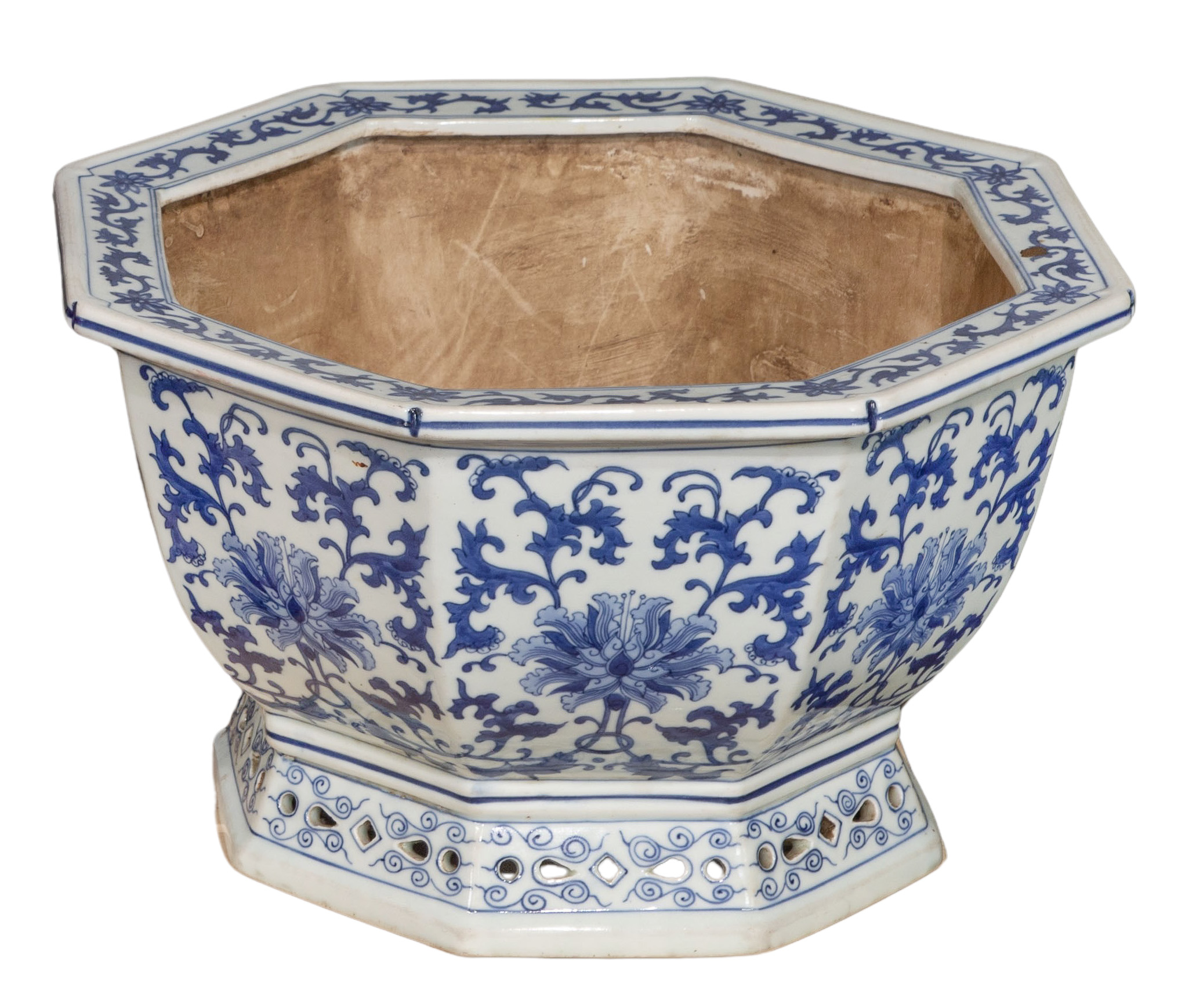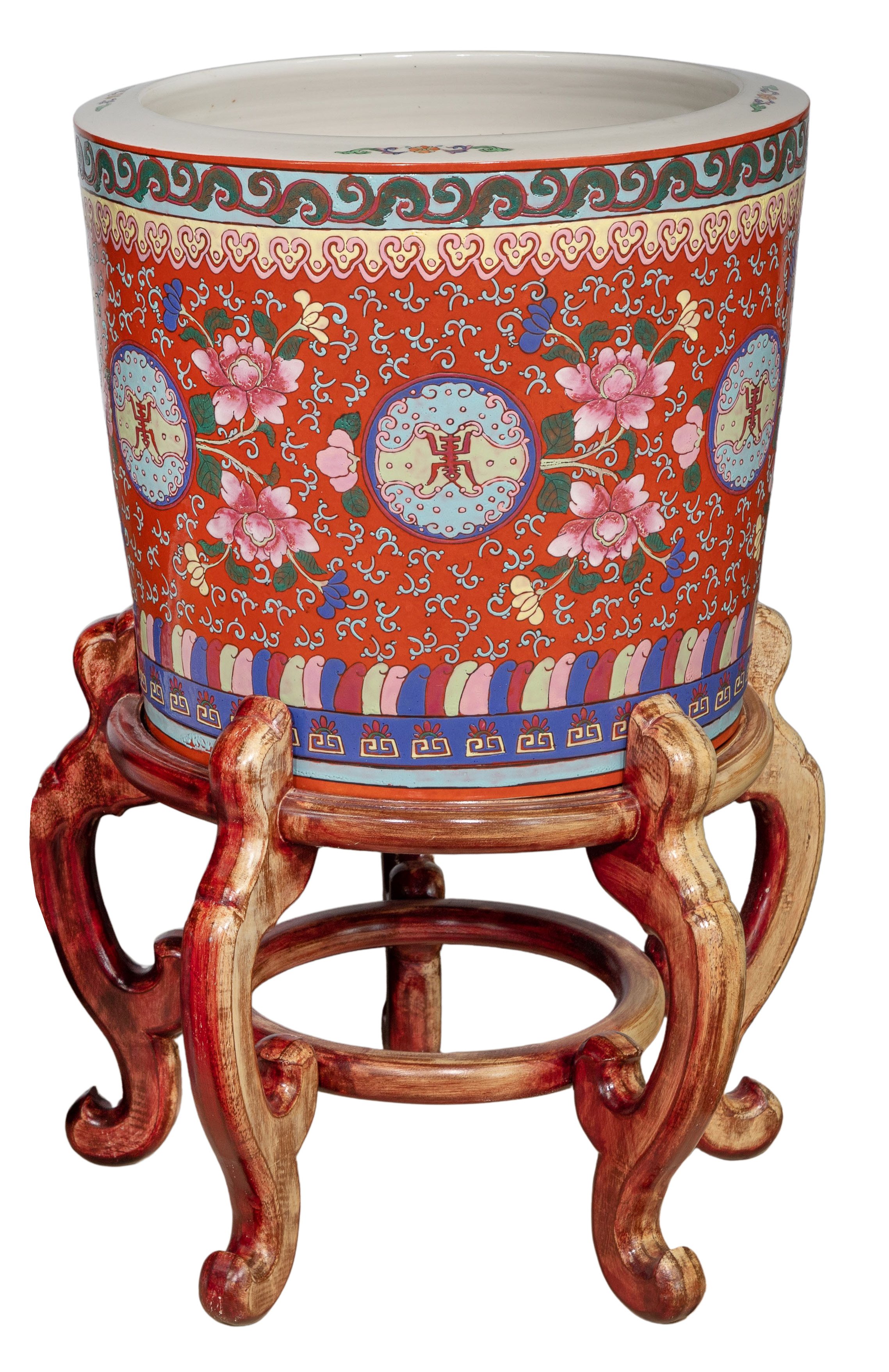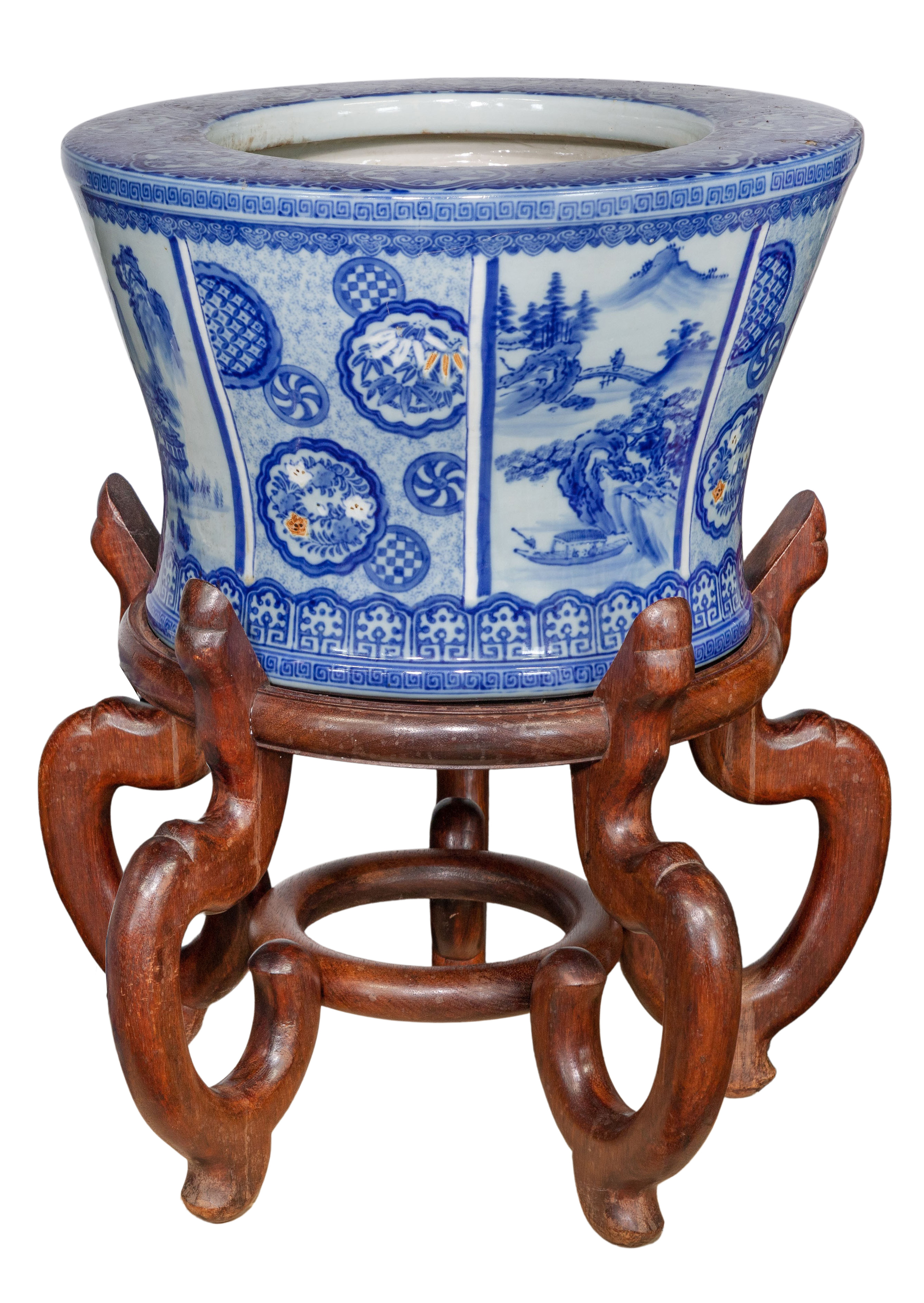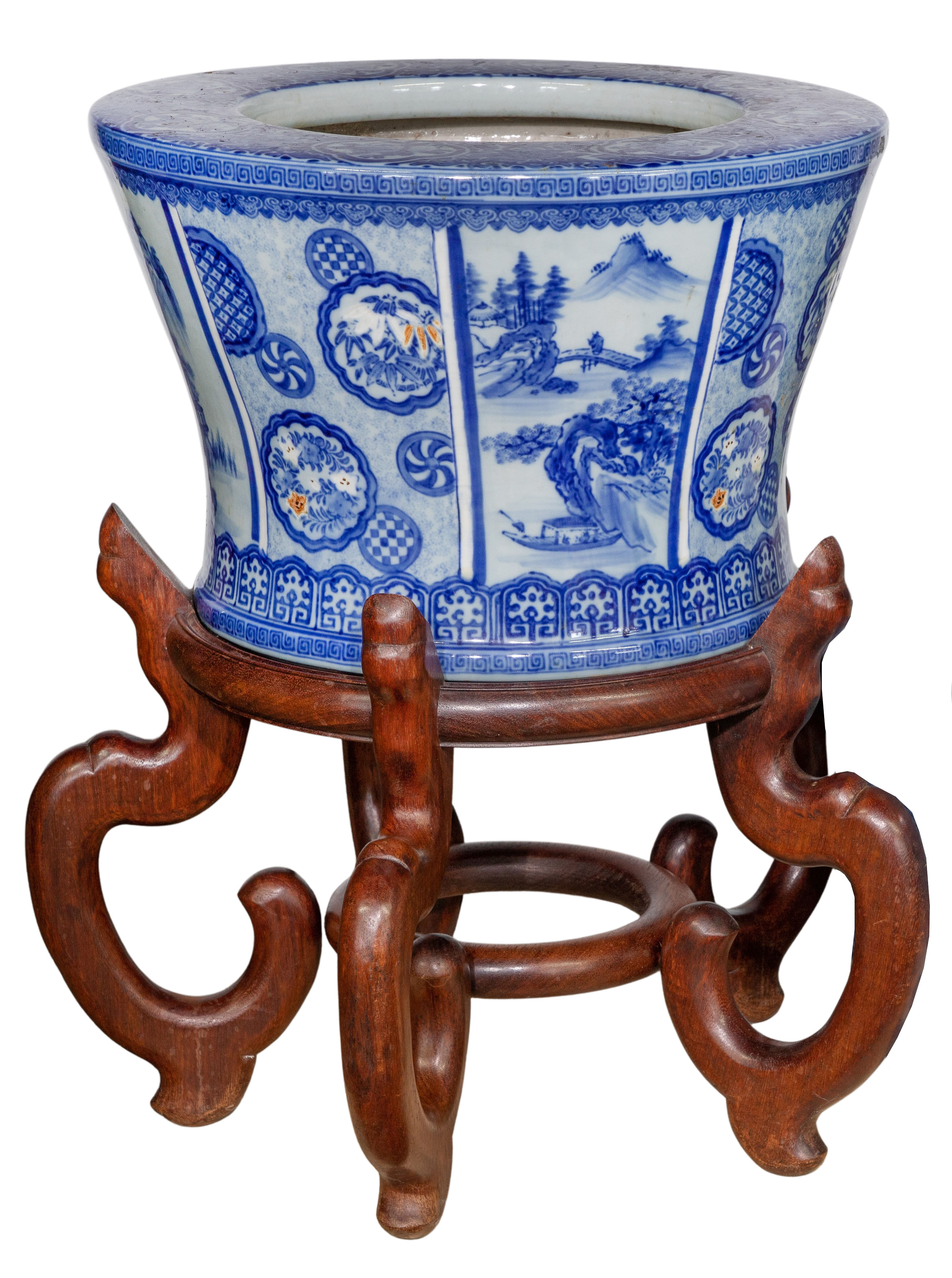 (4) items including a famille rose jardiniere with stand and (3) blue and white planters with one having stand