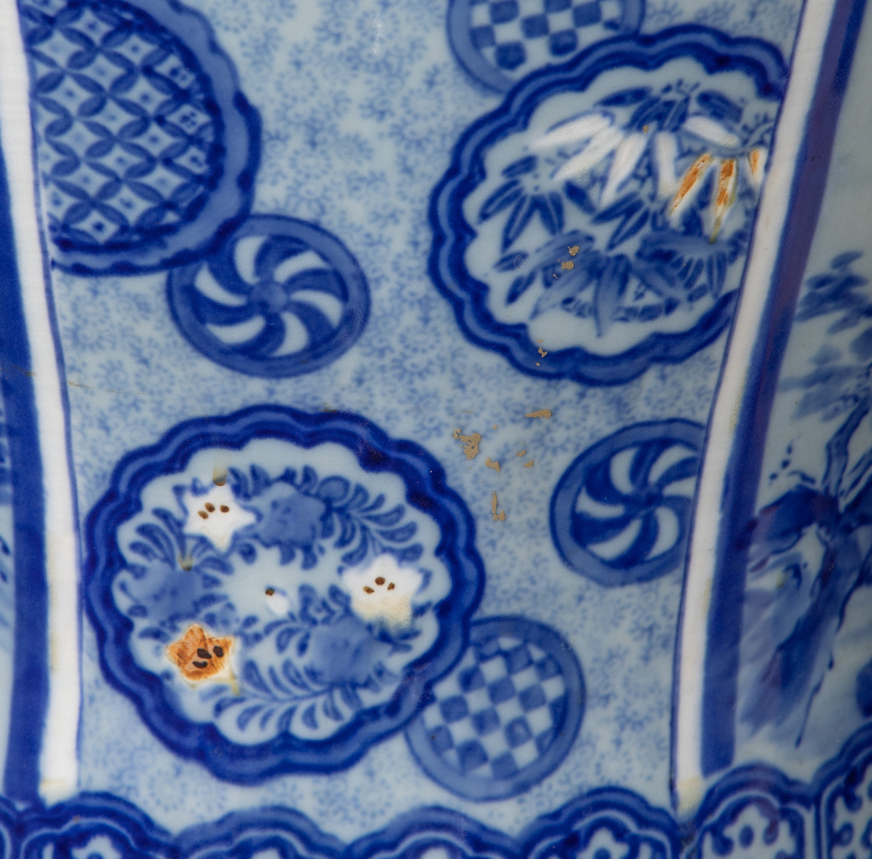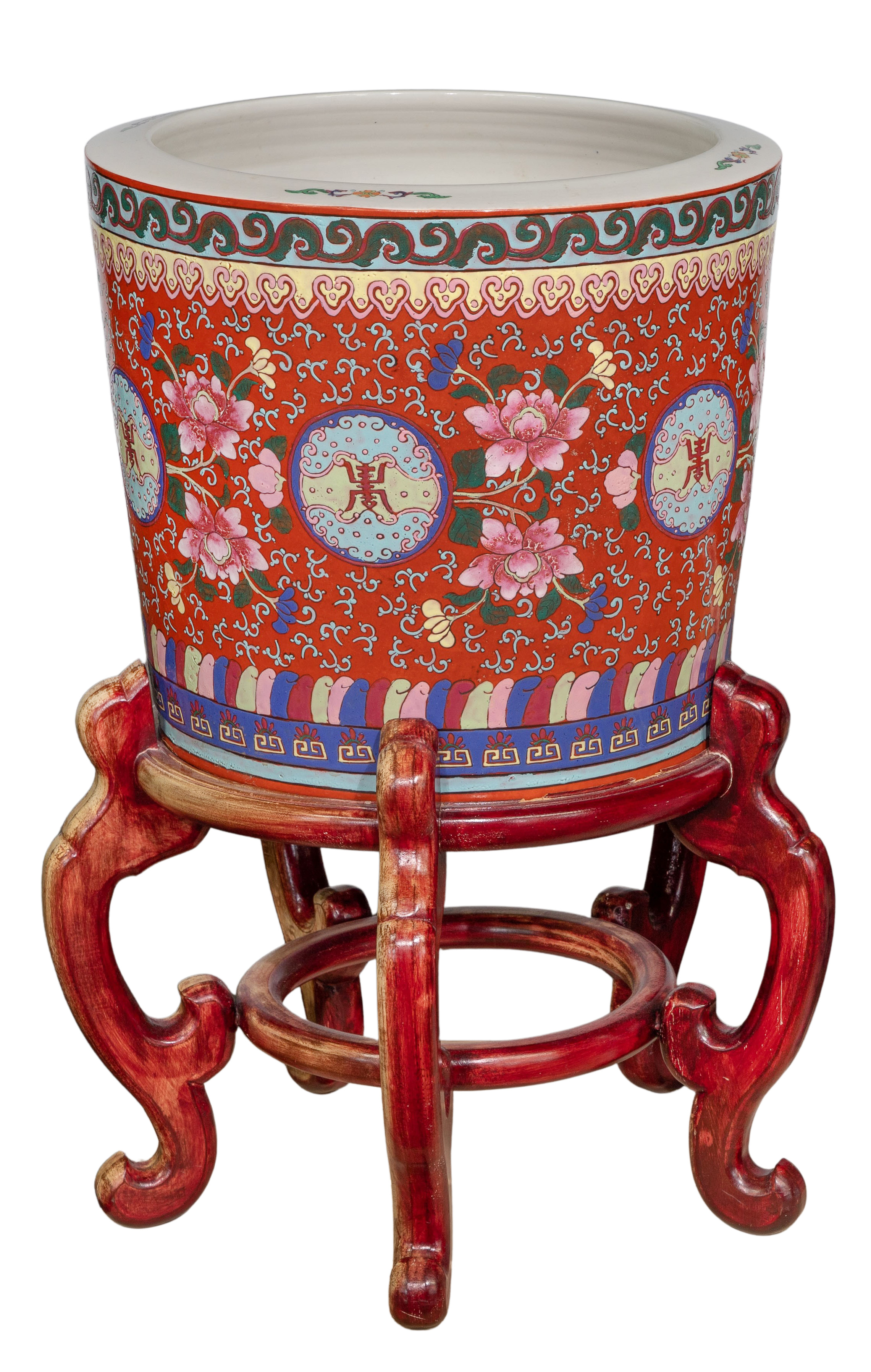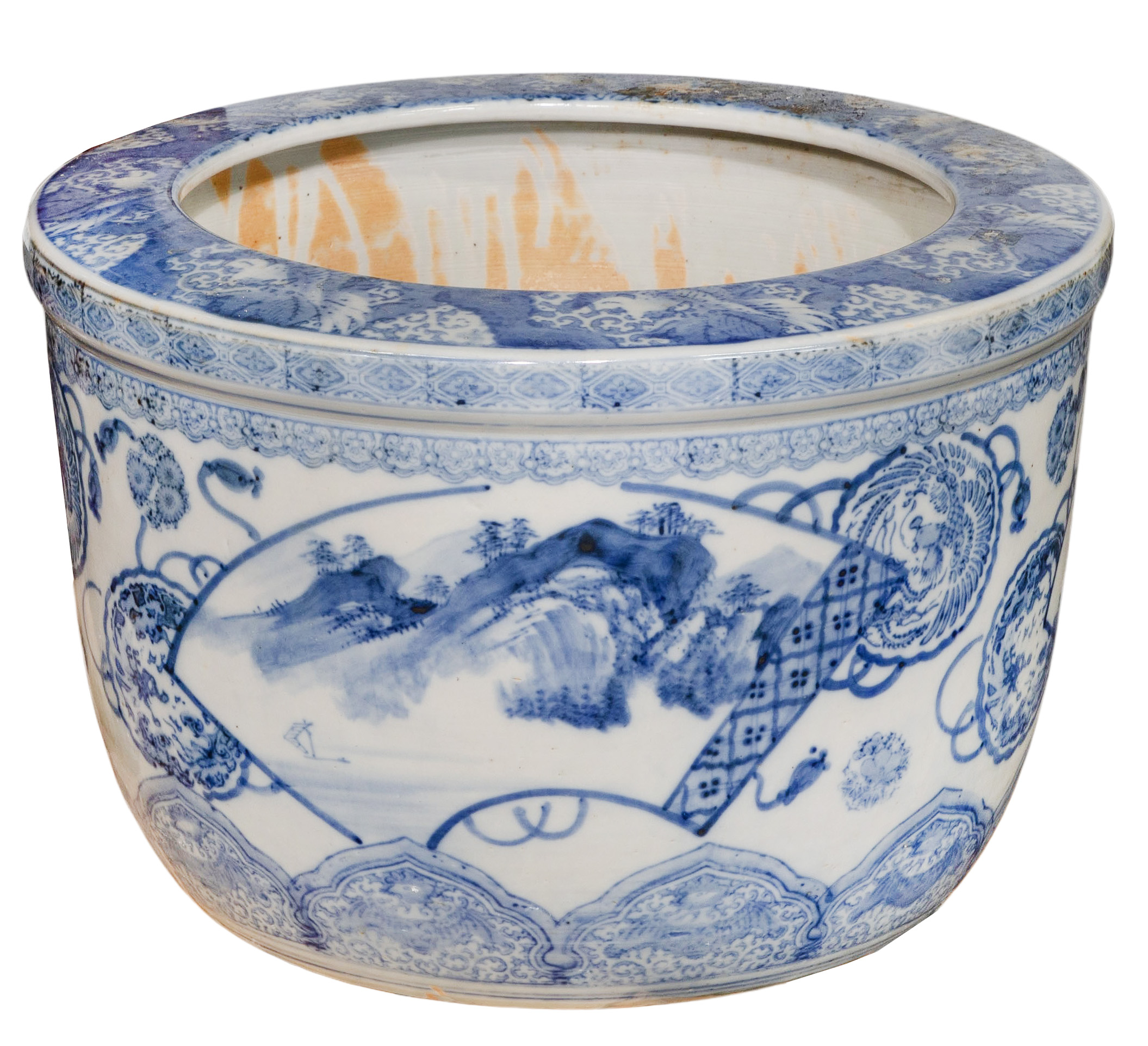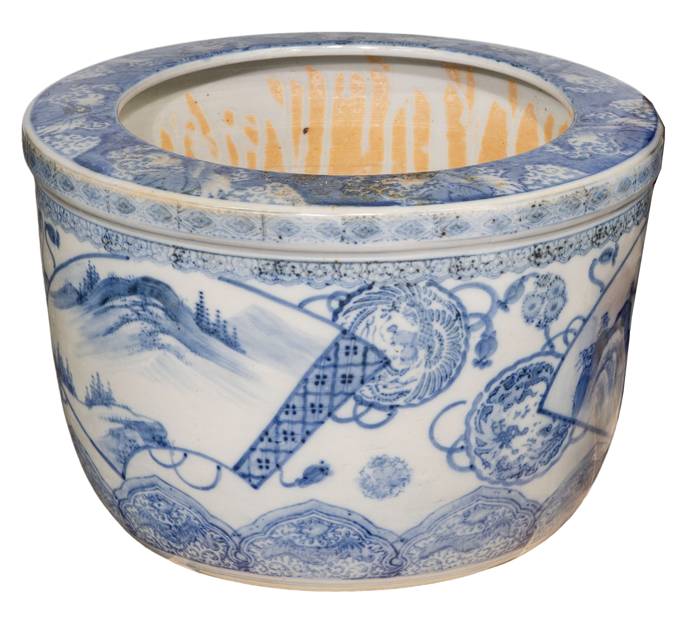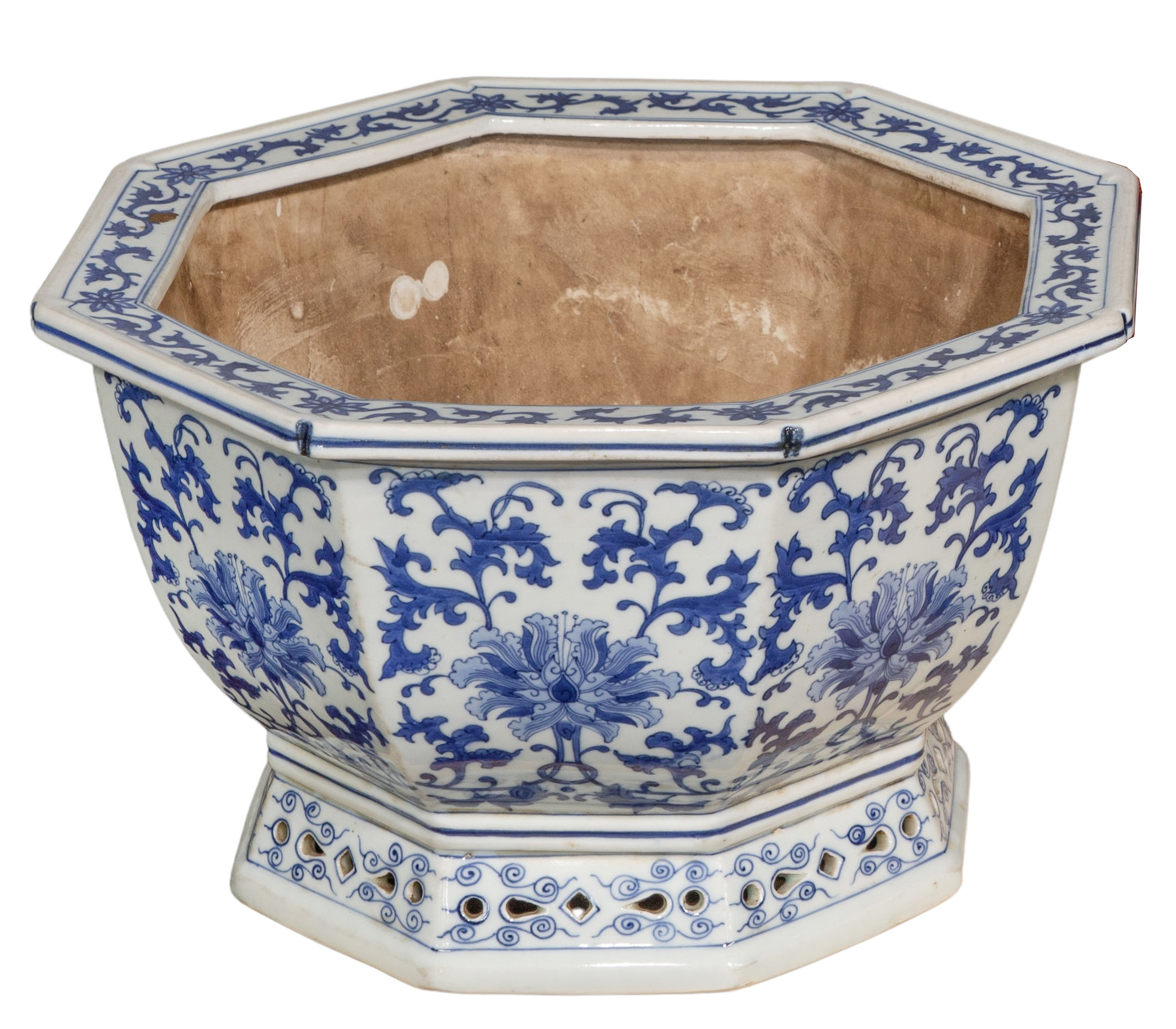 (4) items including a famille rose jardiniere with stand and (3) blue and white planters with one having stand