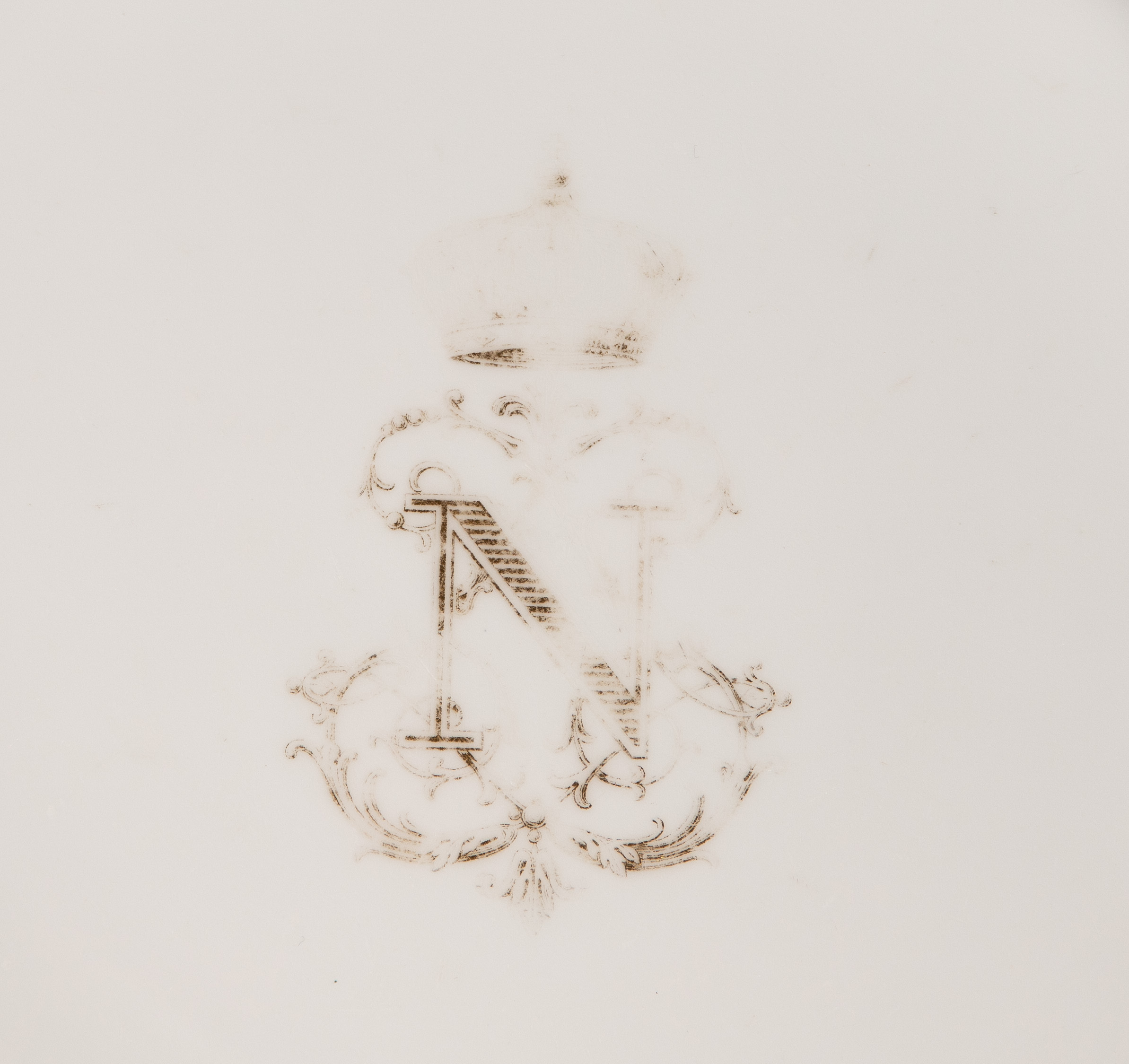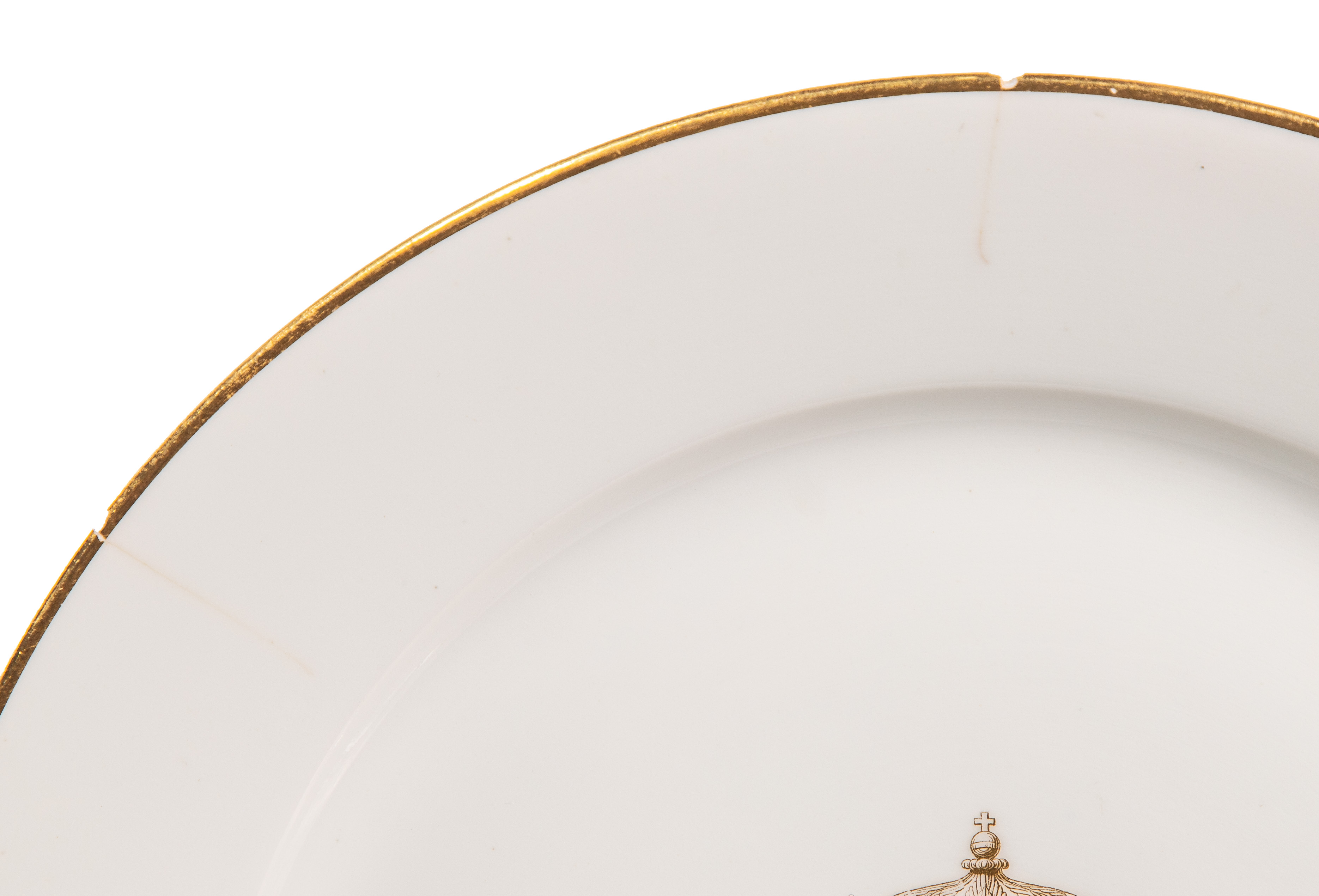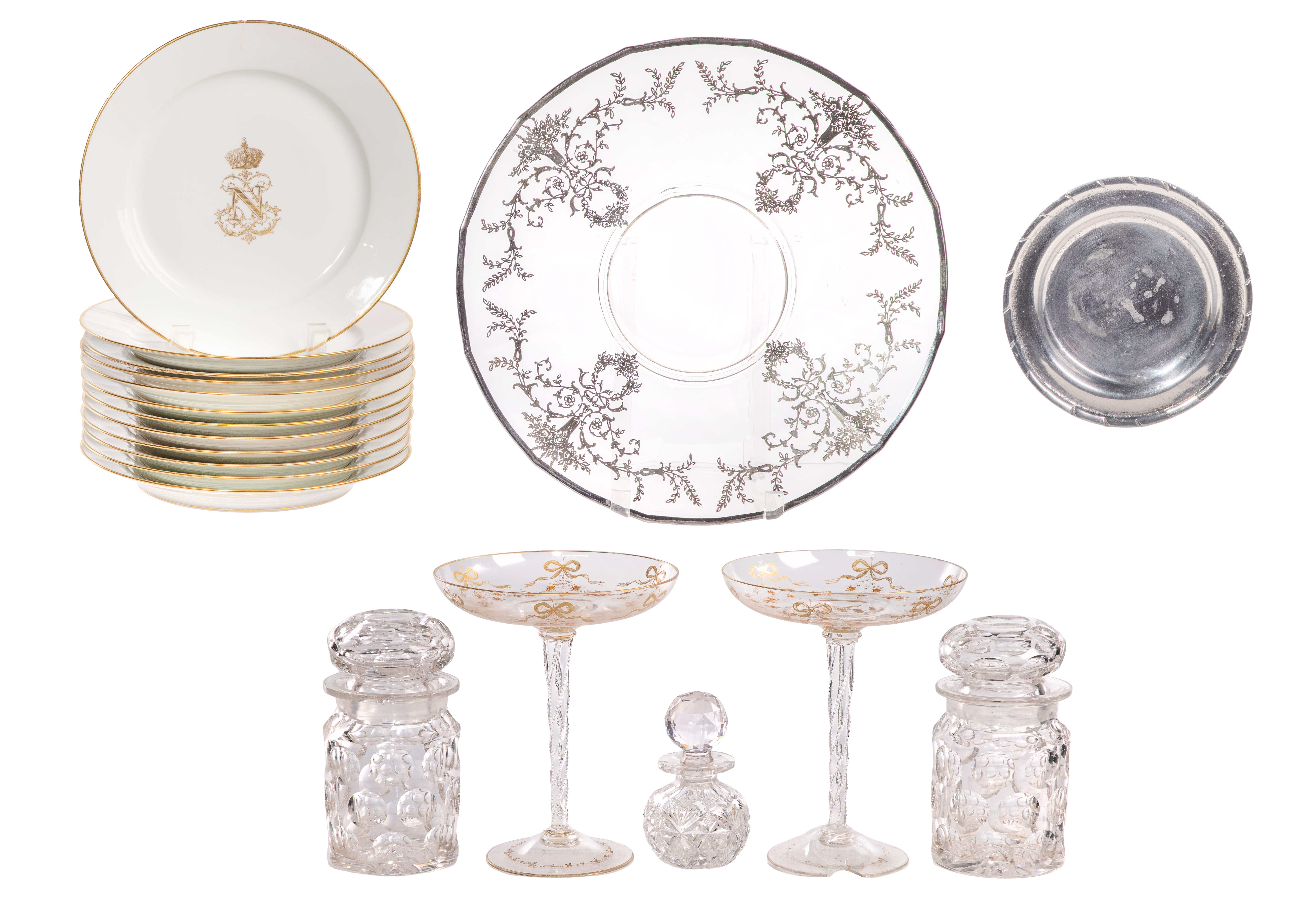 (12) total items including a set of (10) plates having gilt monogram in center and edges, stamped on bottom; together with a pair of Moser intaglio bow tazza having #568-749 etched into underside, a pair of dot motif storage jars, a Czech star crystal oil decanter, a silver overlay glass platter and a metal wine coaster