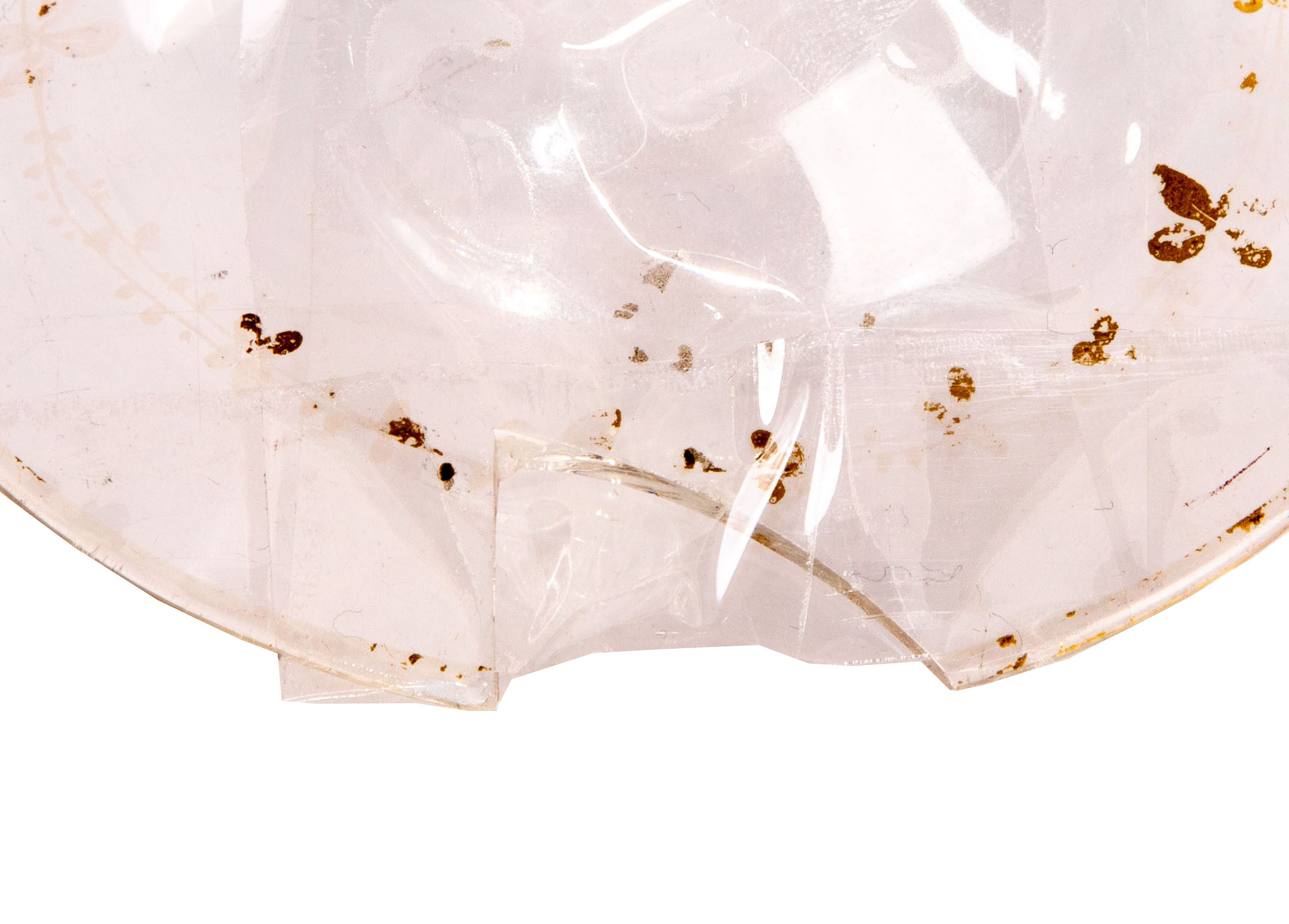 Condition: overall light to heavy wear consistent with normal use, (3) plates having chips and cracks, gilt wear, a compote having a broken piece on base and worn gilt, storage containers having chips to lids and rims, decanter having chips to stopper, platter having worn silver on edges