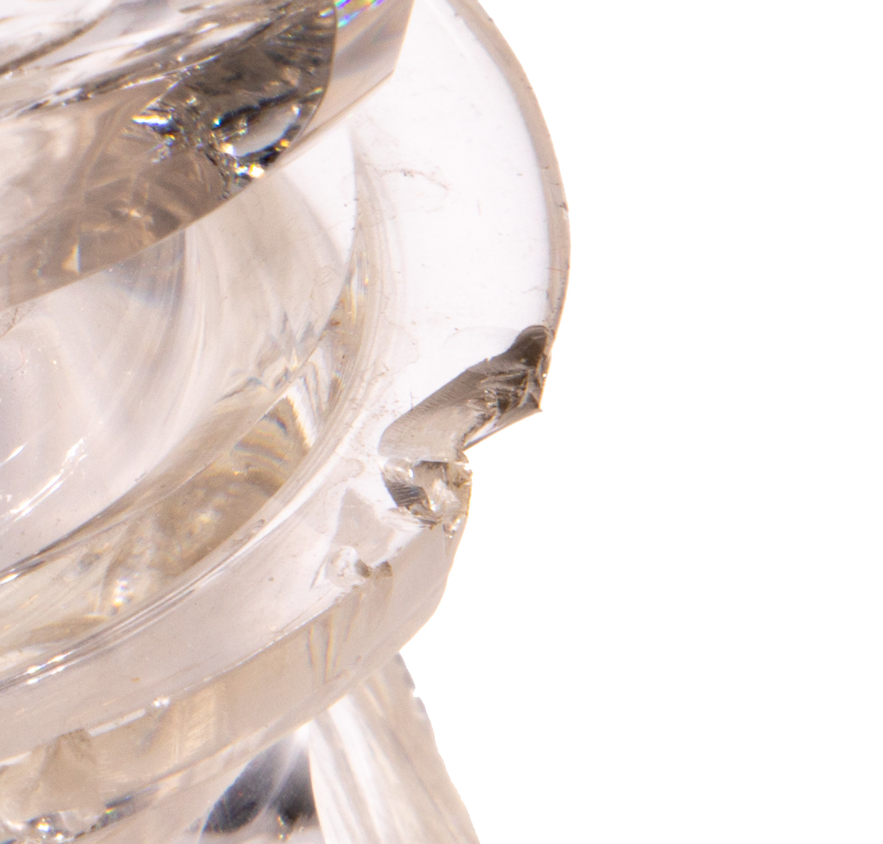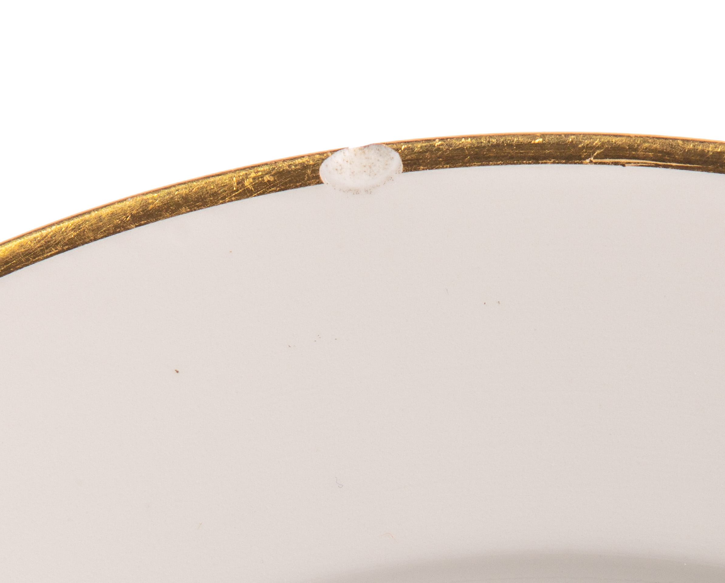 overall light to heavy wear consistent with normal use, (3) plates having chips and cracks, gilt wear, a compote having a broken piece on base and worn gilt, storage containers having chips to lids and rims, decanter having chips to stopper, platter having worn silver on edges