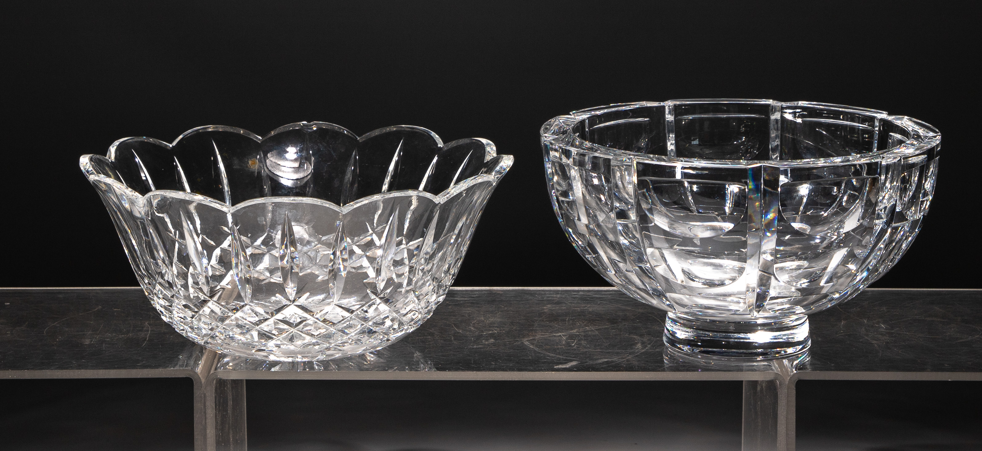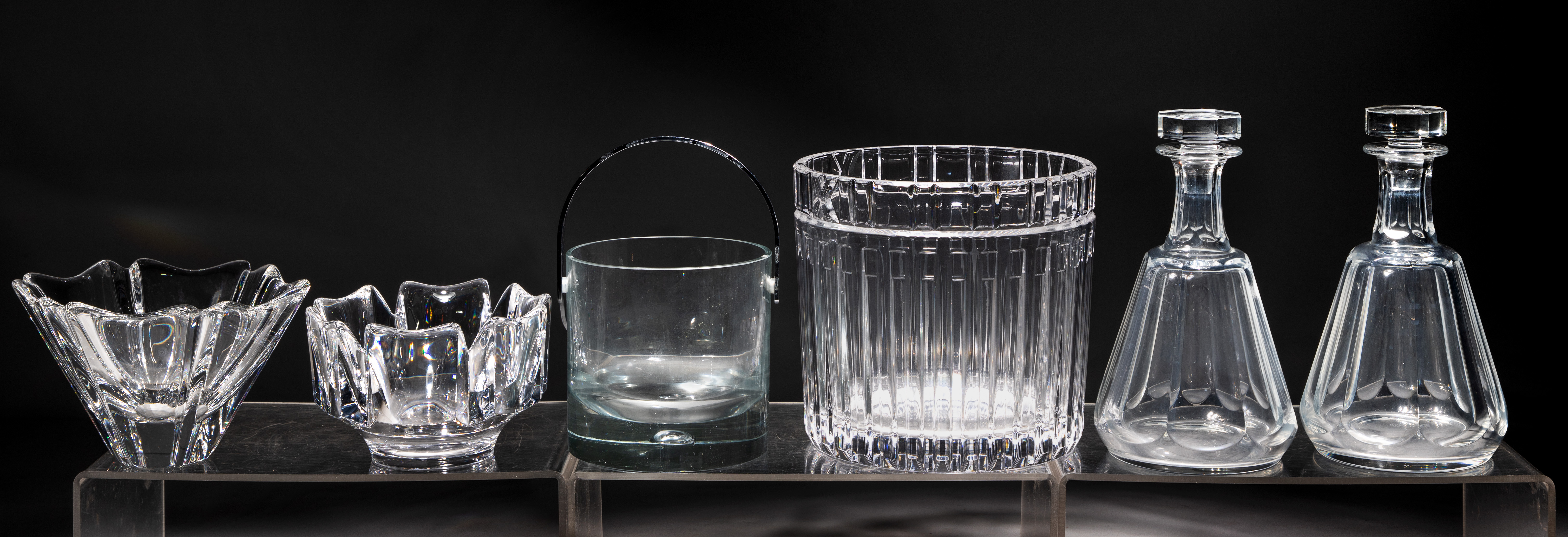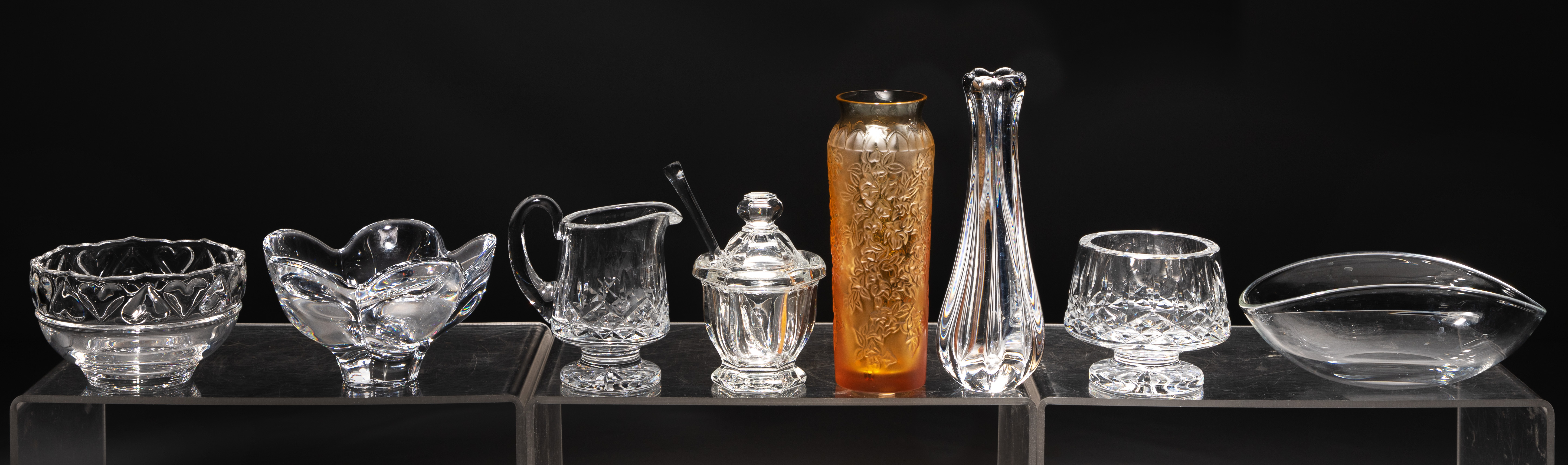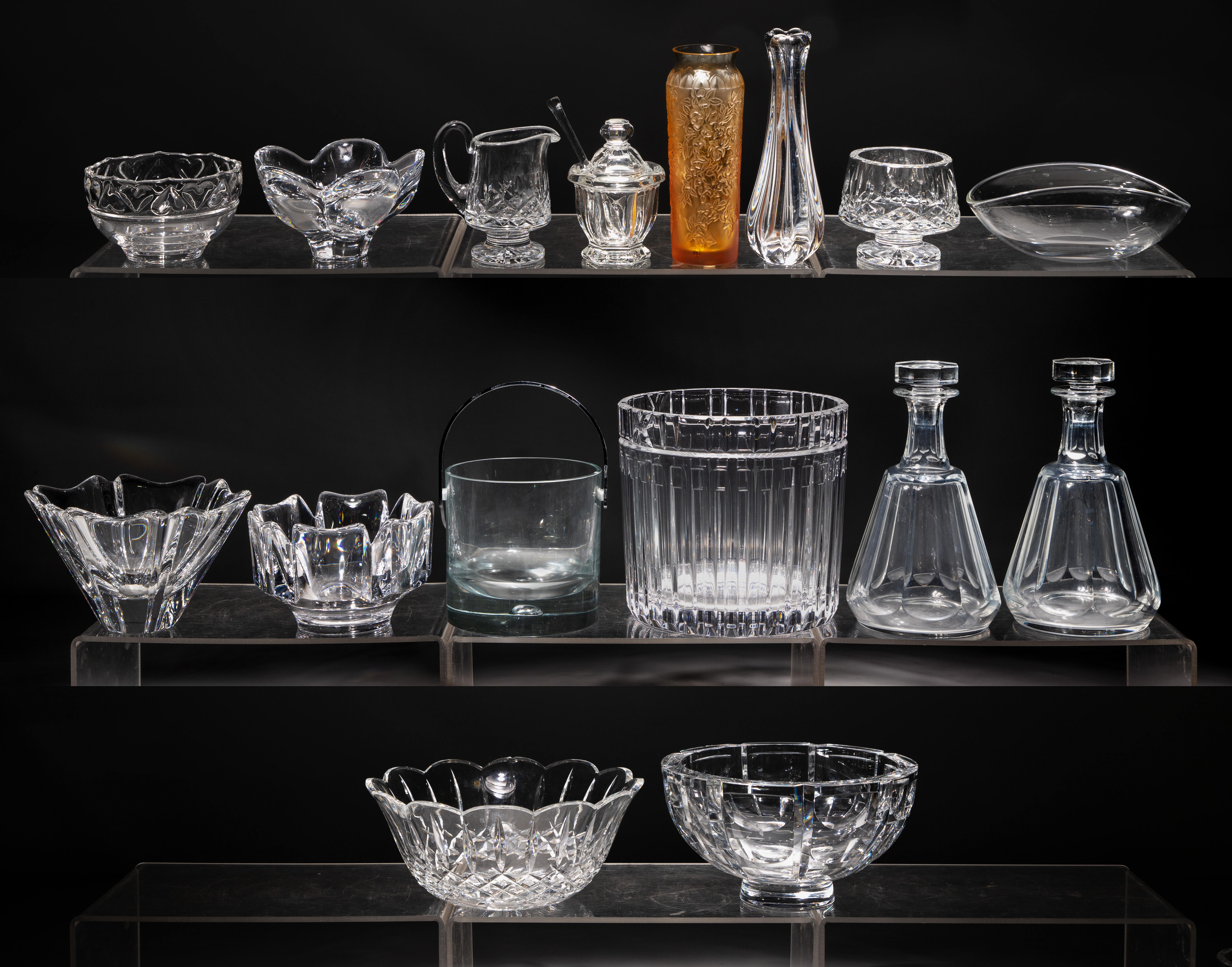 (16) items including a gold Bougainvillea floral vase, etch signed on underside as well as bowls, vases, cream and sugar, a jam jar, an ice bucket, a champagne bucket and decanters from makers such as Baccarat, Waterford, Tiffany and Orrefors, most marked on underside