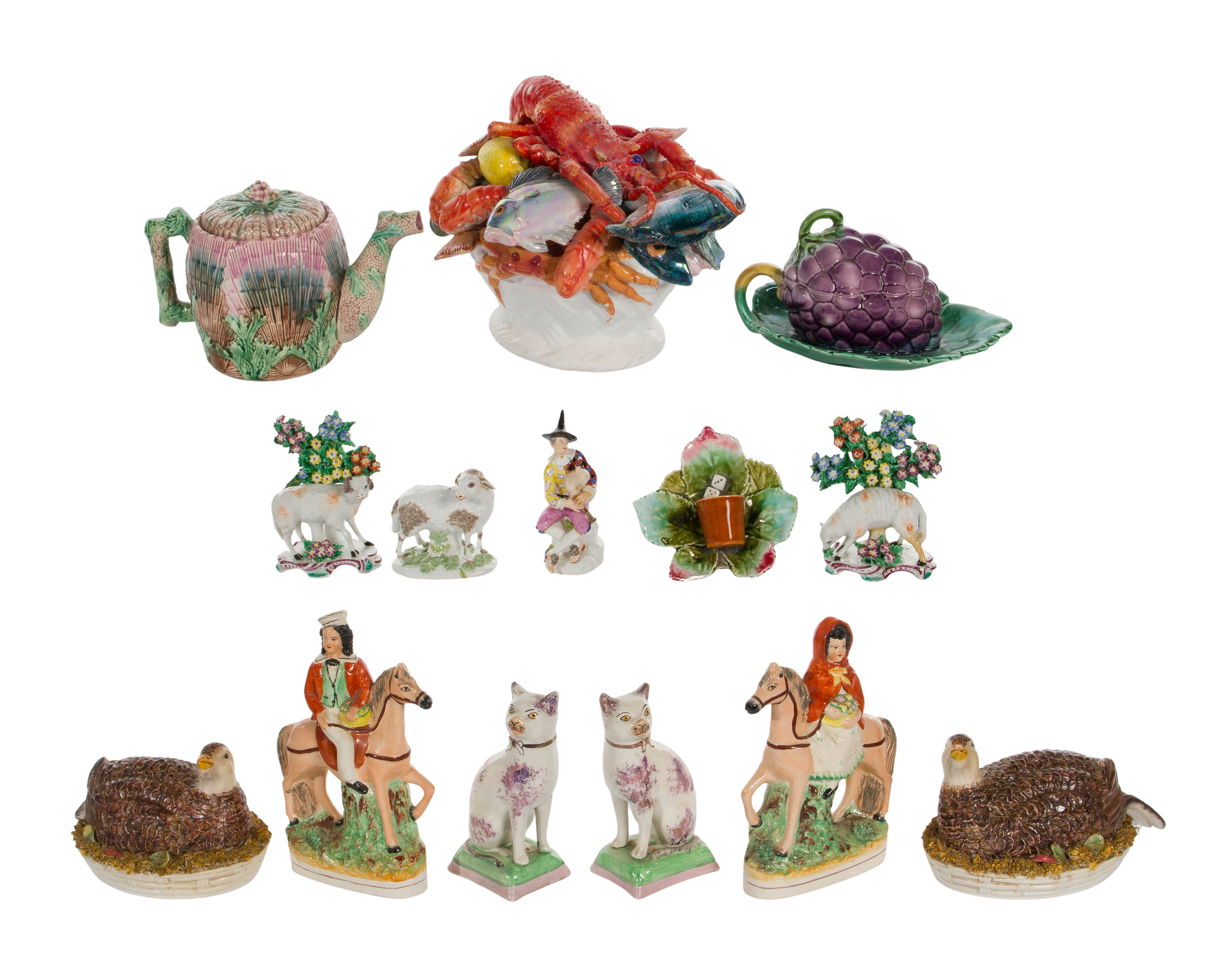 (14) items including a creatures of the sea centerpiece, quail lidded bowls marked ‘Meiselman Italy’ and various other porcelain ware including Staffordshire figurines of different shapes and sizes, some marked