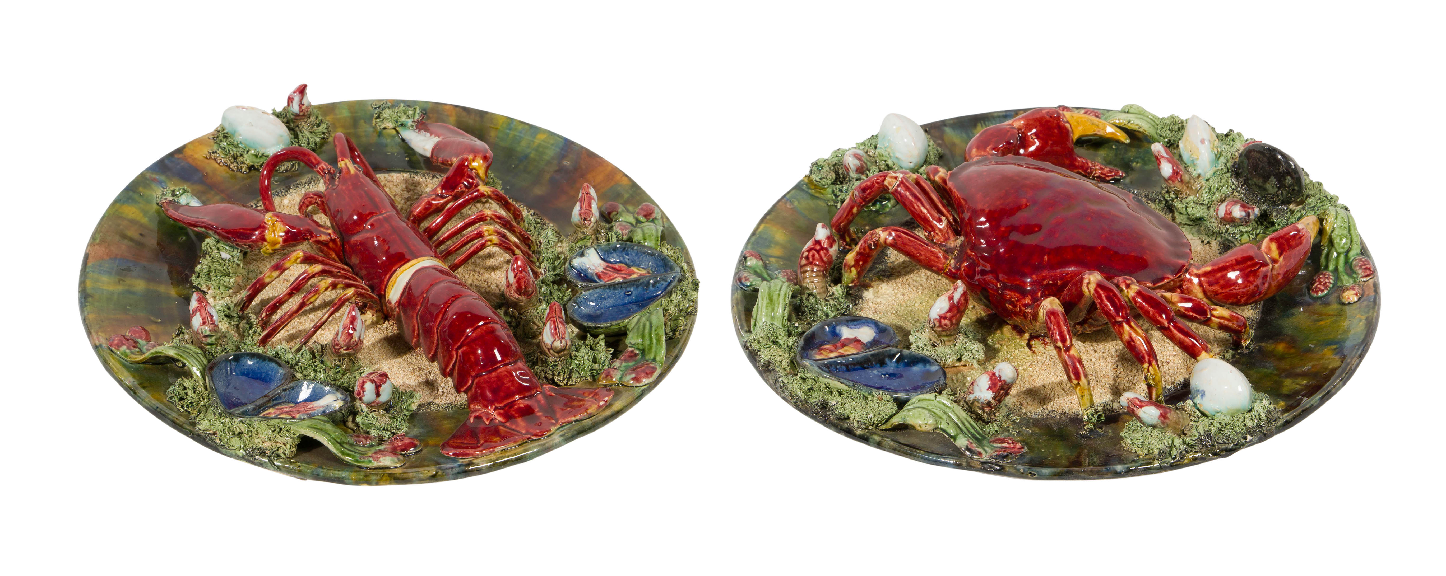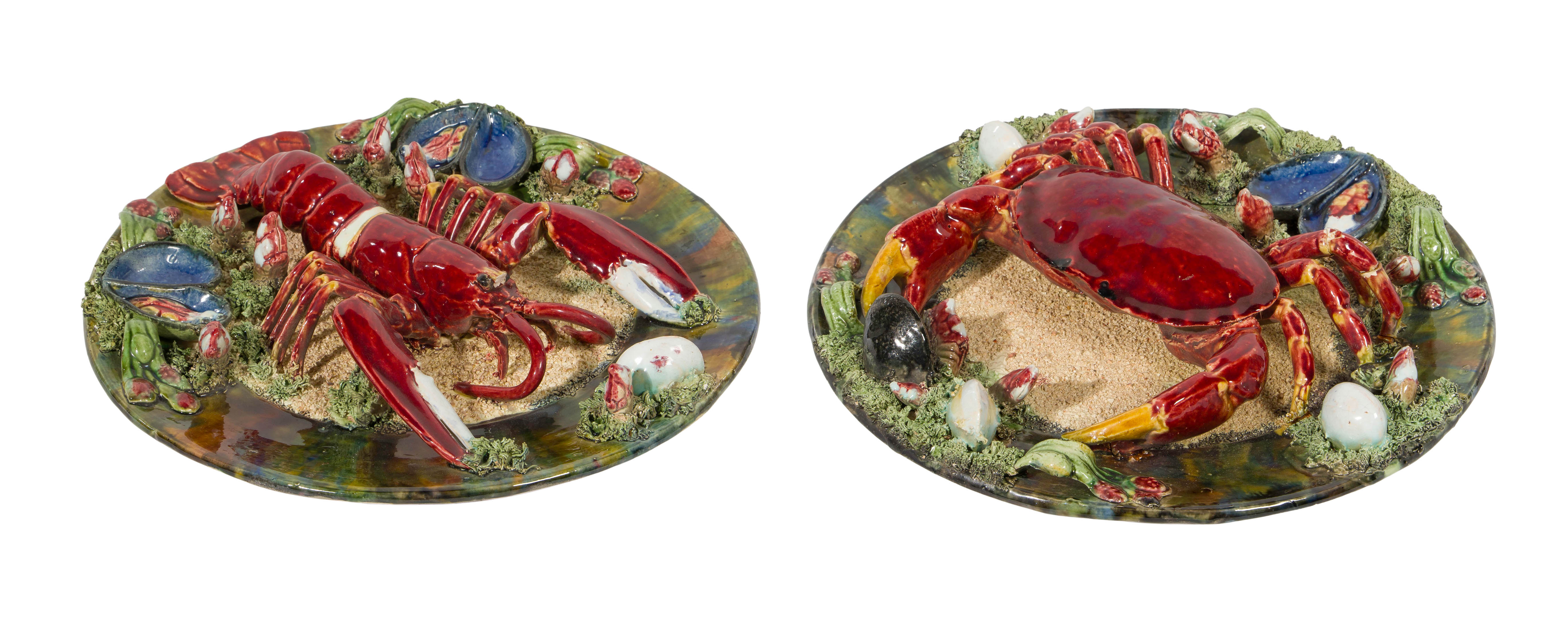 Condition: lobster having broken / missing antennas, no damage noted to crab plate, crab having repairs on legs and small pieces missing