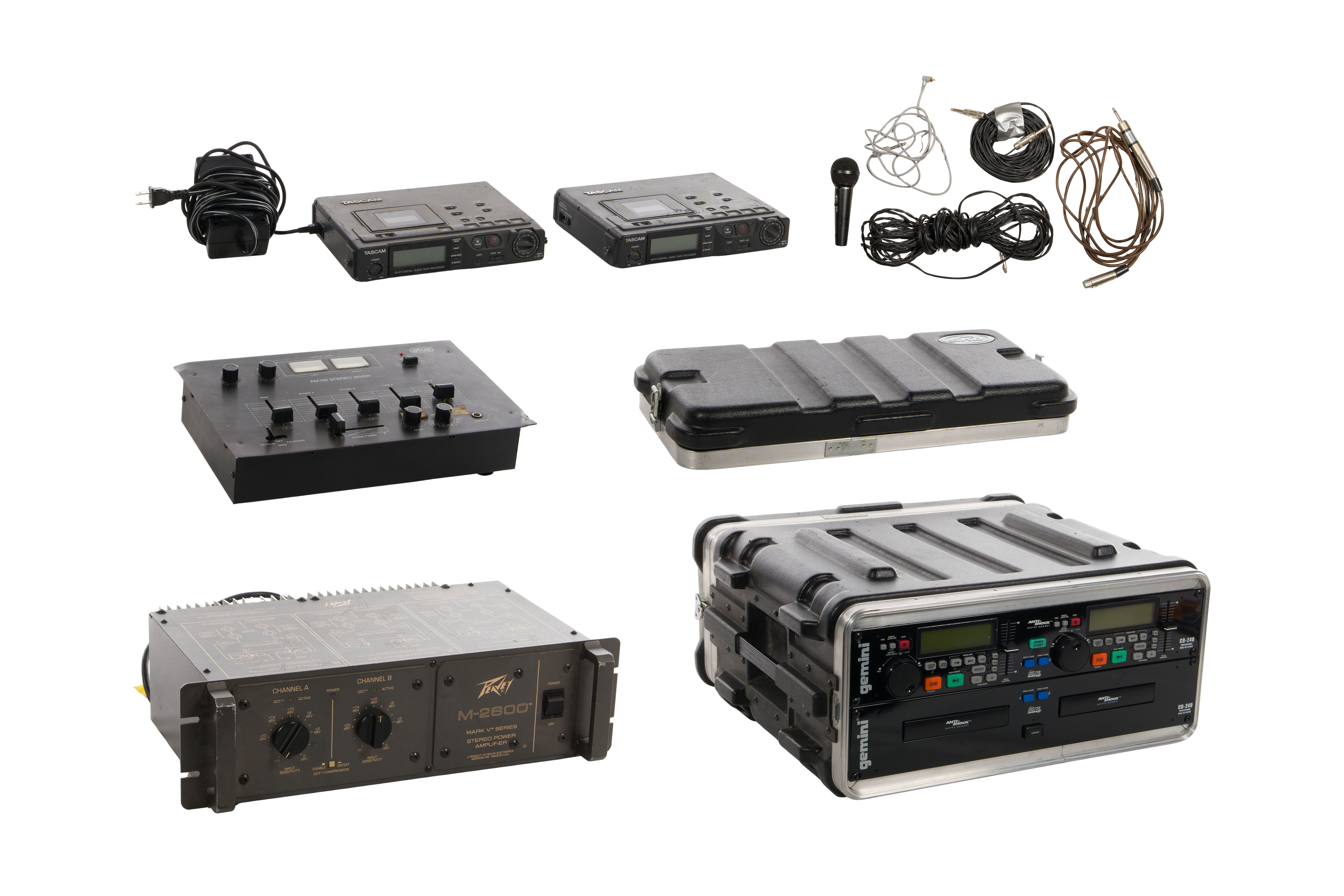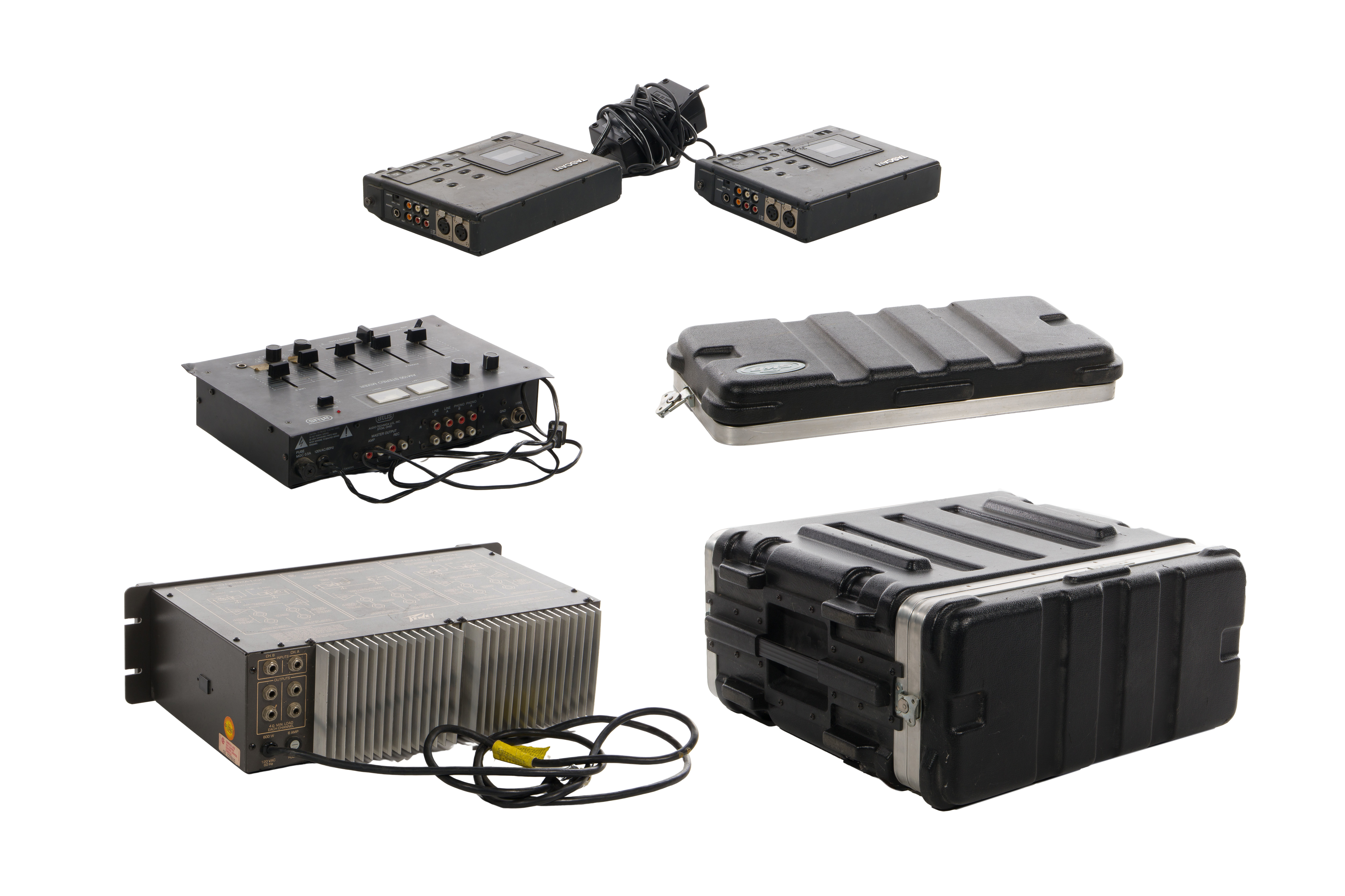 (5) items including a 2-channel convection cooled power amplifier and DDT compressor, an Atus AM100 stereo mixer, (2) Tanscam DA-P1 audio tape recorders with microphone and a Gemini CD 240 professional dual CD player in hard travel case as well as various cords