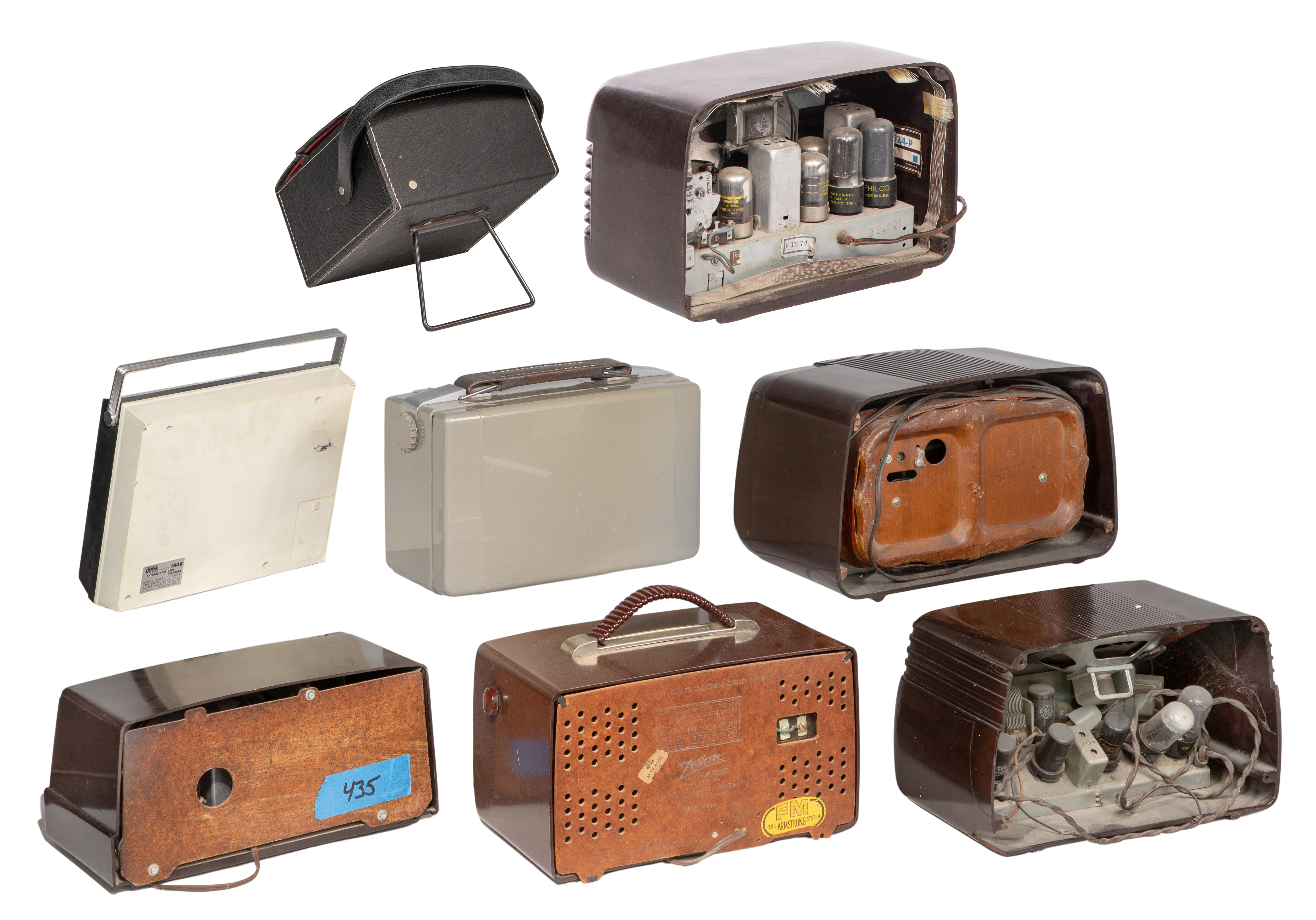 overall light wear consistent with normal use, scuffs, nicks, chips, backings missing, most powered up when tested, not tested further, Philco not tested and having damaged cord