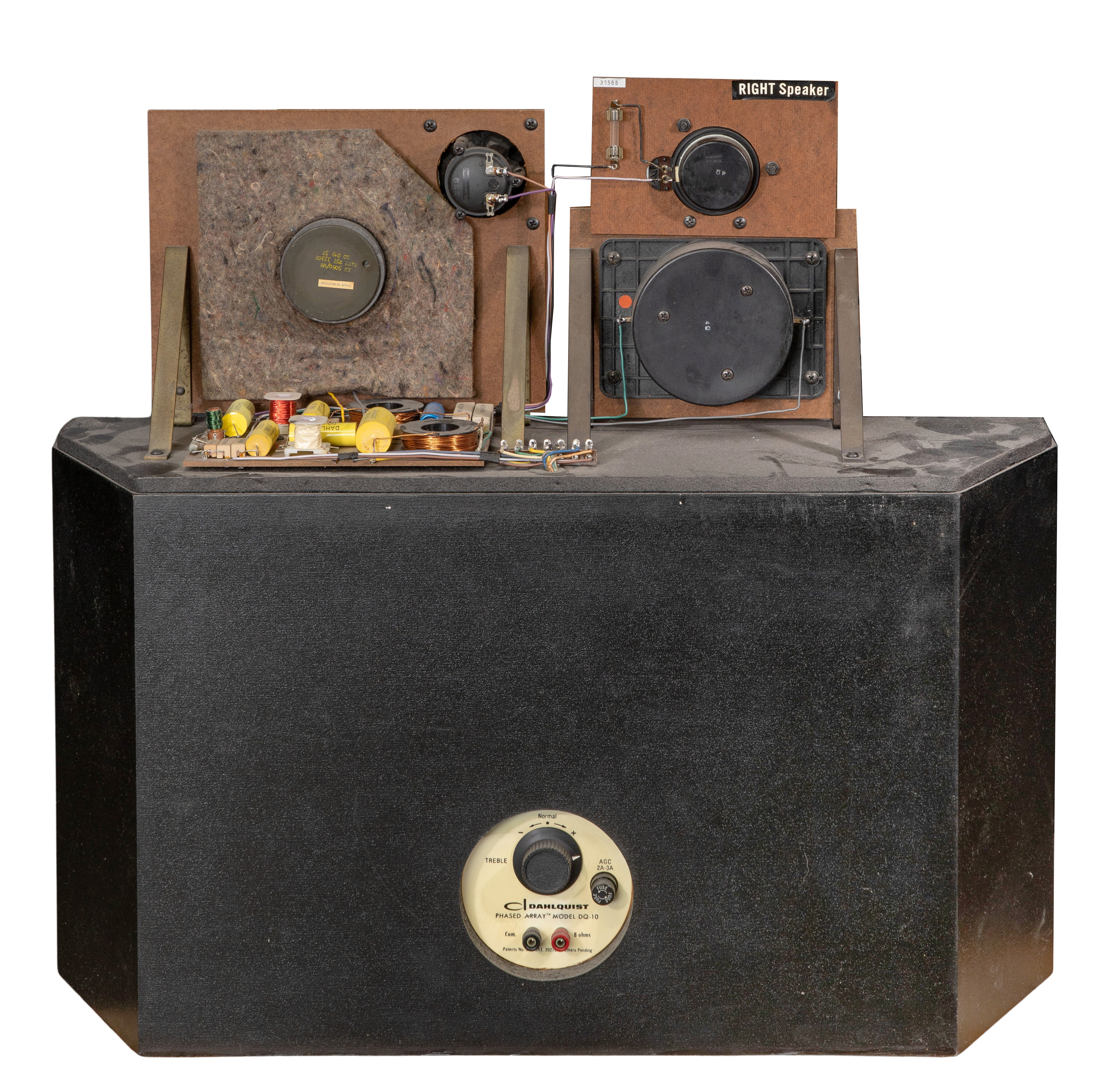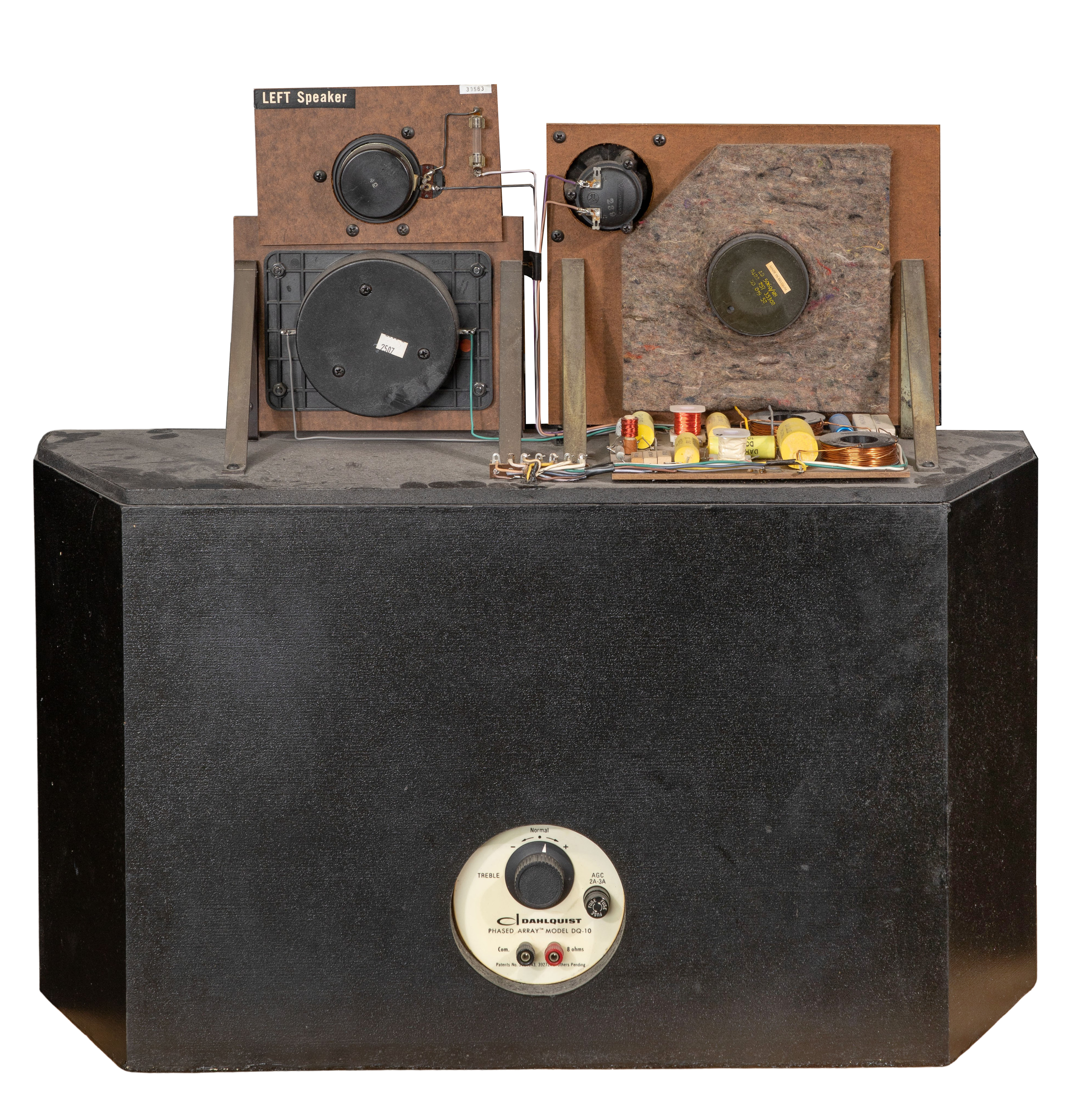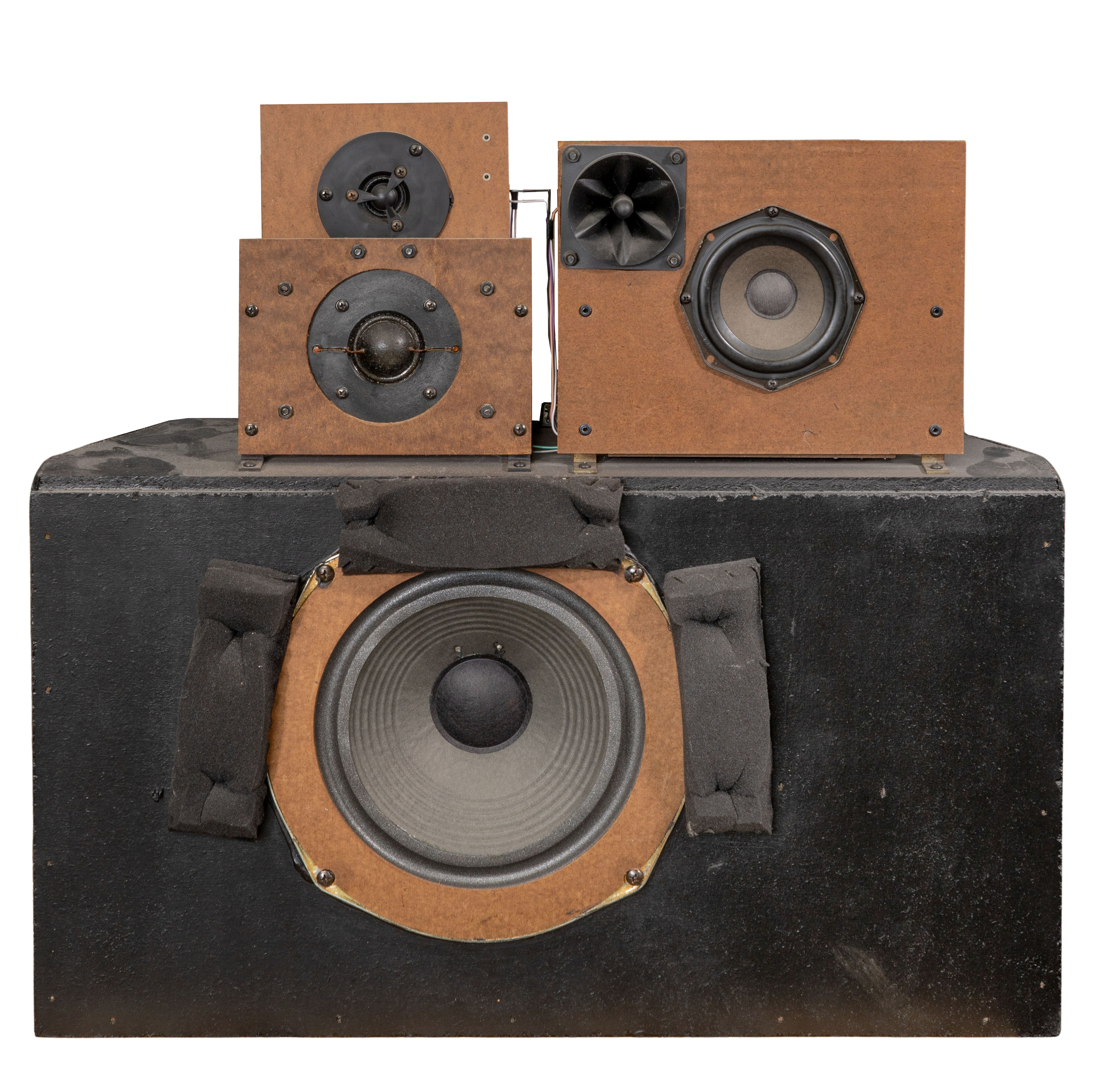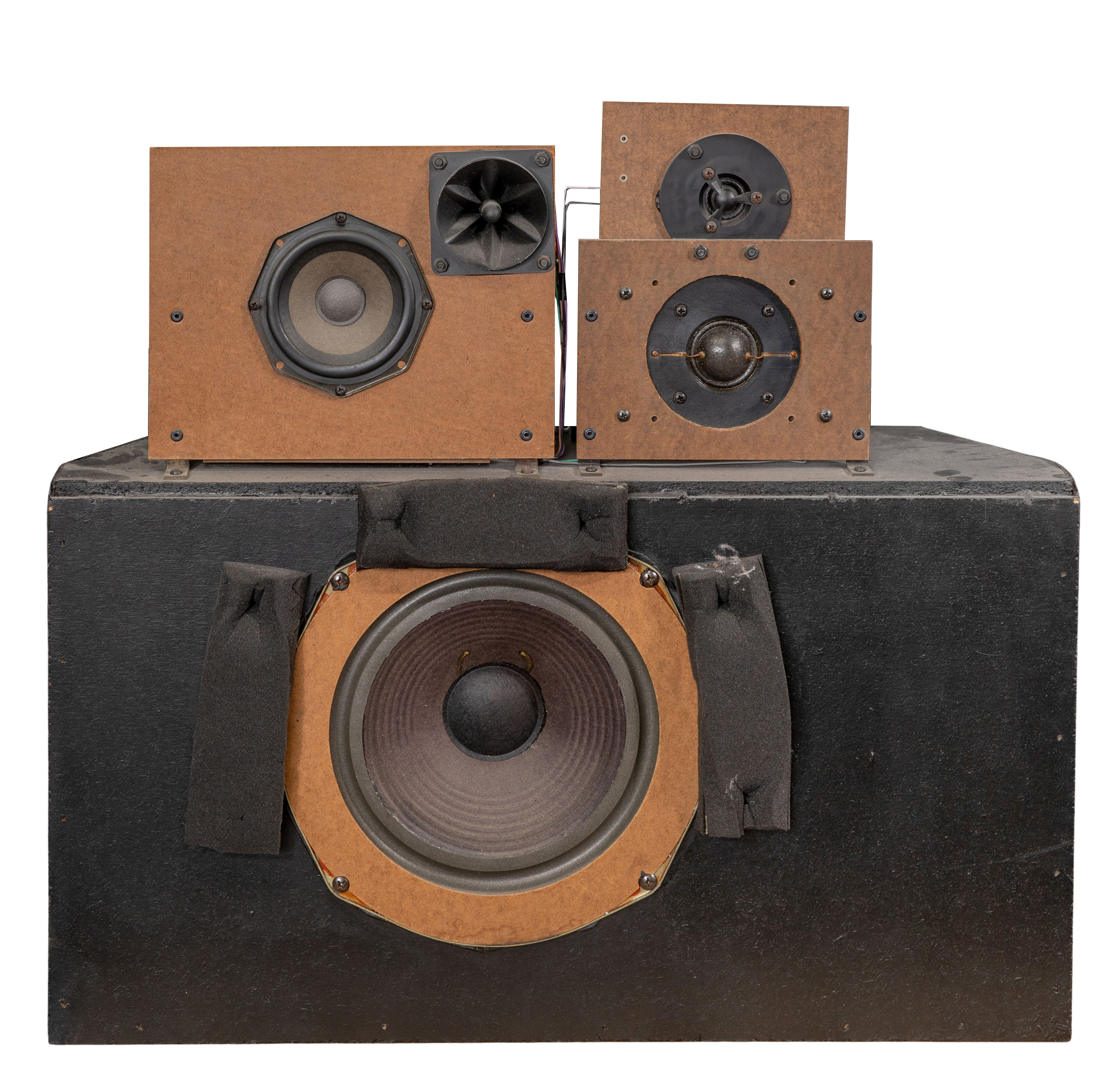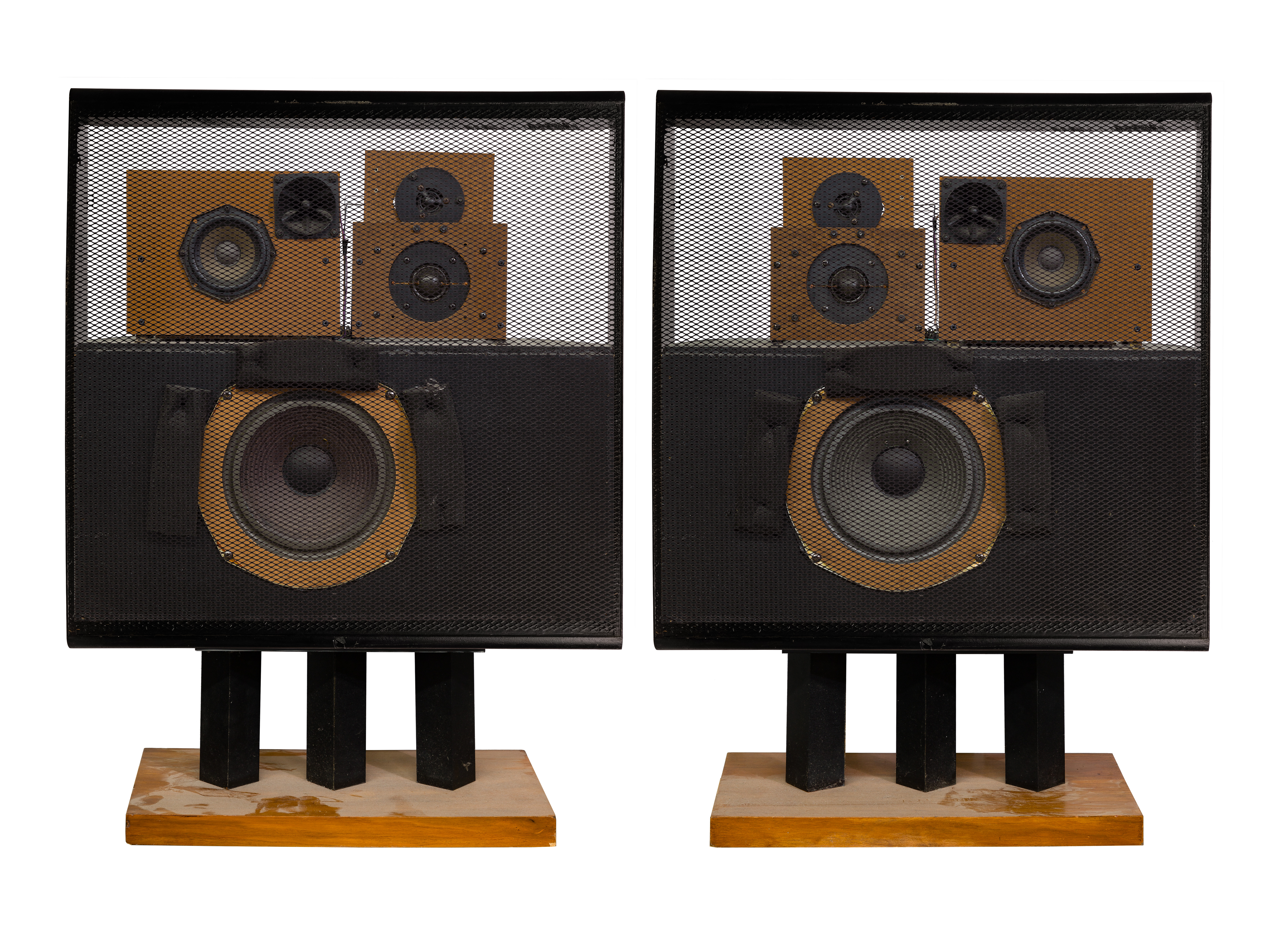 A pair having a five-way, open-baffle design, notable for their physical appearance, including a large, flat front panel and unconventional layout of drivers, including stands, no cords