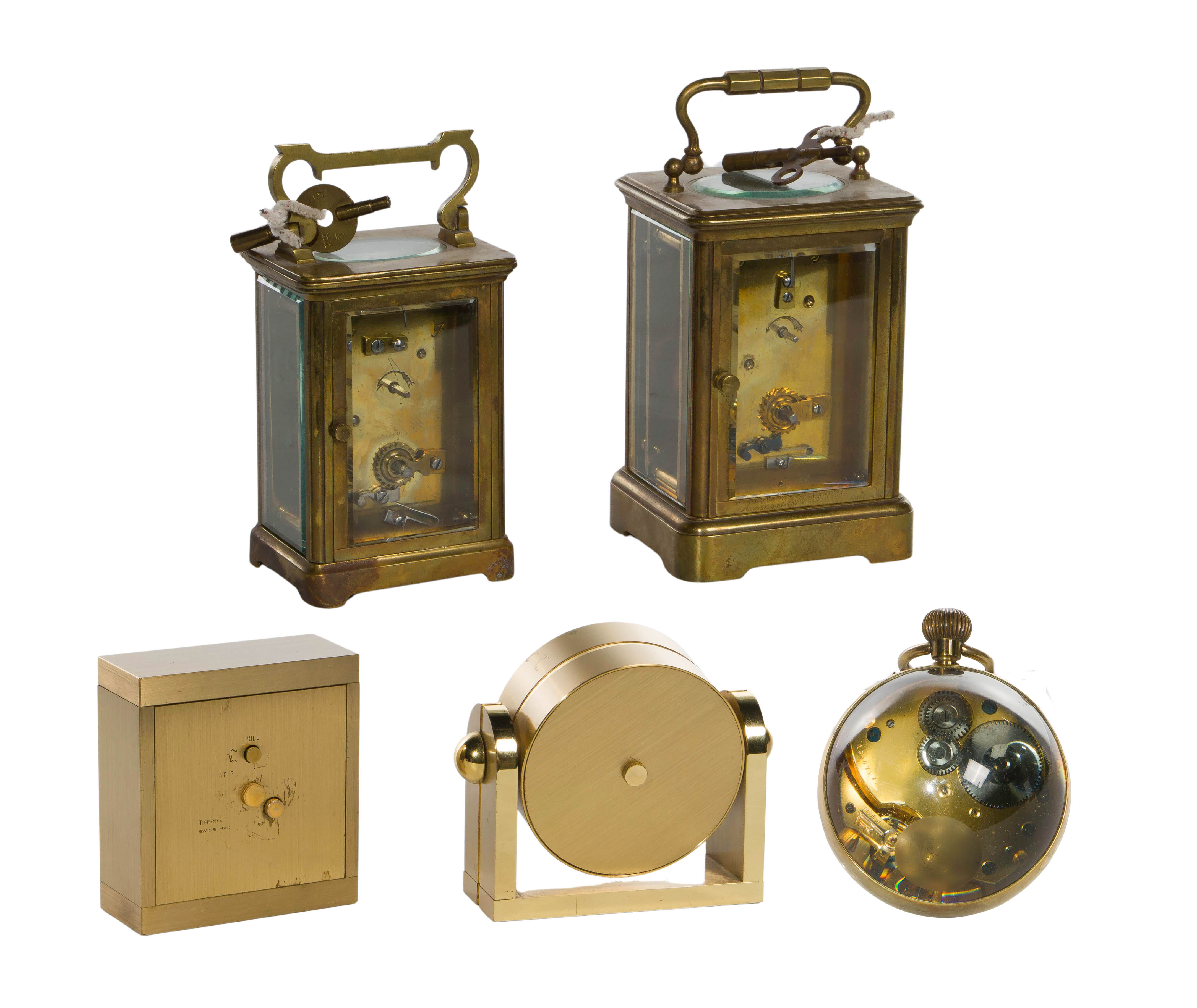 (5) items including (2) desk clocks signed ‘Tiffany’ as well as a glass sphere and (2) French bevel glass and brass unsigned carriage clocks having keys