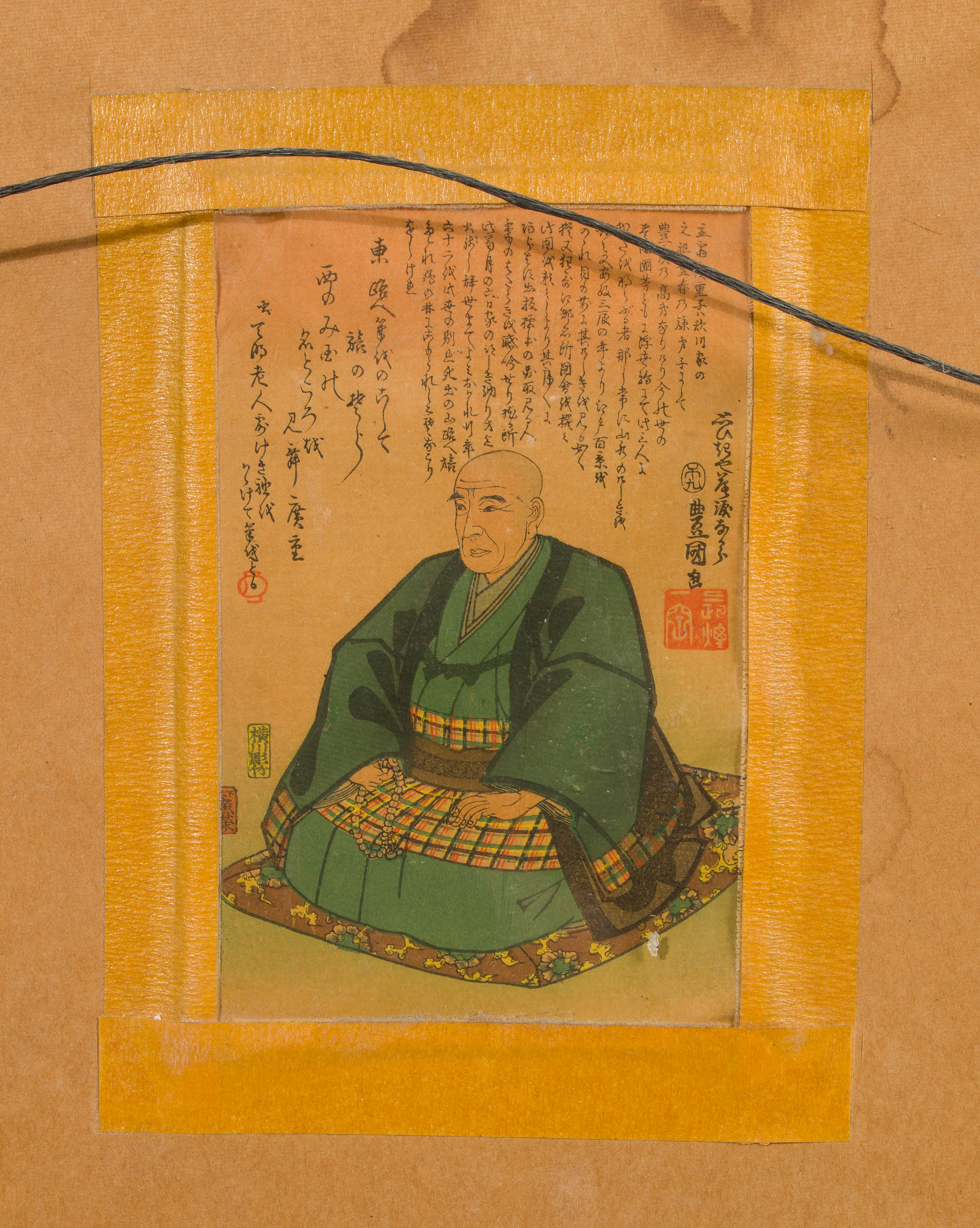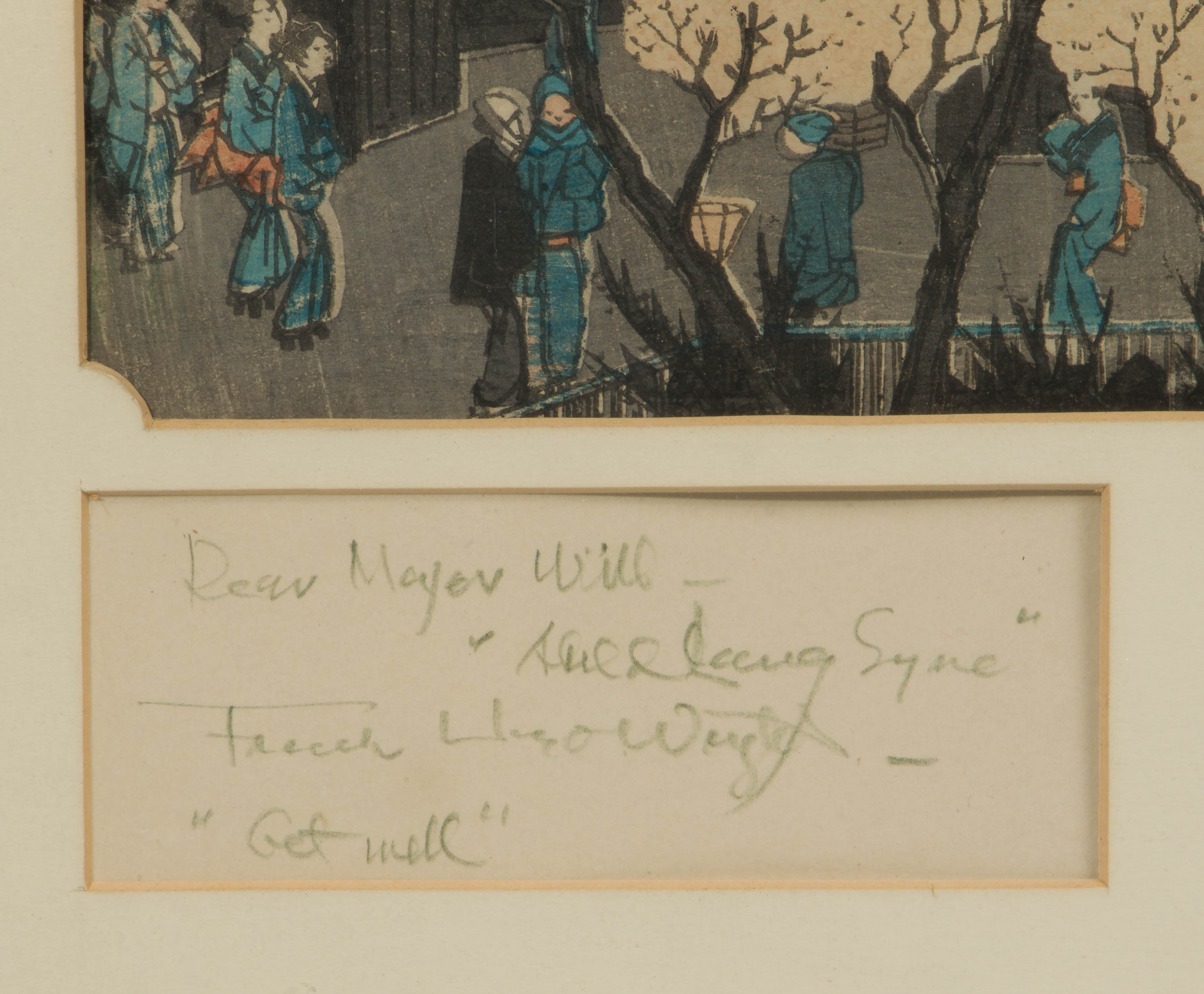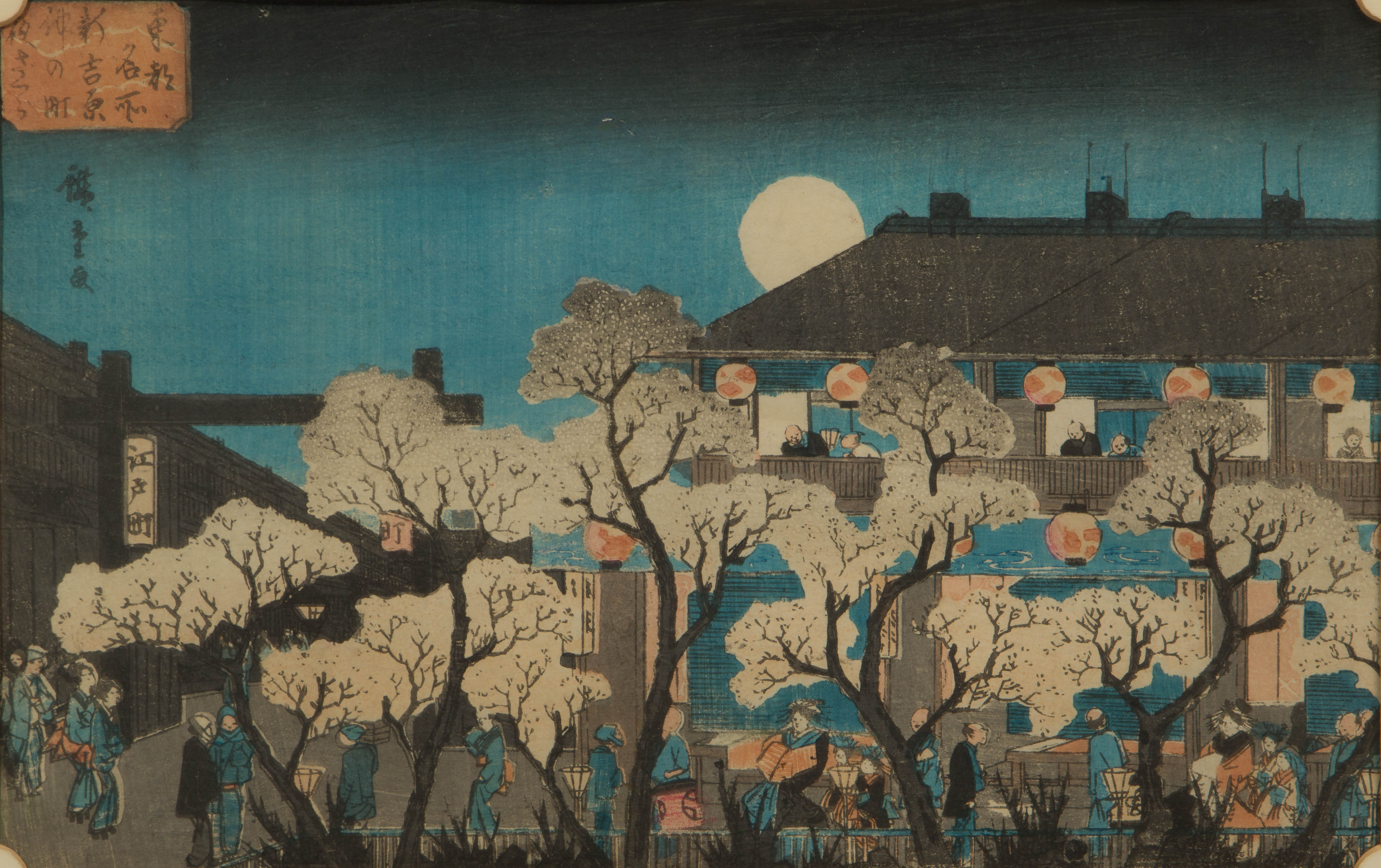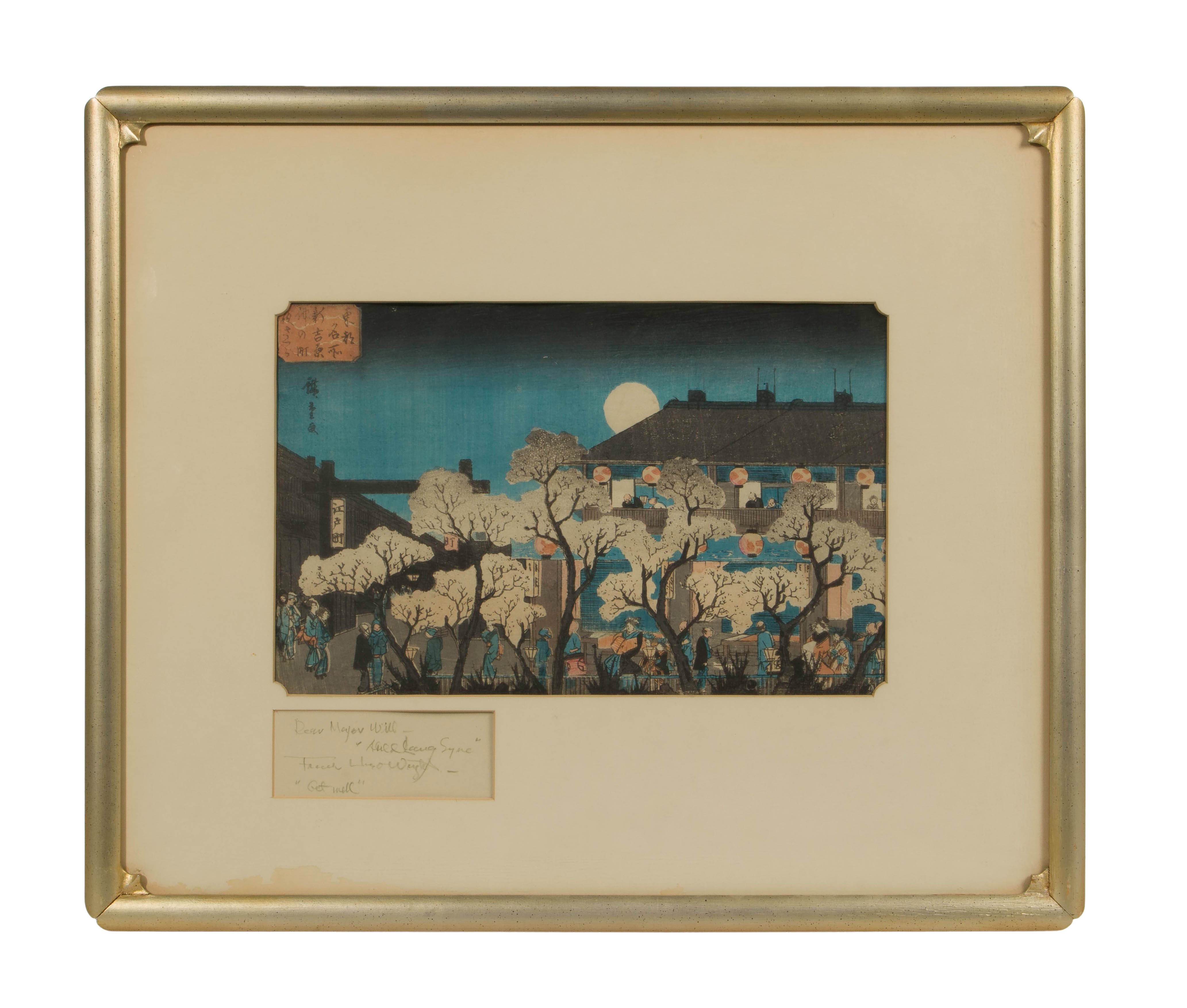 Undated, printed signature within image, ‘Cherry Blossoms at Night on Naka-no-cho in the New Yoshiwara’ from the series ‘Famous Places in the Eastern Capital’, matted (along with a ‘get well’ note) behind glass in a gold-tone wood frame having an unrelated reduced image taped to back