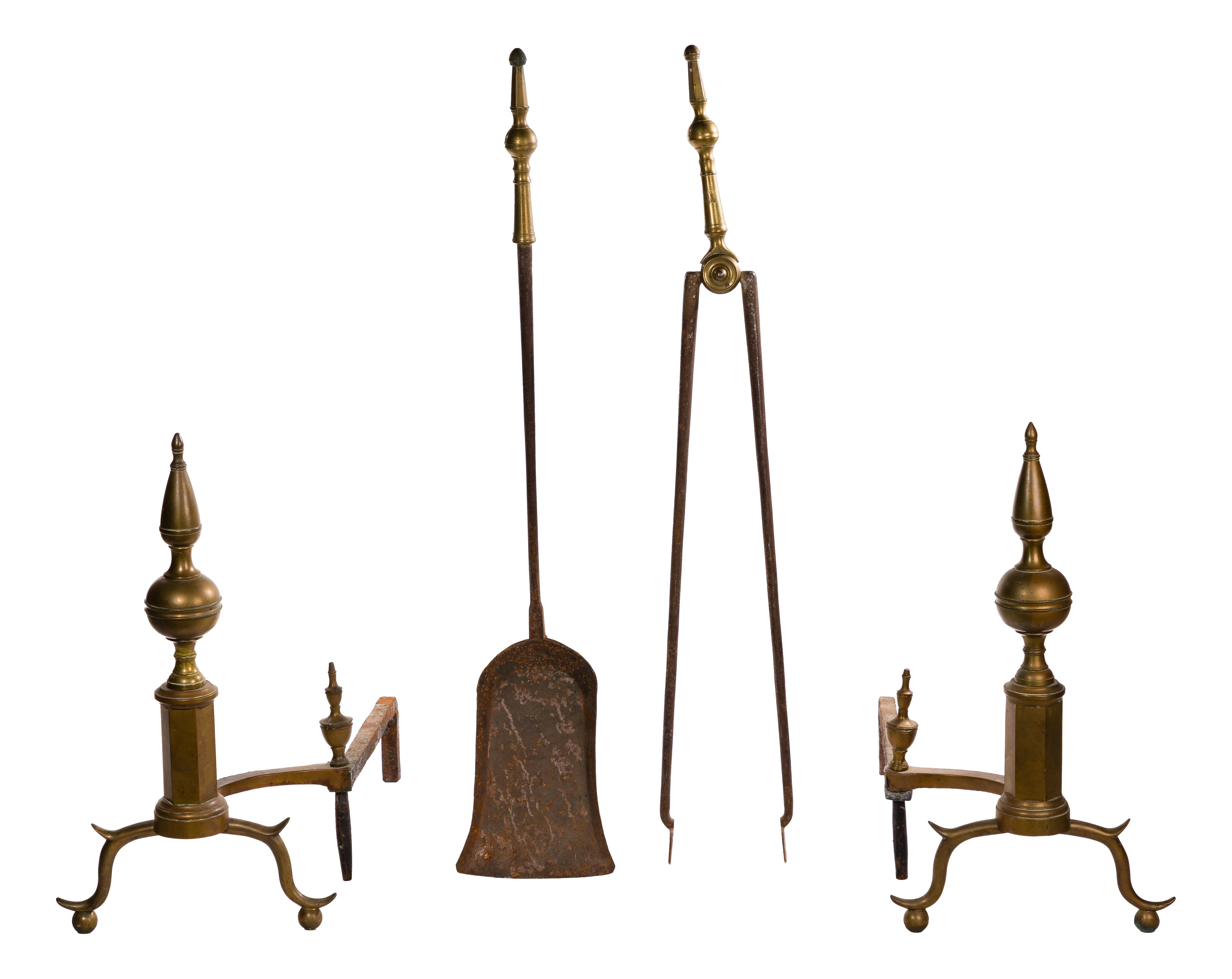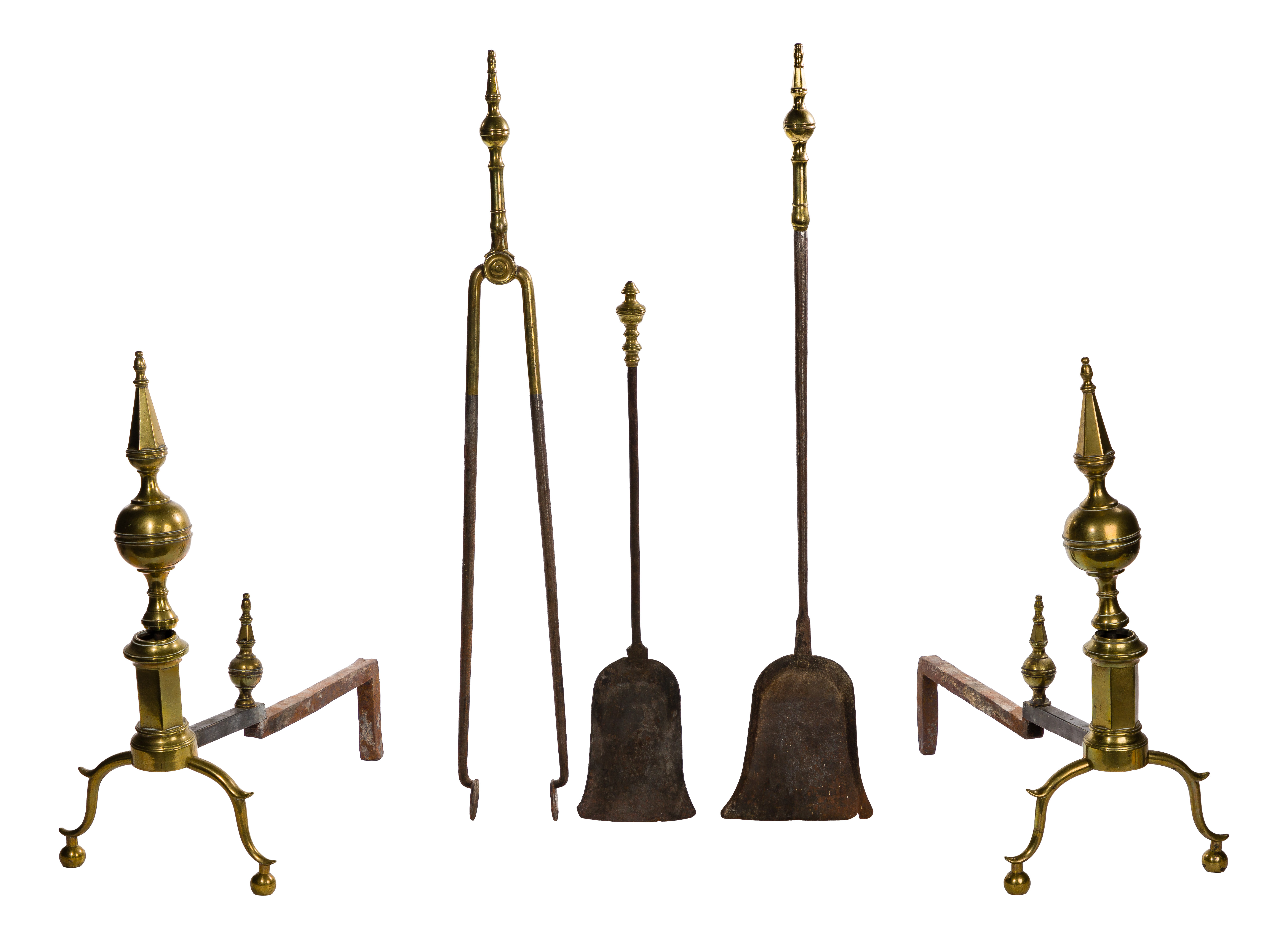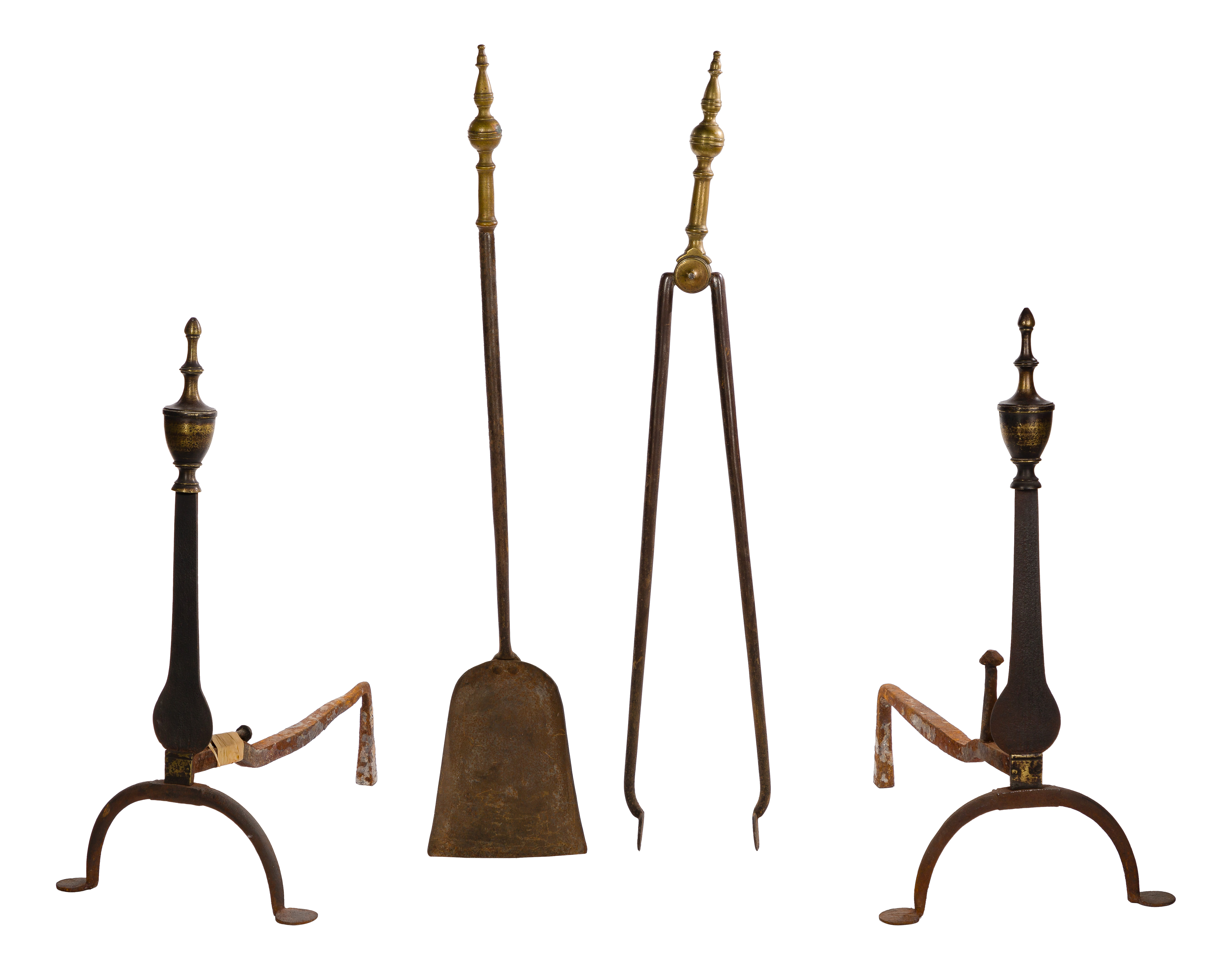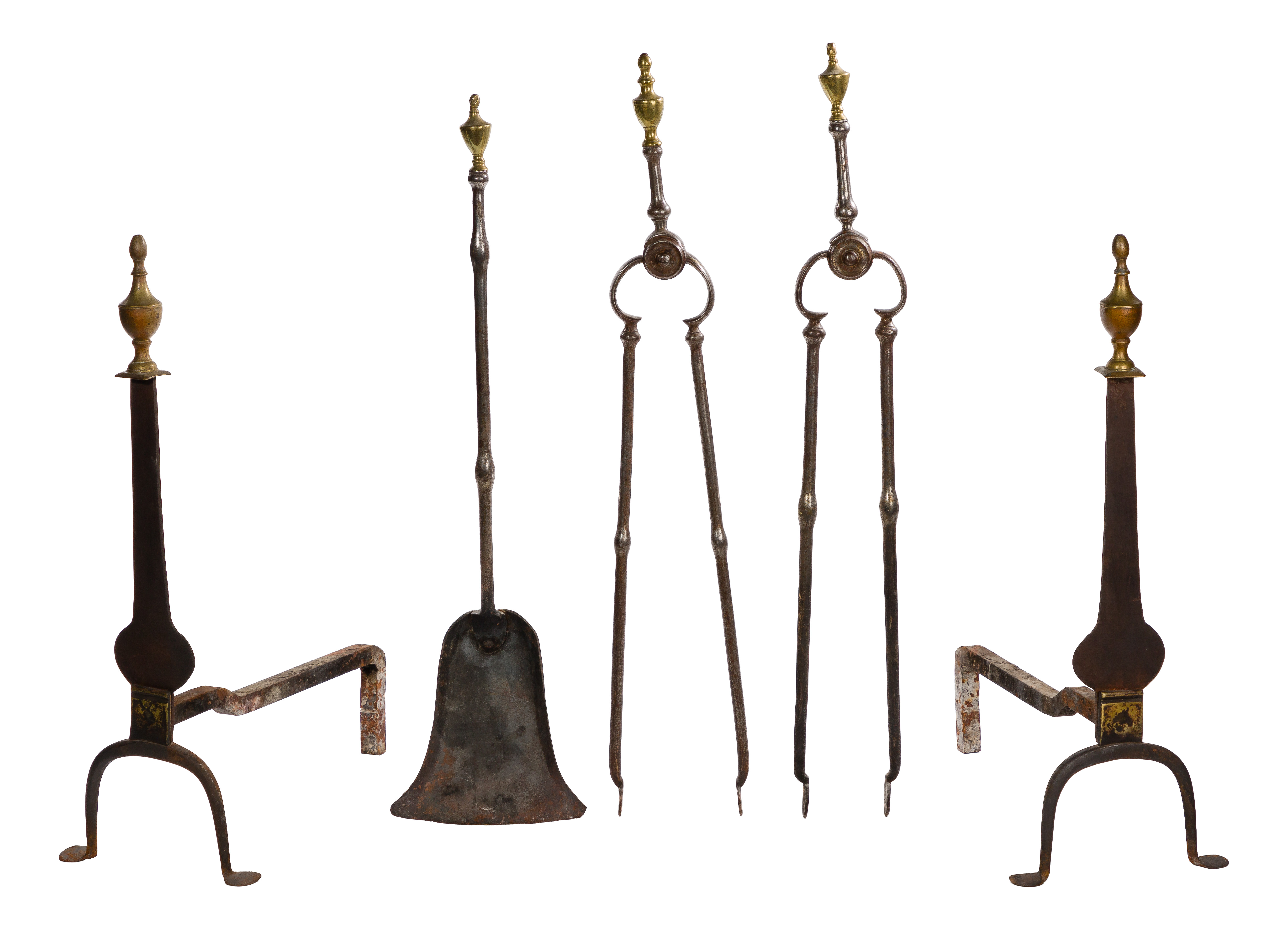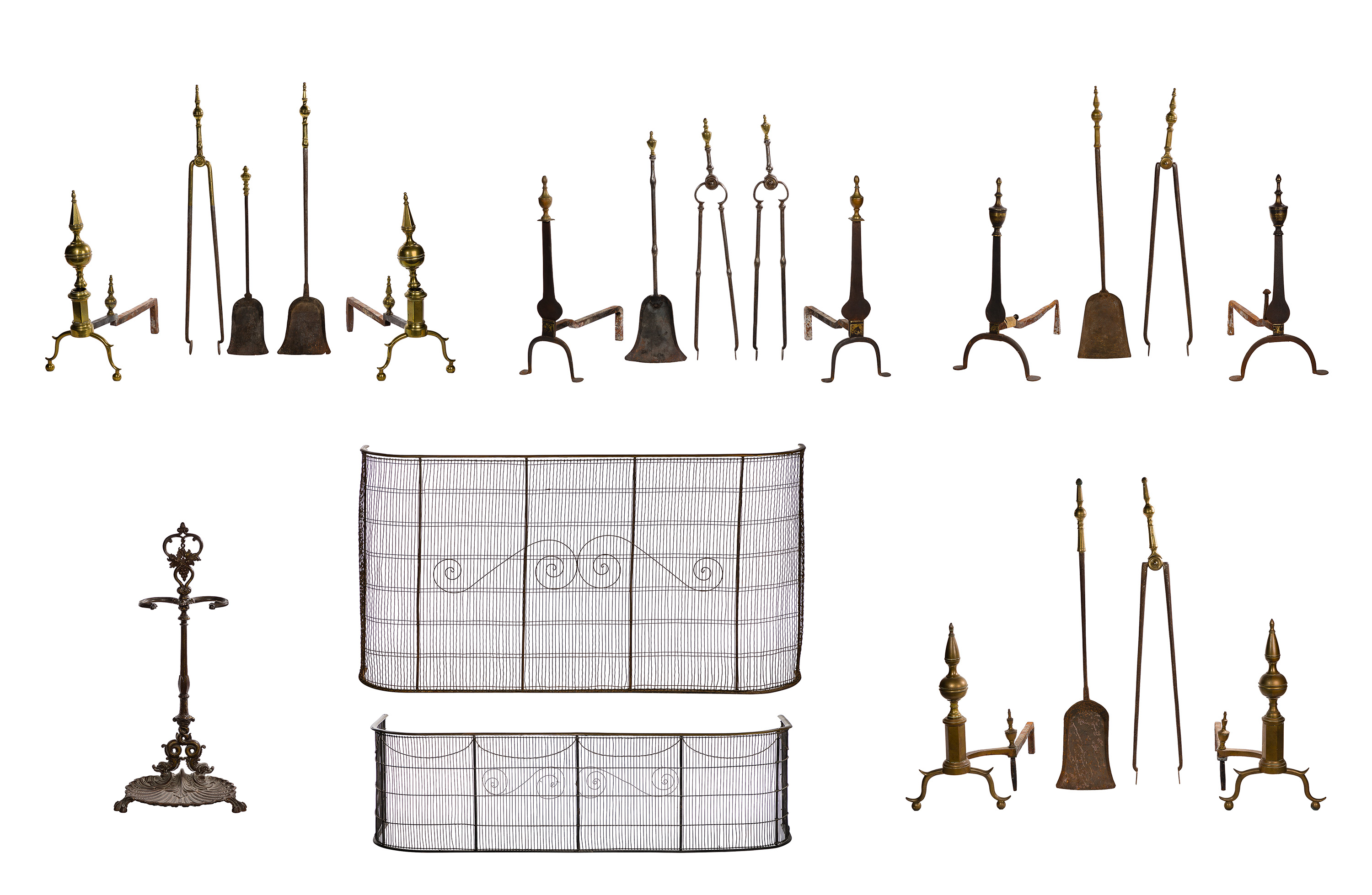 (12) items including (2) screens, (4) sets of andirons, (4) tool sets, a shovel and a M. Greenwood & Co. Patented 1851 tool holder