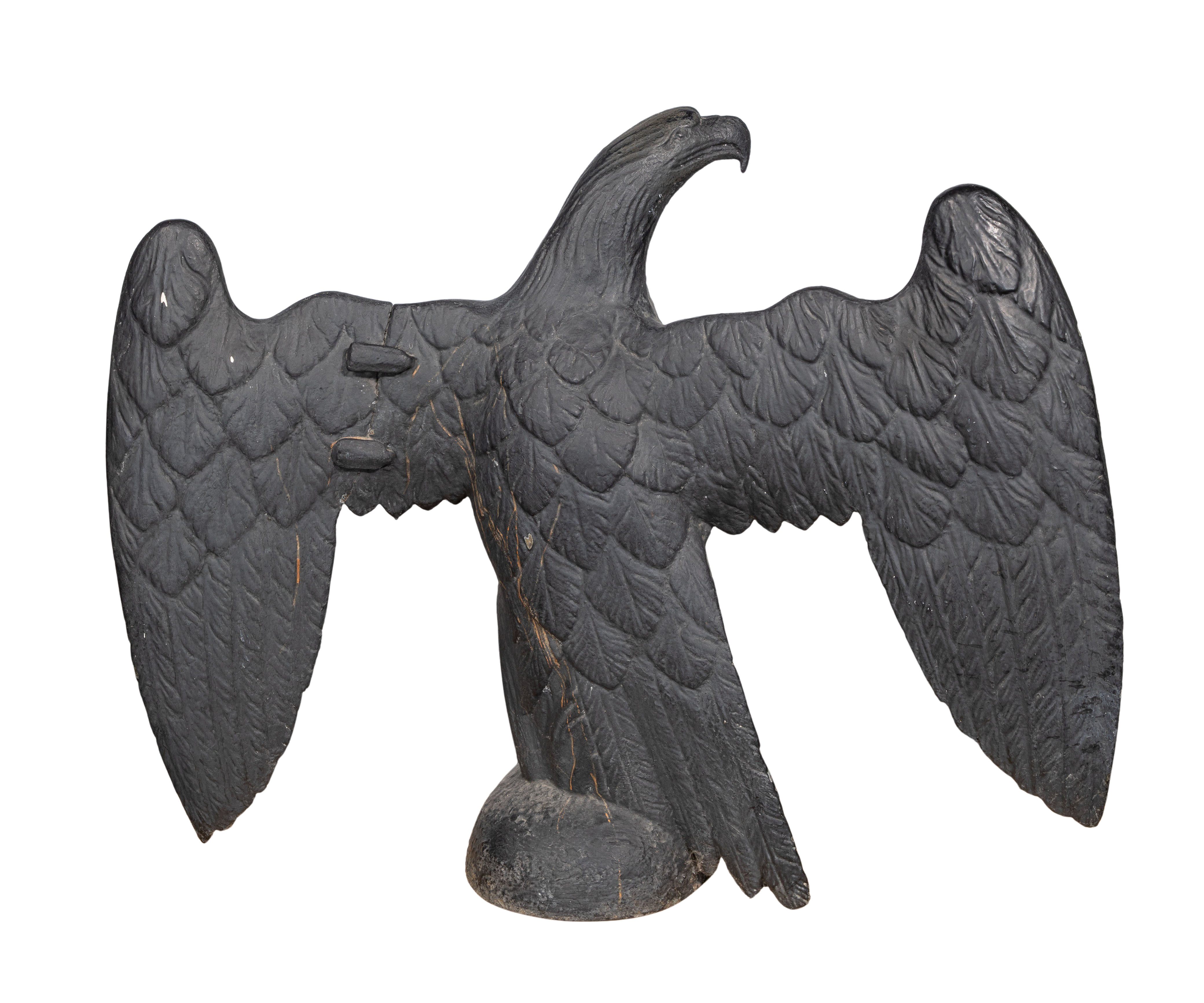 Unmarked depiction of an American eagle having wings spread, standing on a hemispherical base, painted black