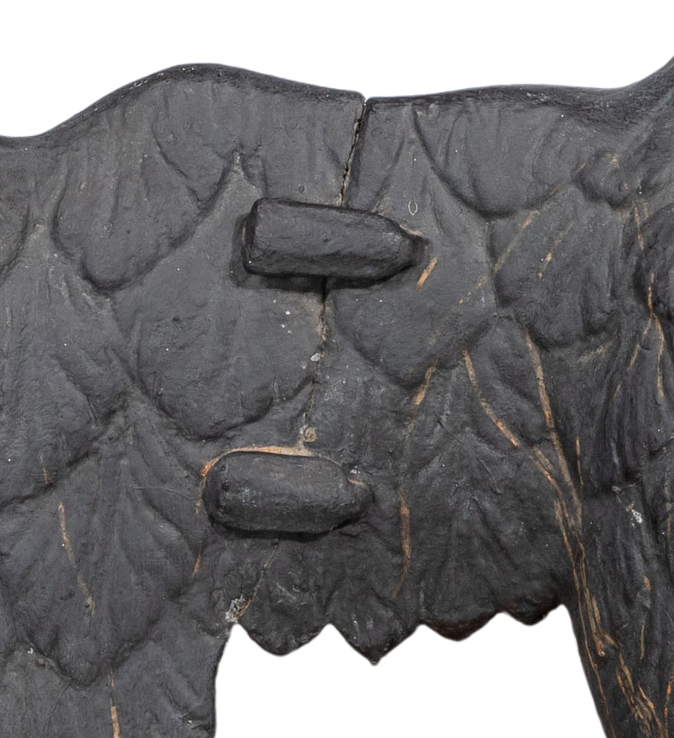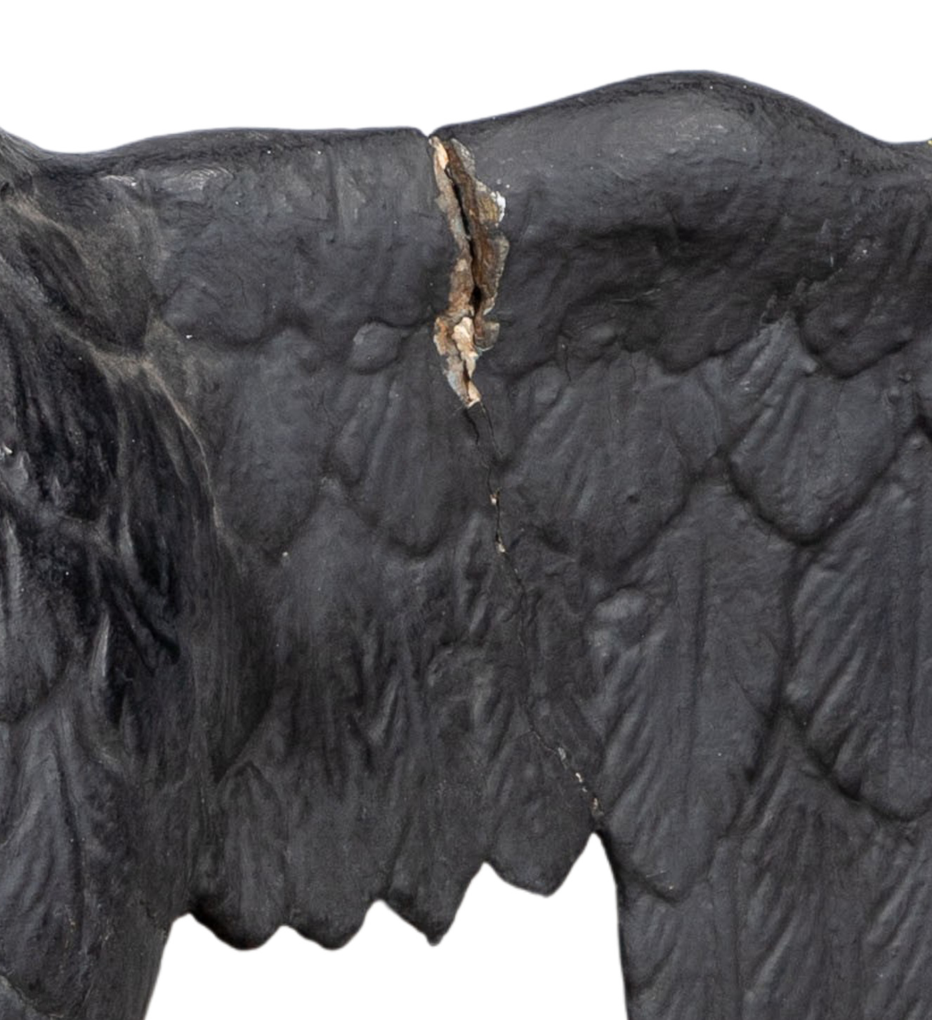 overall moderate wear to paint, wing broken at right, repaired at break using two iron staples to back