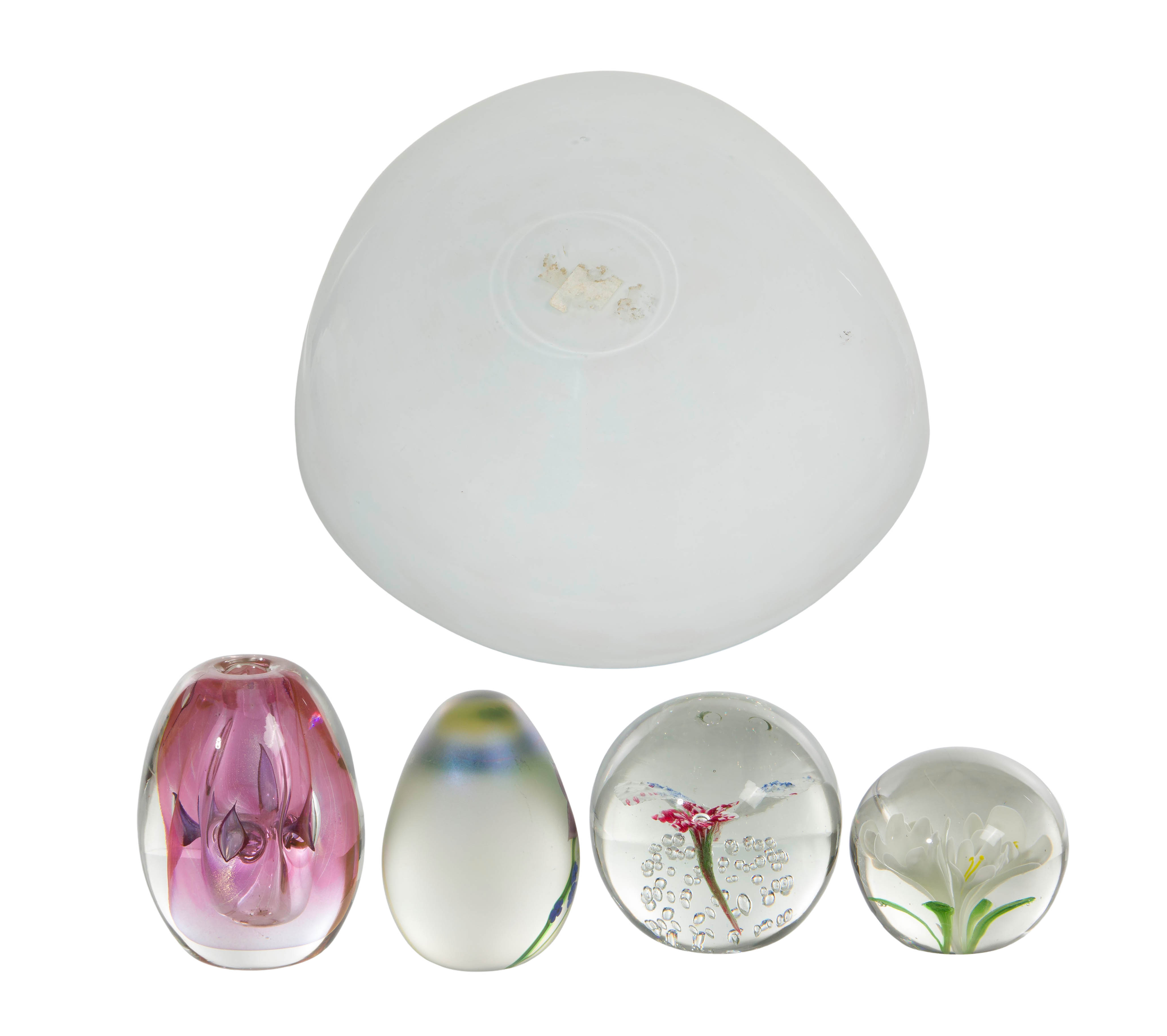 (5) total items including (3) paperweights, one signed ‘Orient and Flume’; together with an illegibly signed vase and a mid-century Murano style bowl
