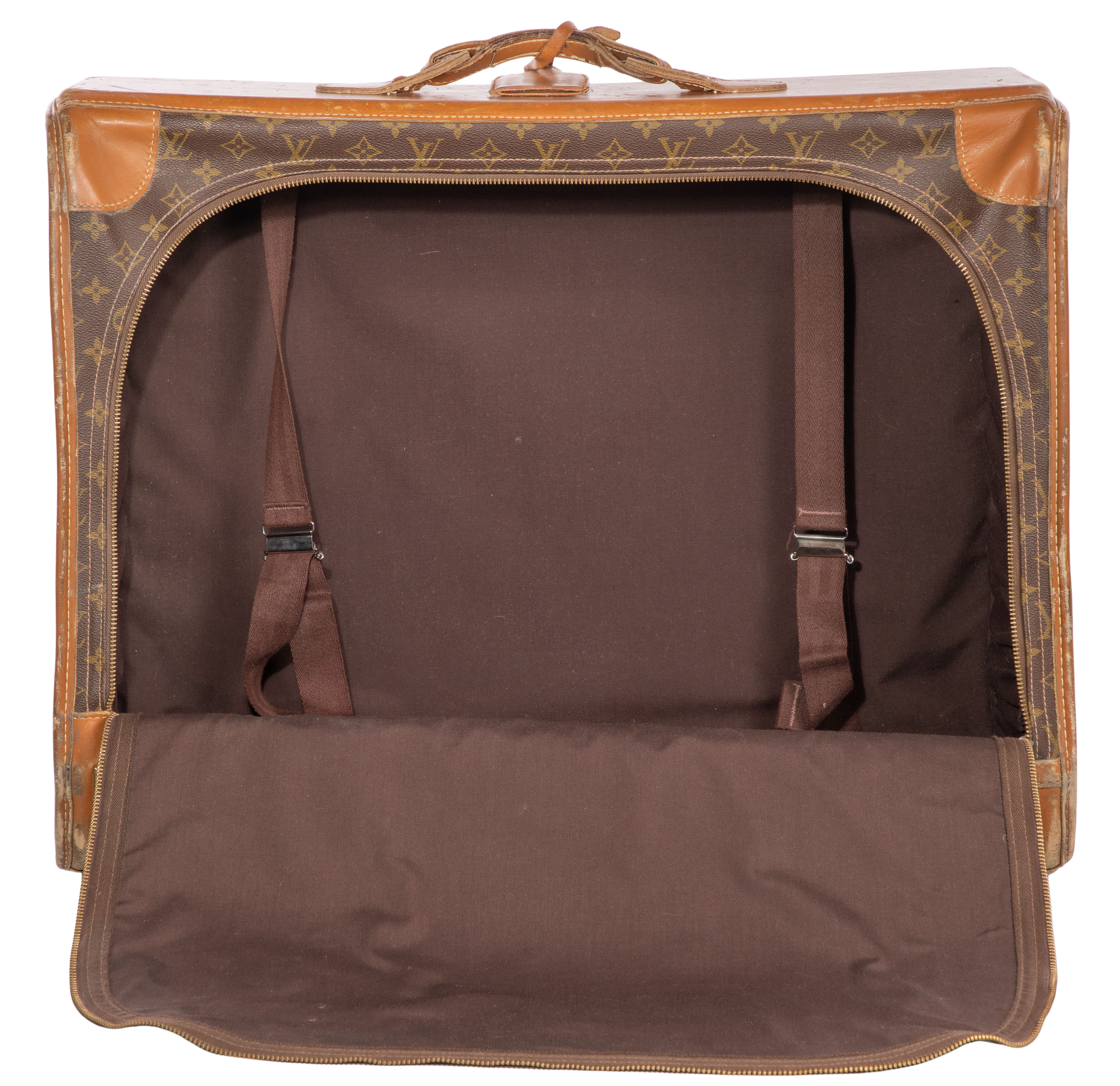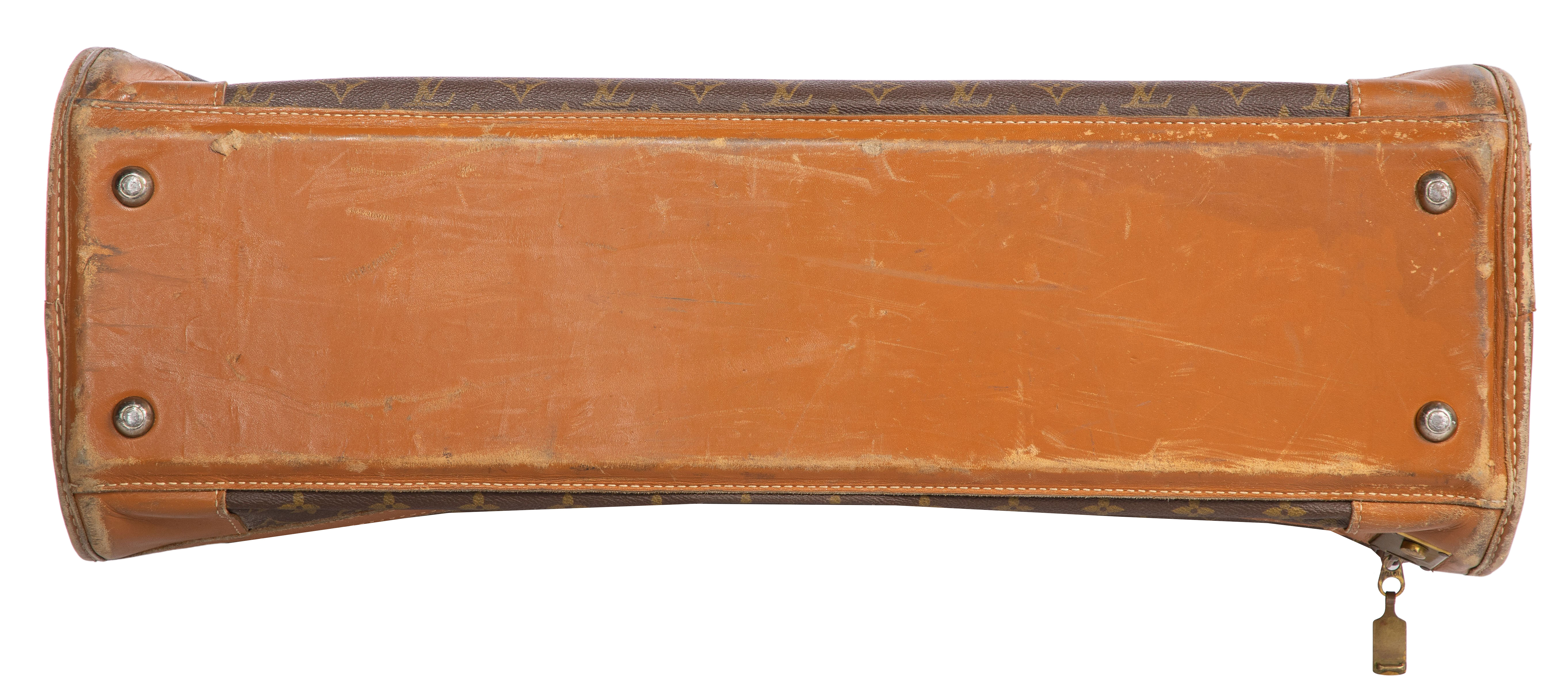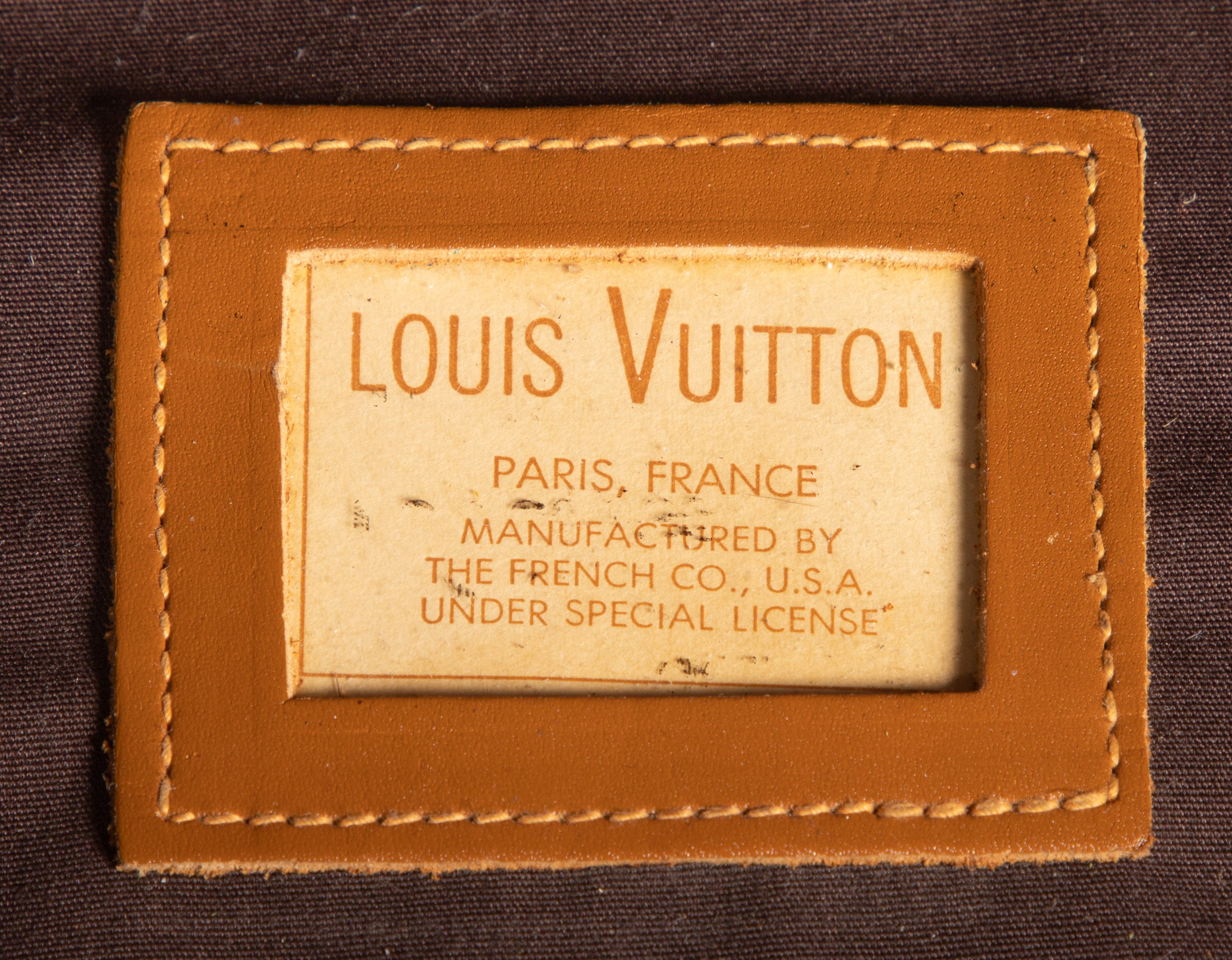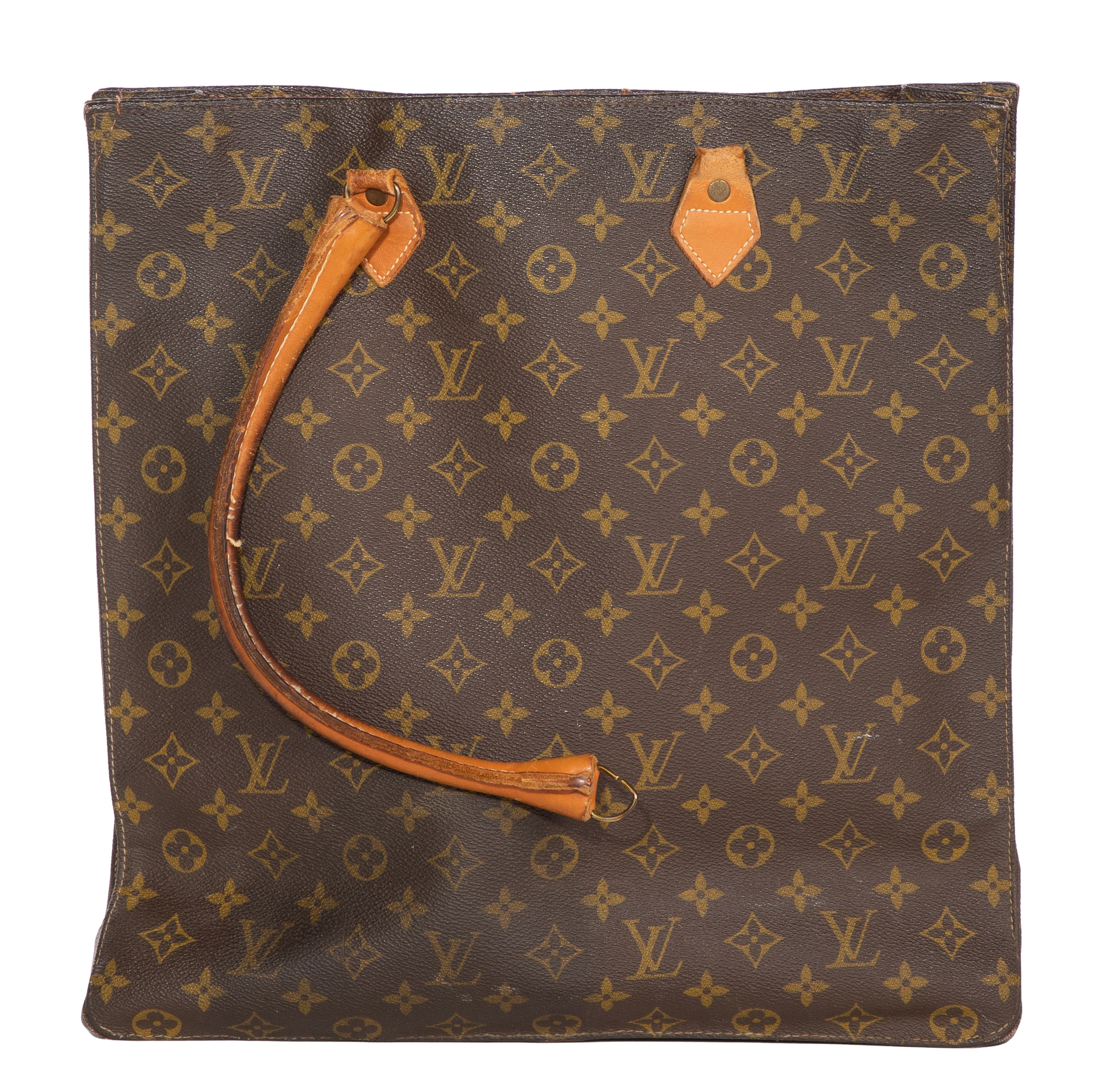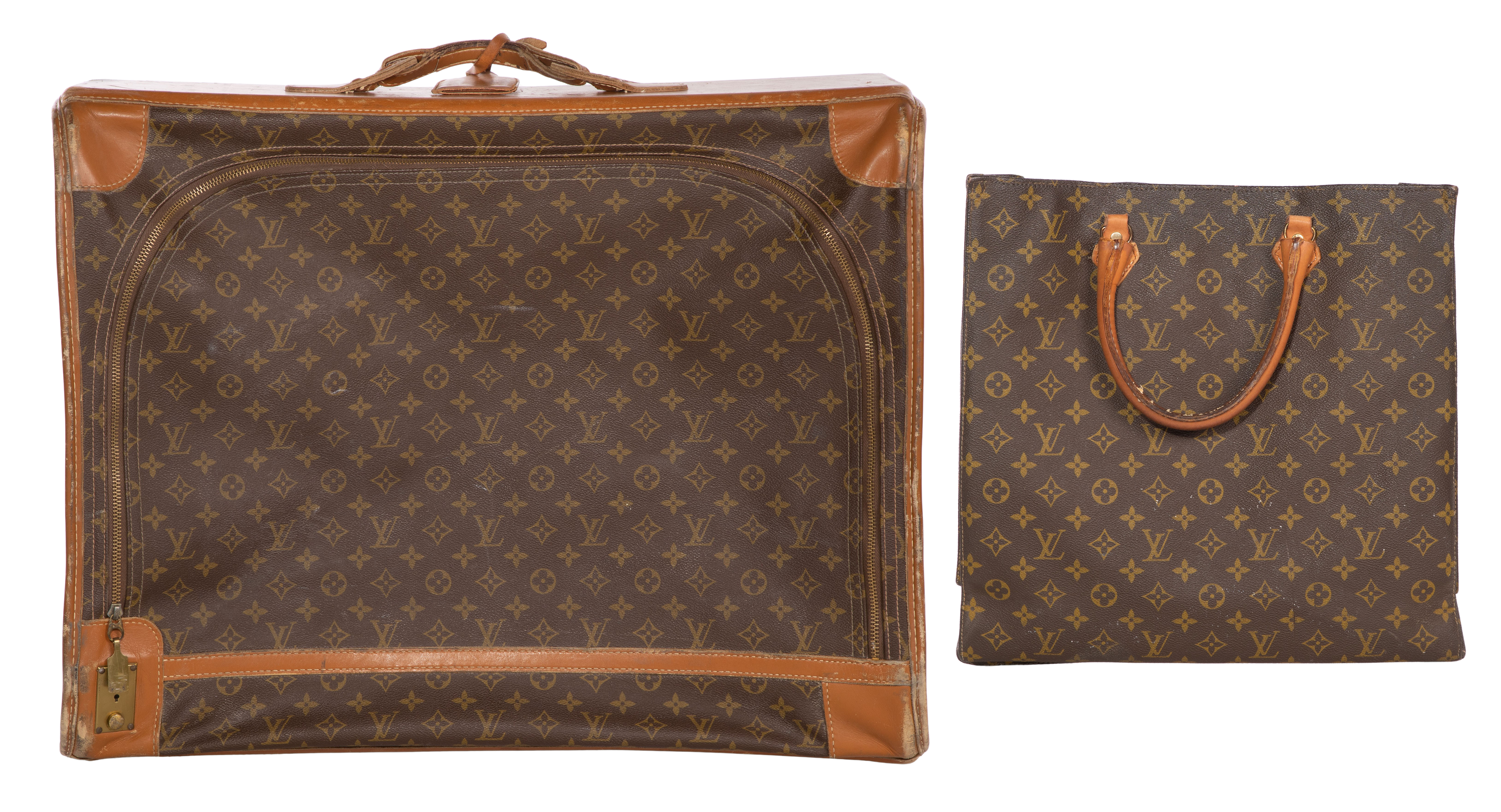 (2) items including a soft sided Pullman 60 suitcase having monogrammed canvas exterior, Vachetta leather trim, rolled handle with luggage tag, brass hardware, a brass zipper closure and an interior having elastic side pockets and straps, as well as a Sak Plat tote bag having a monogrammed canvas exterior, Vachetta leather trim and rolled handles, a textile lining and a zipped pocket, both having original tags inside ‘Made in America under special license’