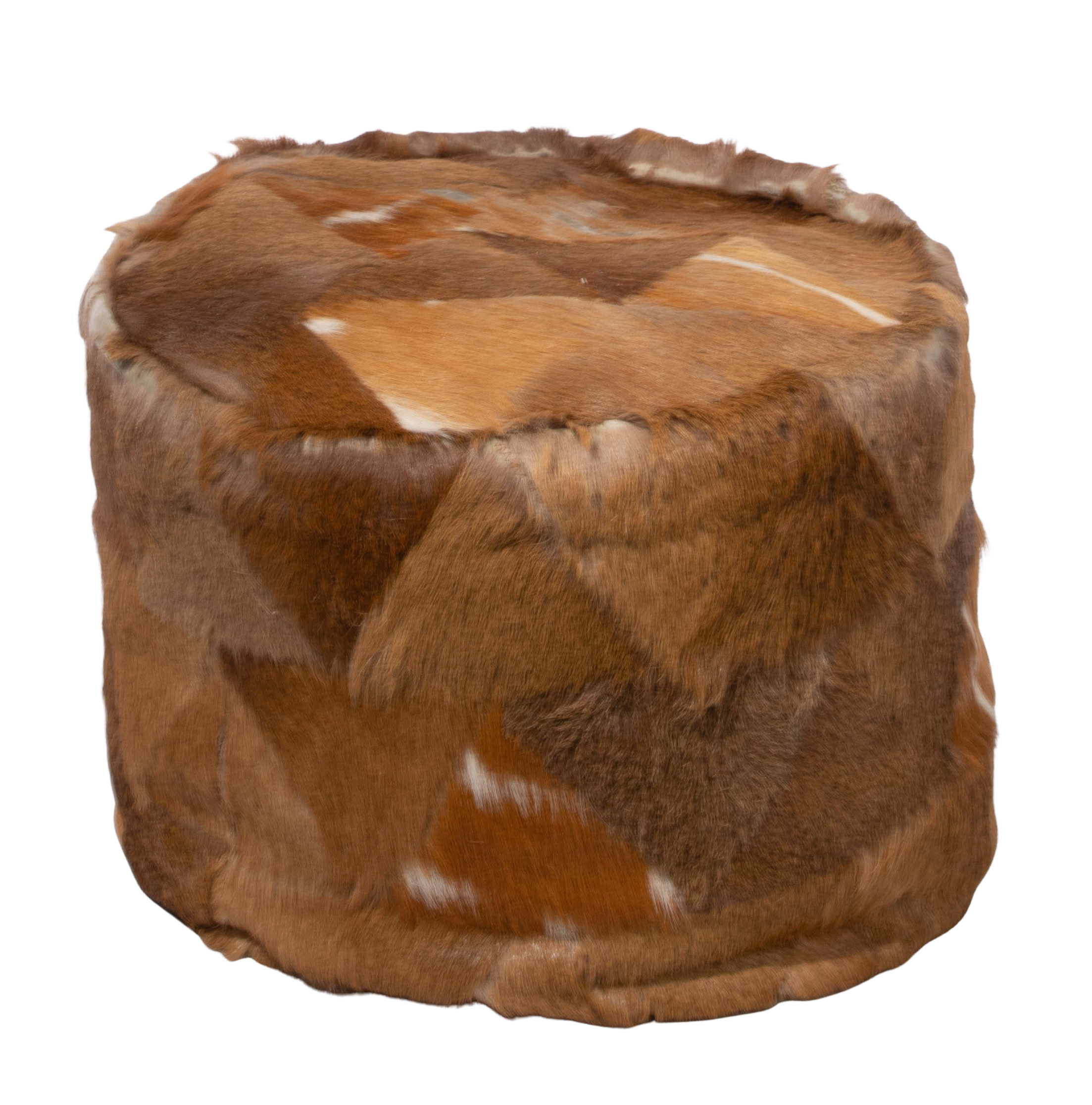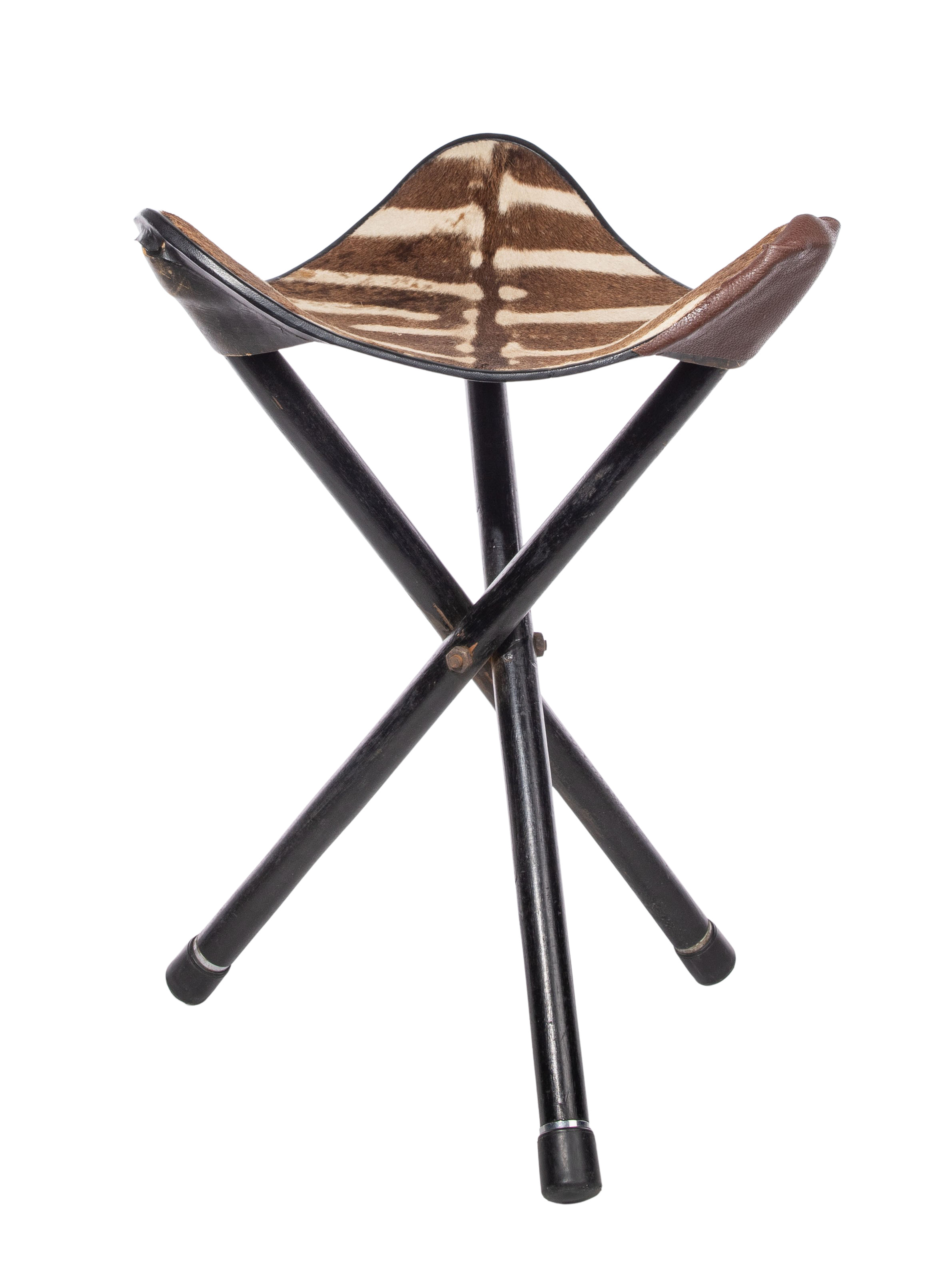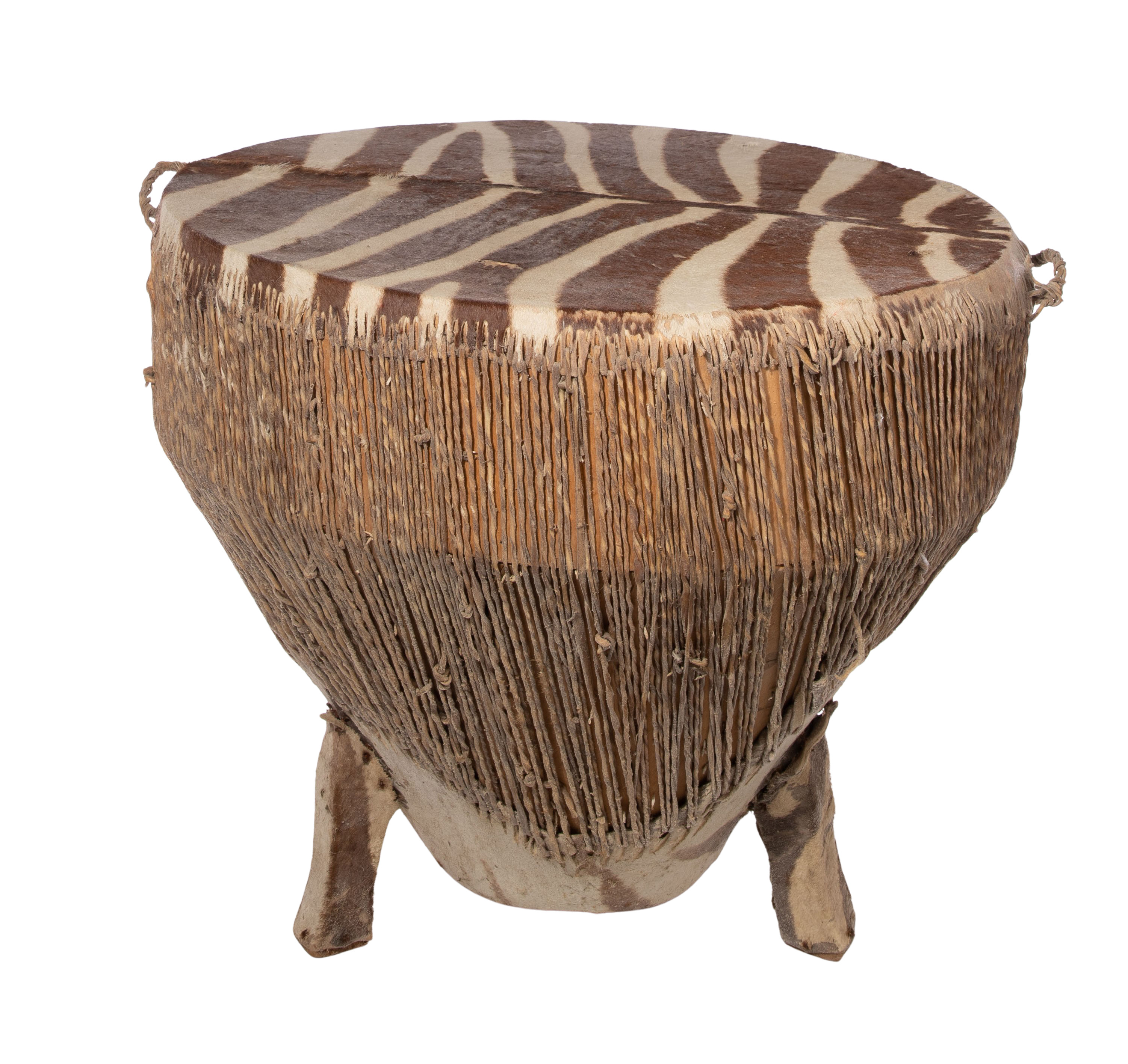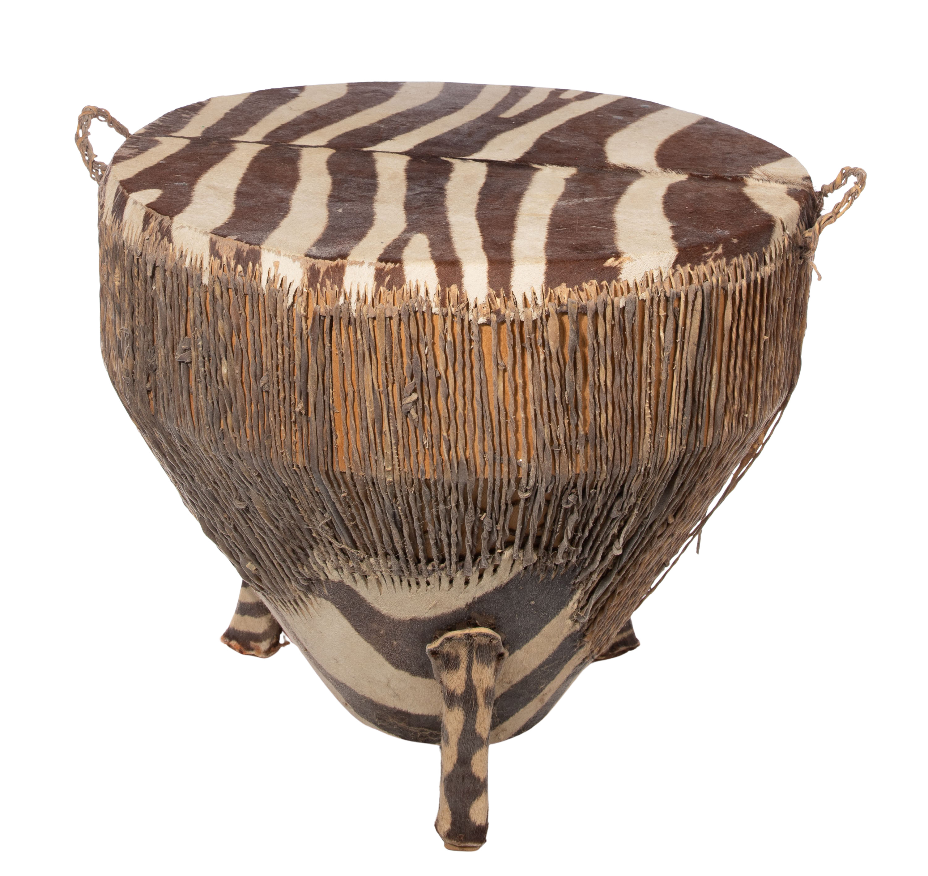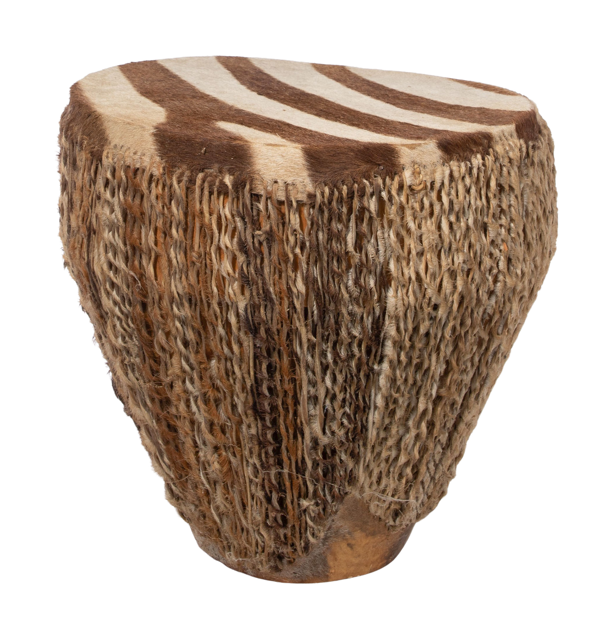 (5) total items including (3) zebra hide drums stretched over wood frames having twisted sinew around the sides, two of them standing on three zebra hide legs as well as a tripod collapsible stool with a zebra hide cover; together with a pieced fur ottoman