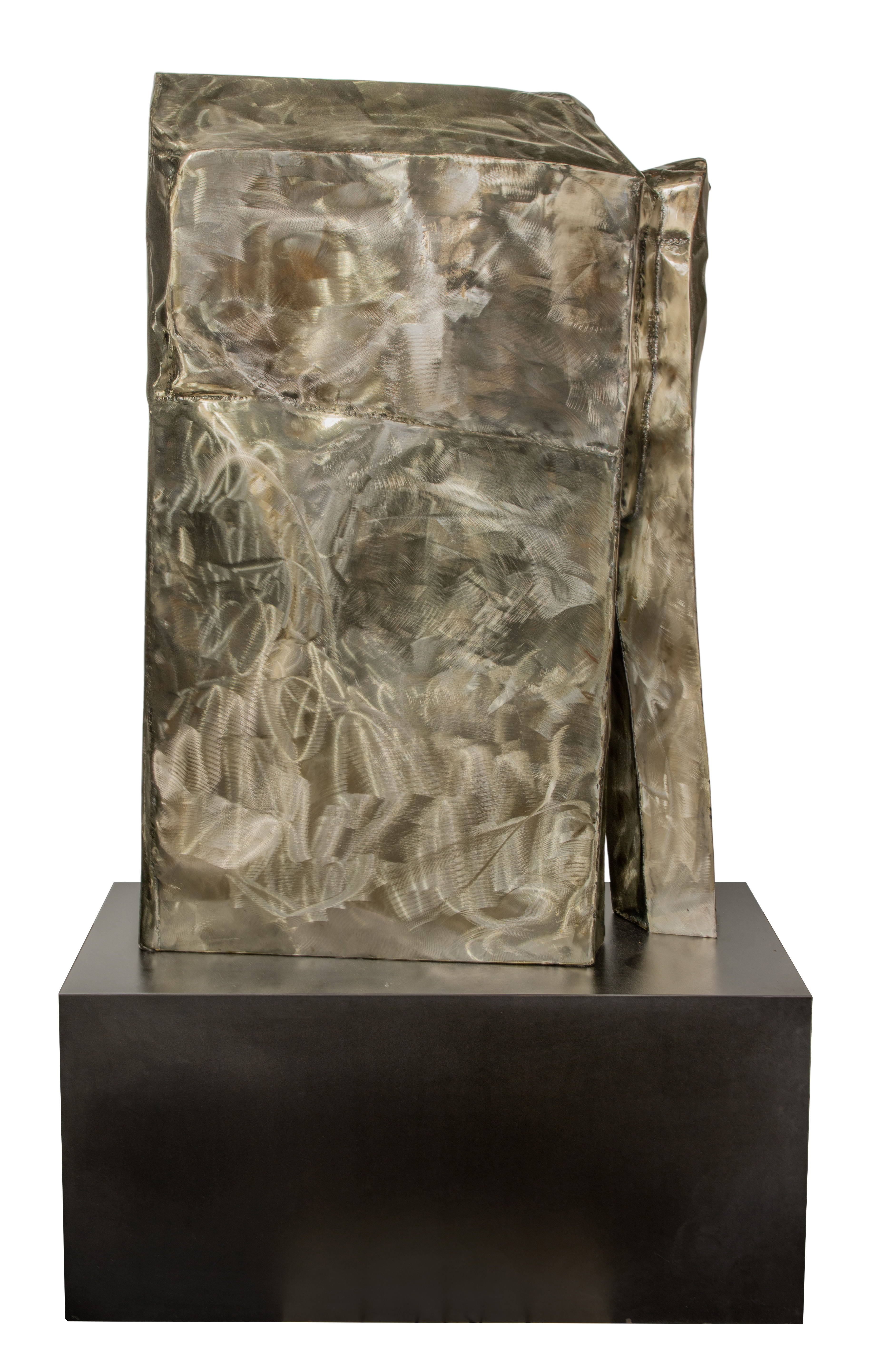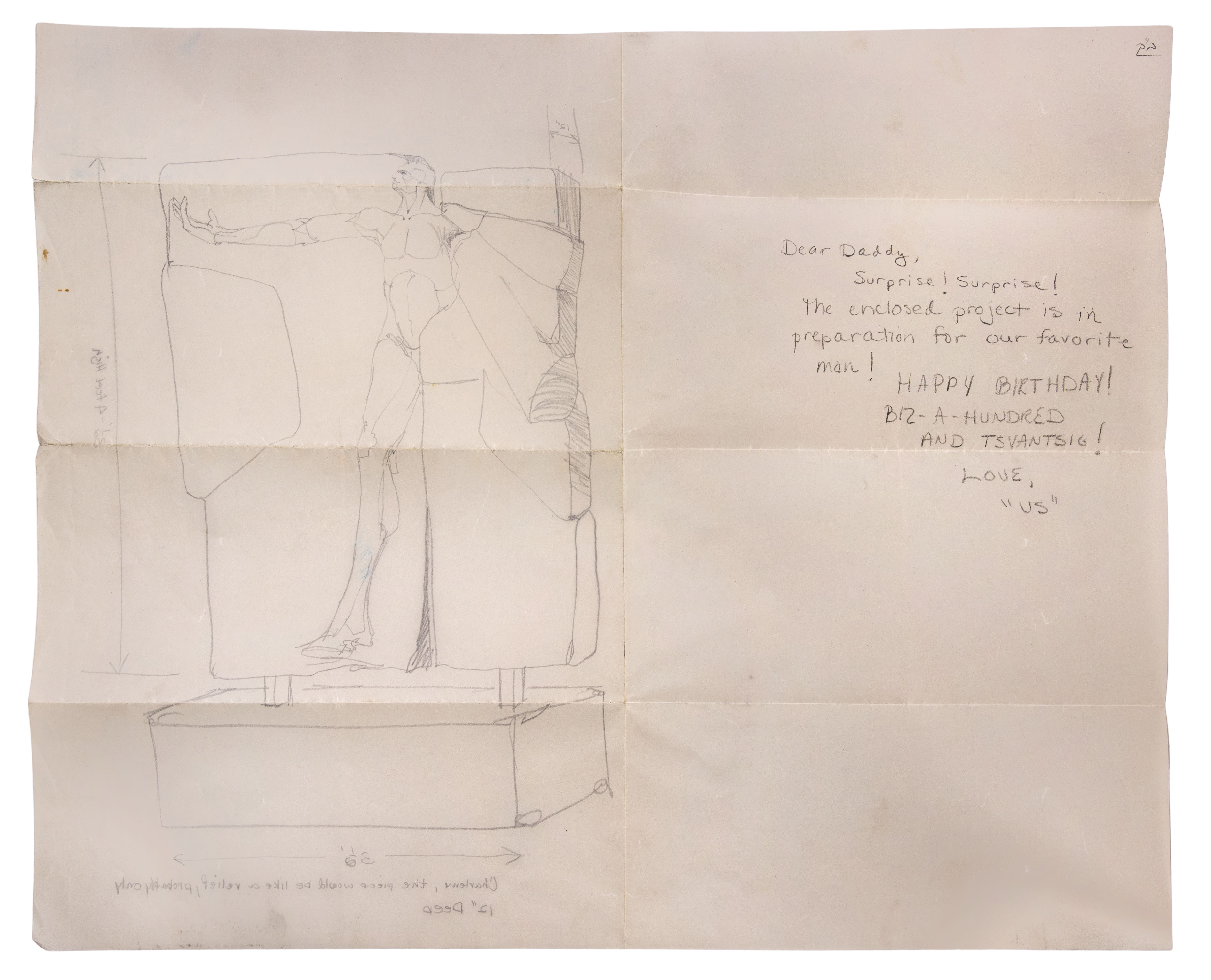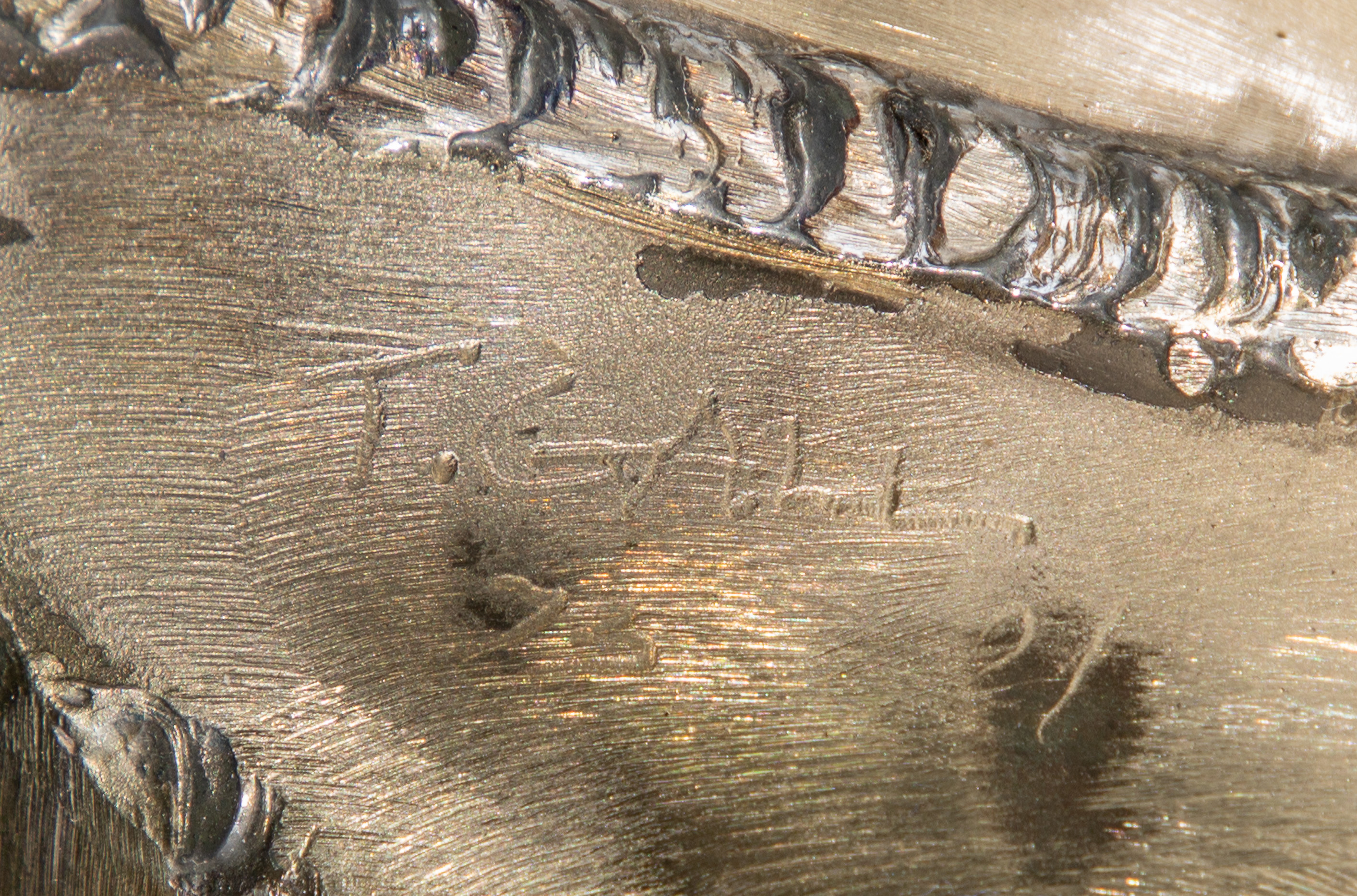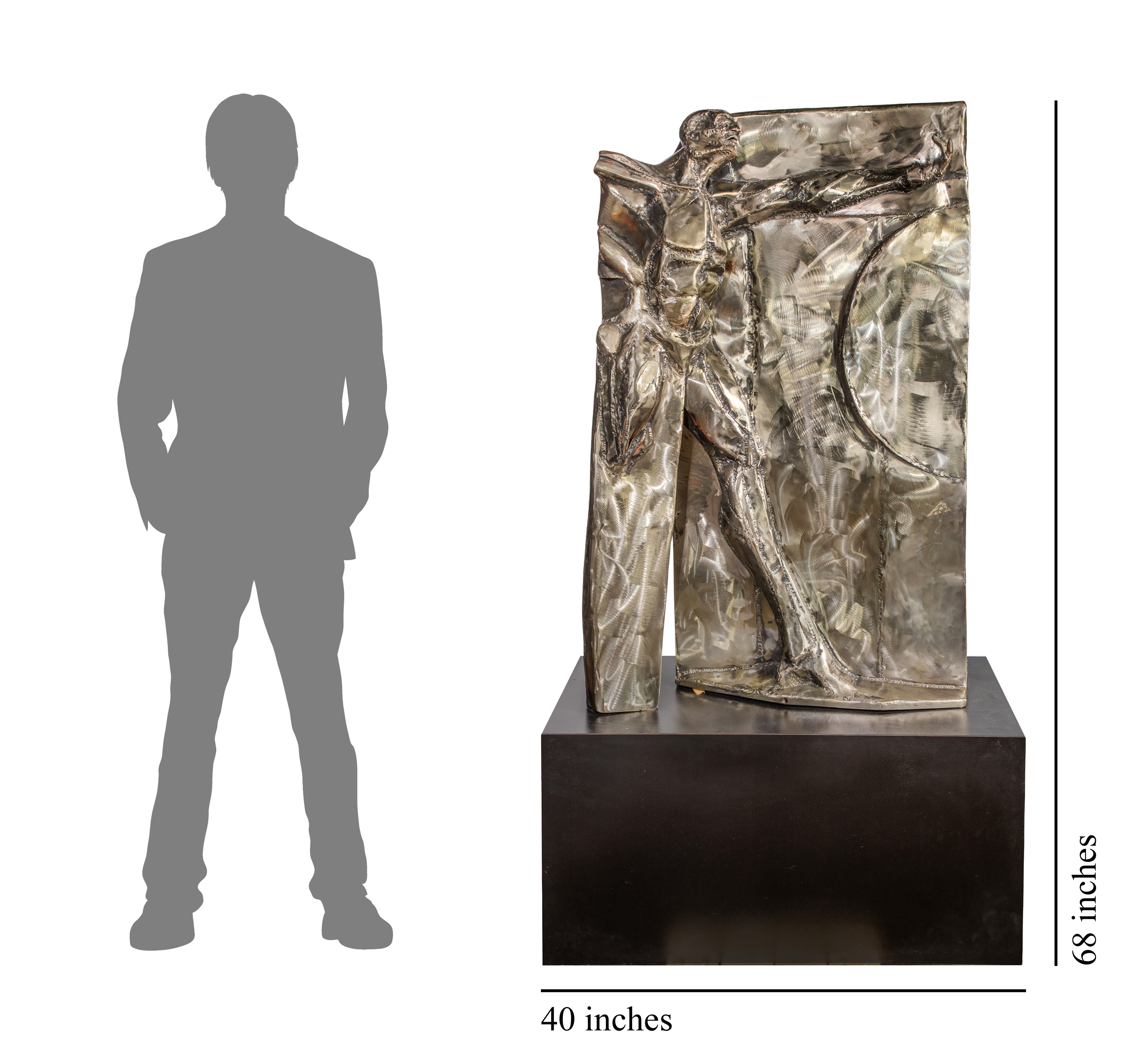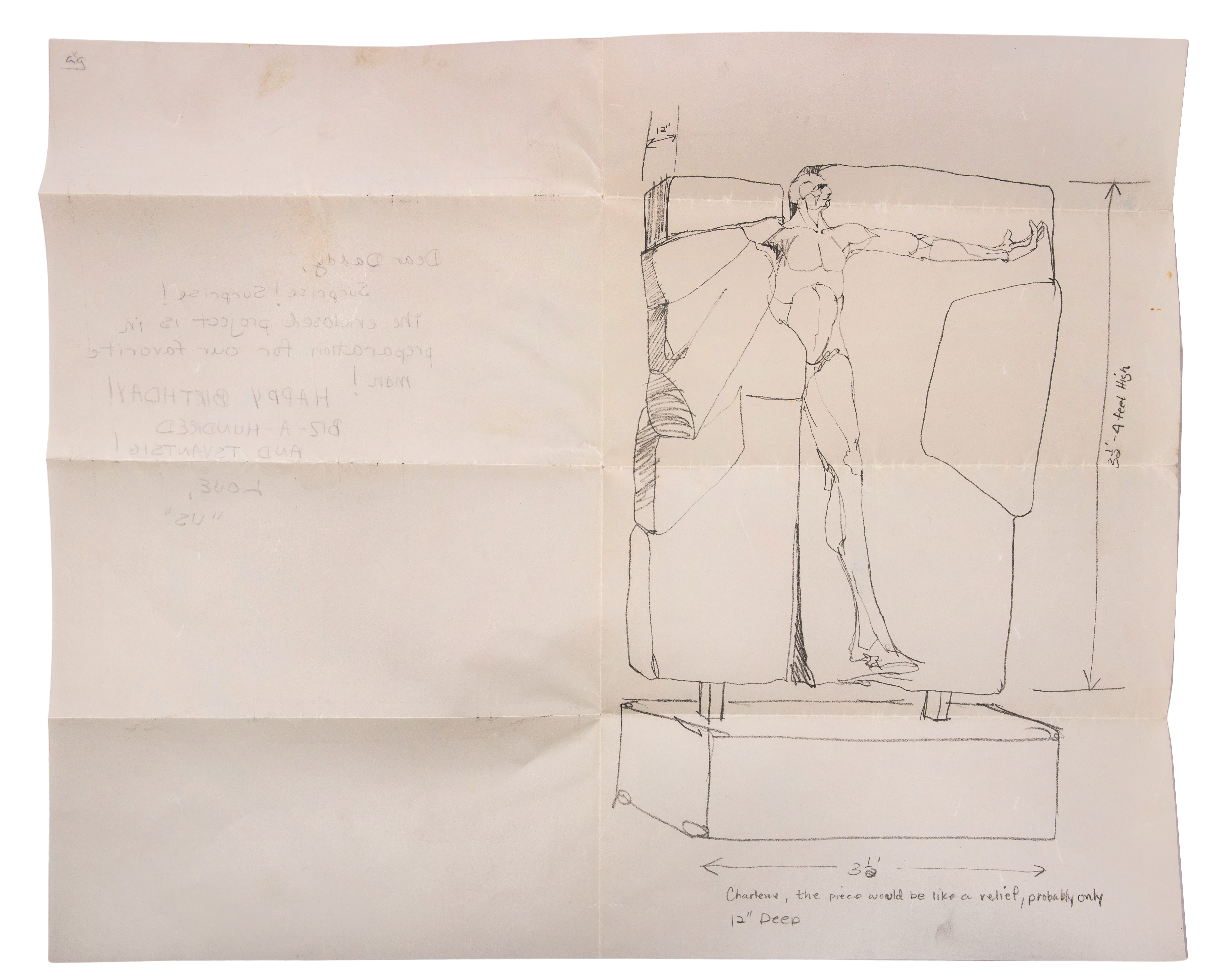 1973, etch signed on base, a brushed steel depicting a muscular figure in relief on a black wood stand, including original draft of item and note