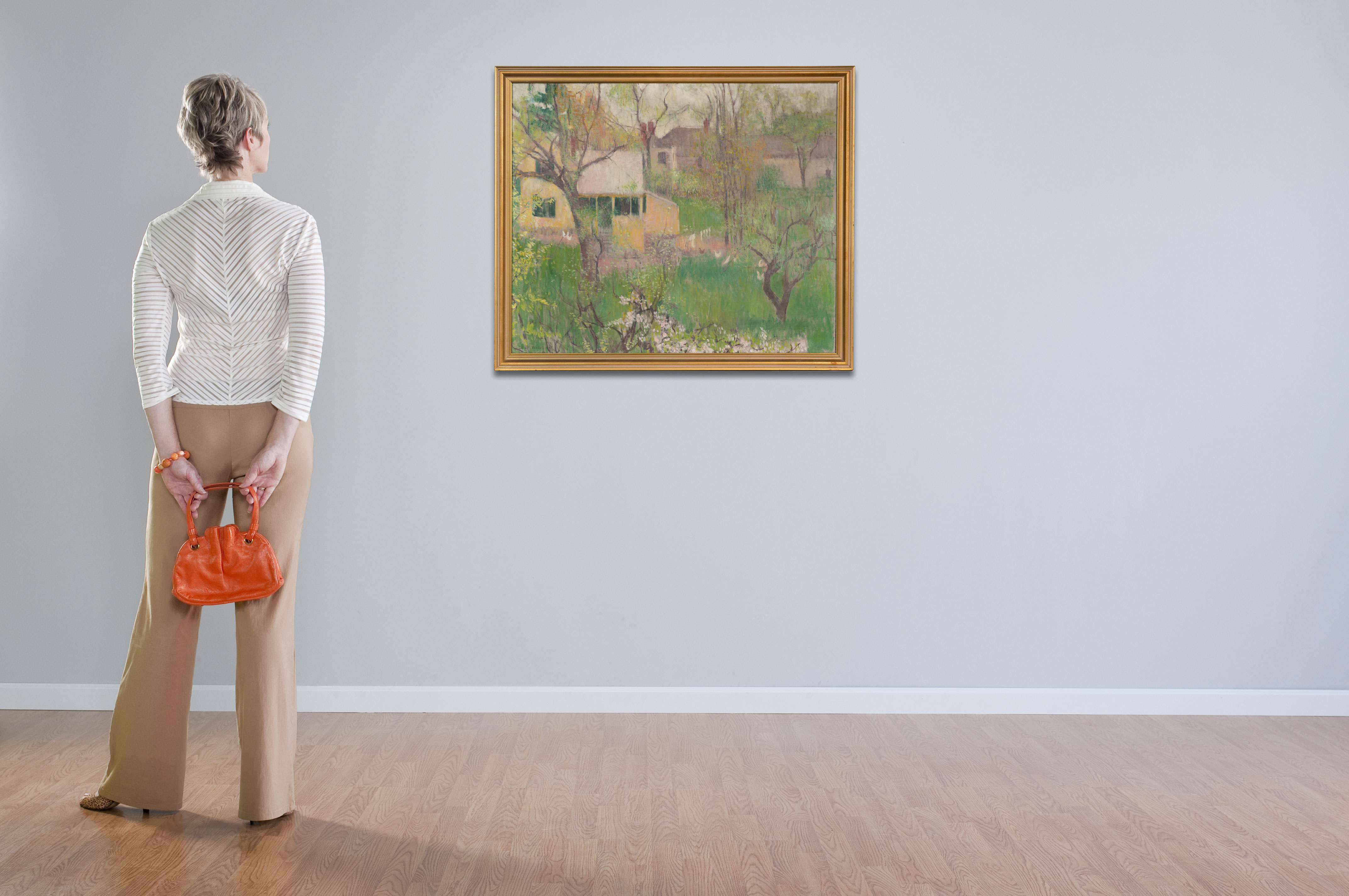 Undated, signed lower left, a scenic landscape showcasing a sense of tranquility in the back yards of a neighborhood, in a painted gold frame