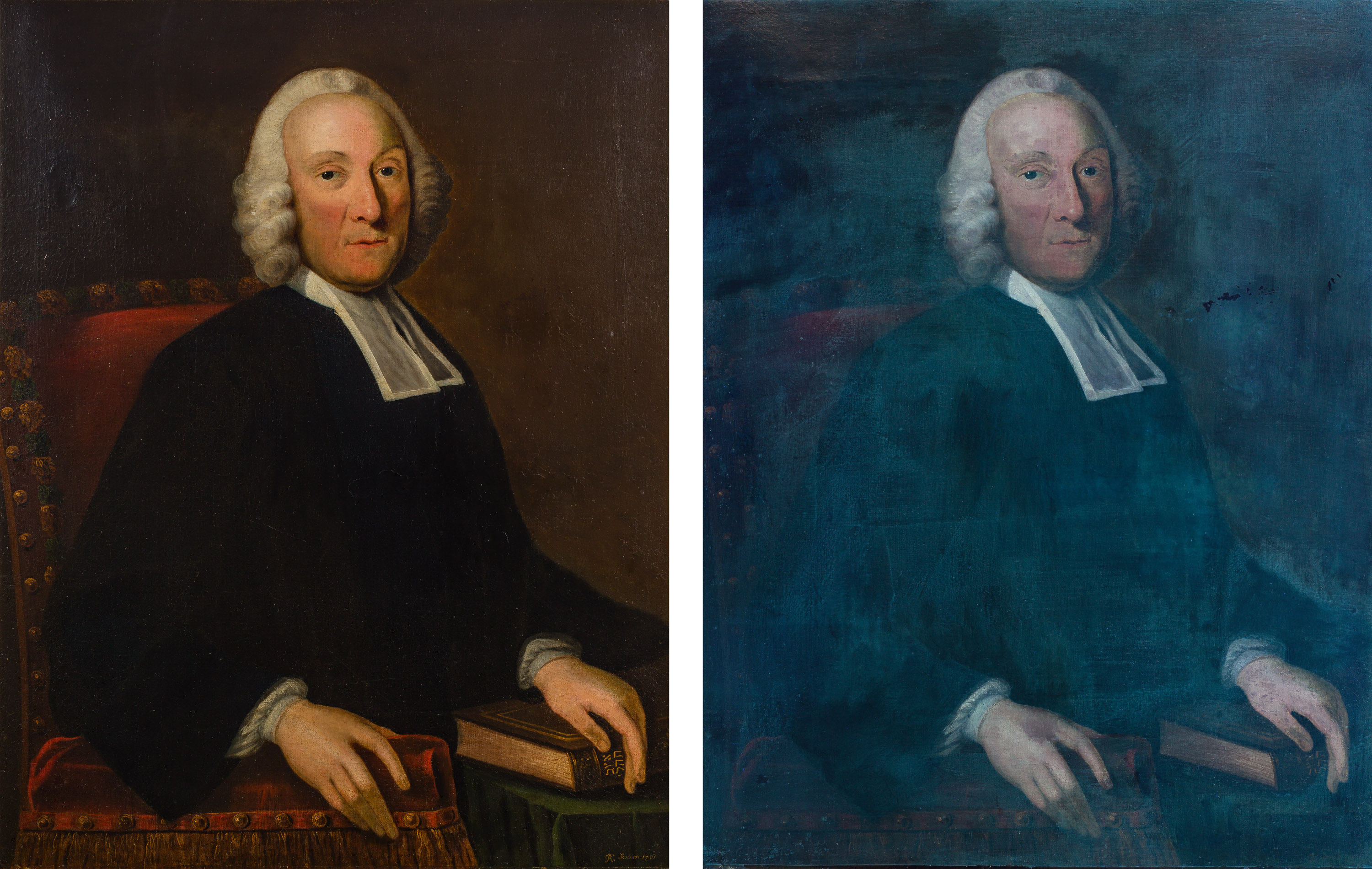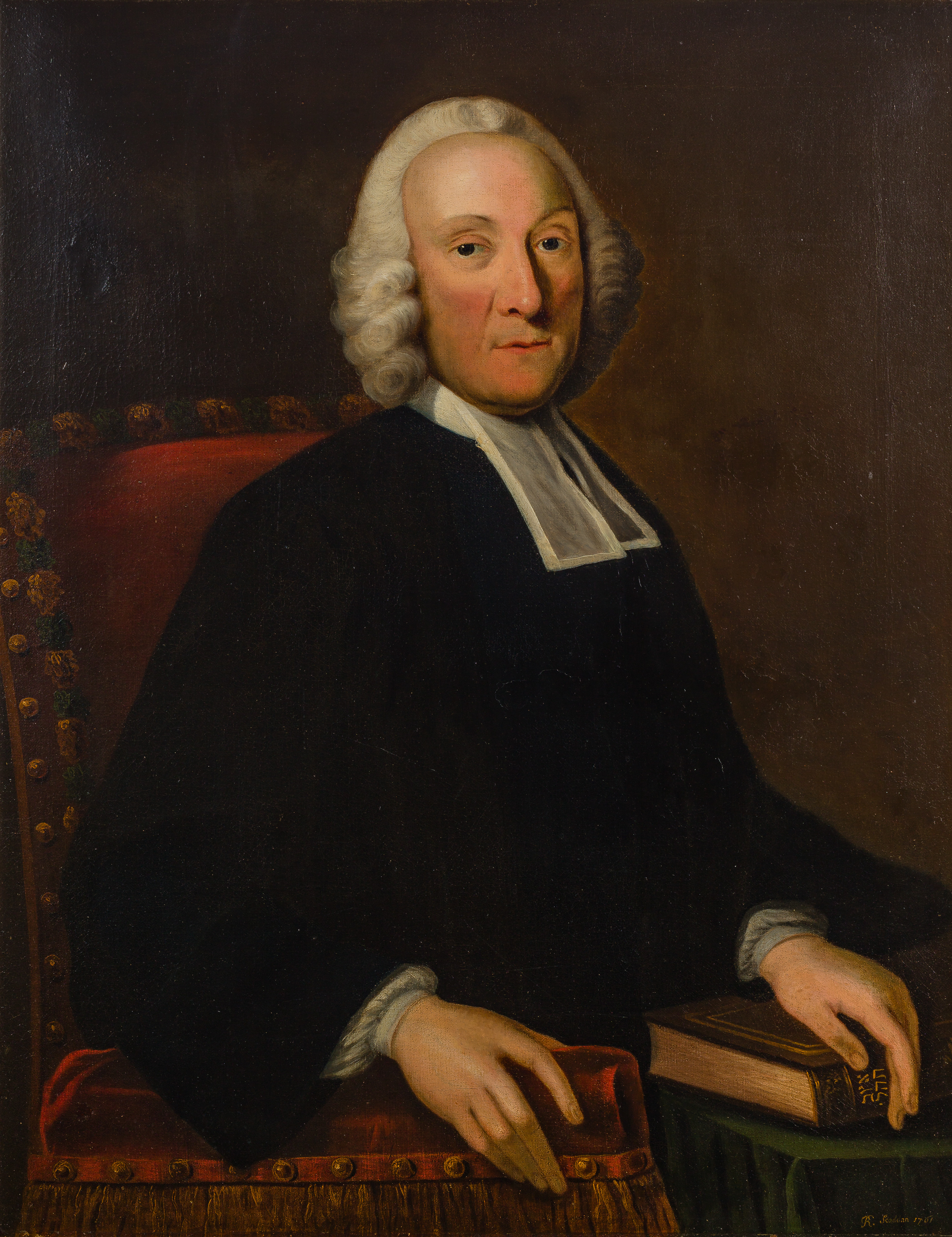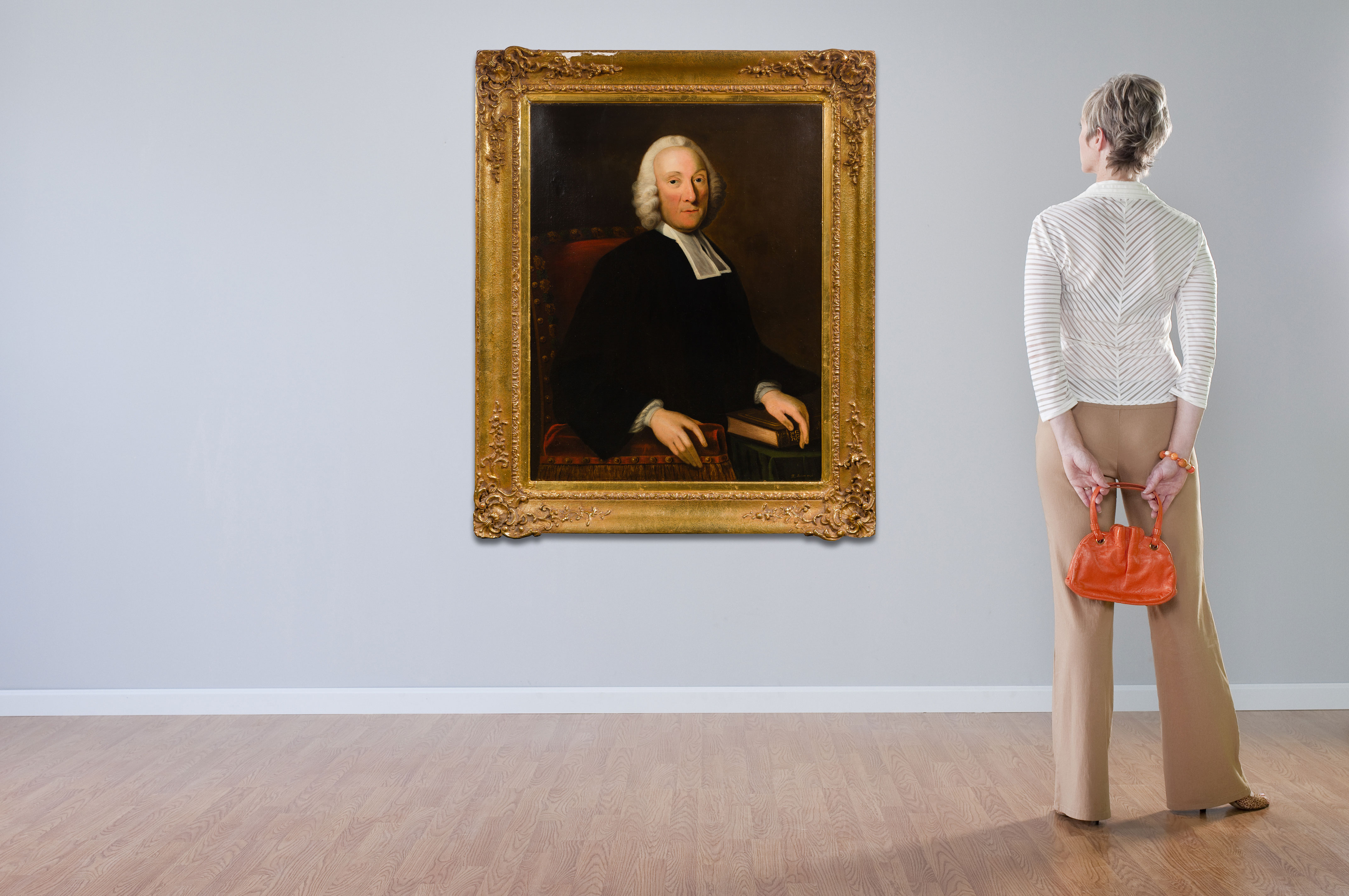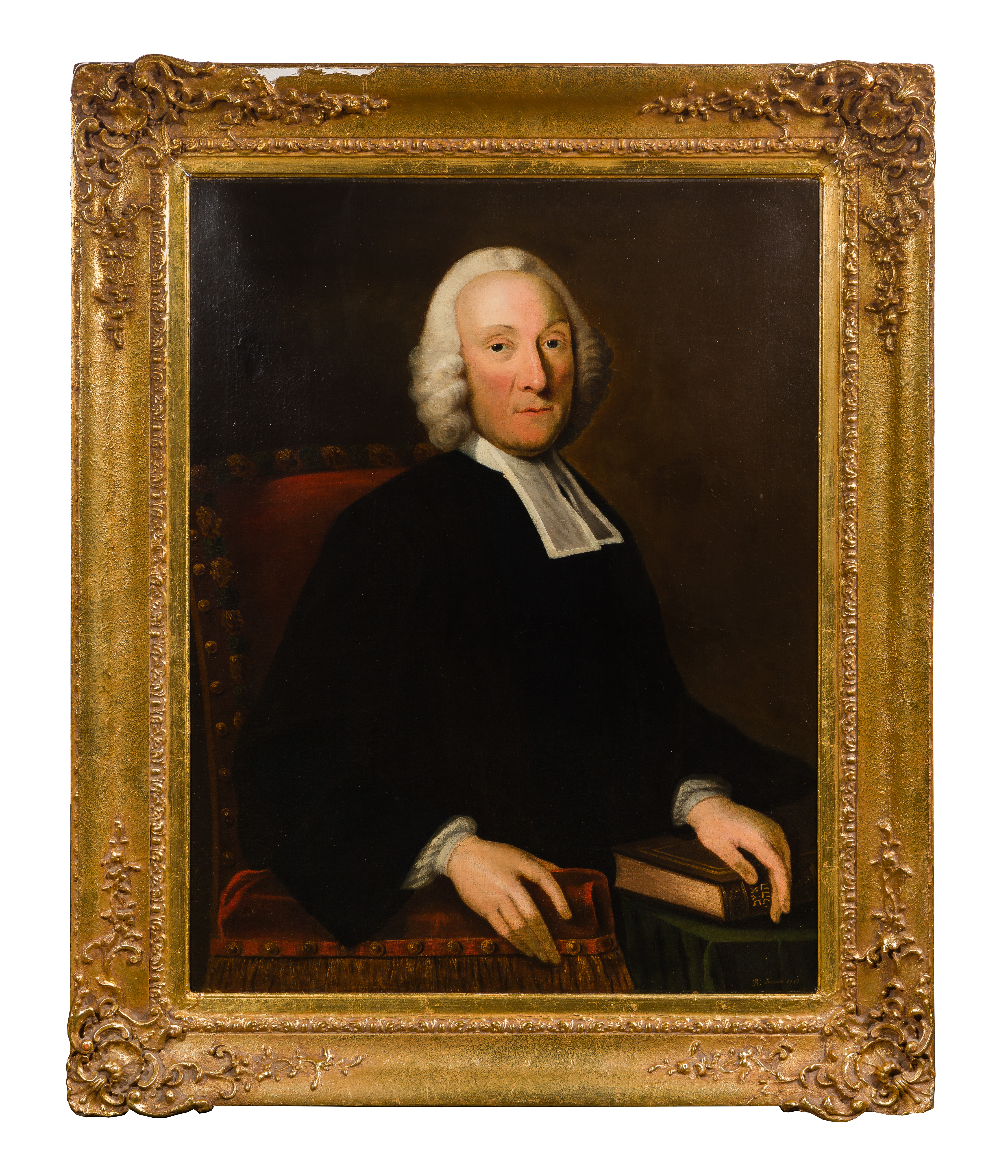 1761, signed lower right, depicting a portrait of an English scholar, in a gold-tone gesso on wood frame