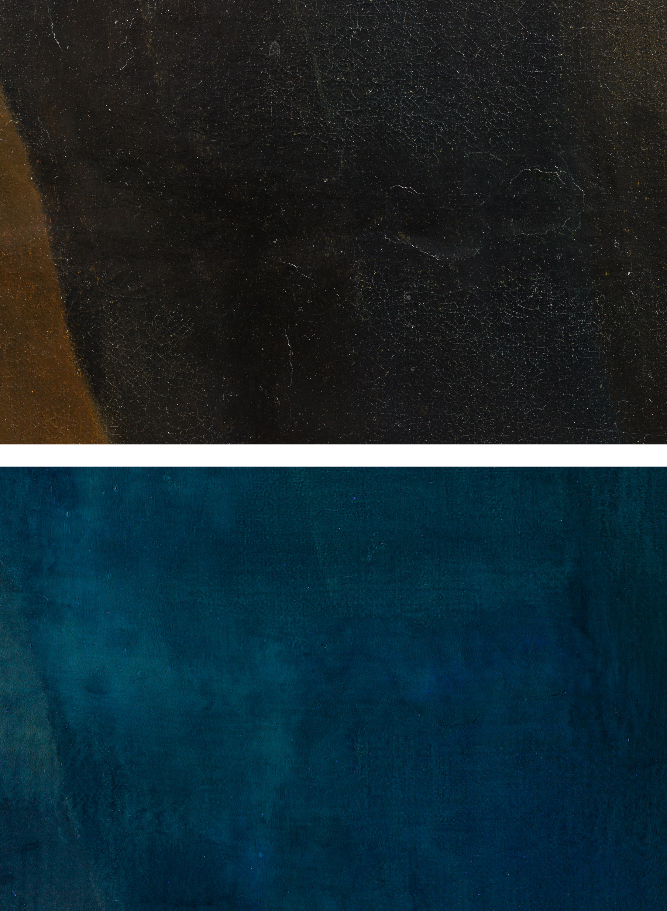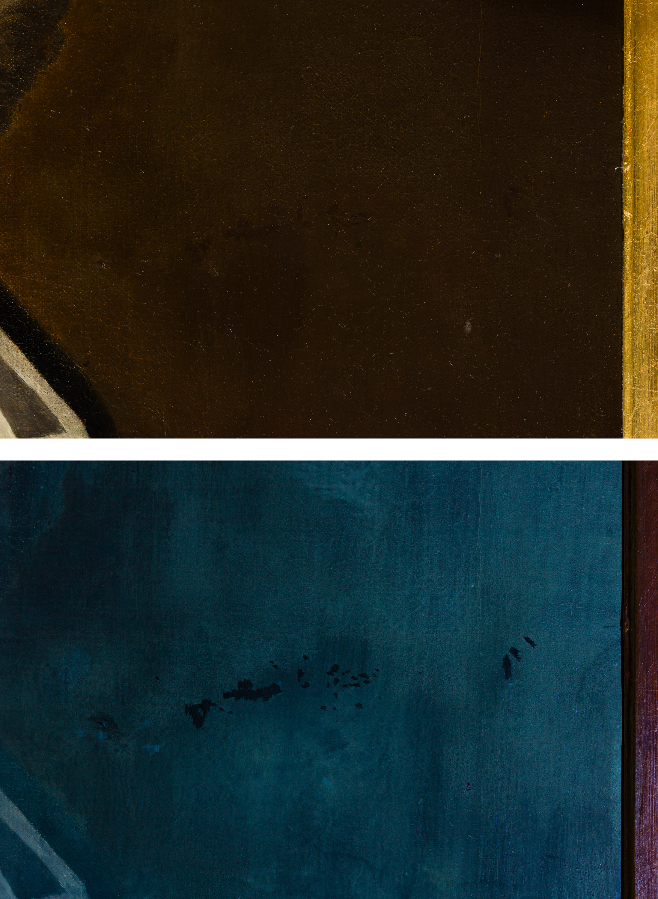 UV inspected, repair in center canvas, some frame rubbing and minor slippage on upper edge, relined, frame having missing gesso and overall wear