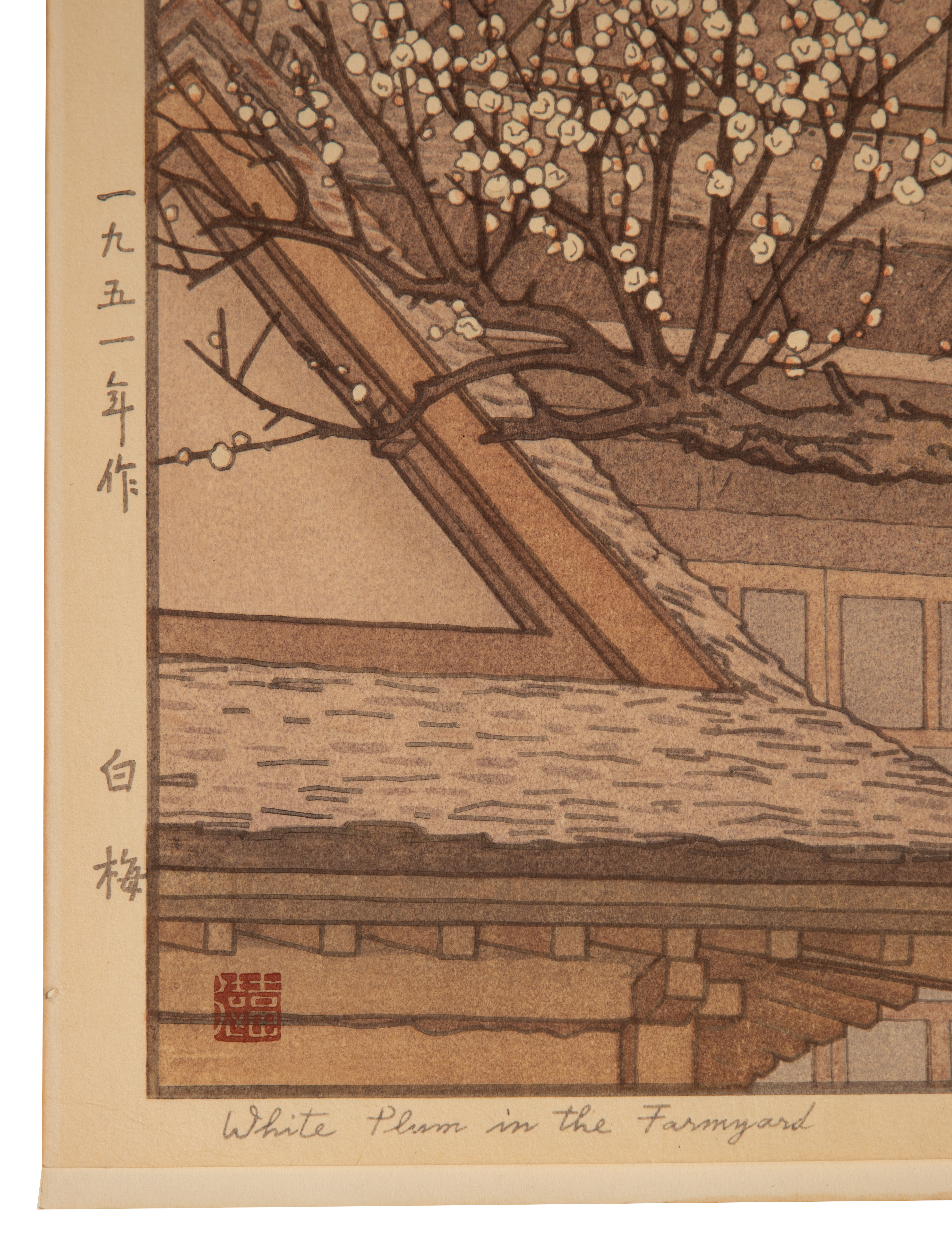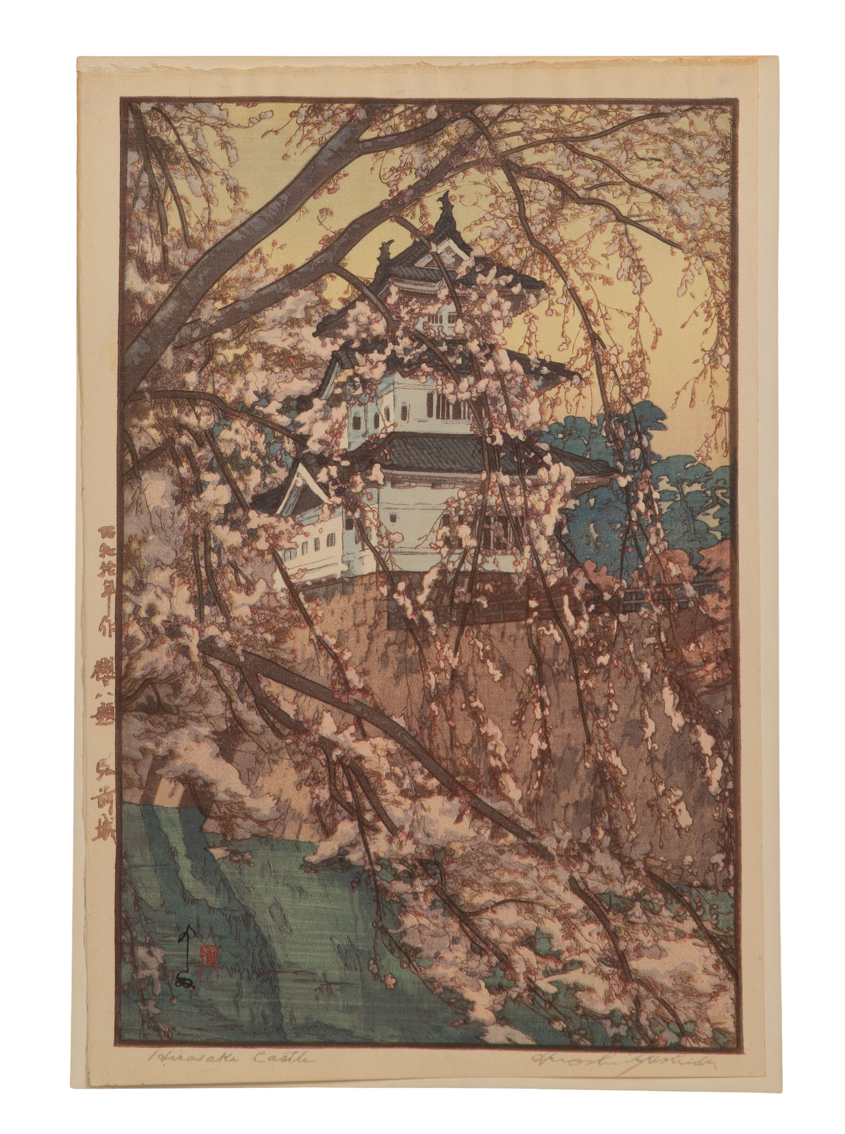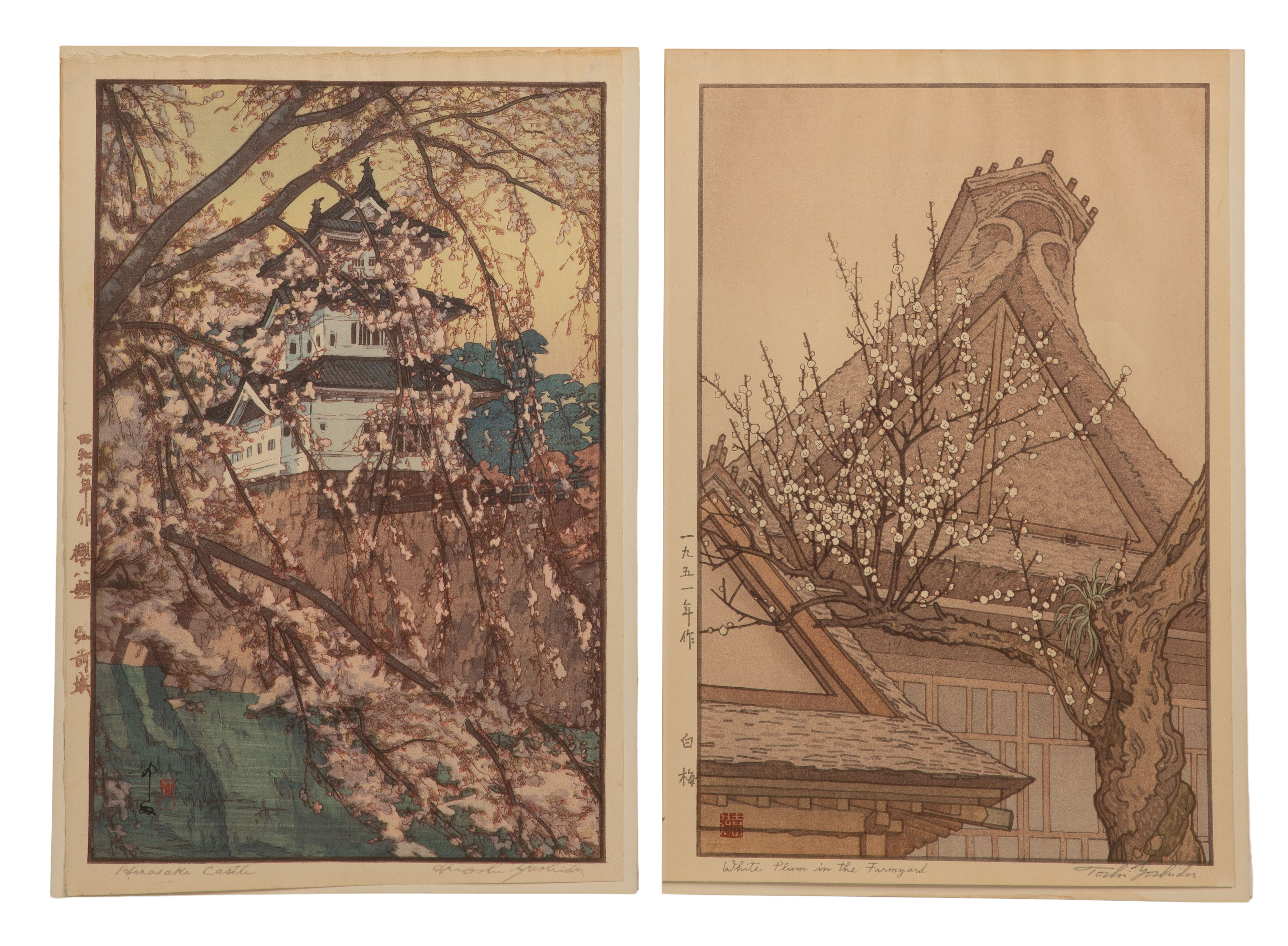 (2) oban size items, both 1930s, pencil signed lower right, titled lower left, printed publisher marks in left margin, including ‘White Plum in the Farmyard’ and ‘Hirosaki Castle’, both full sheets having margins, hinged to illustration board, unframed