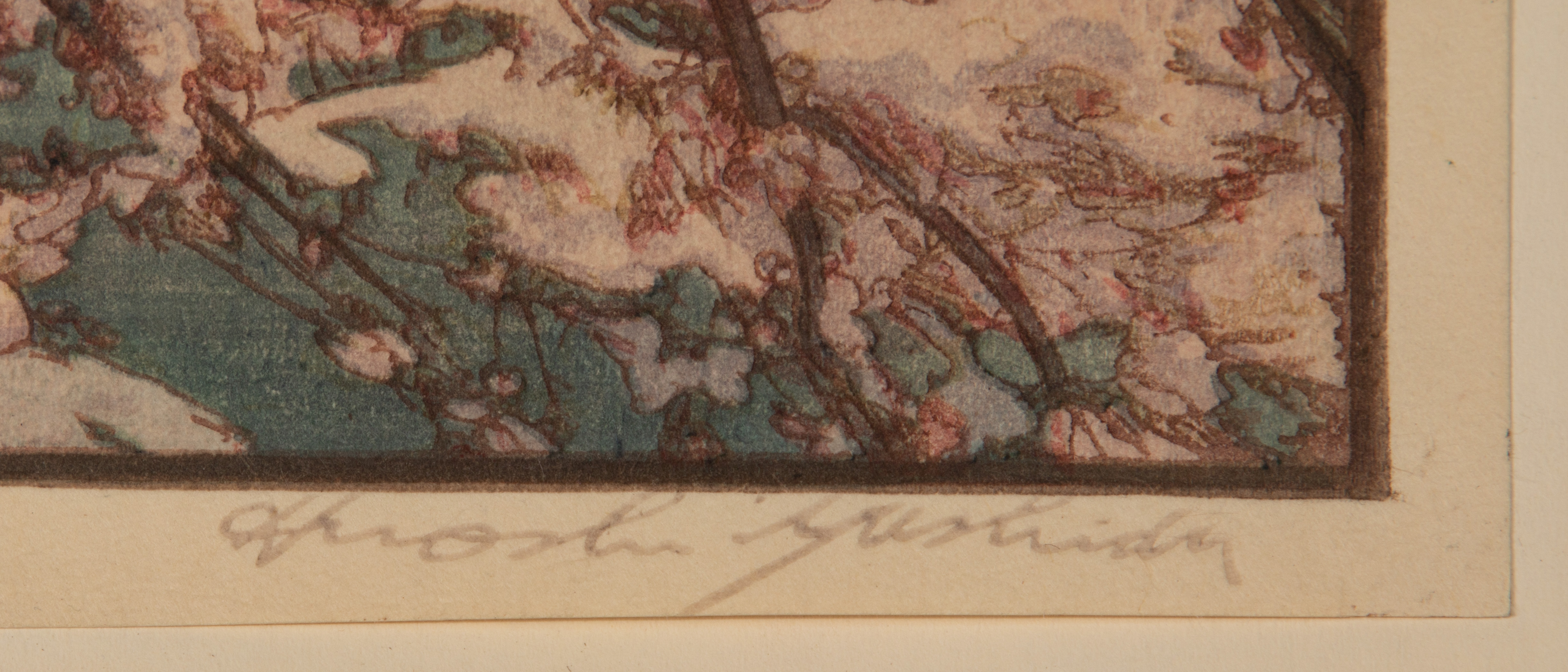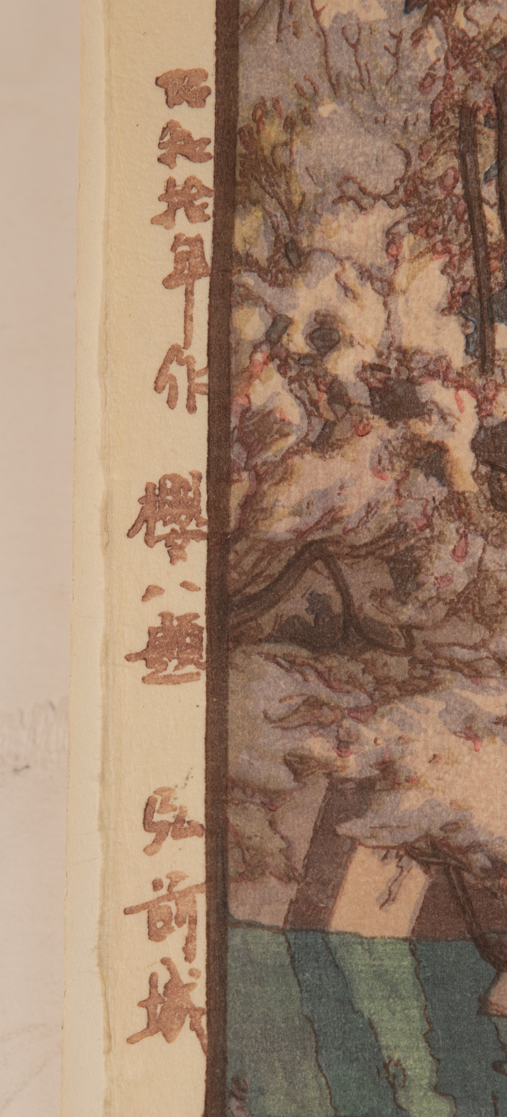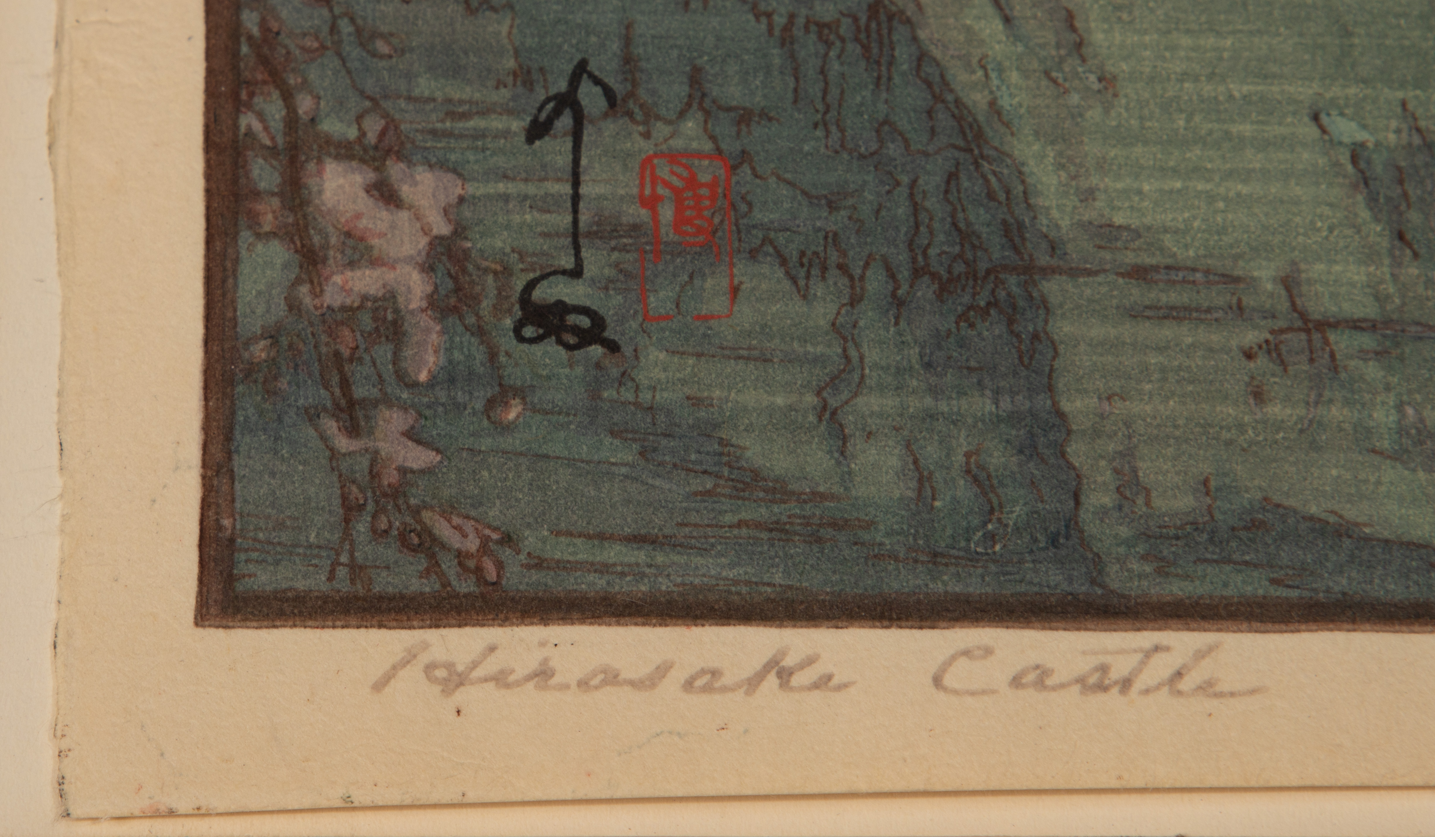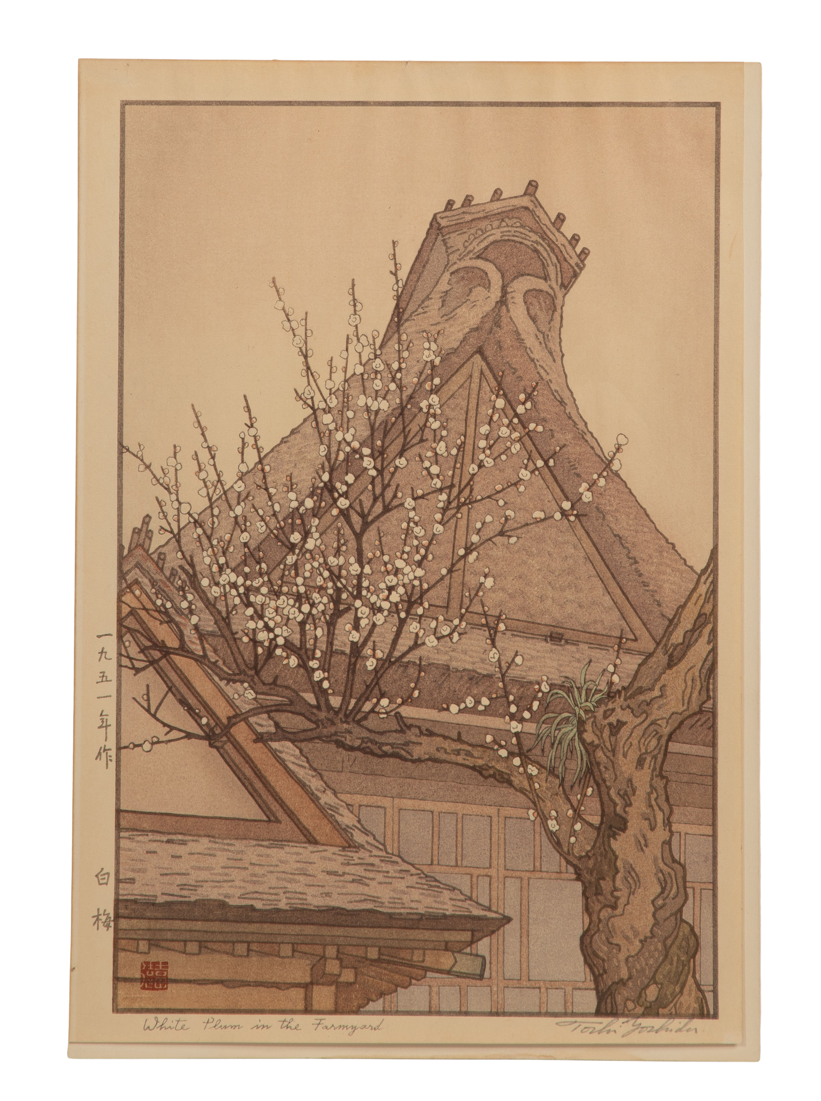 (2) oban size items, both 1930s, pencil signed lower right, titled lower left, printed publisher marks in left margin, including ‘White Plum in the Farmyard’ and ‘Hirosaki Castle’, both full sheets having margins, hinged to illustration board, unframed