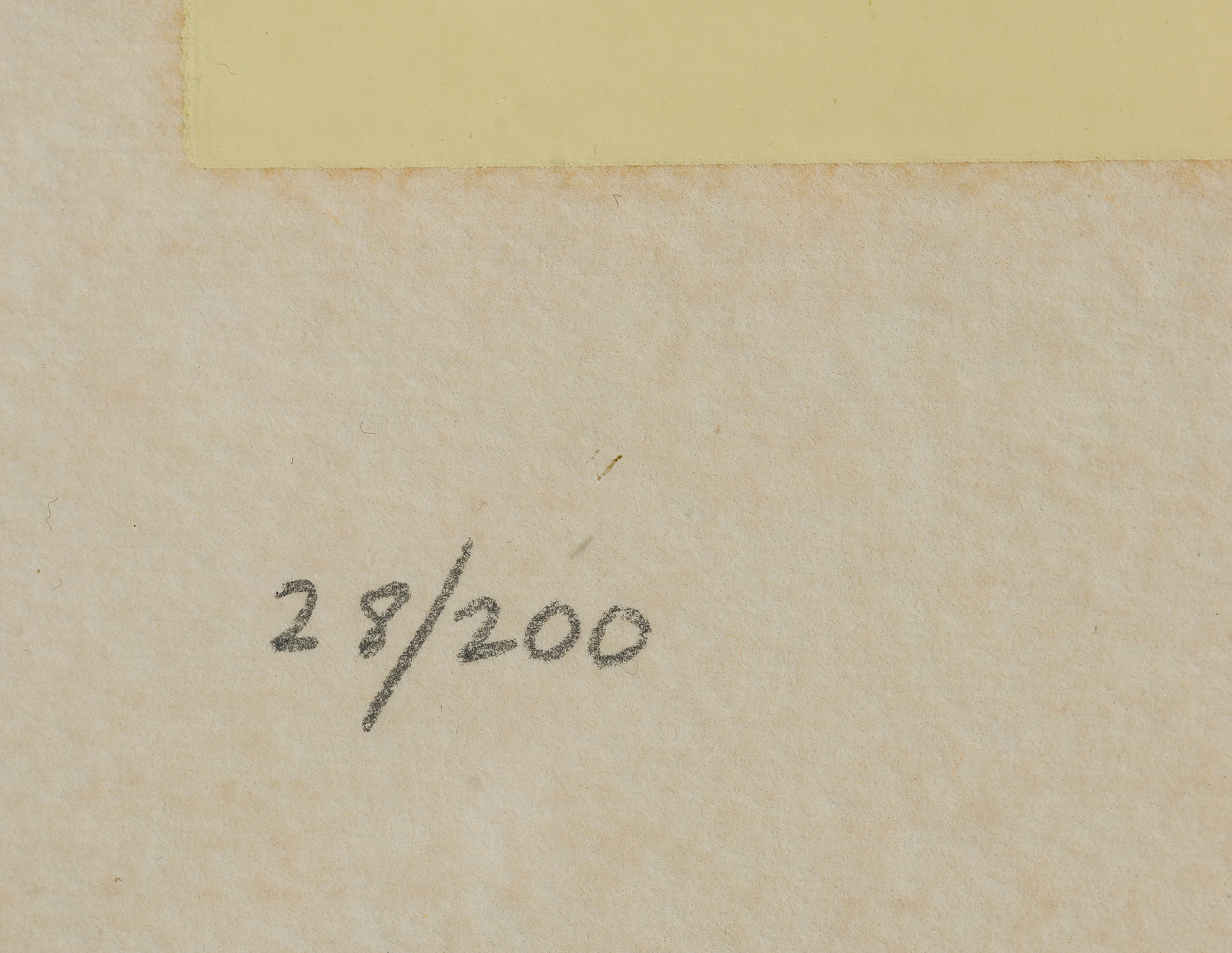 Undated, pencil signed lower left and #28/200, depicting a figure in a hat with horse crop, framed under acrylic