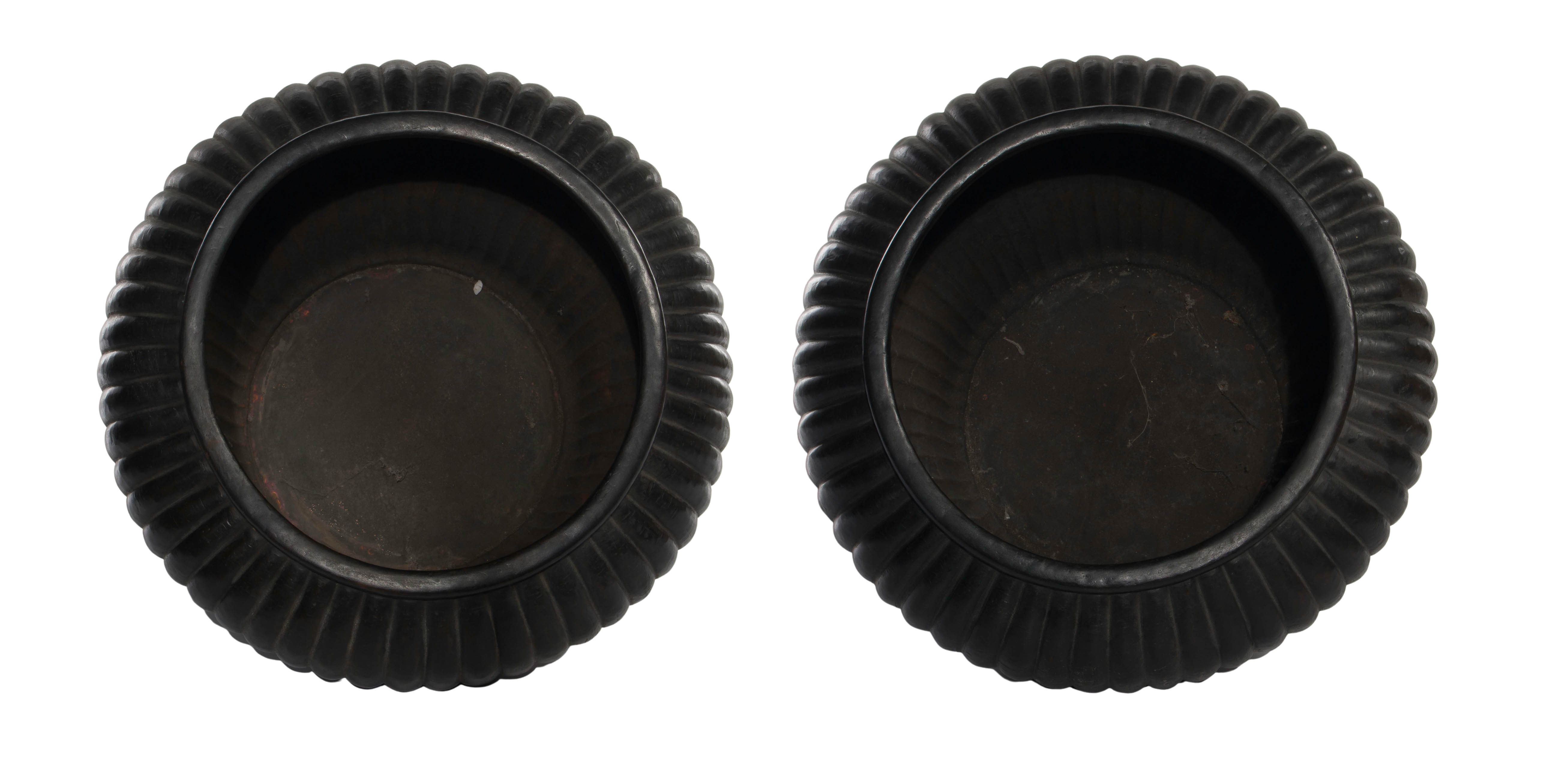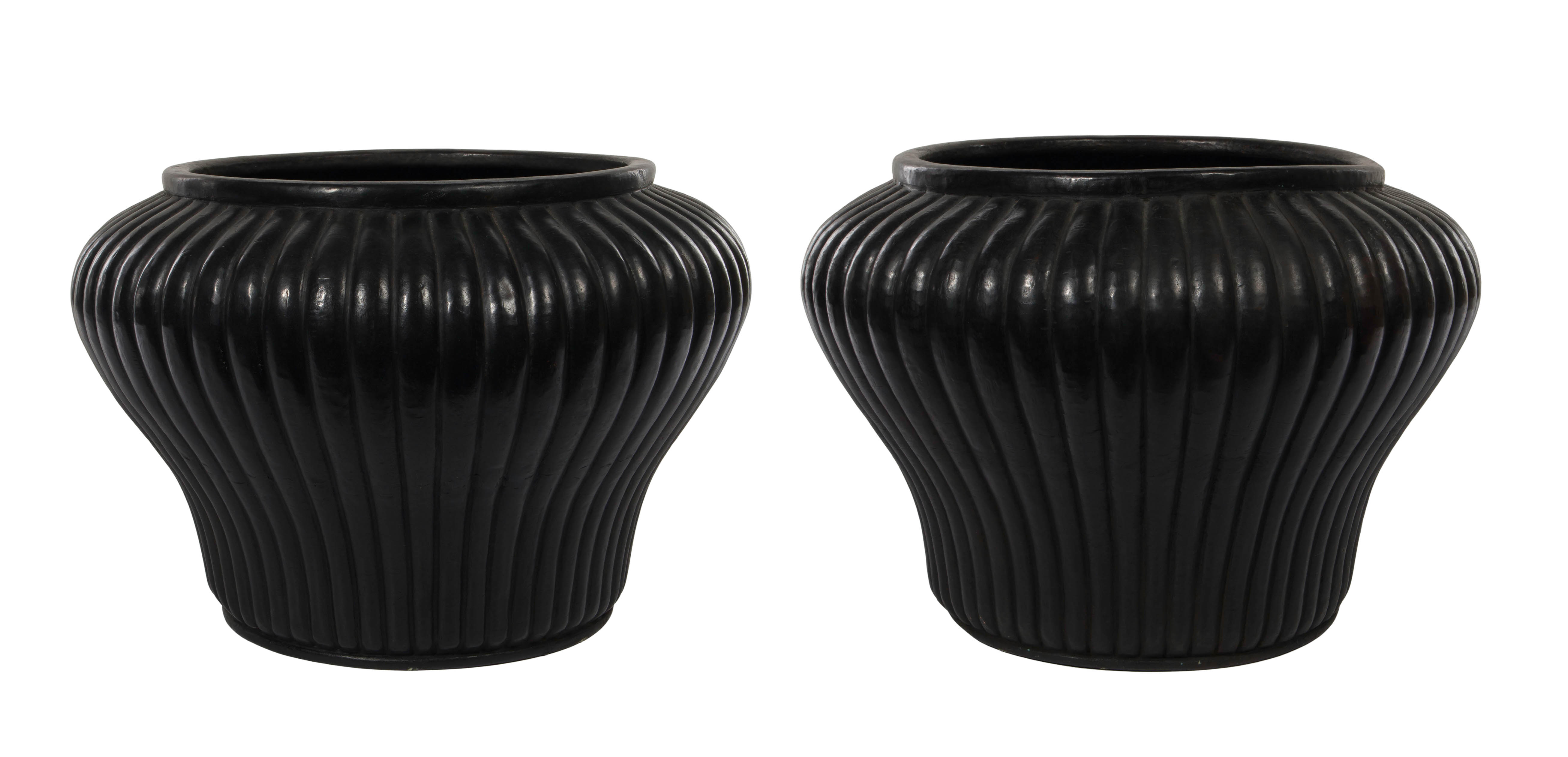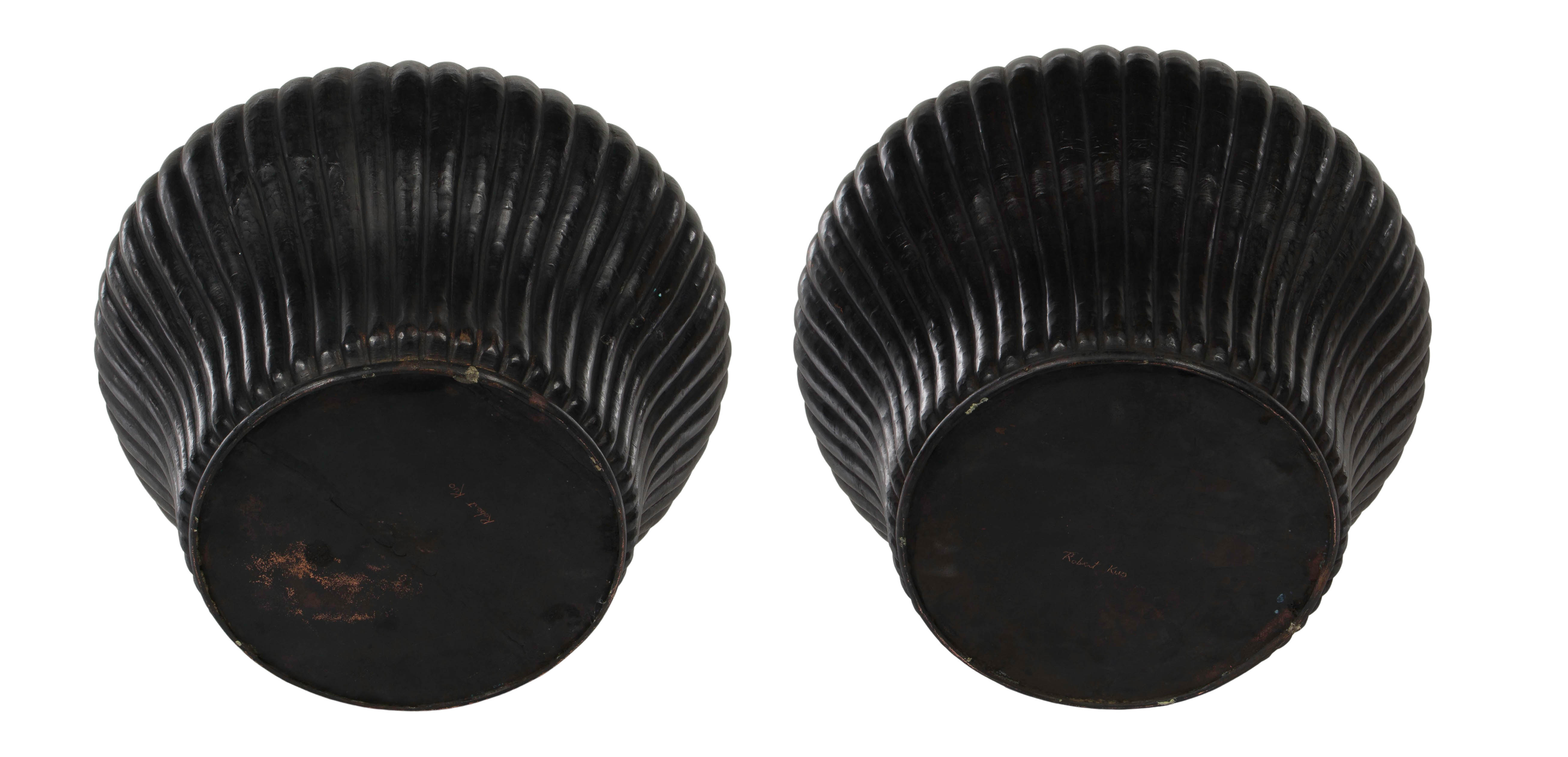 A pair, black on copper floor pots having a ribbed bulbous shape, signed on underside