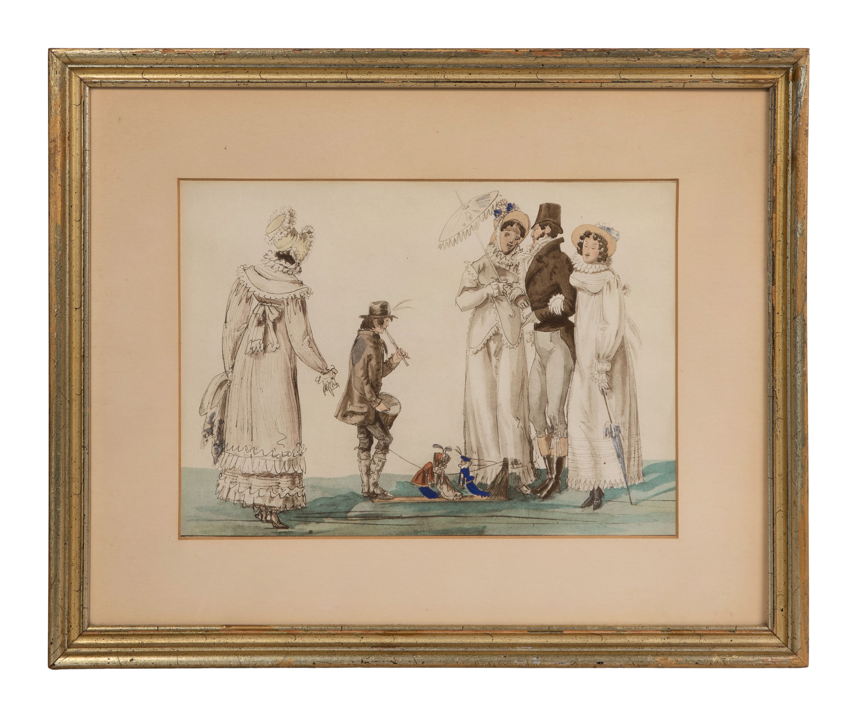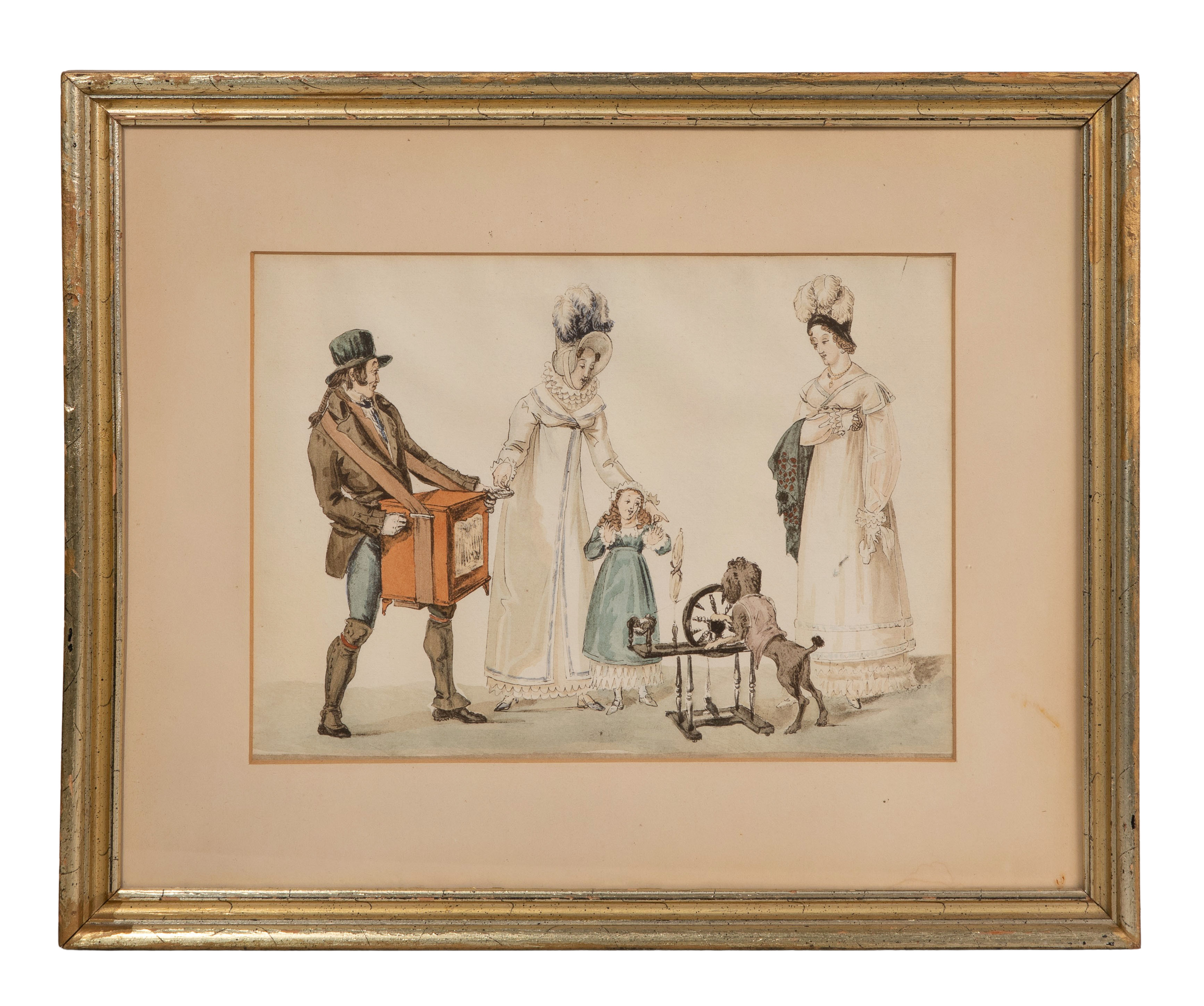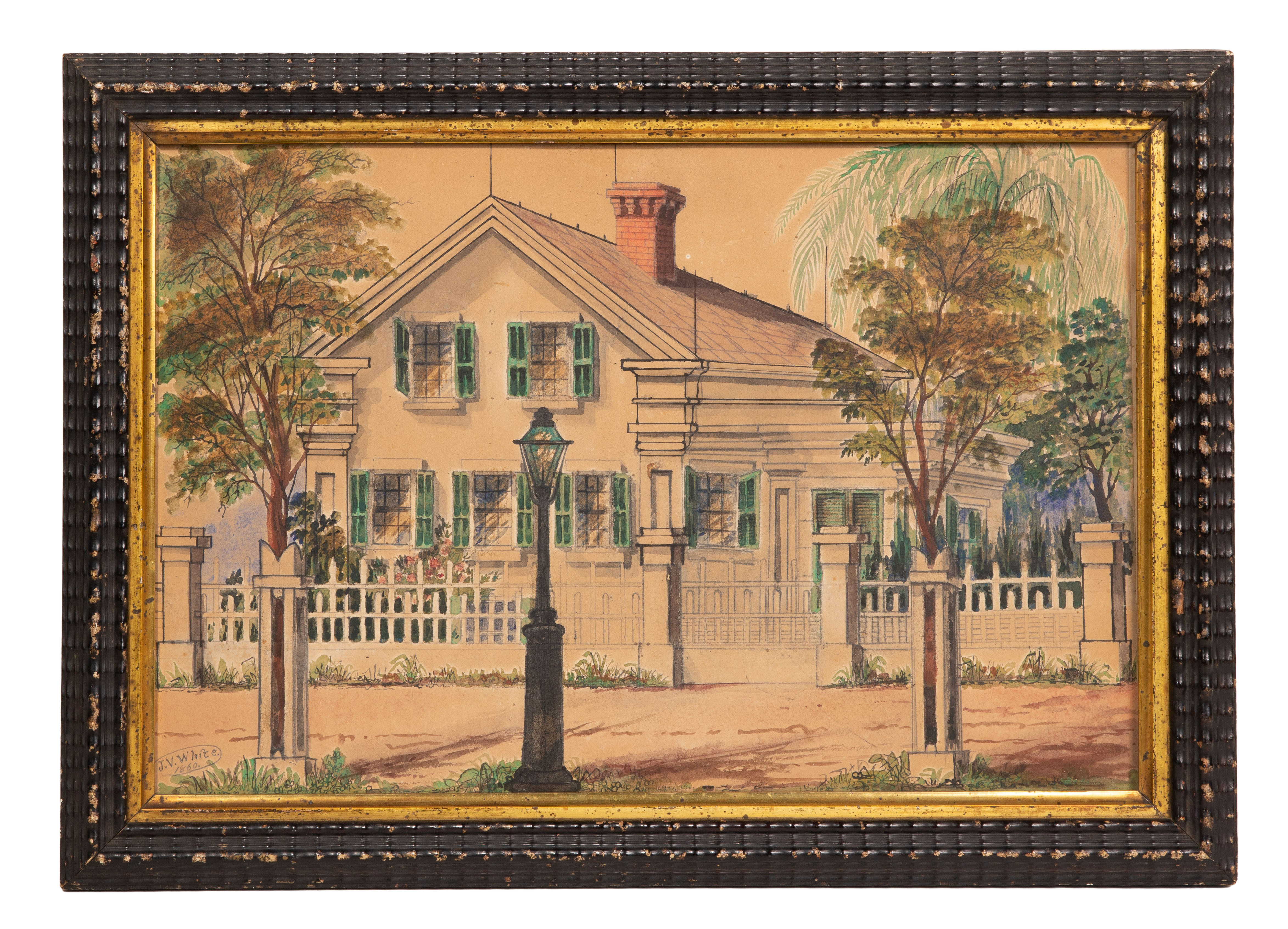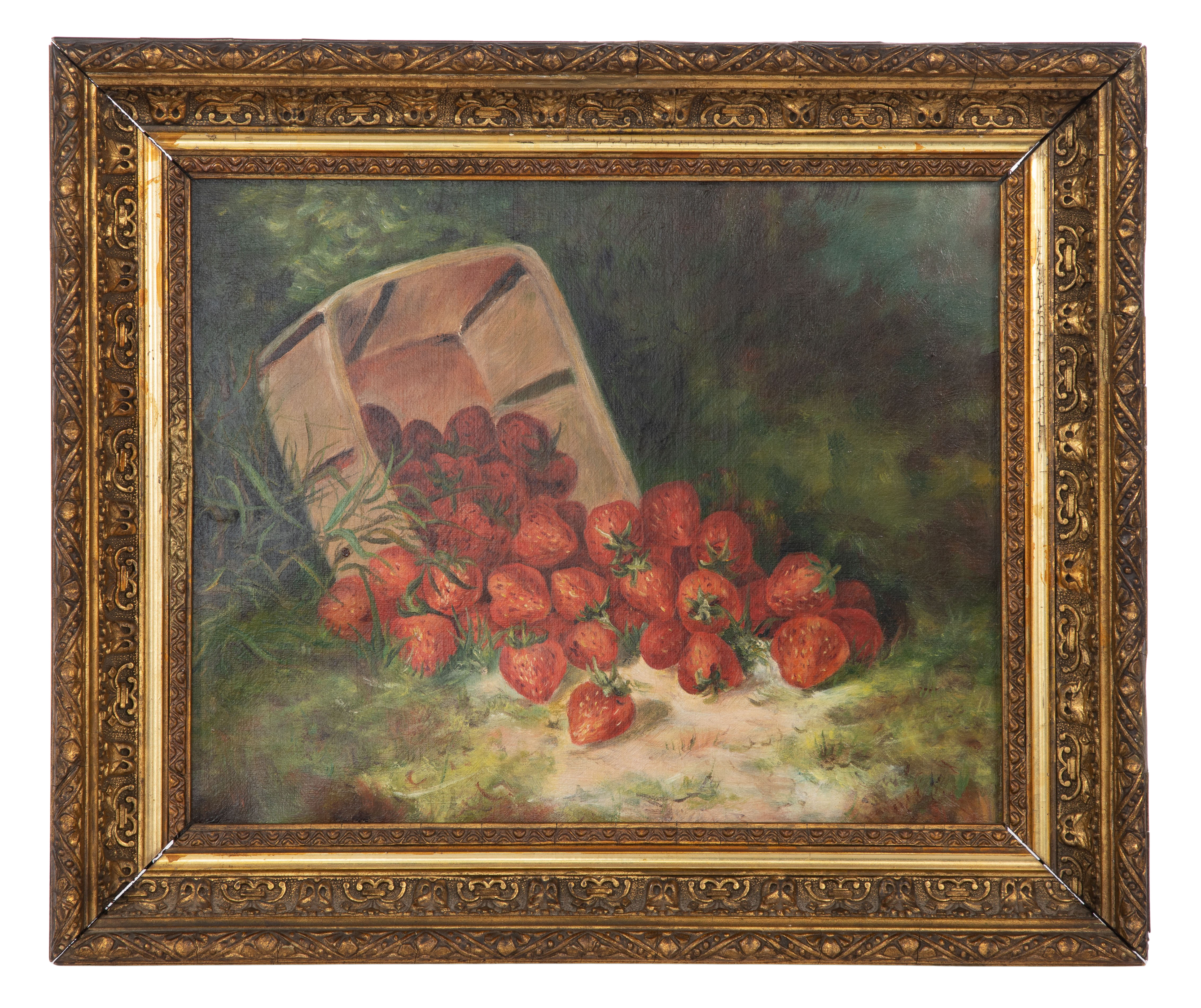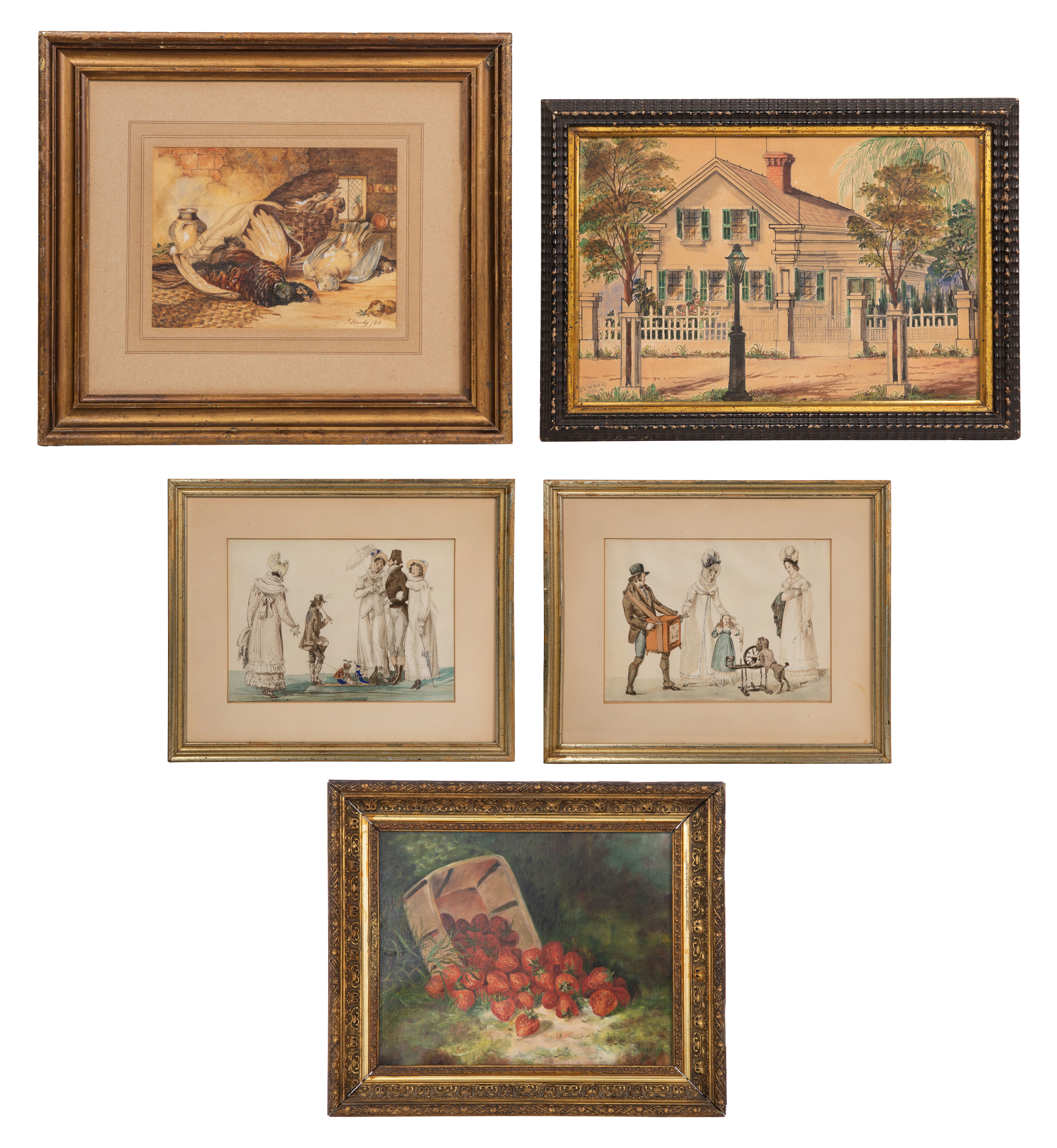 (5) total items including an 1860 still life, signed lower right, matted under glass in a wood frame; together with an 1860 watercolor of a home, signed ‘JV White’, framed under glass, (2) unsigned hand colored etchings depicting French street life matted and framed under glass and an oil still life of strawberries, in a gold frame