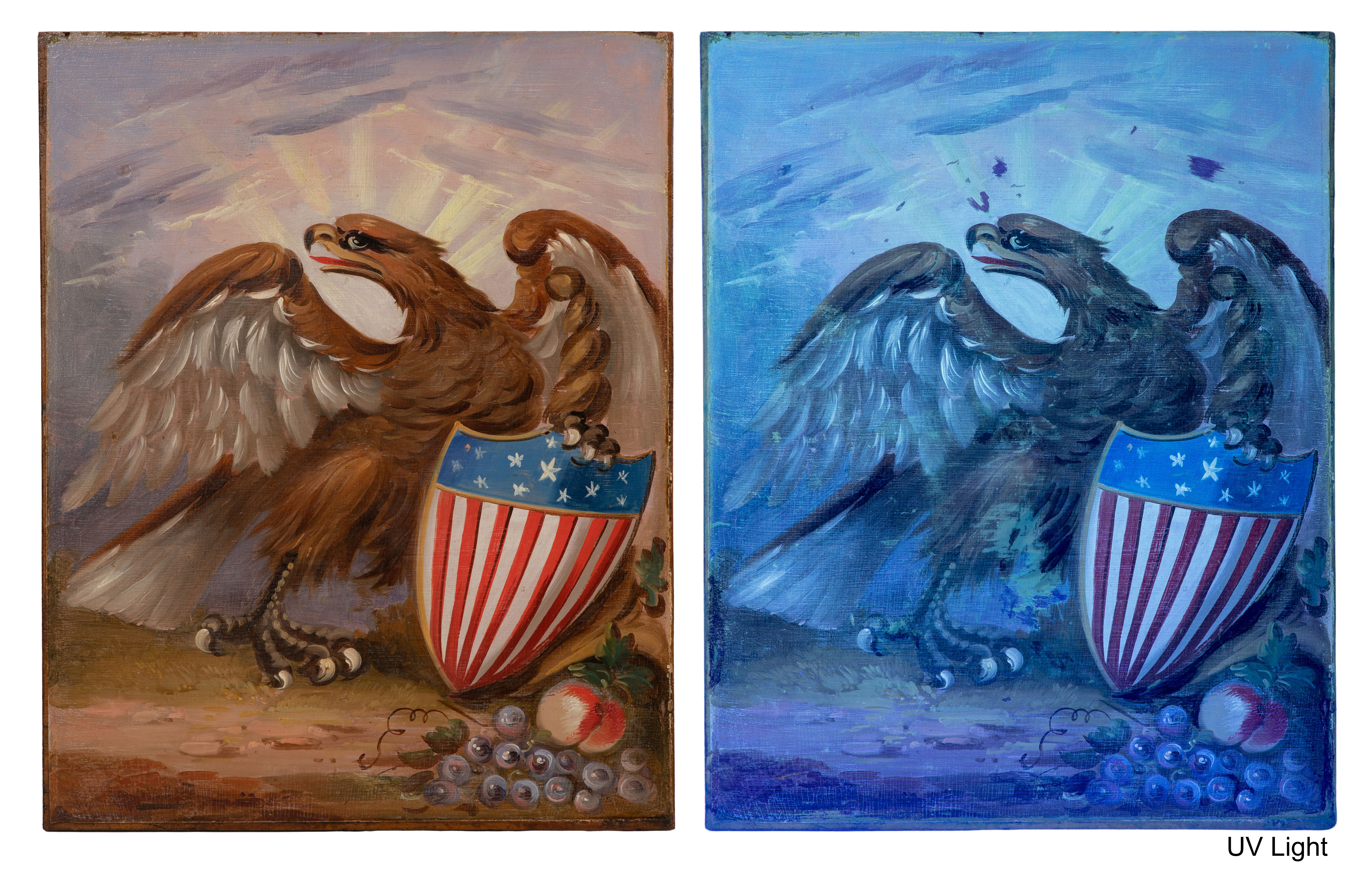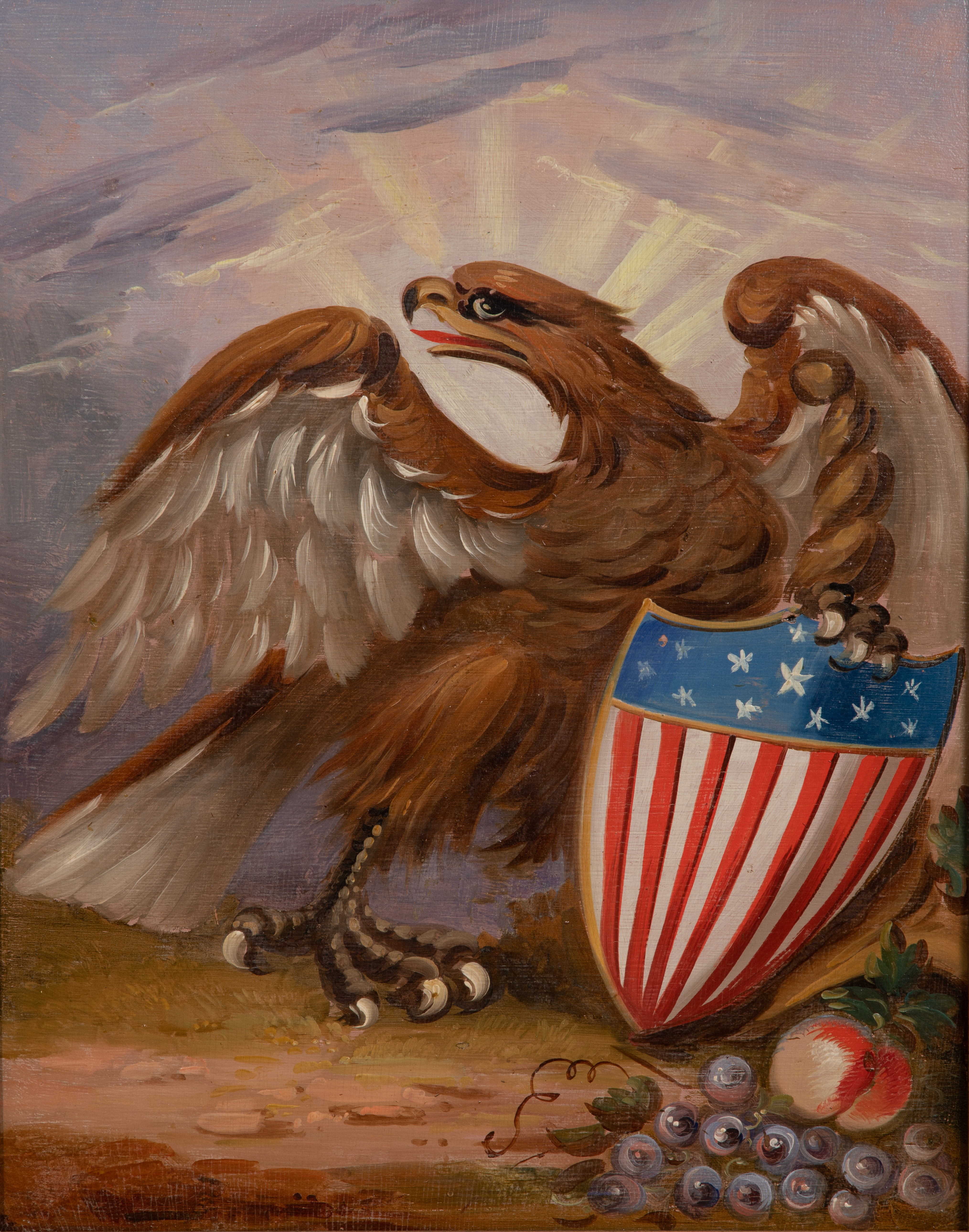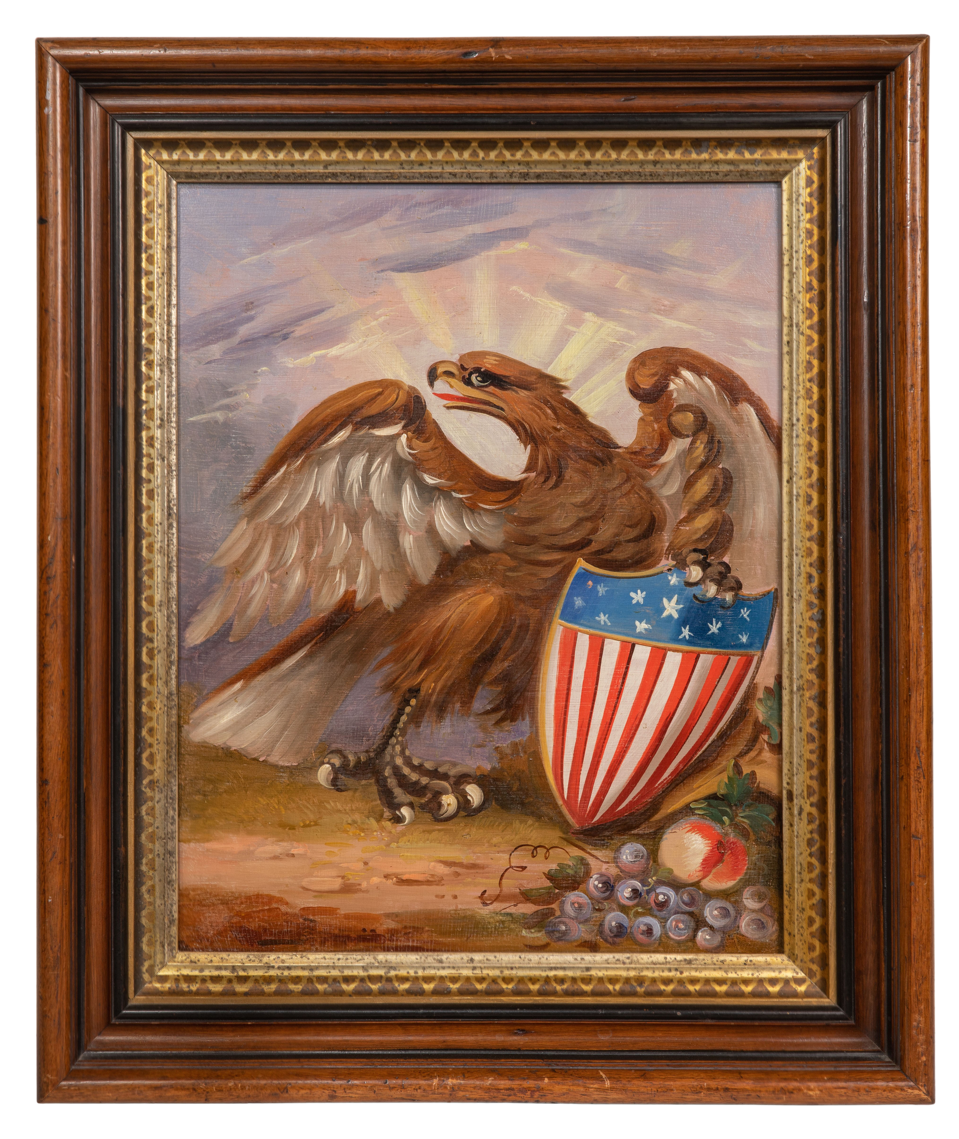 Undated, unsigned, depicting an eagle with a patriotic shield, board inscribed verso ‘Thomas E. Bodines Painted By Hume in the Camden of Amboy Shops’, in a carved wood frame, attached Sotheby’s tag verso