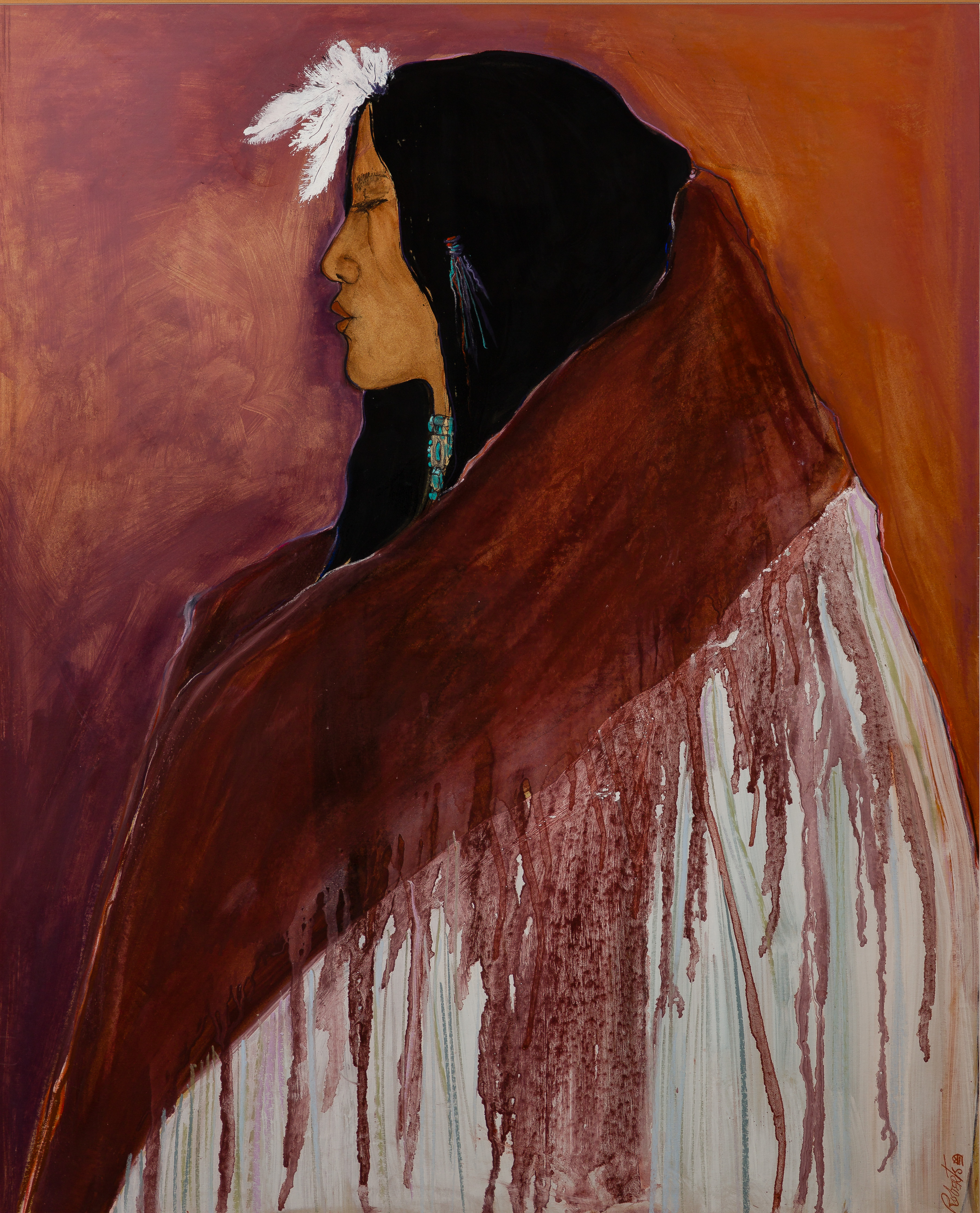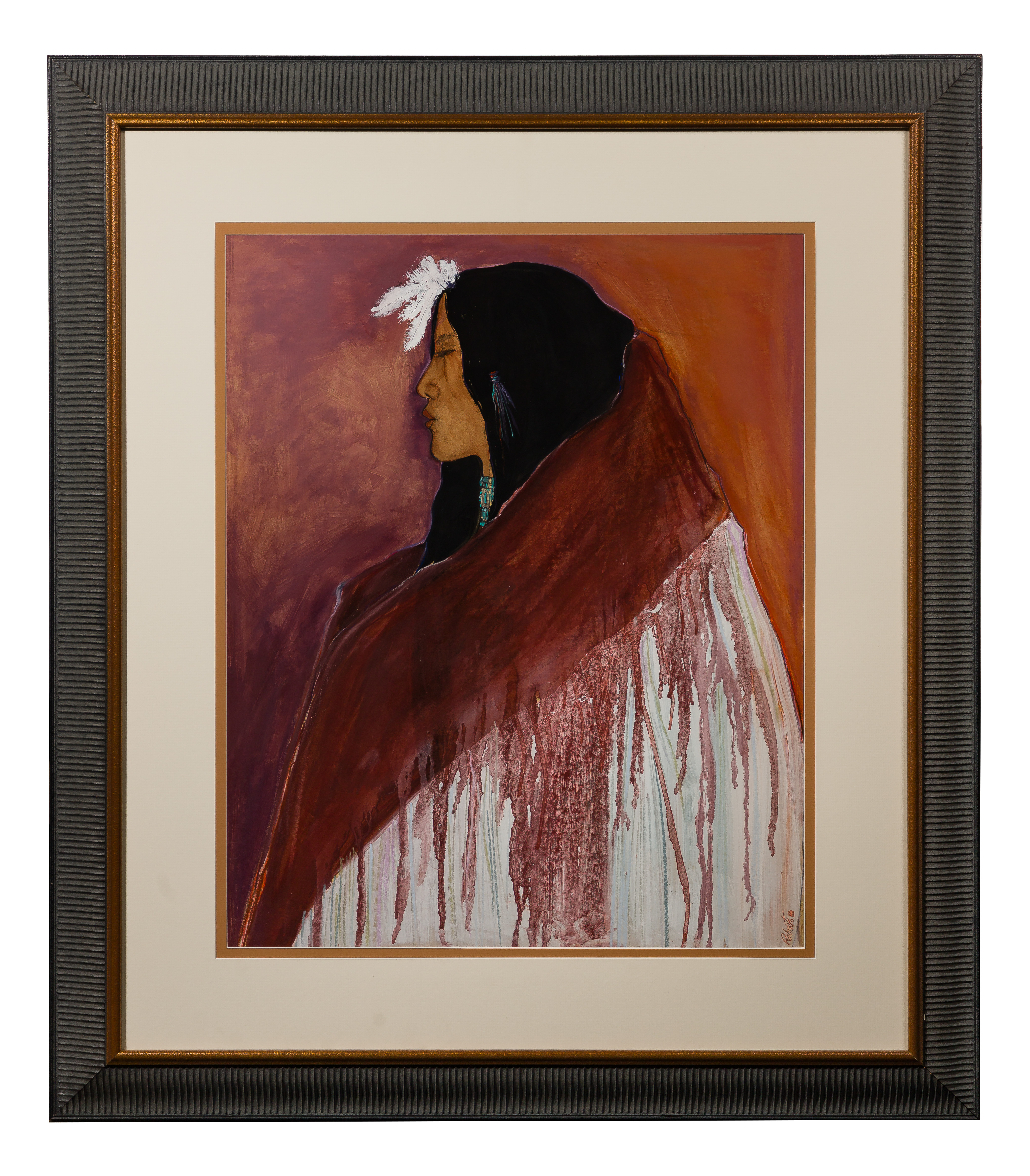 Undated, signed lower right, depicting a Native American Indian profile wrapped in a blanket, matted under acrylic in a black frame