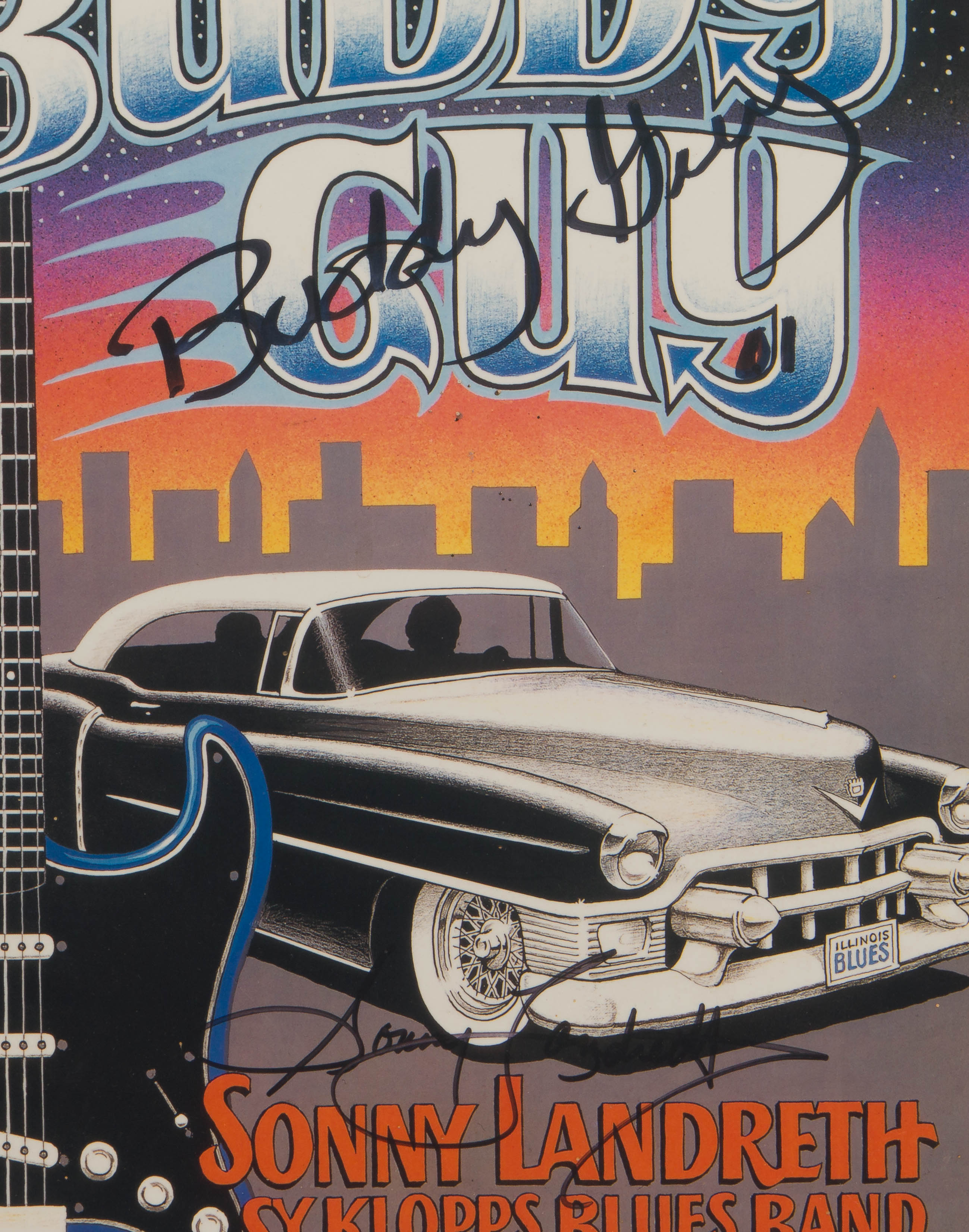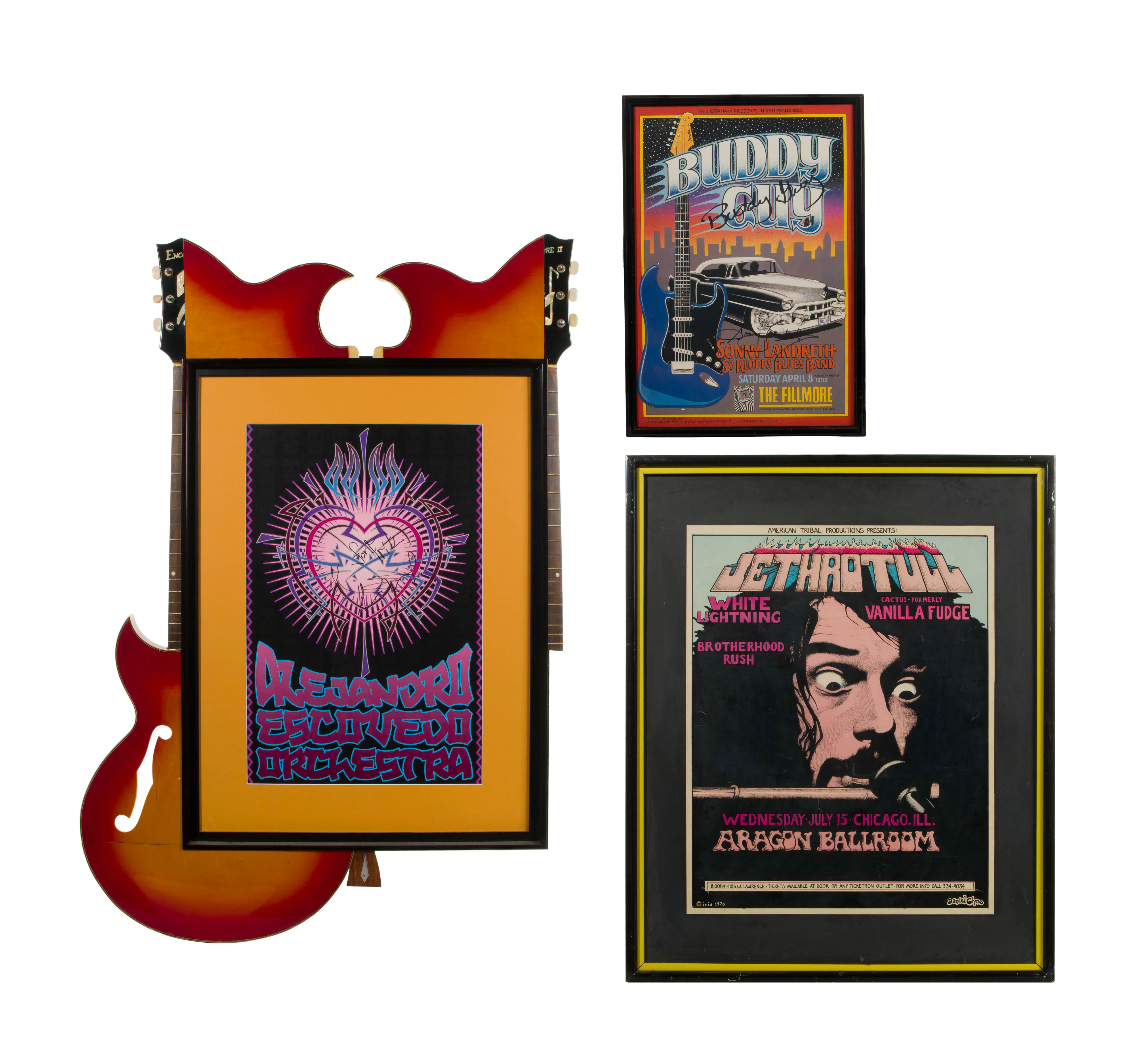 (3) items including 1970 ‘Jethro Tull’ at the Aragon Ballroom in Chicago, a signed 1995 ‘Buddy Guy’ at the Fillmore and a signed ‘Alejandro Escovedo Orchestra’, all framed behind glass