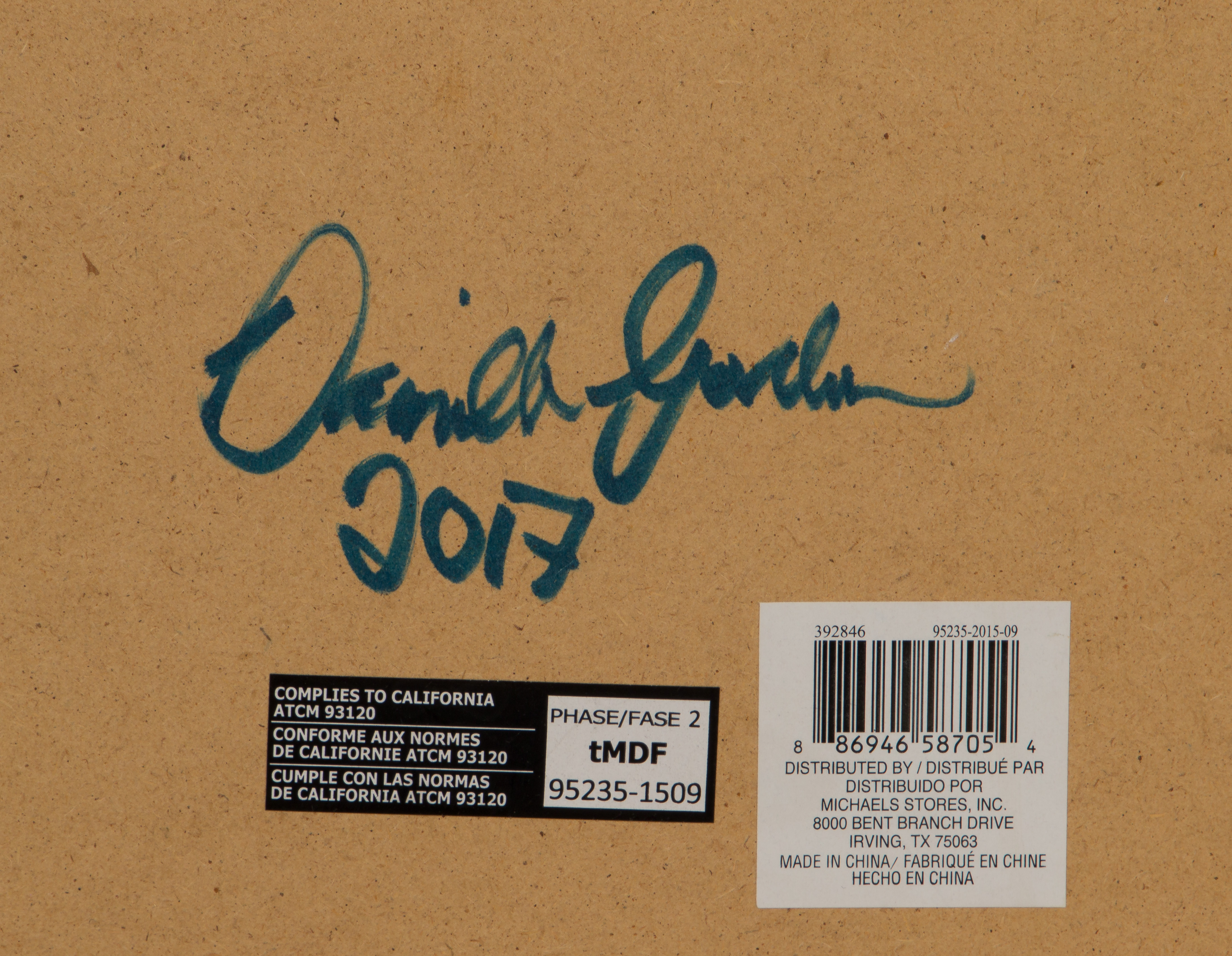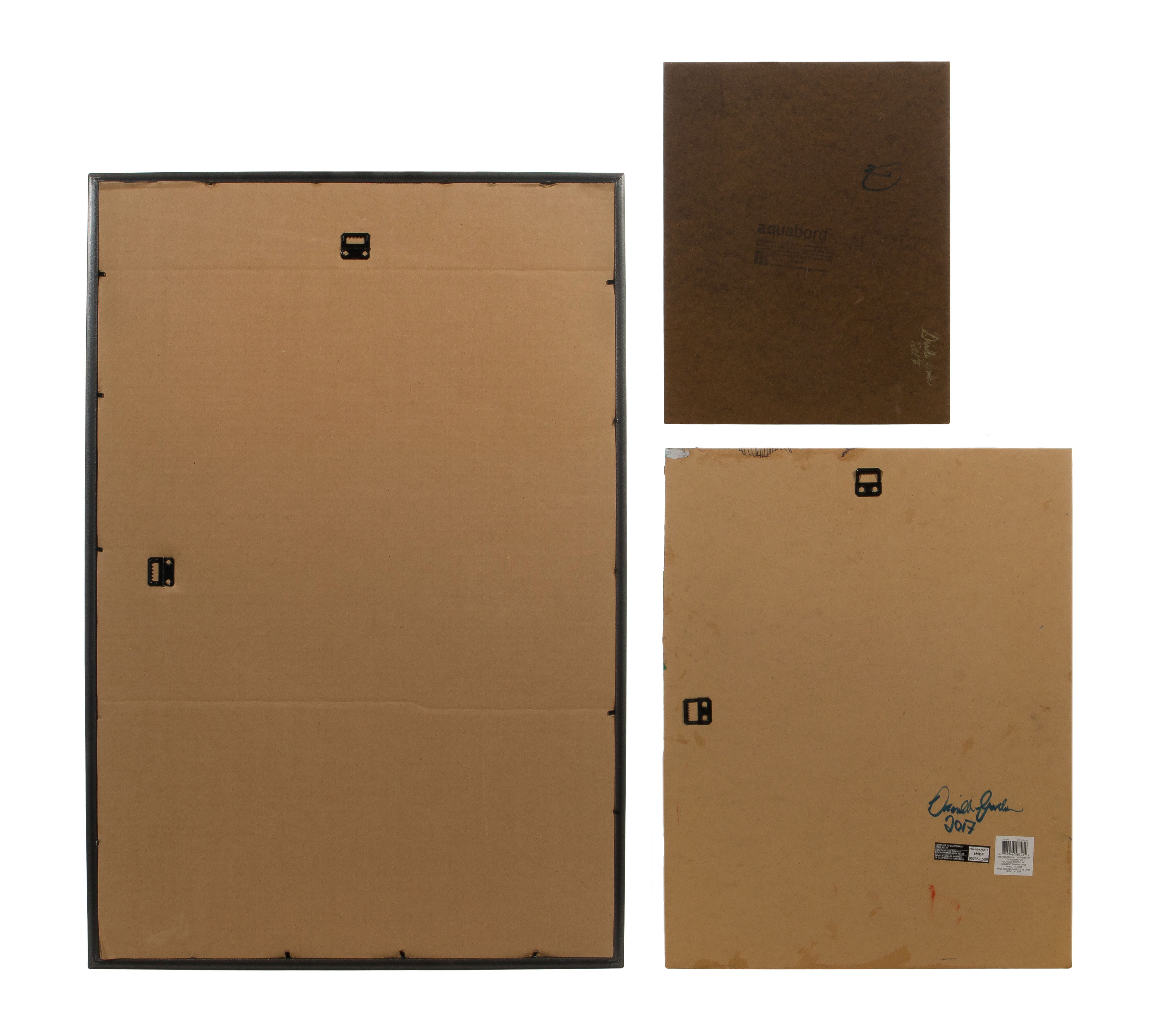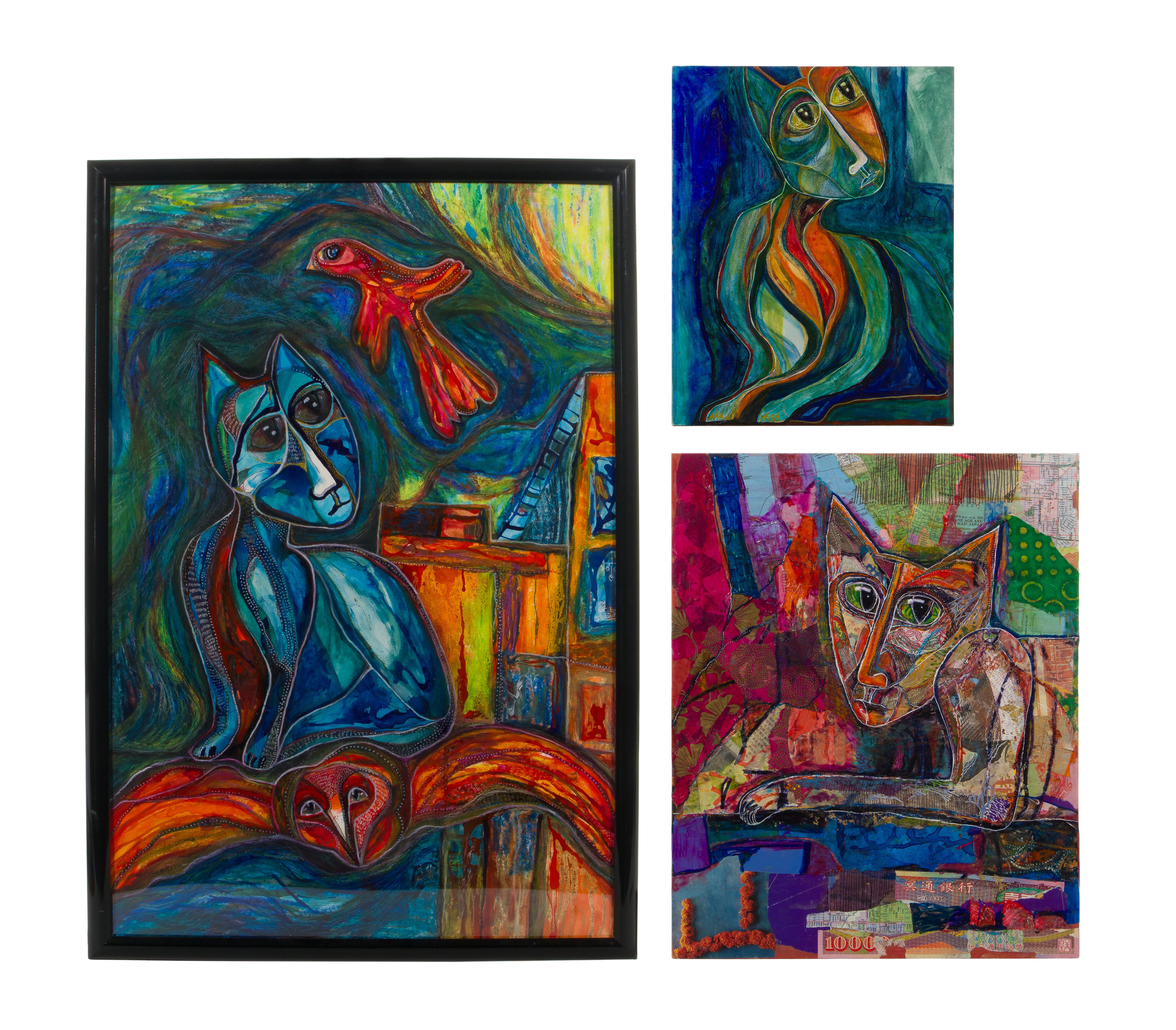 (3) 2017 items, signed verso, depicting abstract feline creatures, one in a poster frame and two unframed