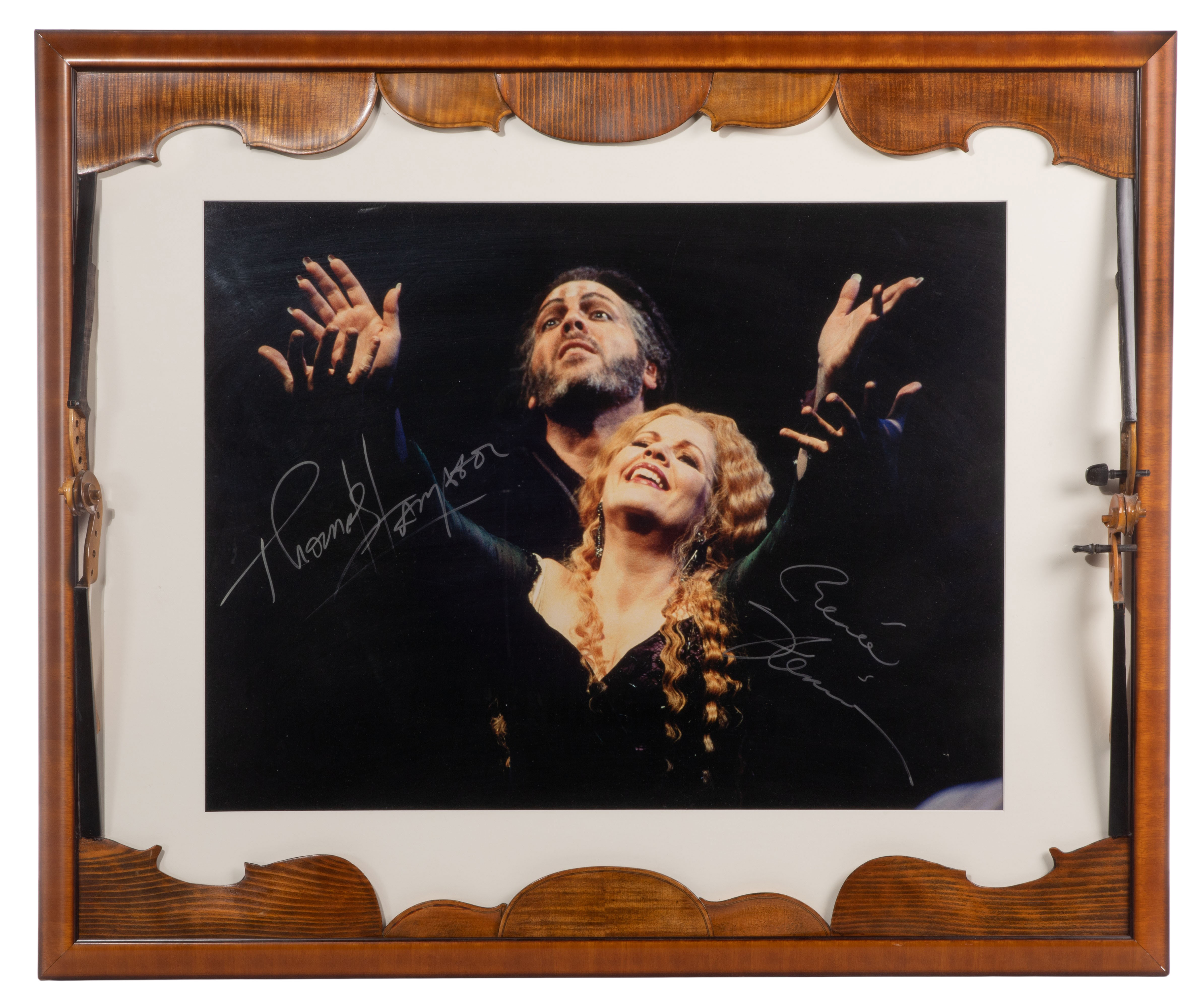 Signed by Renee Fleming and Thomas Hampson, matted under acrylic in a custom frame made from violin pieces, ‘Merry Christmas’ annotation on verso