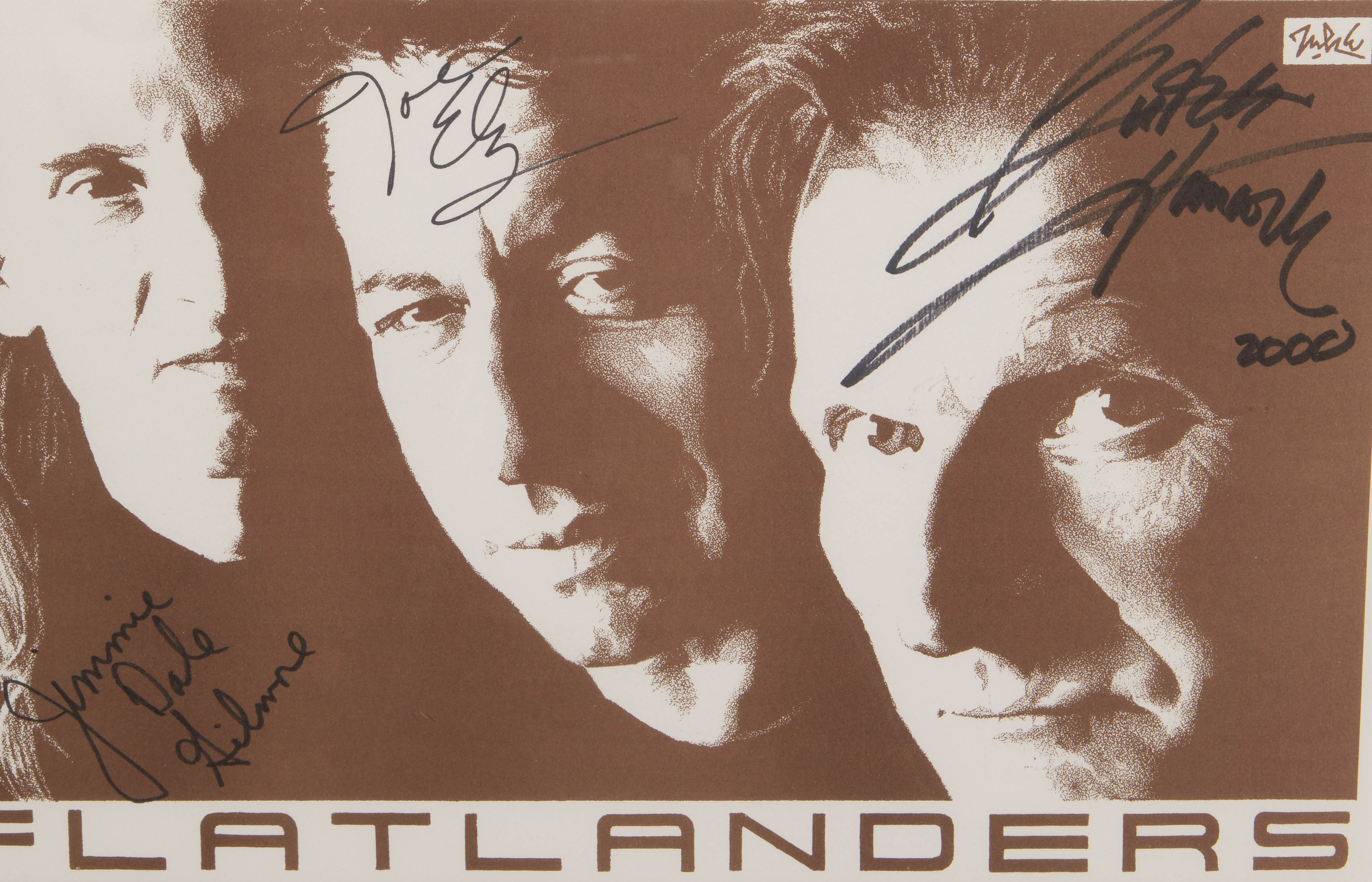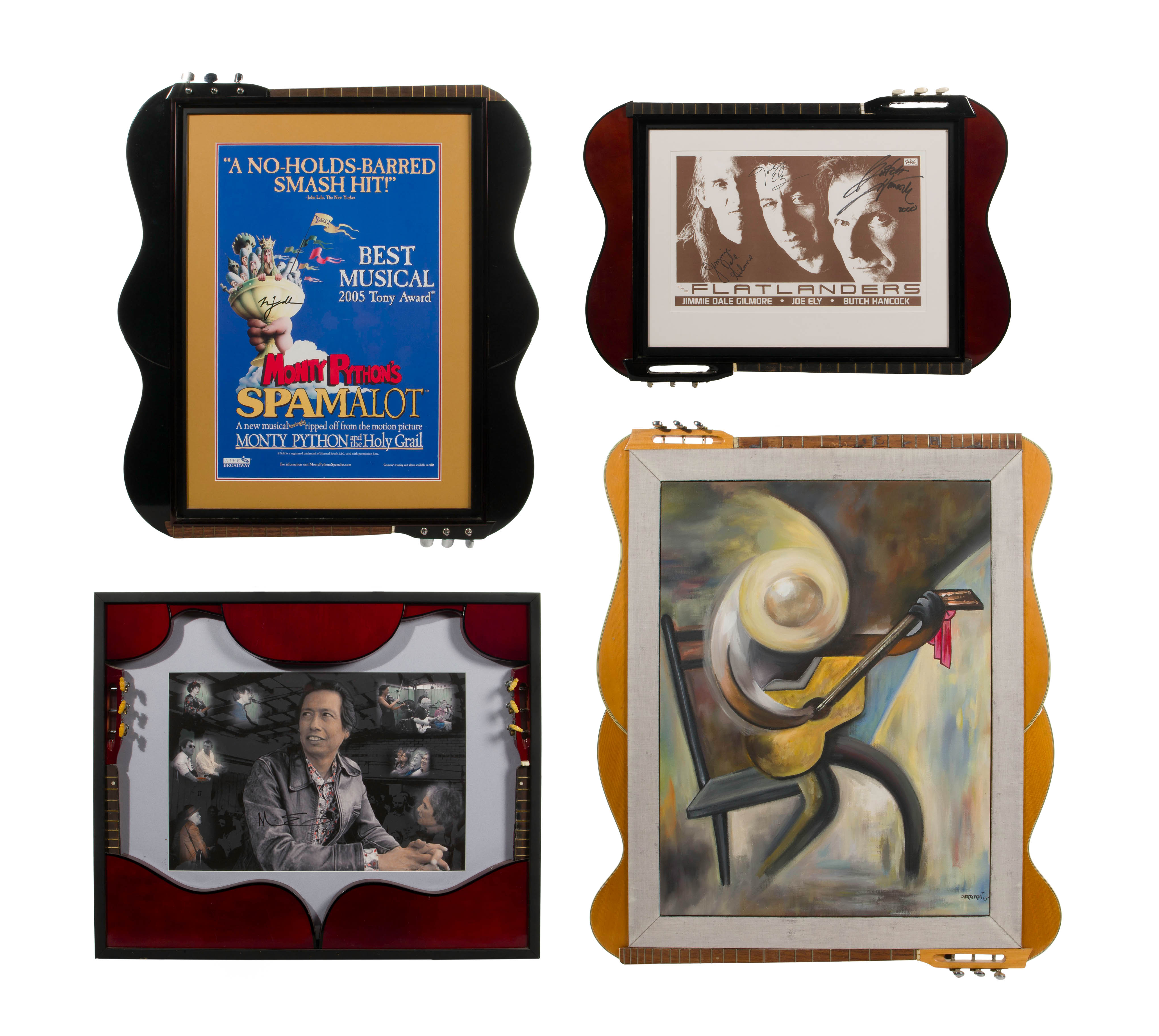 (4) total items including a poster for the musical ‘Spamalot’, a ‘Flatlanders’ poster and a poster of studio musicians; together with an undated oil on canvas, illegibly signed lower left depicting a guitar player, all framed in guitar parts