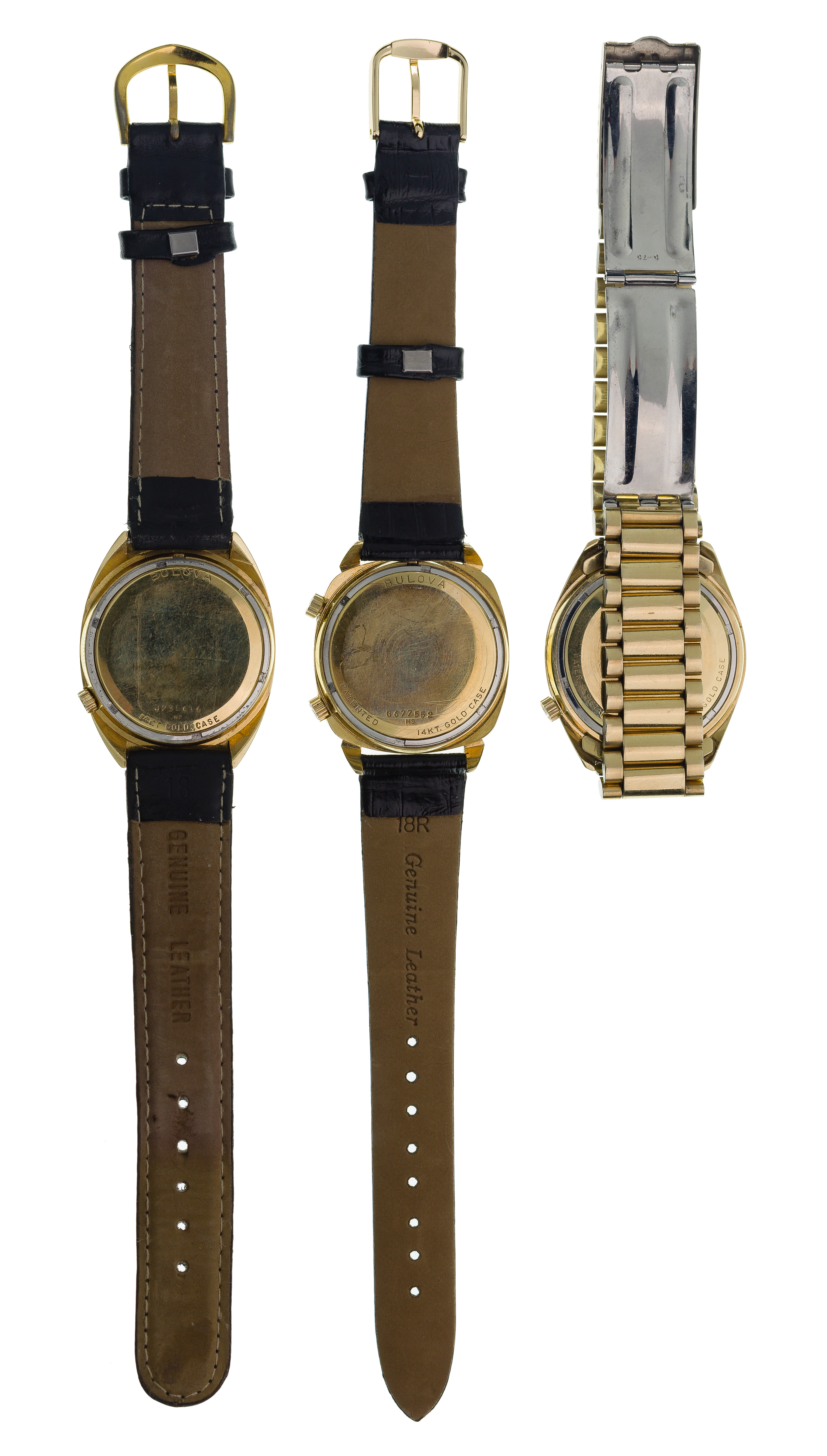 (3) items including Astronaut Mark II, an Updown and a Dual Calendar (all cases marked ’14k’), two on leather bands and one on a link style band