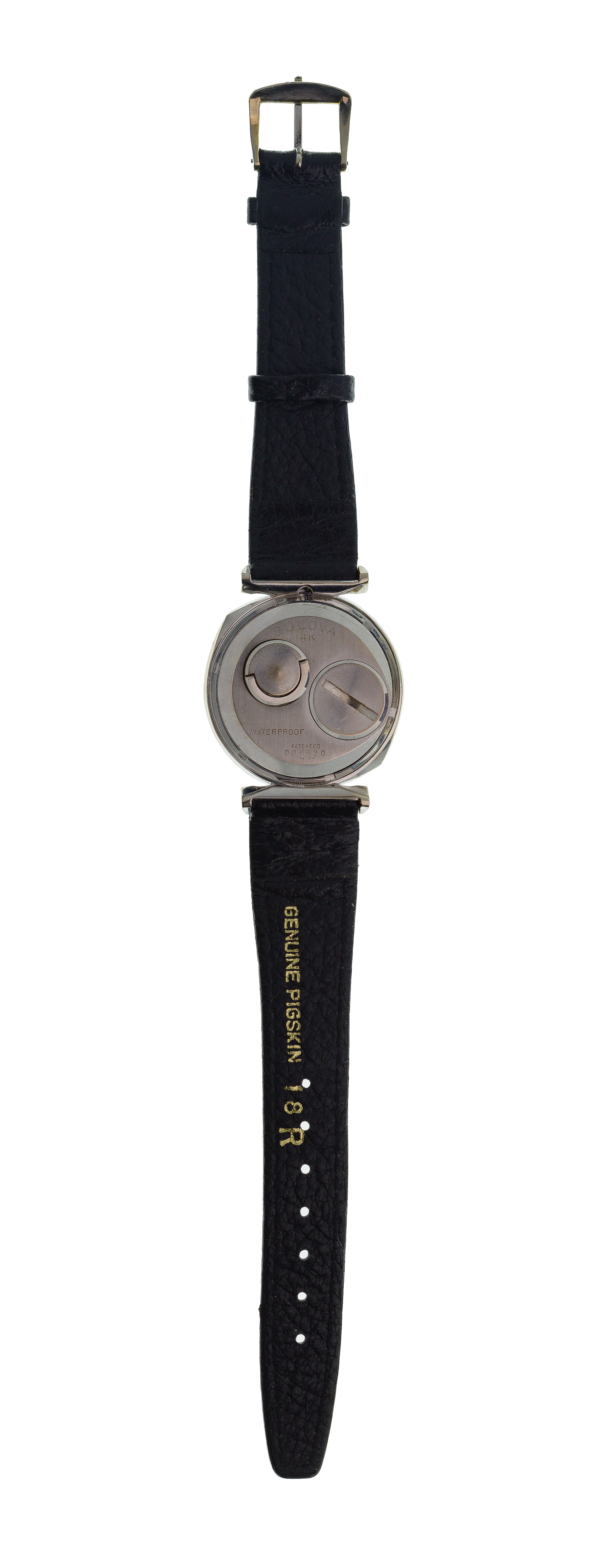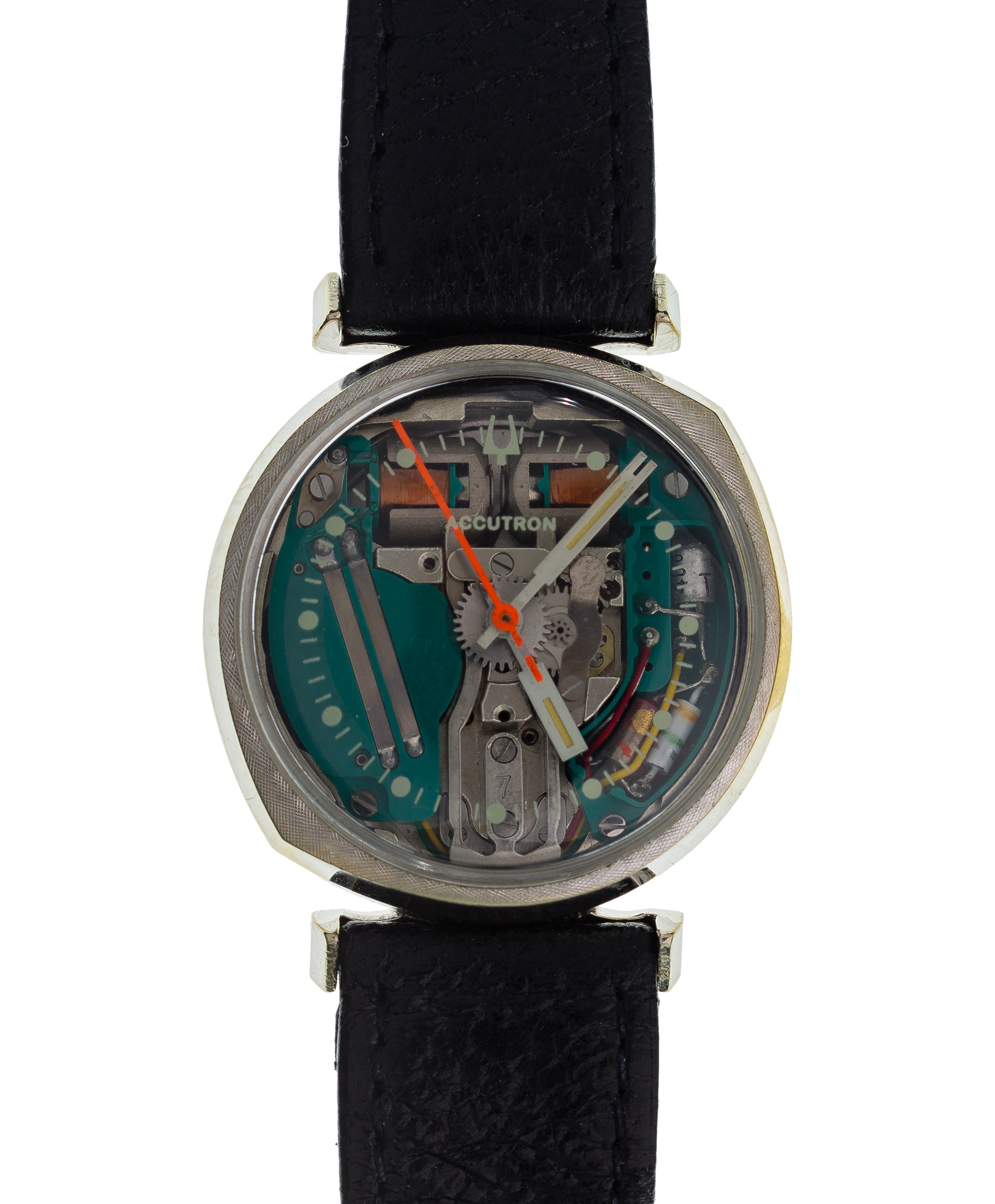 Serial #DO6520 having an open dial showcasing the tuning fork Accutron Calibre 214 movement, luminous hands, luminous indices painted on underside of crystal, on leather band