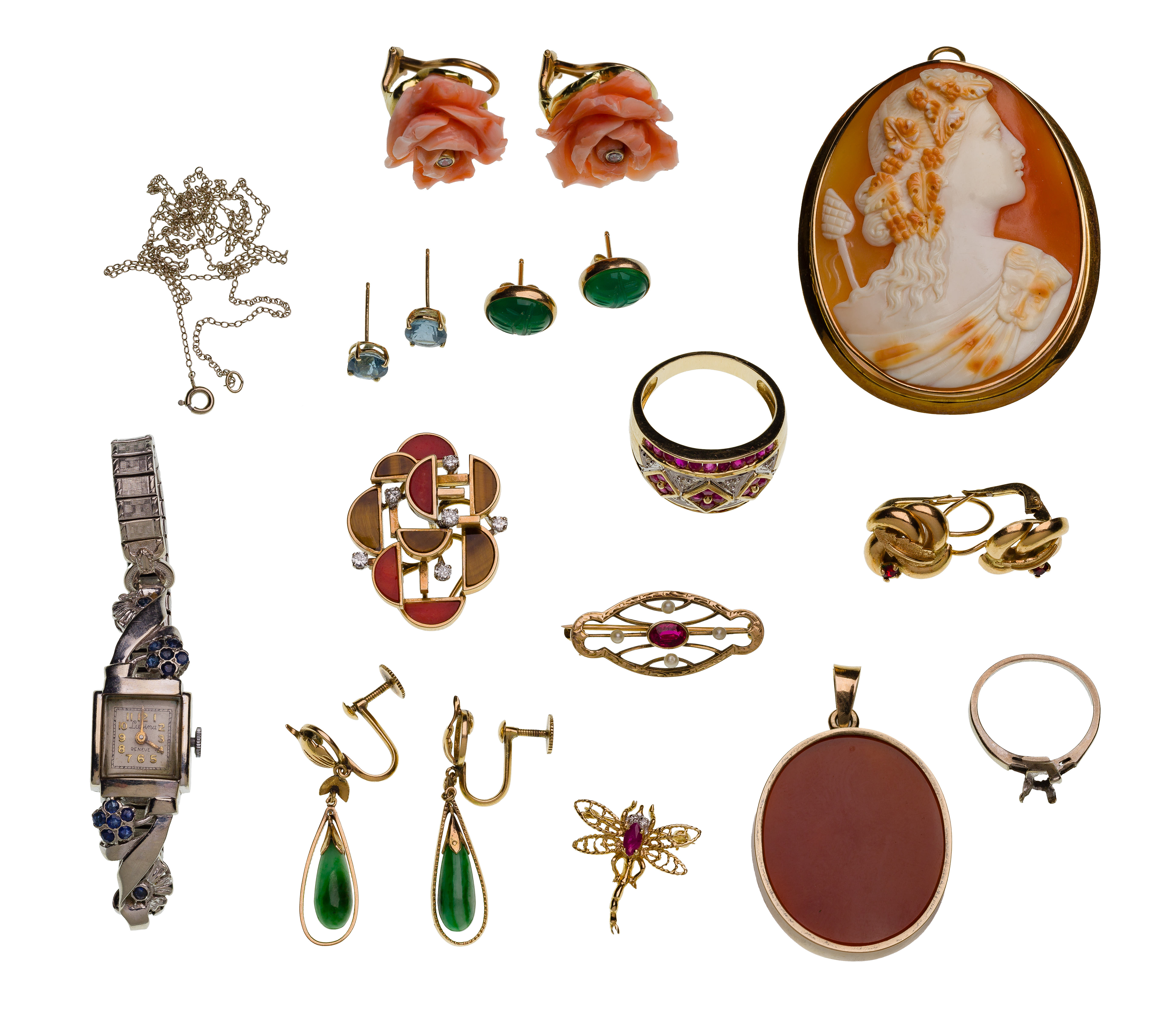 (14) items including a ruby and diamond accented band style ring, a white gold watch case having sapphire accents, (3) pins, (2) pendants, (5) pairs of earrings, a ring setting and a chain style necklace (most marked ’14k’), some having gemstones