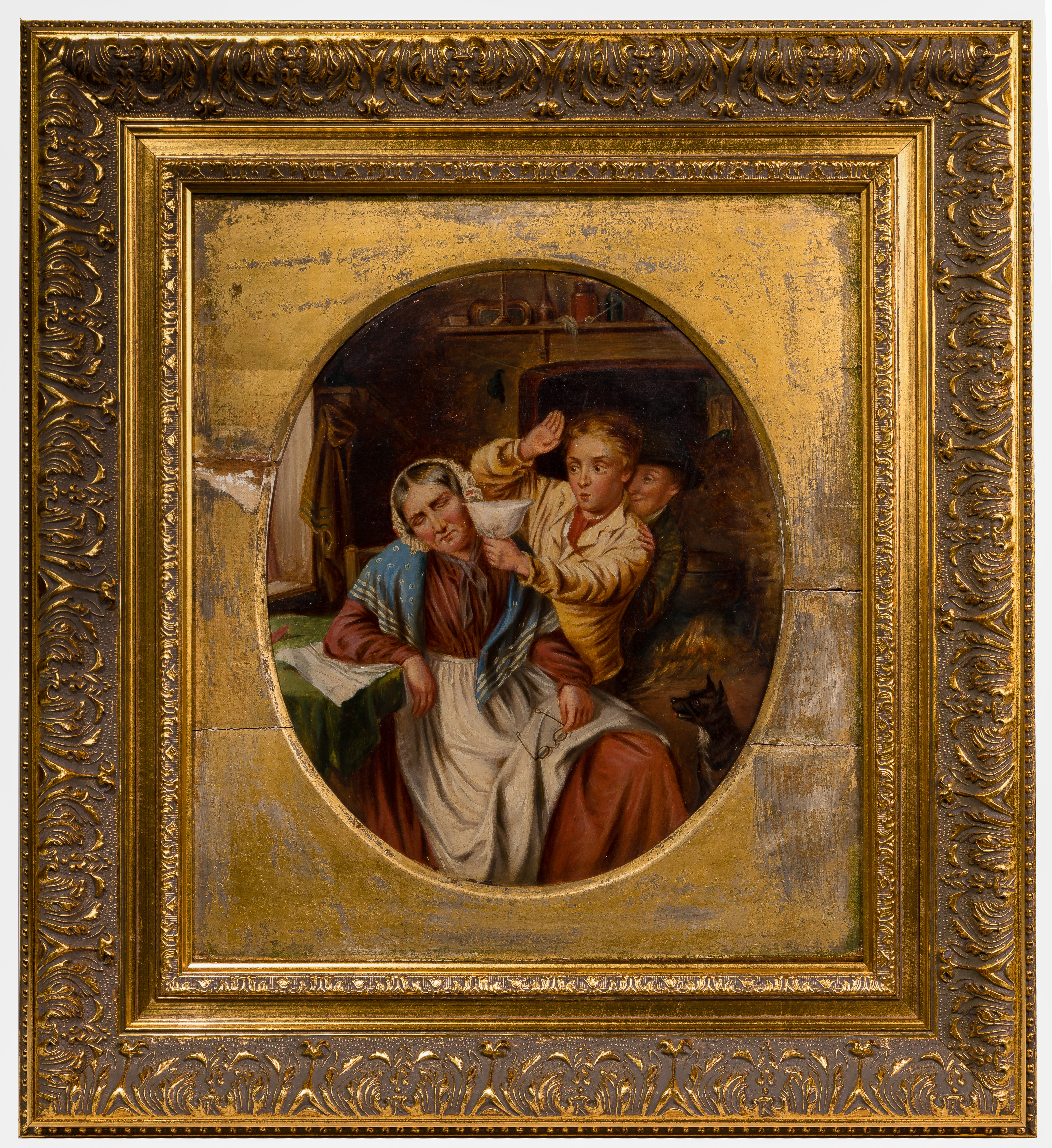 Undated, unsigned, a genre scene depicting (2) young male figures teasing a sleeping older female figure while a dog looks on in amusement; in a gold tone wood frame