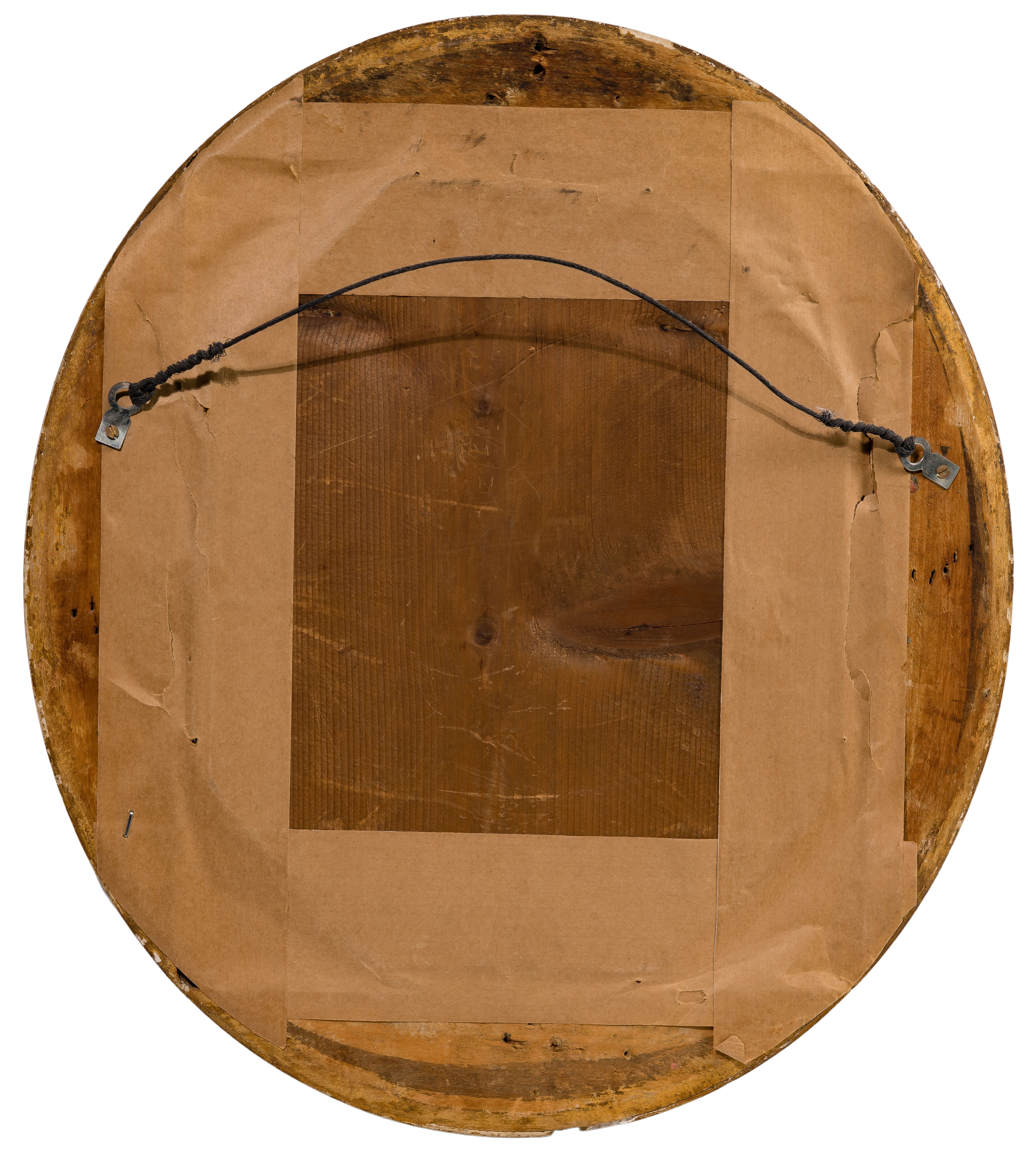 Condition: Good, overall light wear consistent with age and normal use; canvas separating from board with visible bulges throughout; cupping turning to craquelure overall; wear to frame including cracks