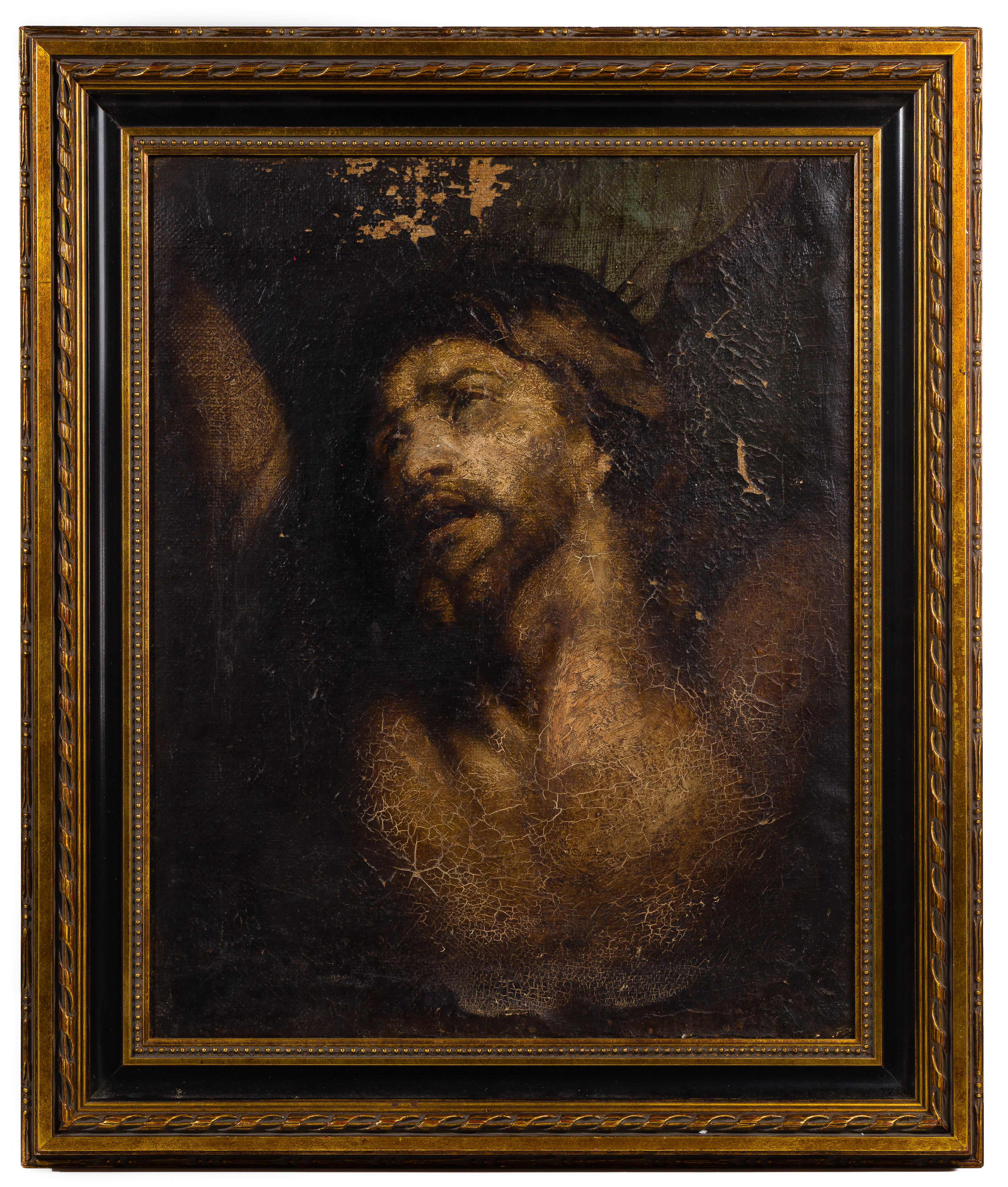 Undated, unsigned (possibly cut down), depicting the torso and face of Christ with shoulders outstretched and eyes gazing upwards; in a black and gold tone wood frame