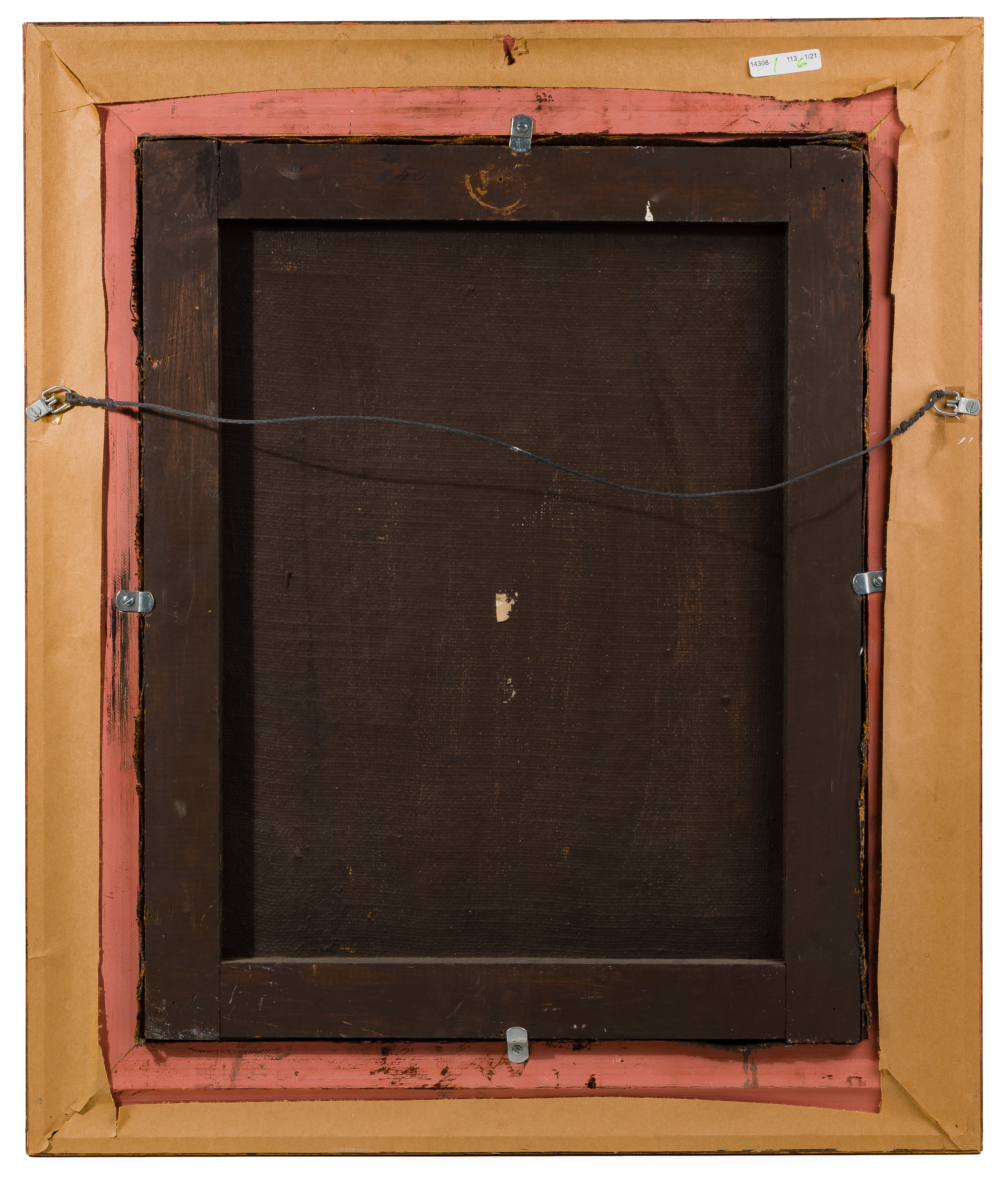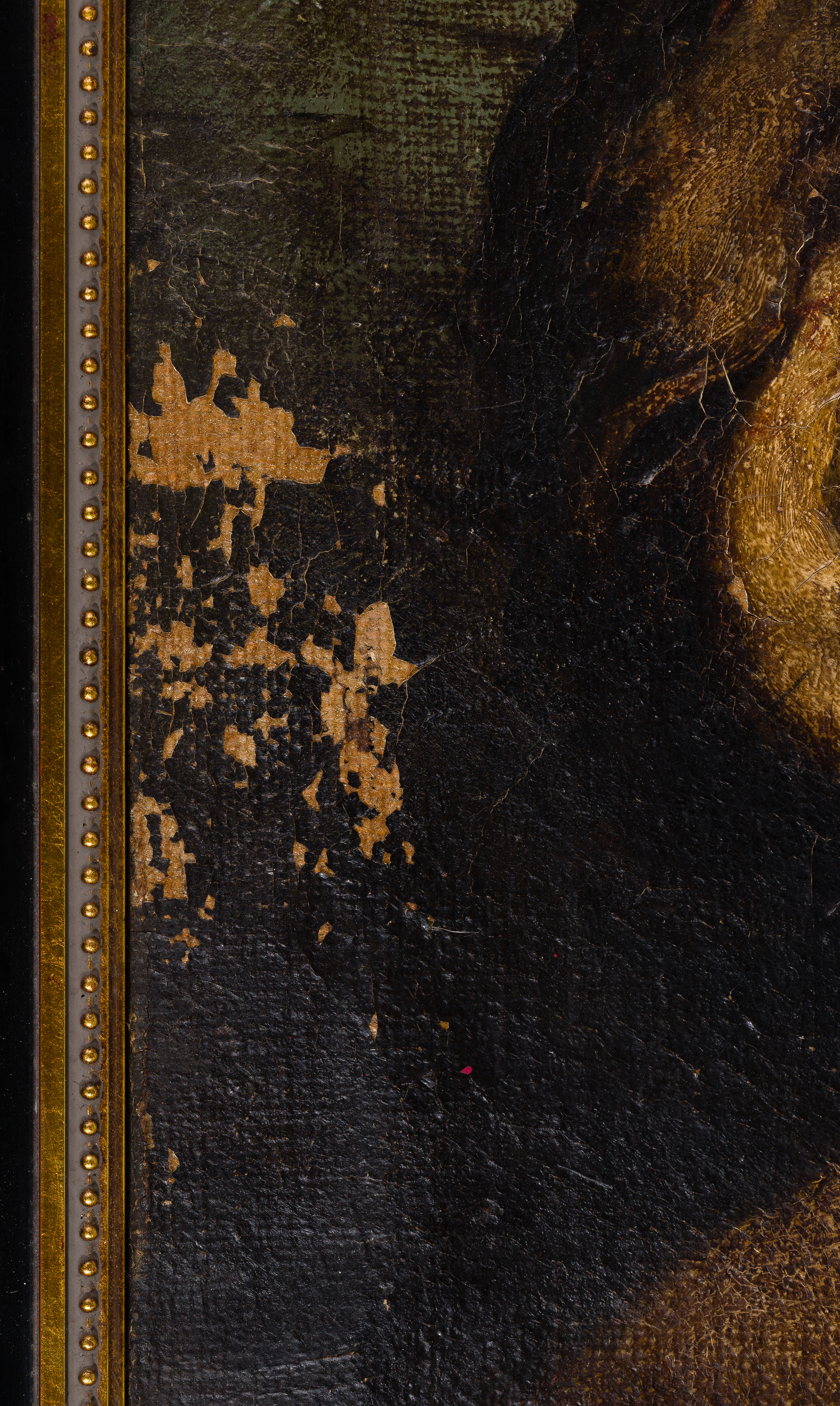 Condition: Fair, overall moderate to heavy wear; stretcher marks throughout; verso of canvas painted disallowing natural movement and causing cupping and craquelure overall resulting in areas of paint loss and chipping throughout