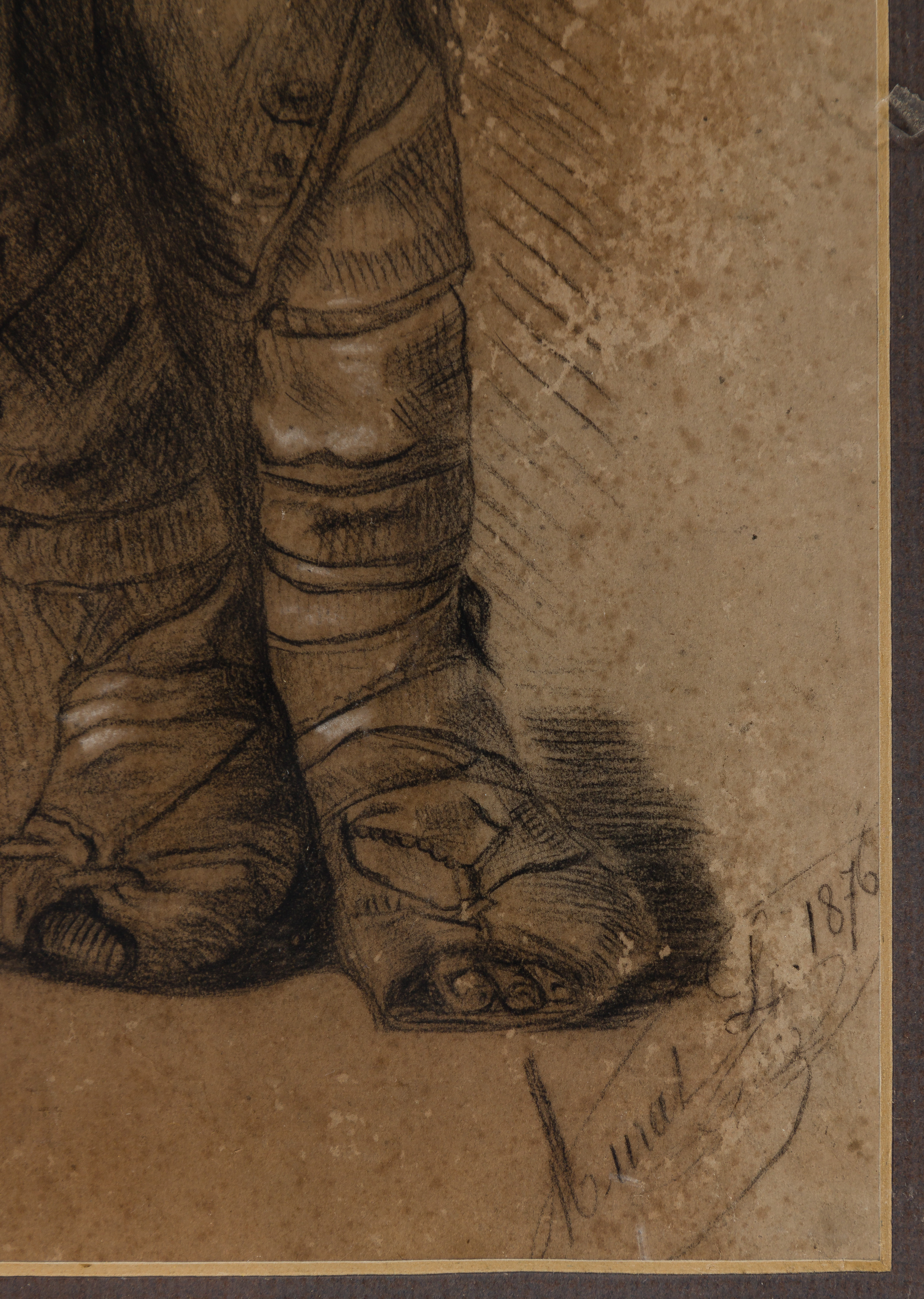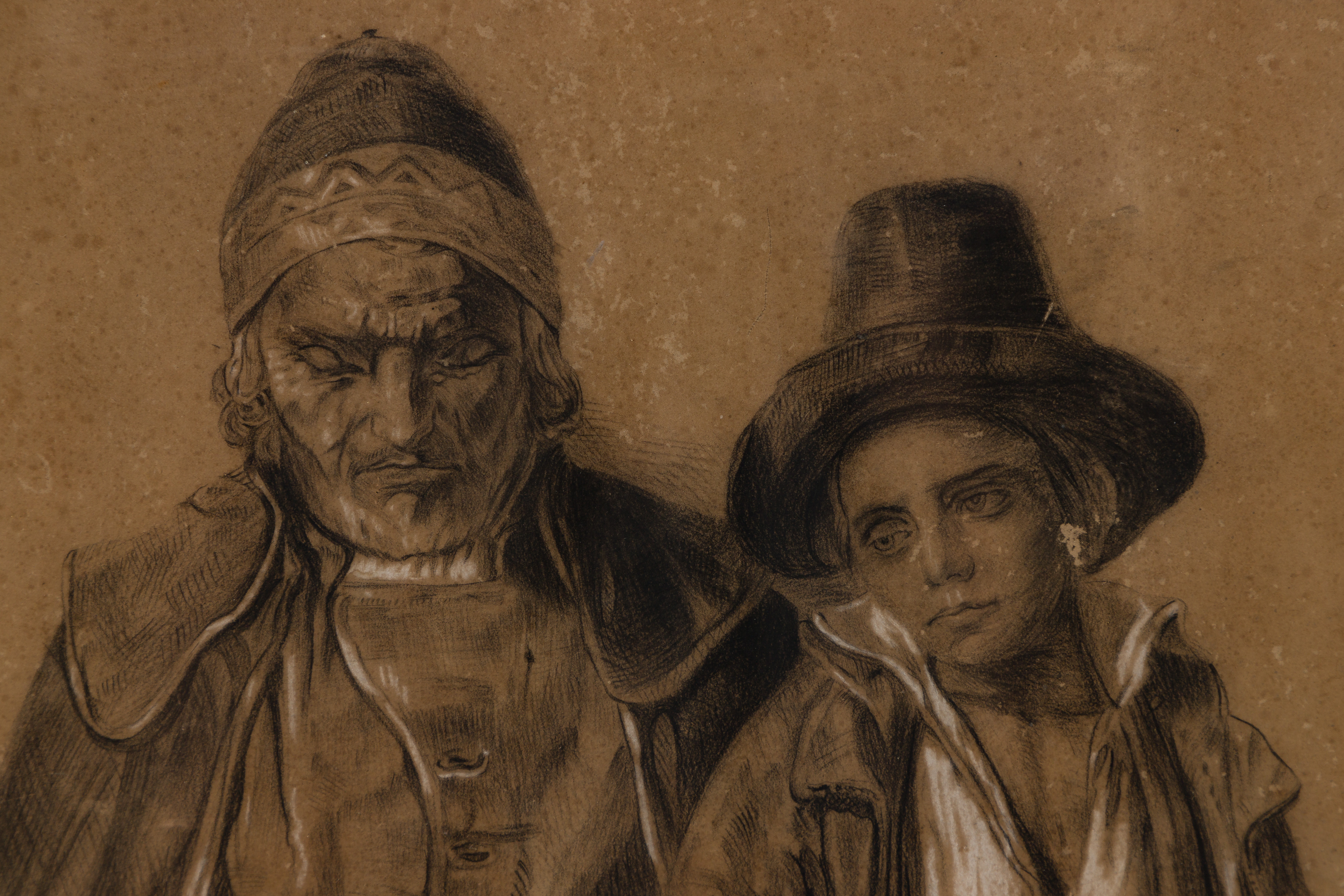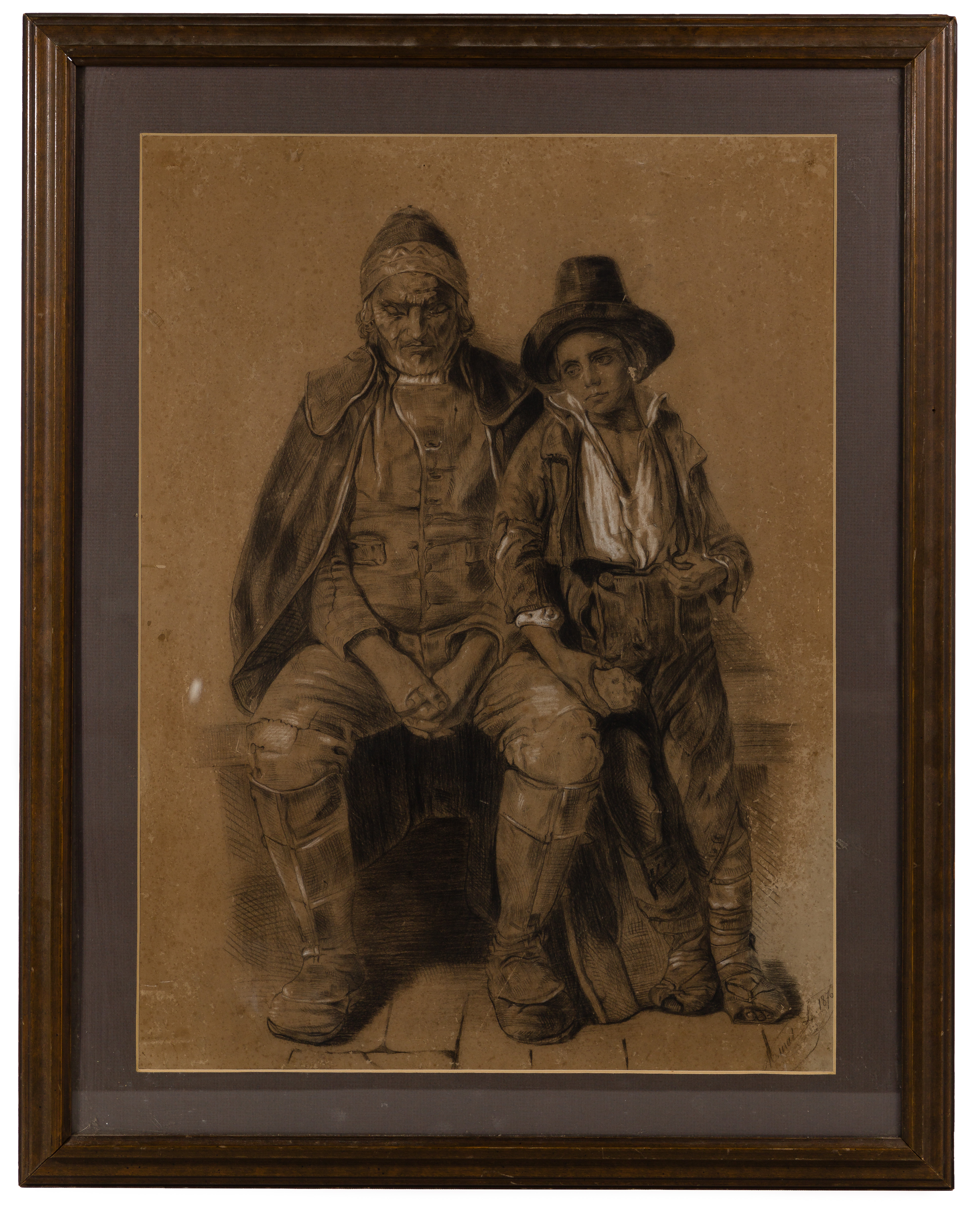 1876, illegibly signed and dated lower right, depicting a man and a boy beggar, matted and framed under glass