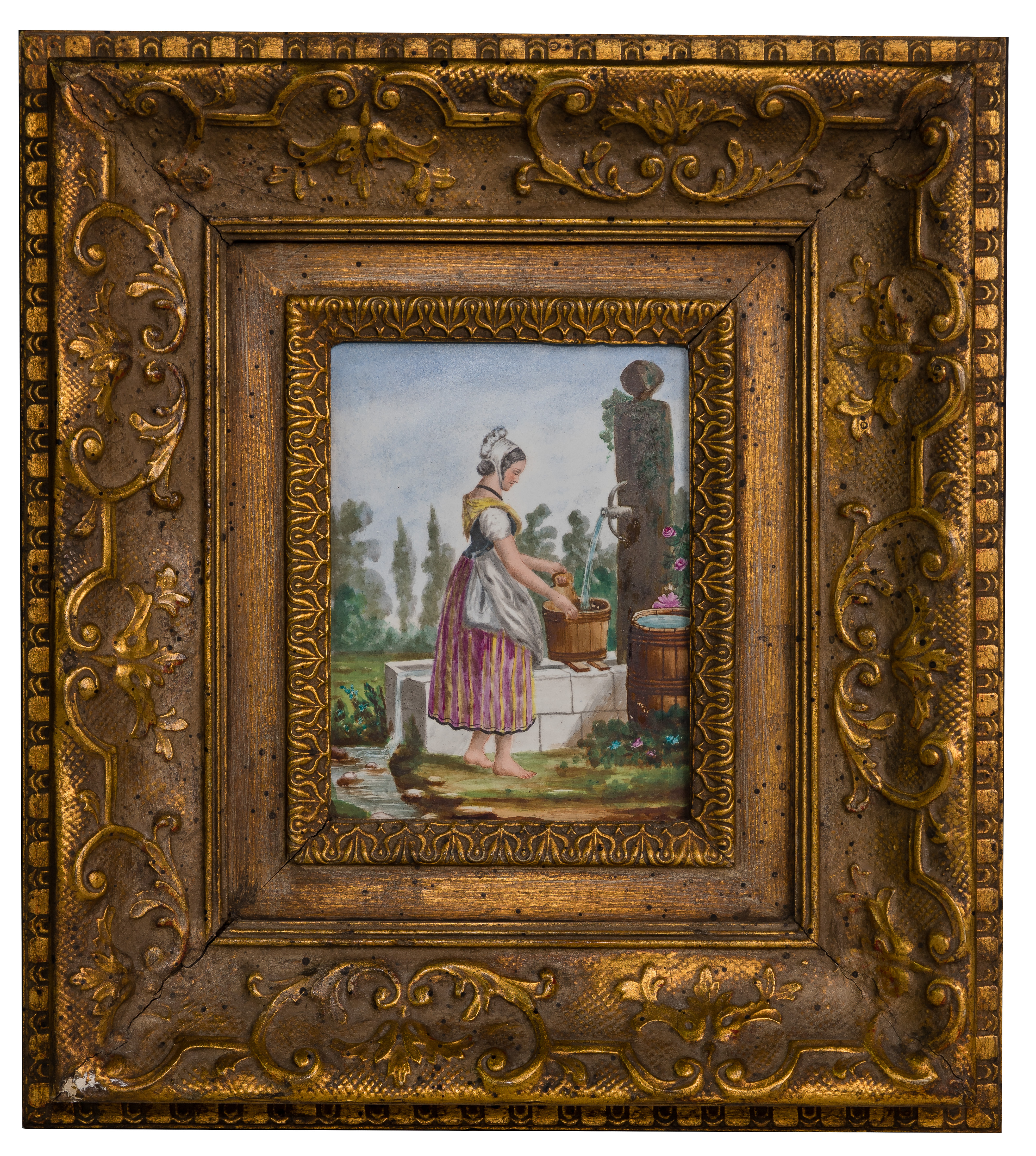 Undated, unsigned, depicting a barefoot woman getting water from an outdoor fixture; in a gold plaster and wood frame