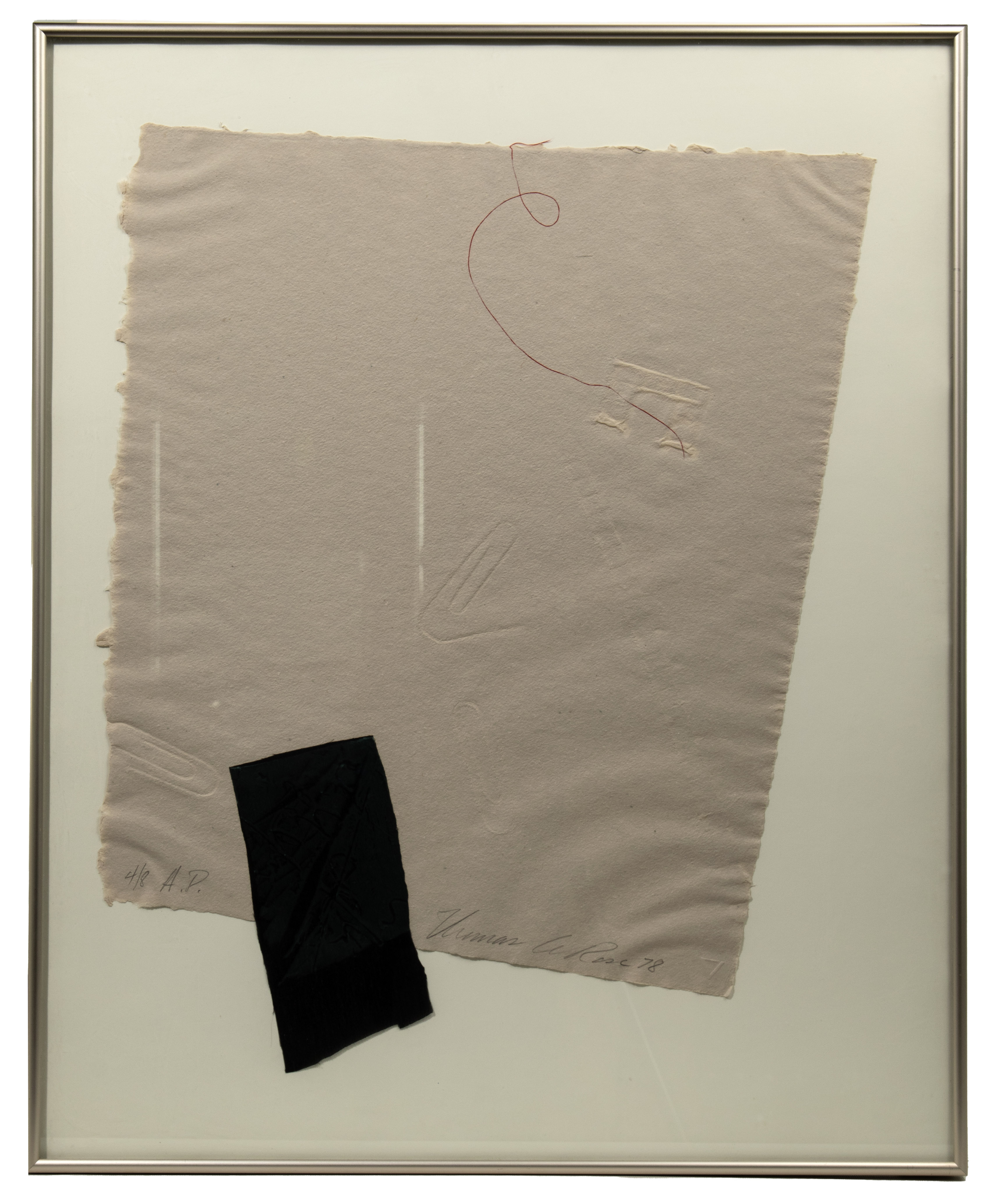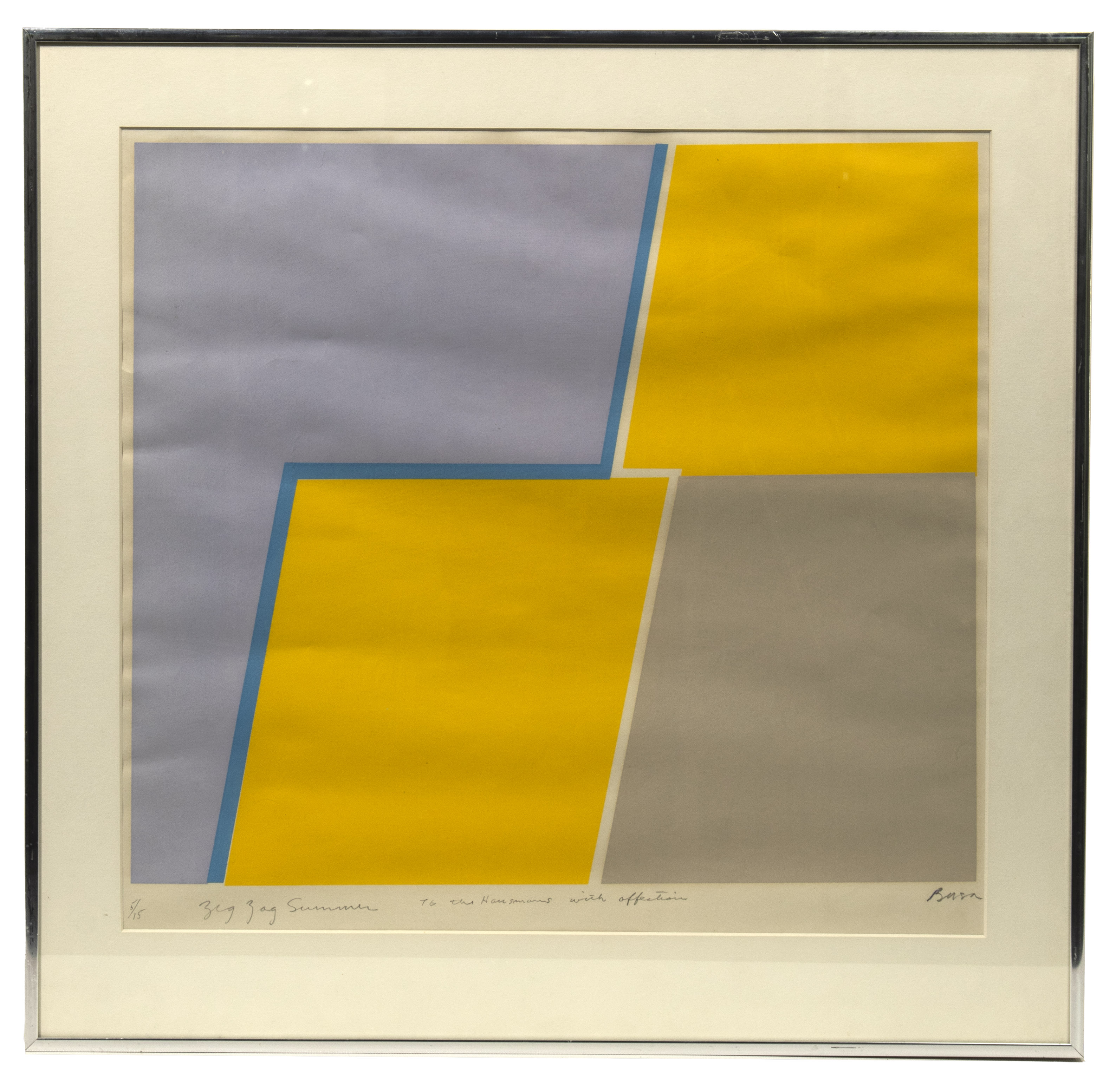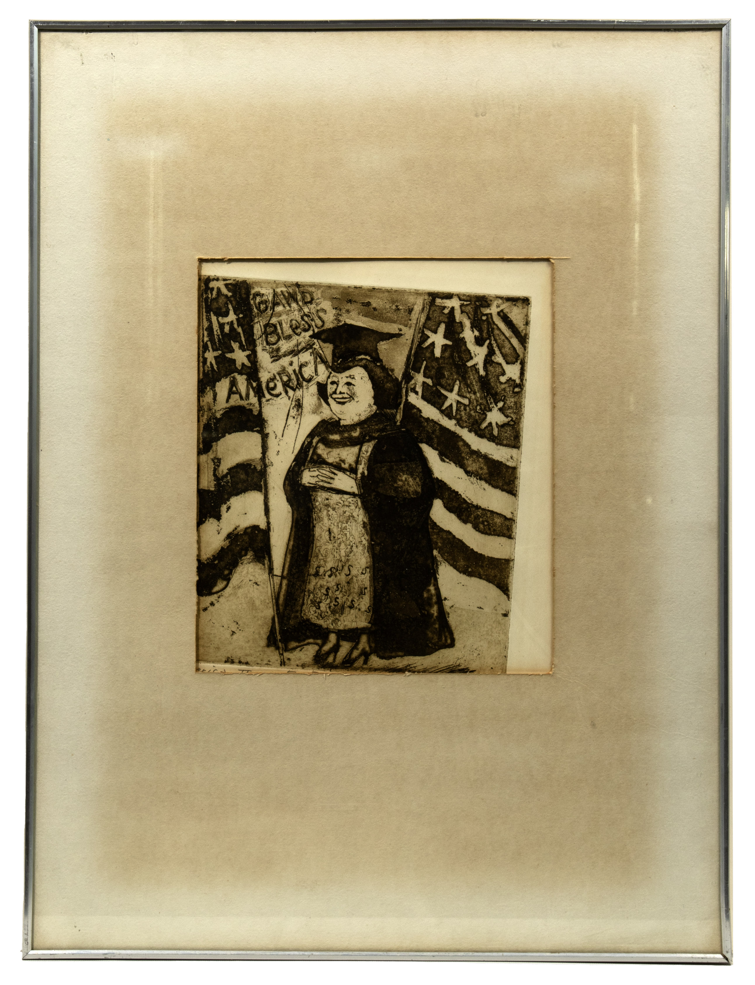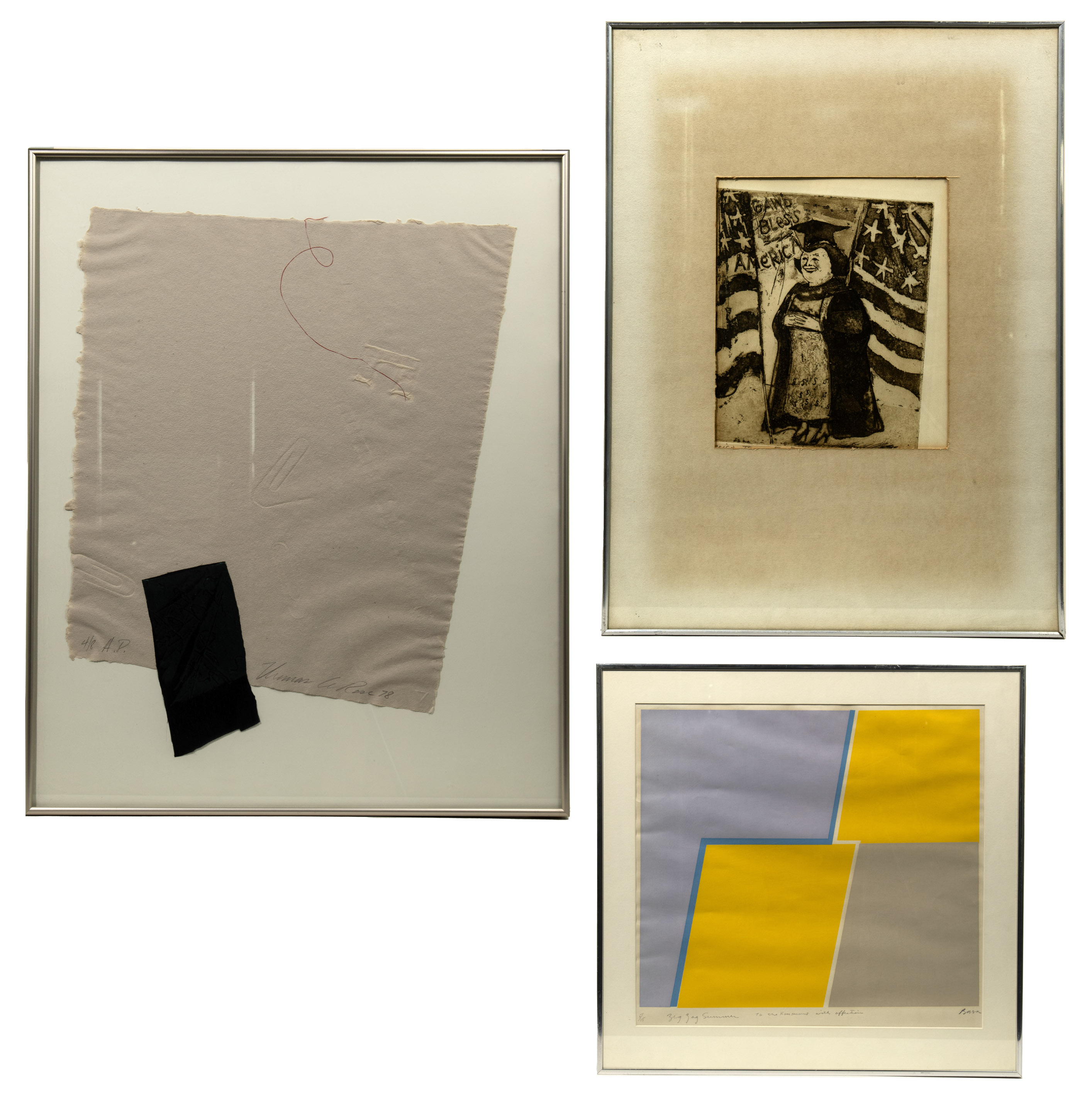 (3) items including an abstract signed ‘Peter Bosa’ lower right titled ‘Zig Zag Summer’ lower left #5/15 in yellow and gray (21-inches by 24-inches in frame); 1978, signed ‘Thomas Rose AP #4/8’ lower right, a collage ‘Objects Indicating Certain Direction’; and an etching signed ‘Sid Chafetz’ depicting a graduate with American flags (18-inches by 24-inches with frame); all under glass in metal frames