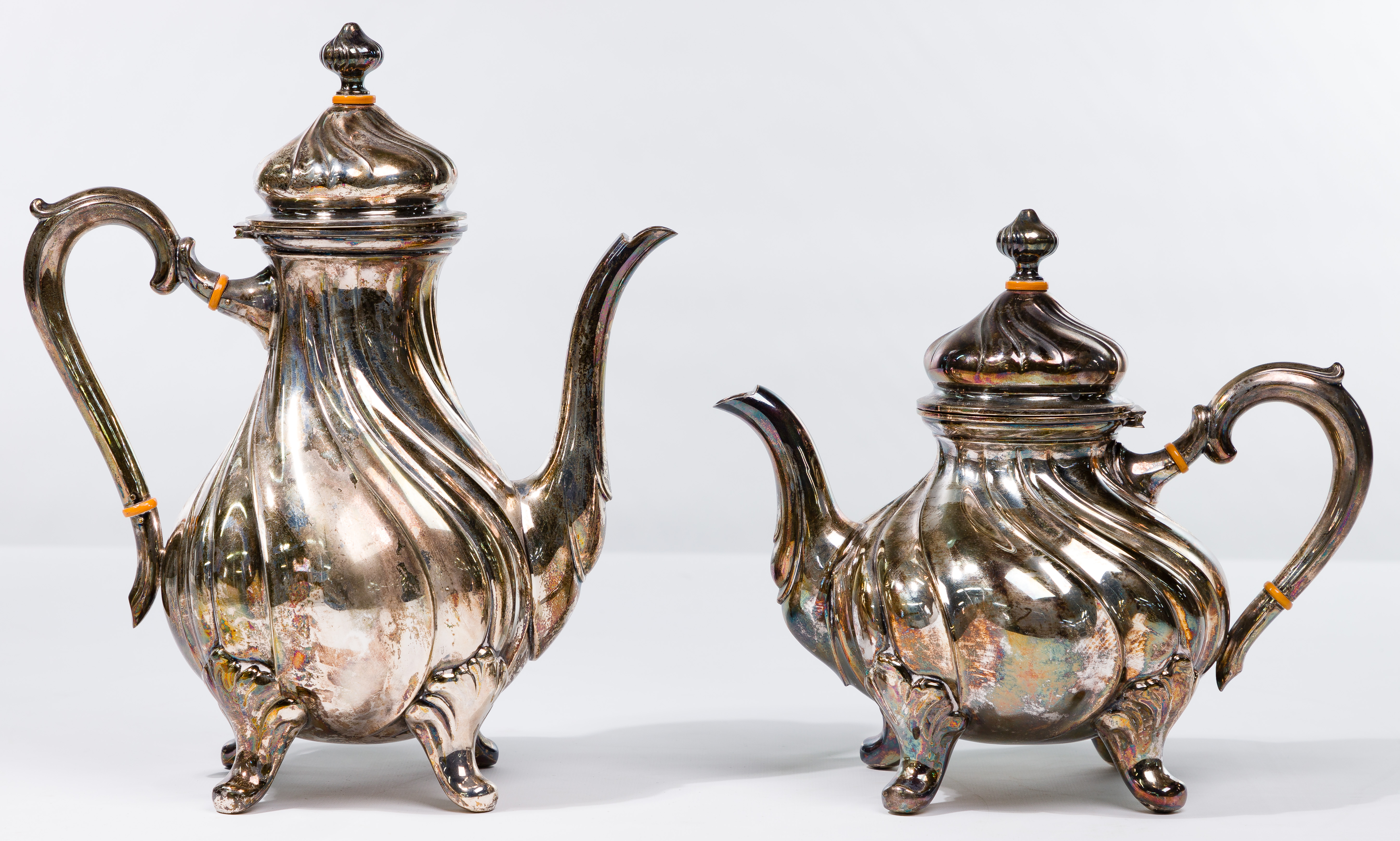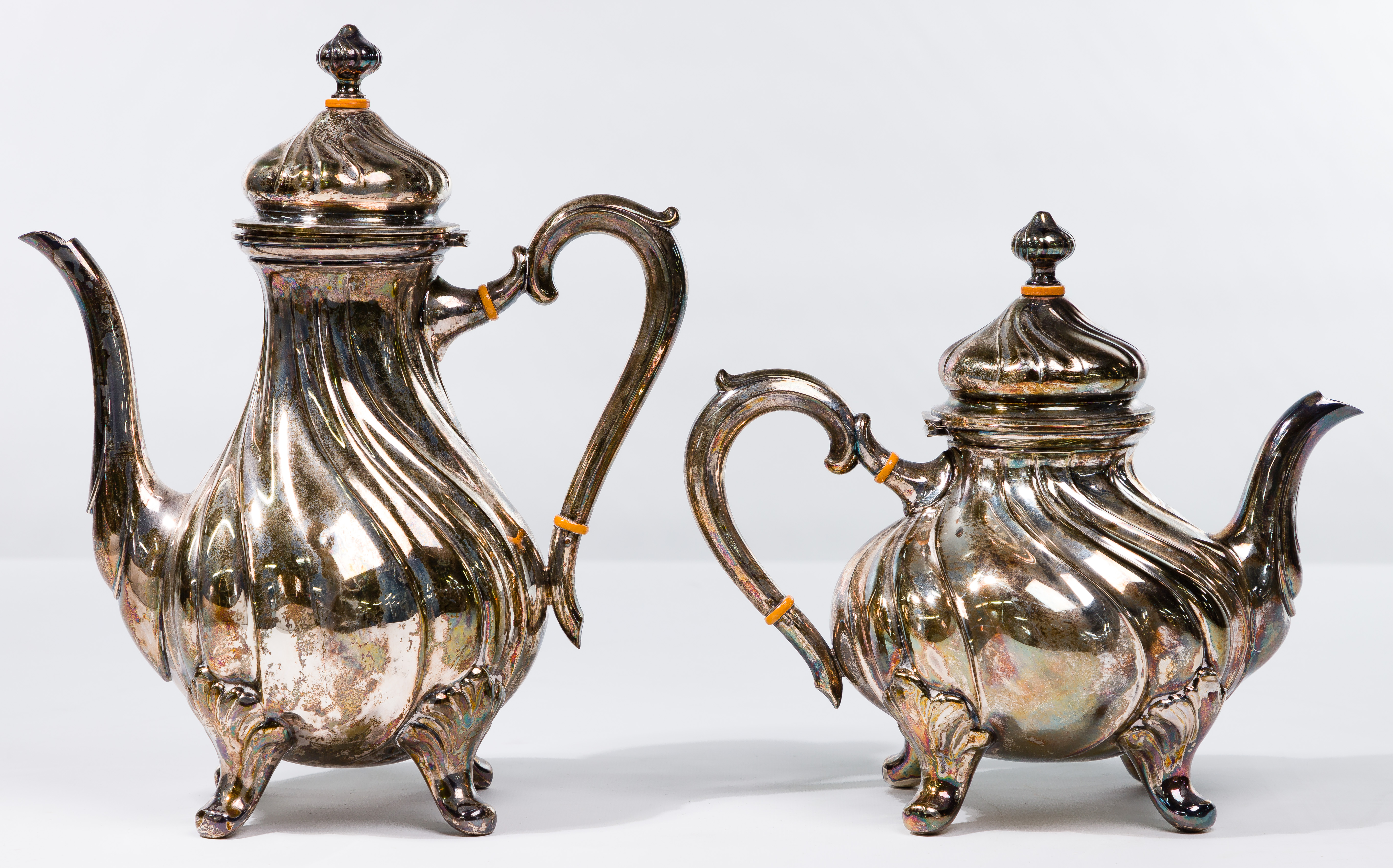 (5) items including a tray, teapot, coffee pot, creamer and lidded sugar; all marked ‘925’ / ‘sterling’