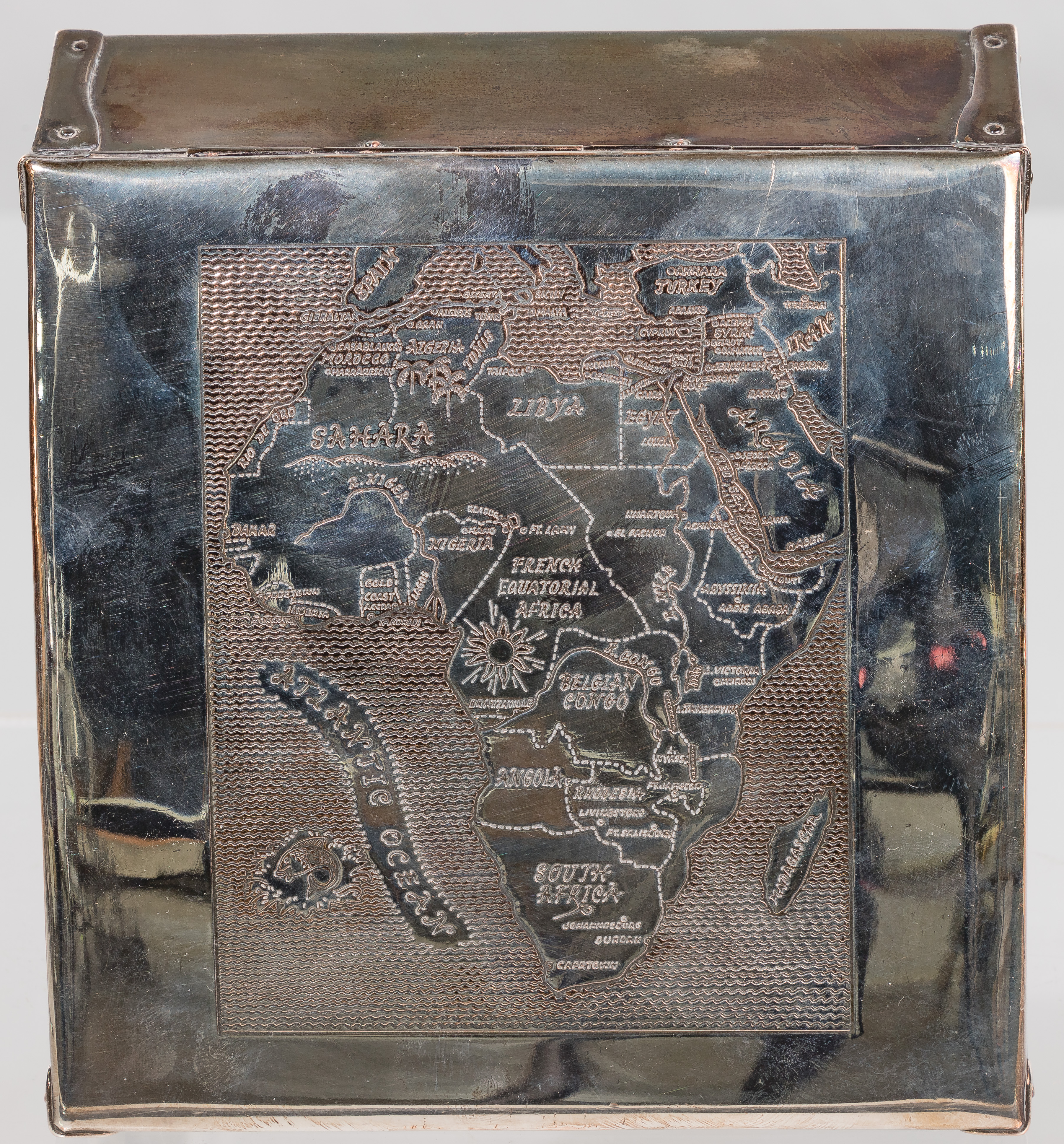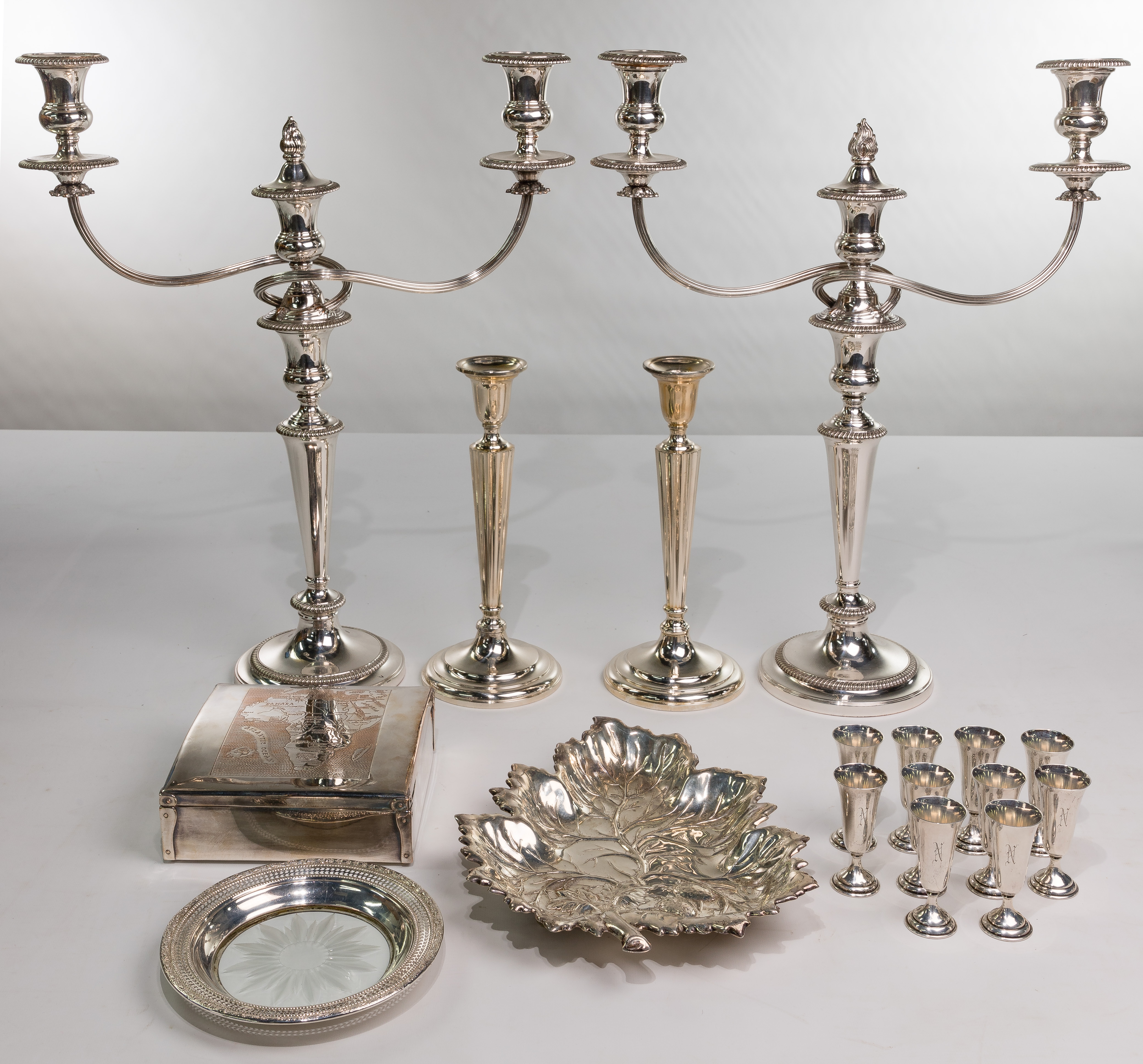 (15) items including (10) demitasse cups, a floral dish, a glass-bottomed round dish and pair of weighted candlesticks, all marked ‘sterling’; as well as a pair of silverplate candelabras and hinged box having map of Africa on lid