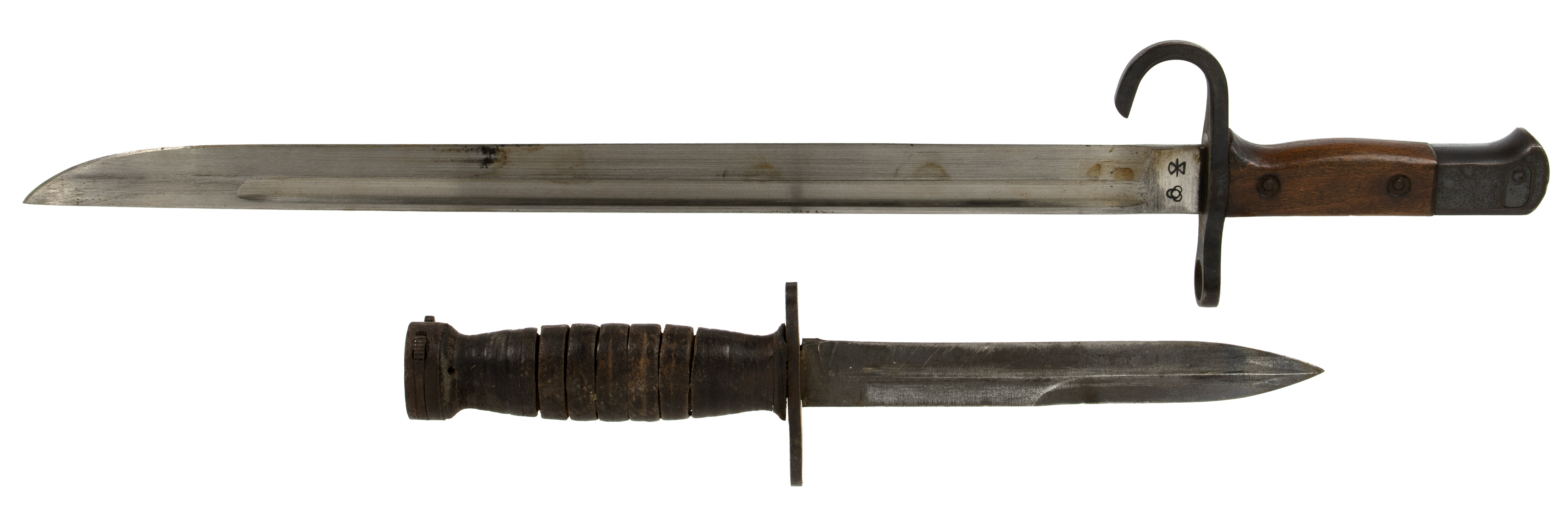 (4) items including US M-1 Carbine bayonet having frog with right-over-left snap and U.S. M8 sheath, Japanese Arisaka Type 30 bayonet having Hikari Seiki Seisakusho manufacturer marks on ricasso, including metal scabbard and hooked cross guard, sheet having (4) cloth Imperial Japanese Army military insignias as well as Japanese ephemera including an allied ‘Safe Conduct Pass’